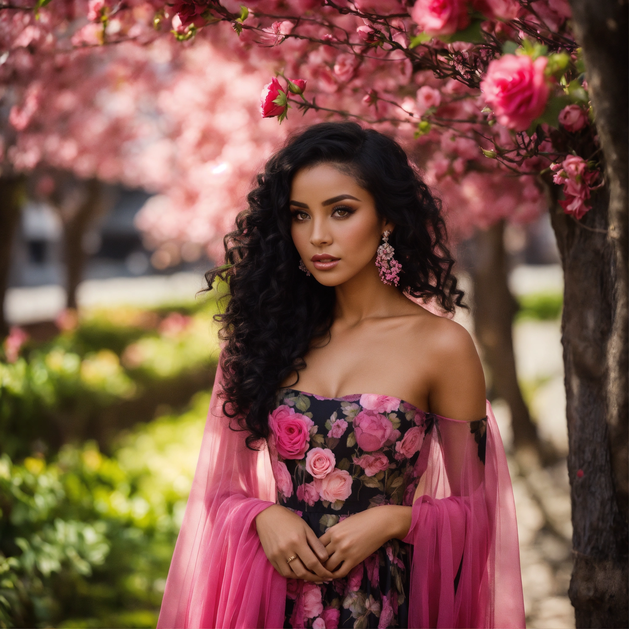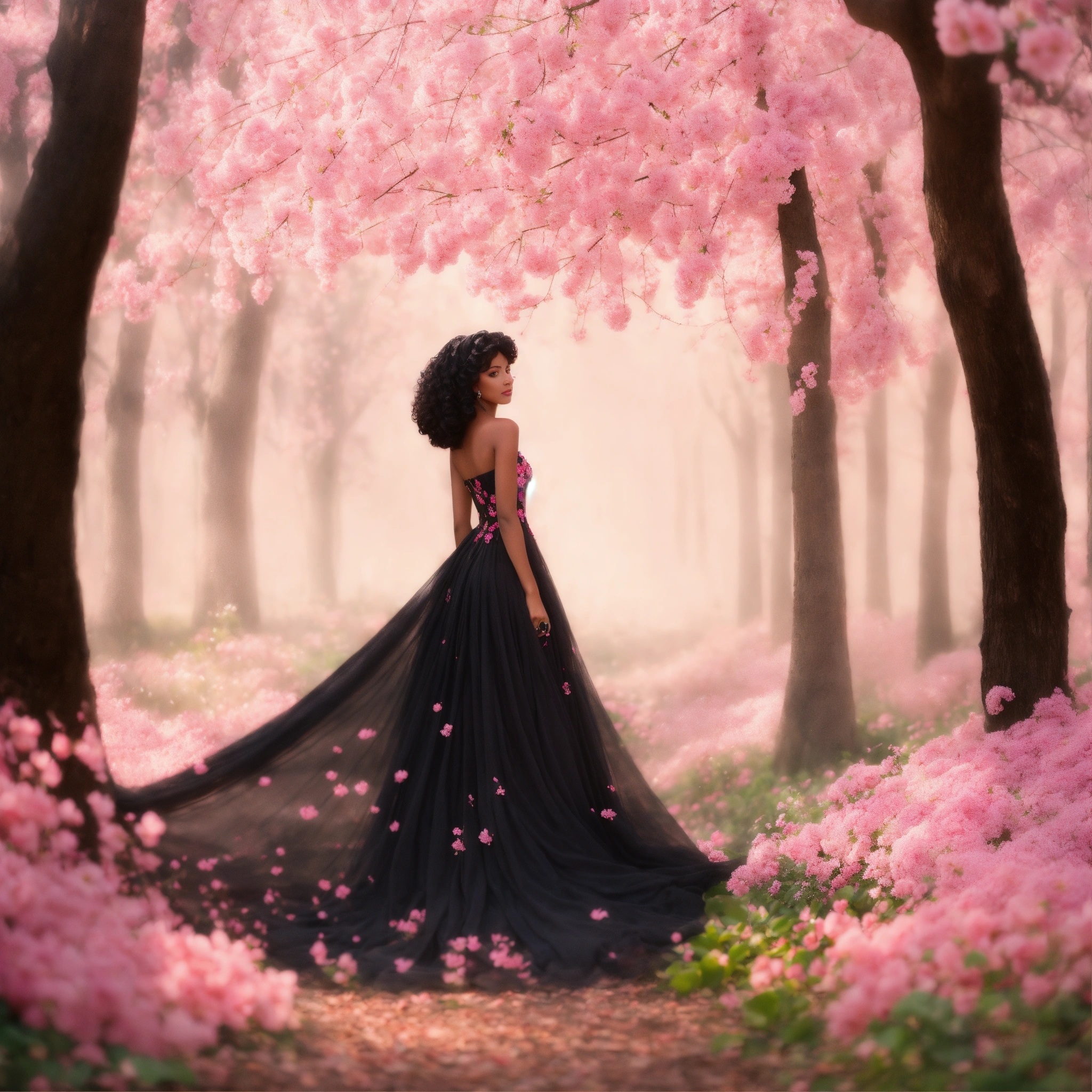 Preciosa mujer, de tez negra y ojos marrones, con peinado engominado, vestido rosa, con capa transparente de flores estampadas, fondo con arboles de flores rosas pequeñas
