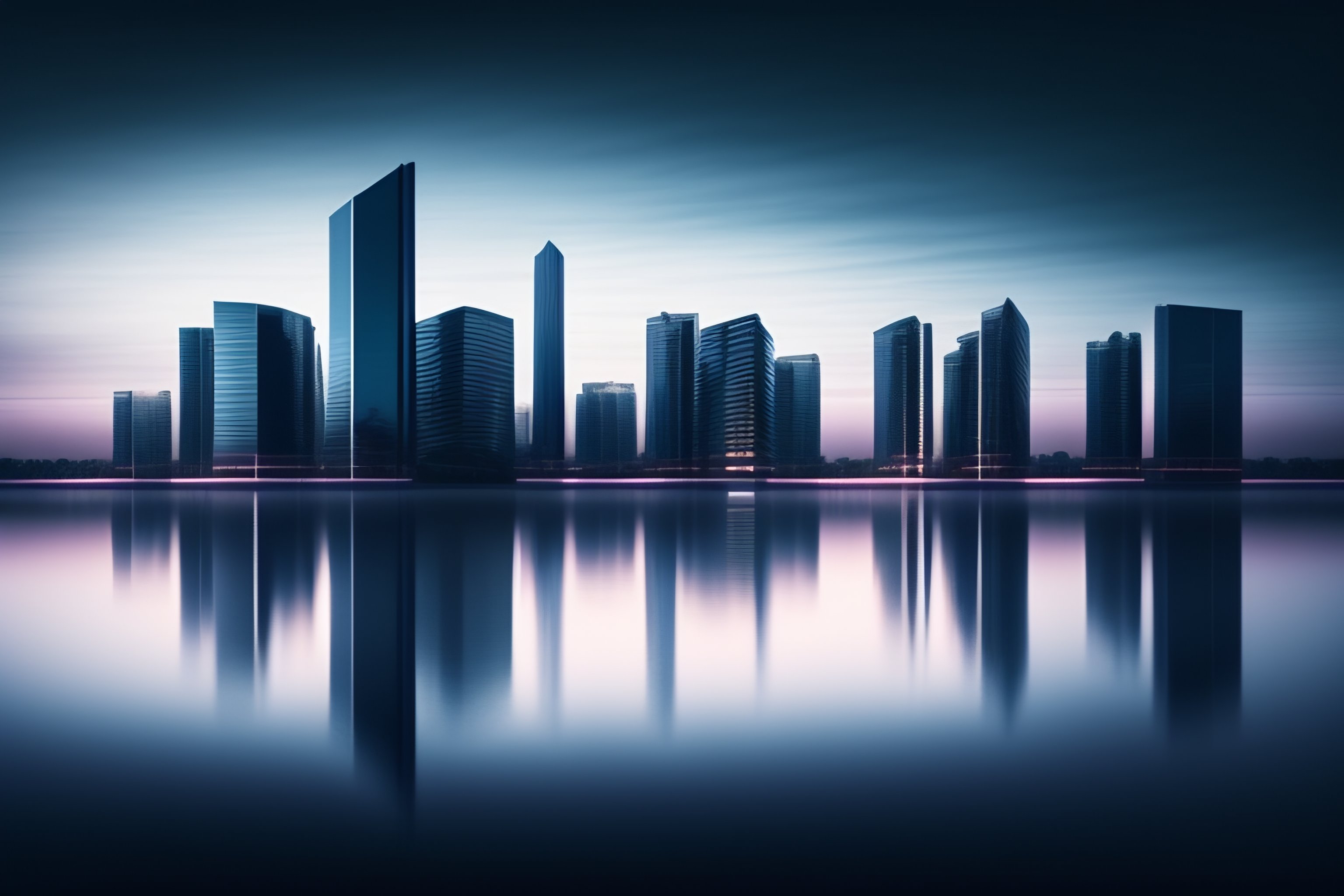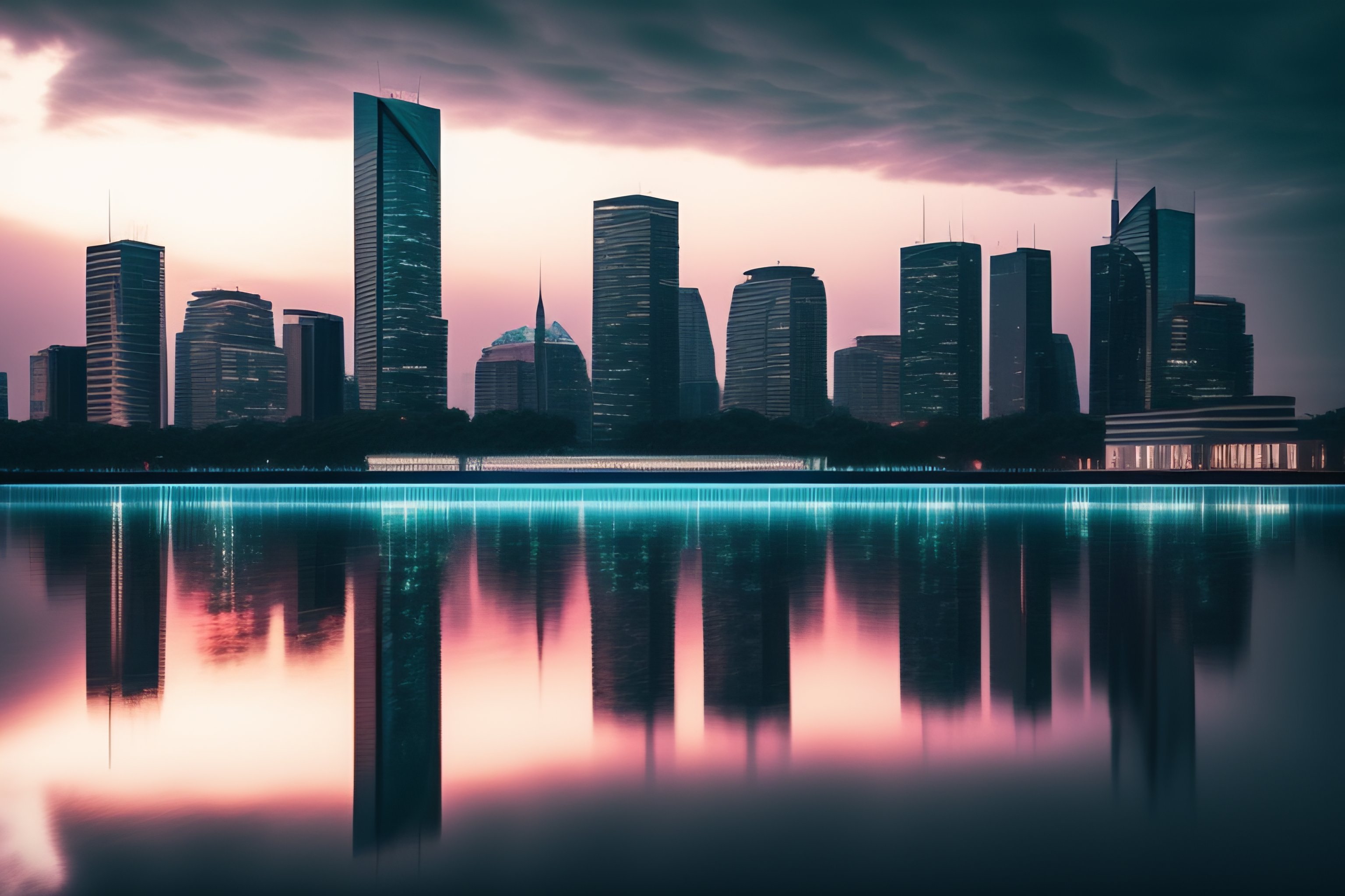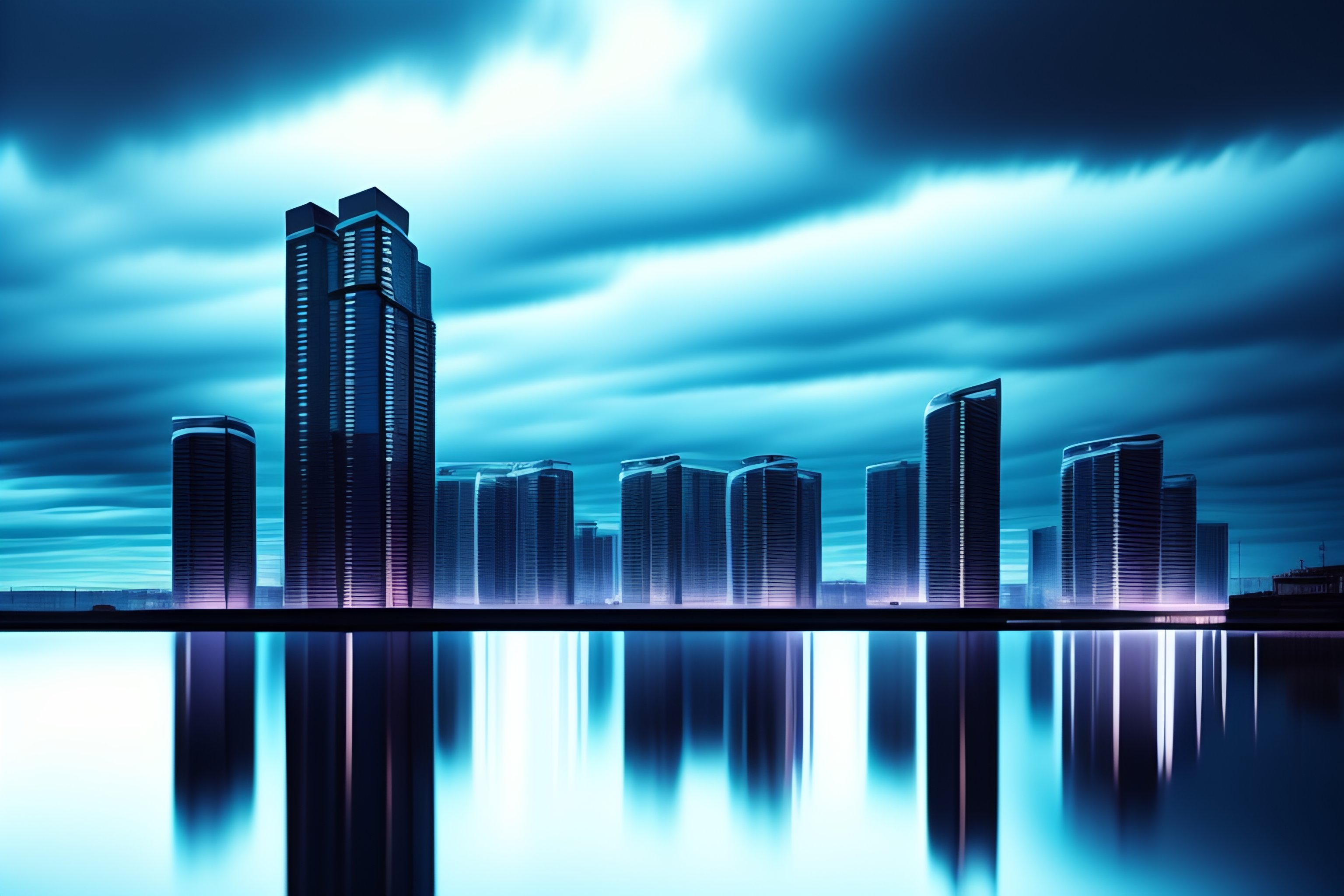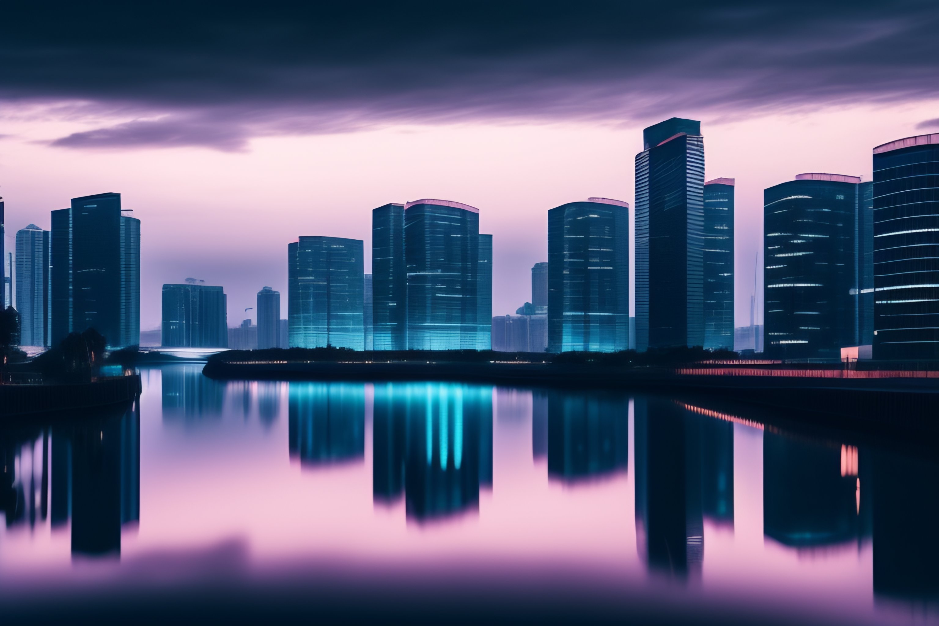 A modern city landscape with water on the edge. some tall modern buildngs with random windows lights on. night view. dark water, some clouds