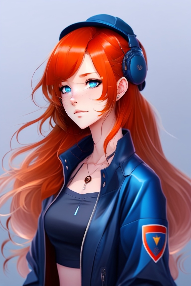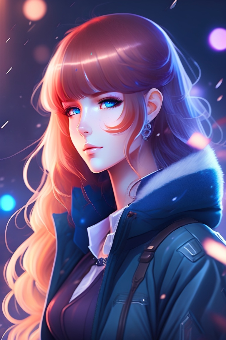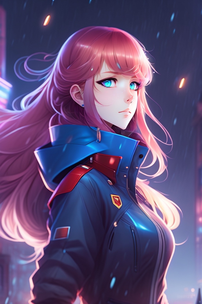 Anime of a white girl with red hair and blue eyes, red lips, side view, rain, night background, whind