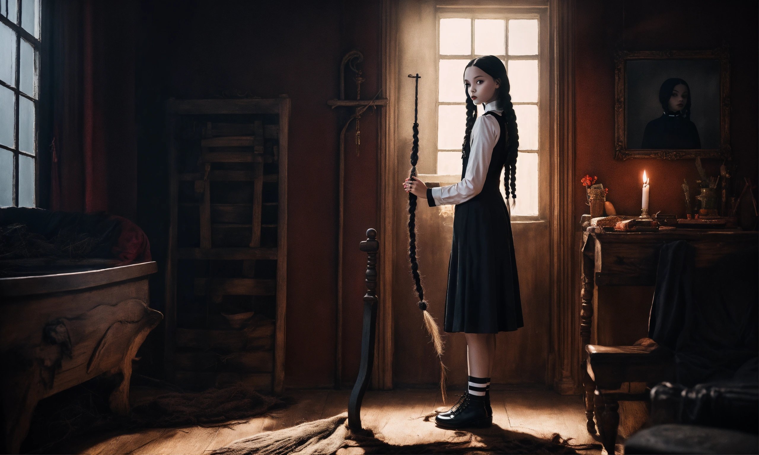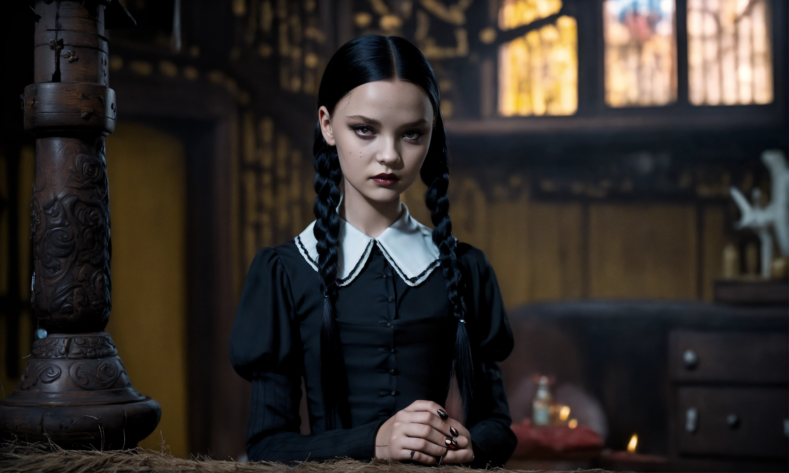 Wednesday addams from the series, black hair braided full growth, stay with tatoo, stay in home, color palette and overall composition of the image emphasize the dark and enigmatic atmosphere of the addams family. black eyes and nails, age 18, black pupils, full length, stands near the gallows