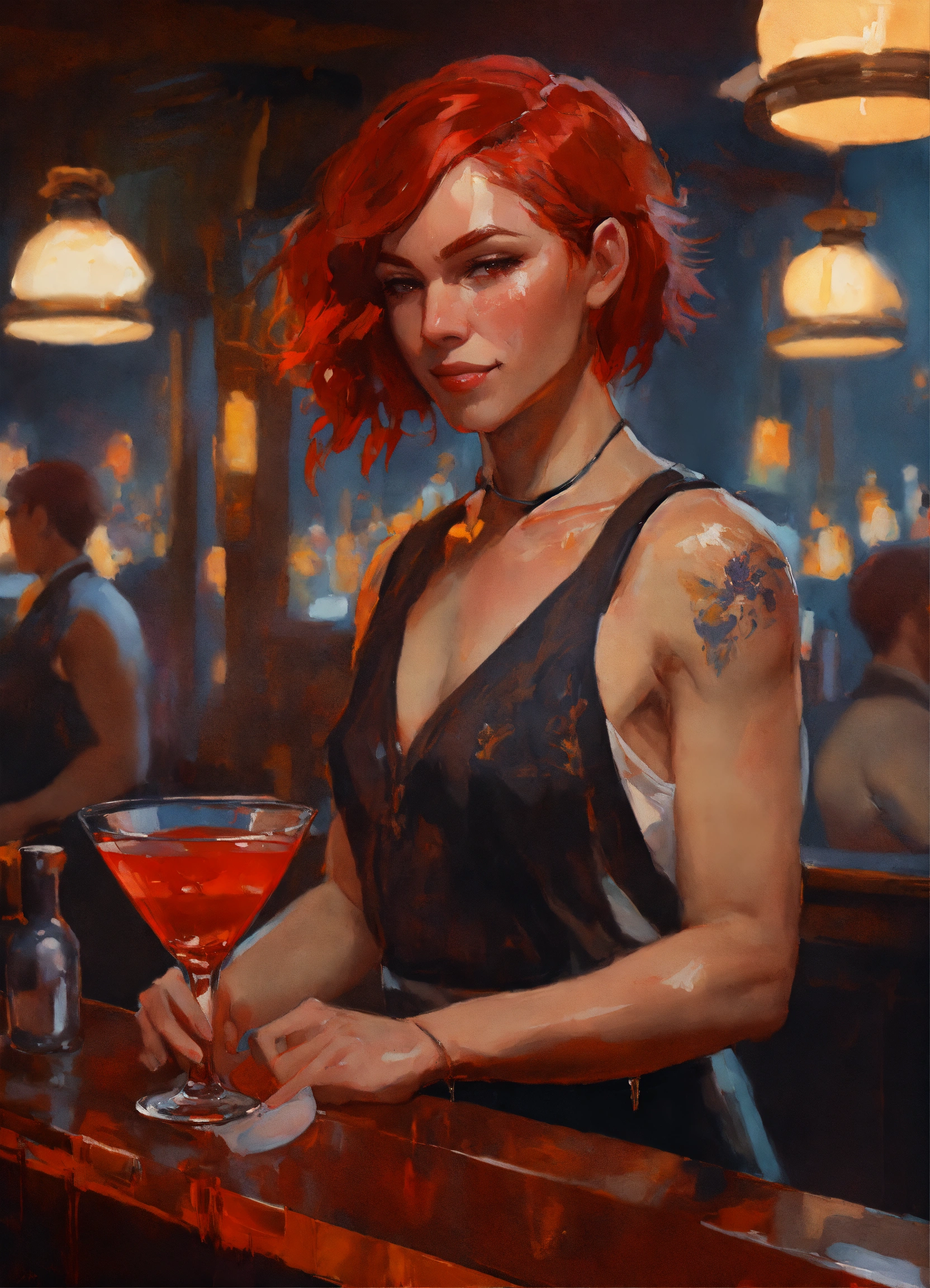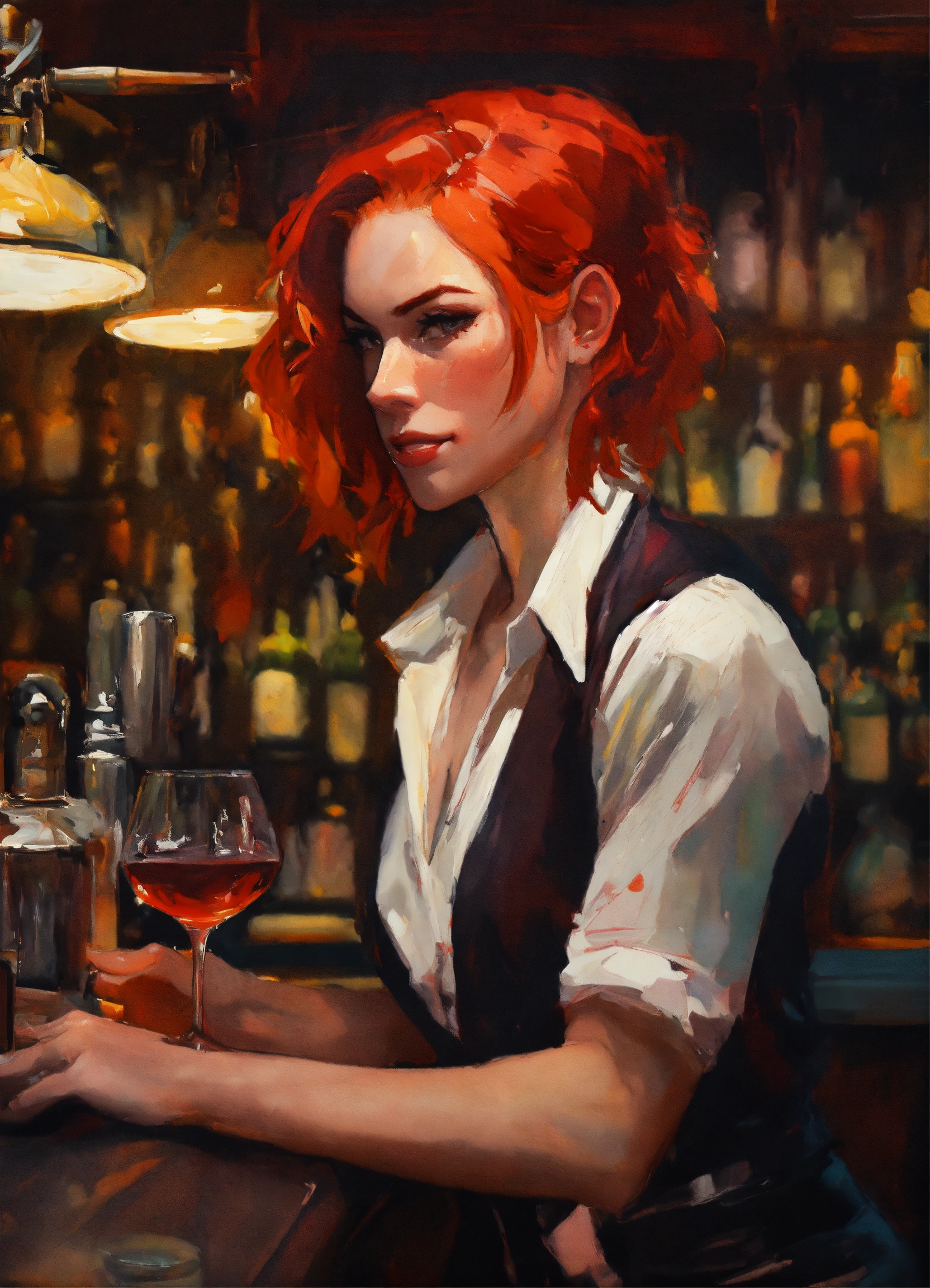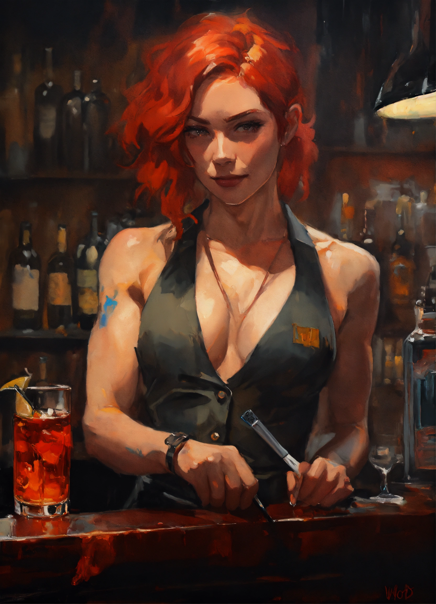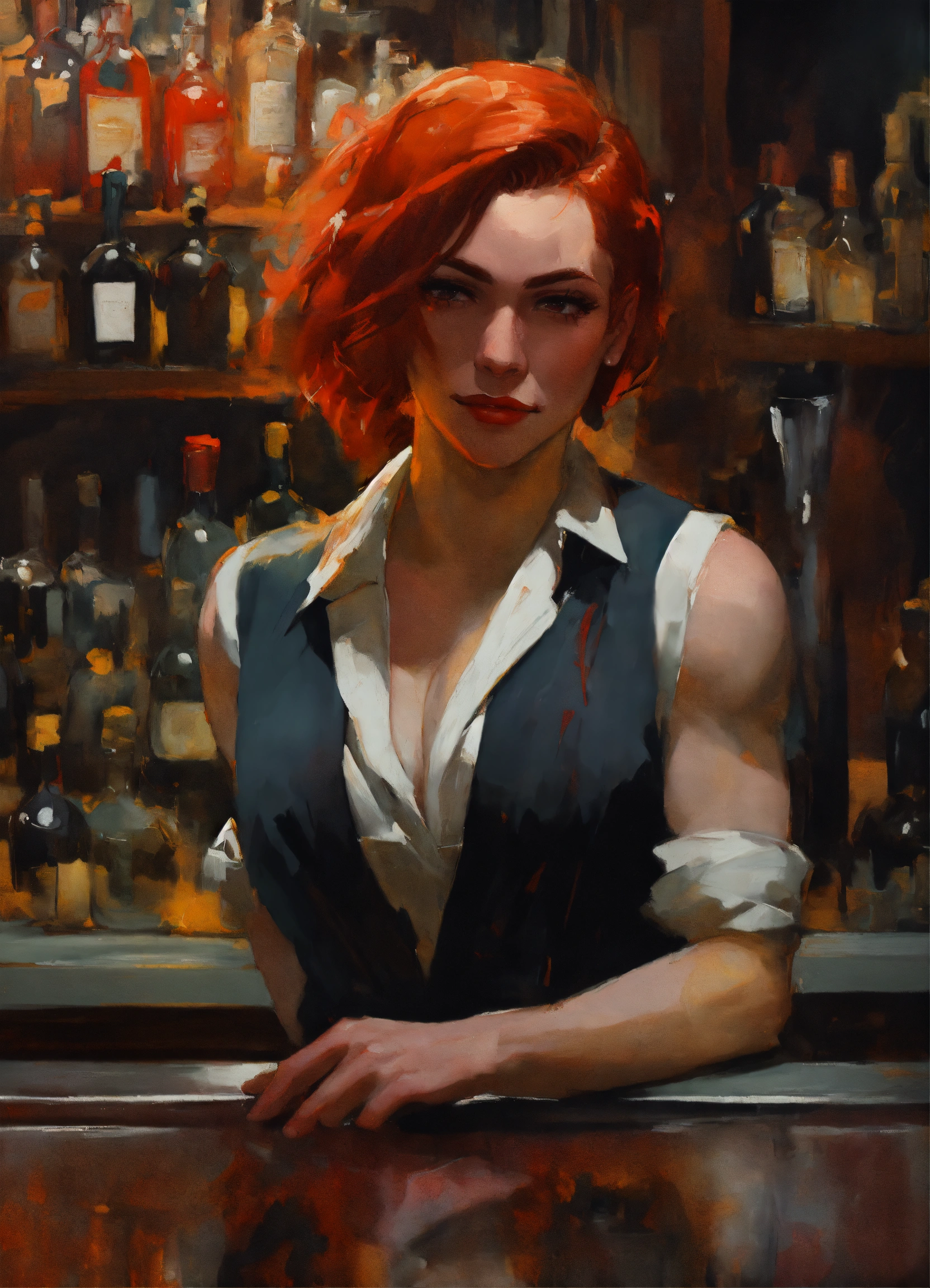 Bartender muscular woman red hair, smirking, behind a bar, muscular, 1920s, mafia aesthetic, noir aesthetic, intricate, messy, soft, oil painting, highly detailed, concept art, matte, by wlop, paint, paintbrush strokes
