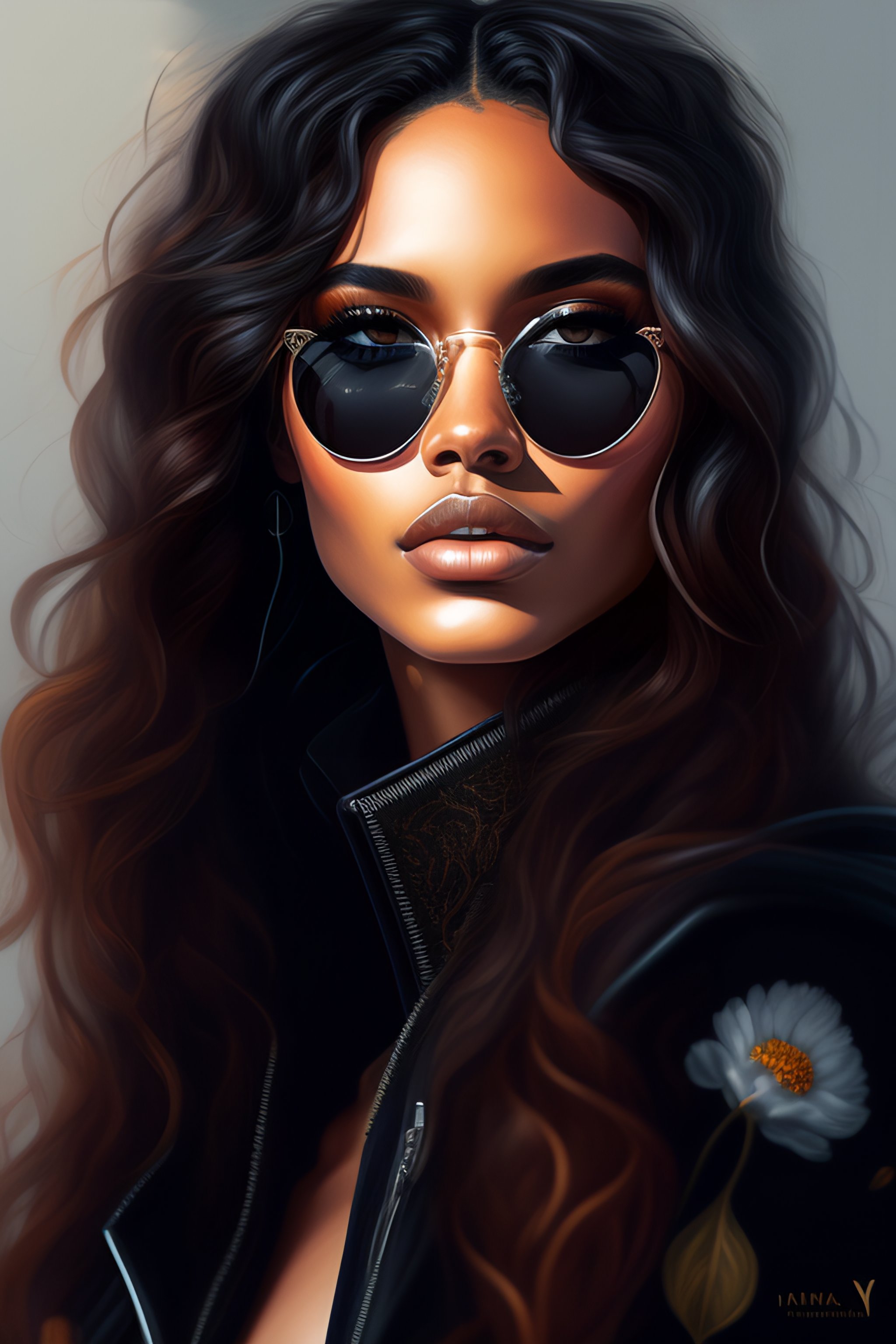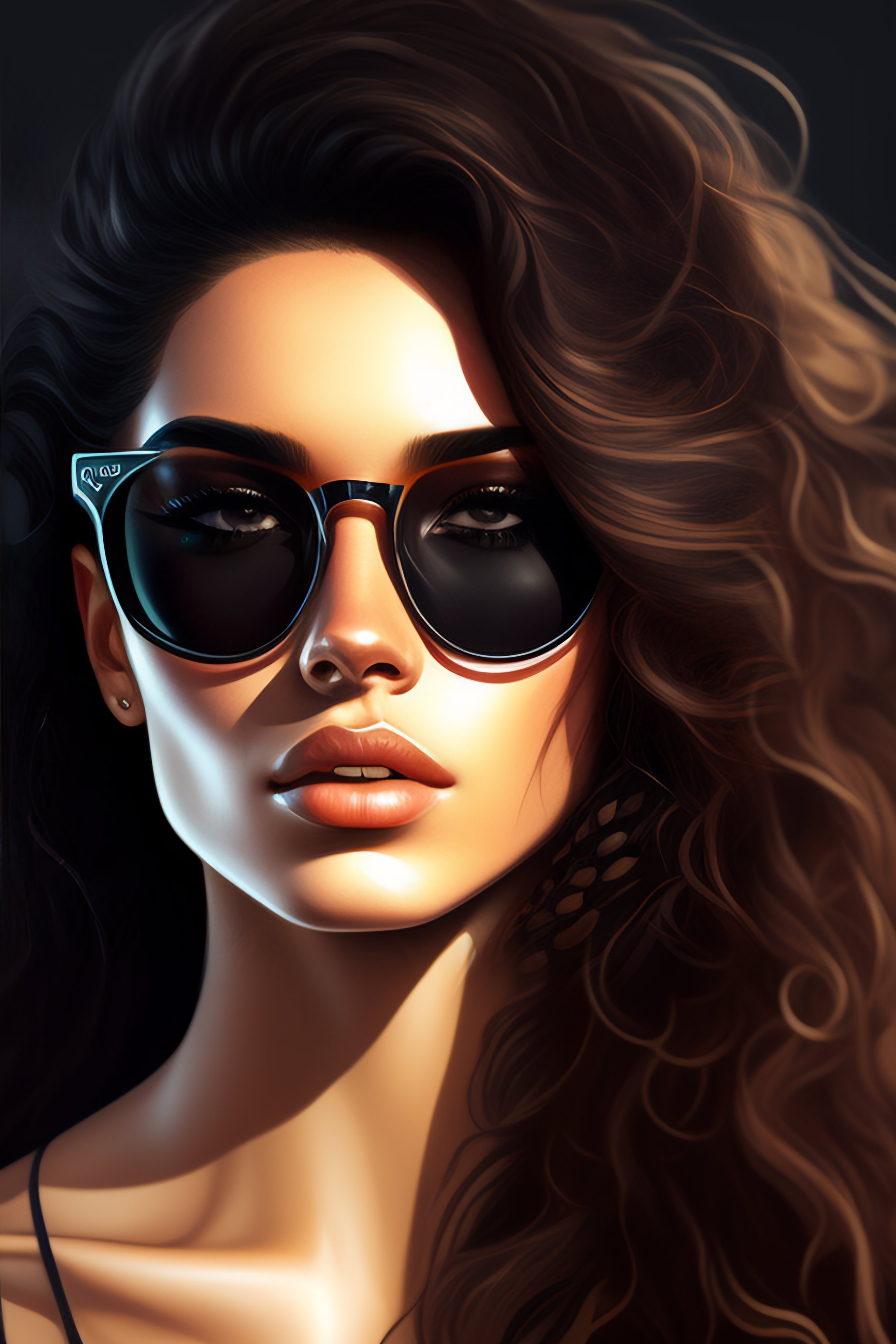 Black round shades, a full body portrait of a beautiful wild, intricate, elegant, highly detailed, digital painting, artstation, concept art, smooth, sharp focus, illustration, black long hair, black jacket, youthful, round face, messy hair, hippy, freckles