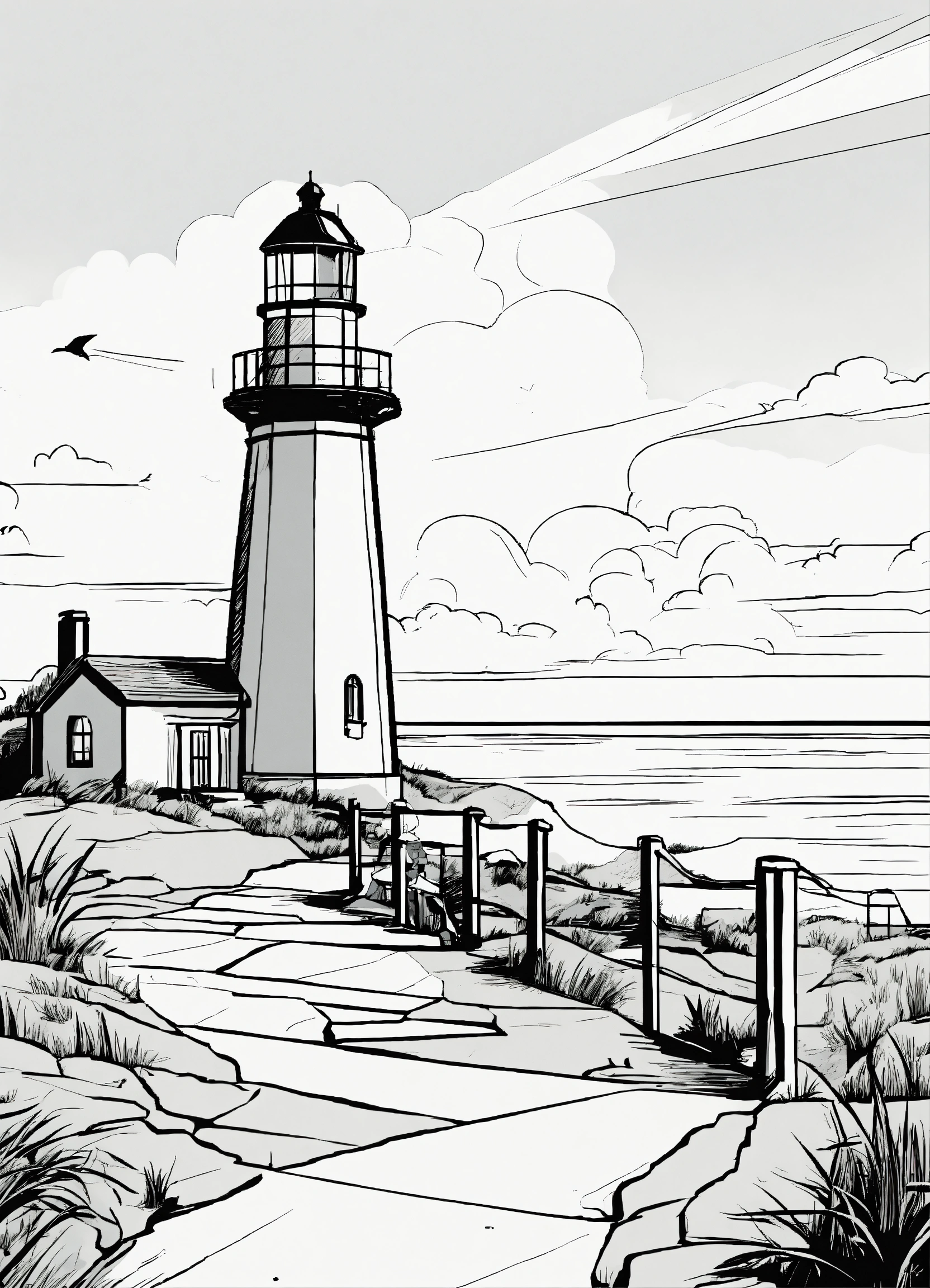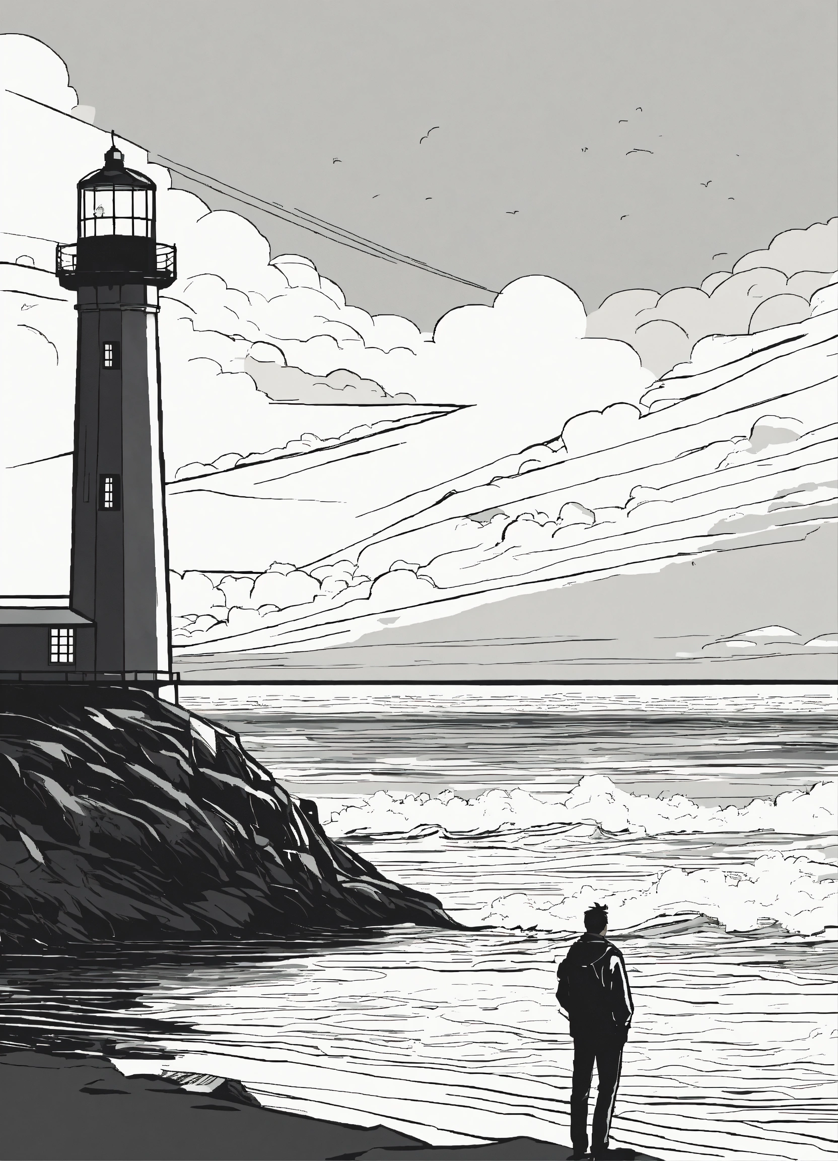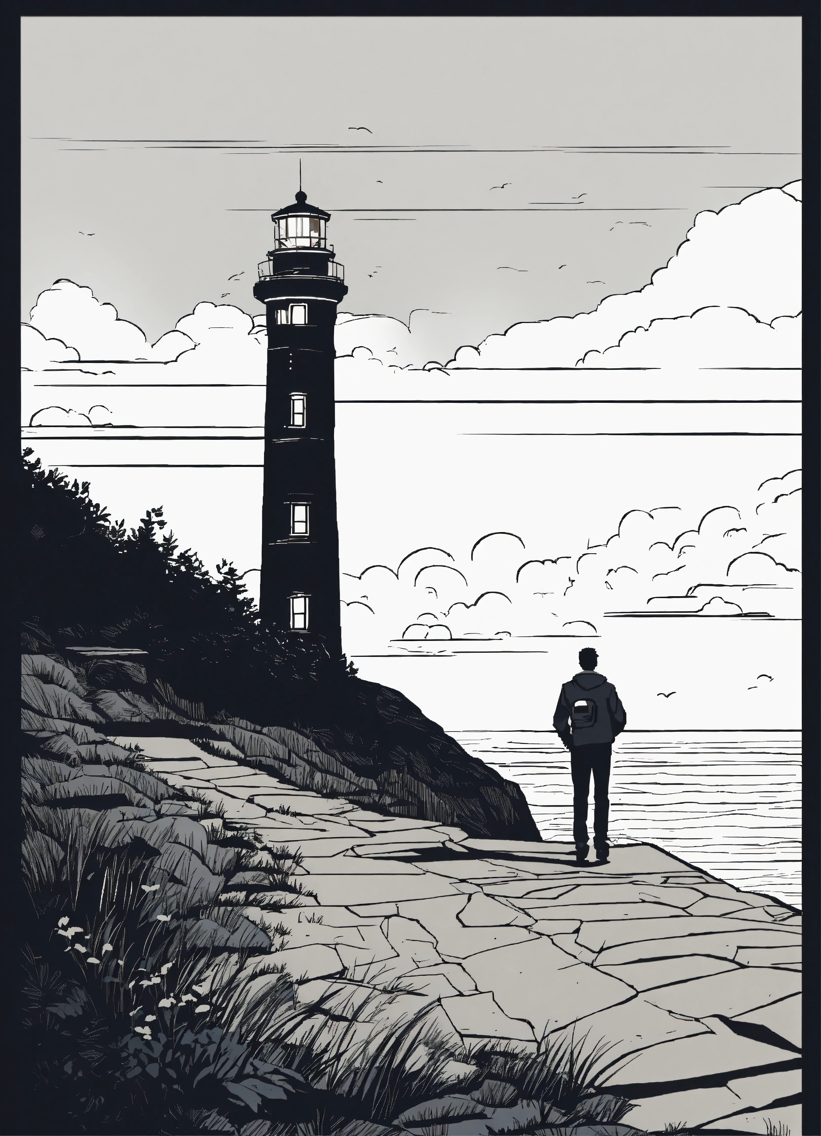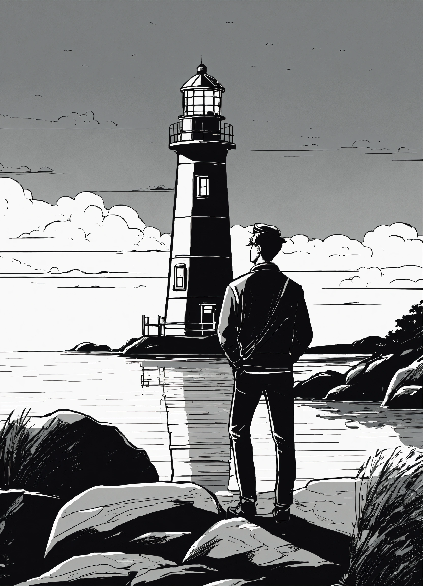 Guy looking at the lighthouse in the distance, line art vector comics cartoon, minimalistic illustration, vector illustration, black and white illustration