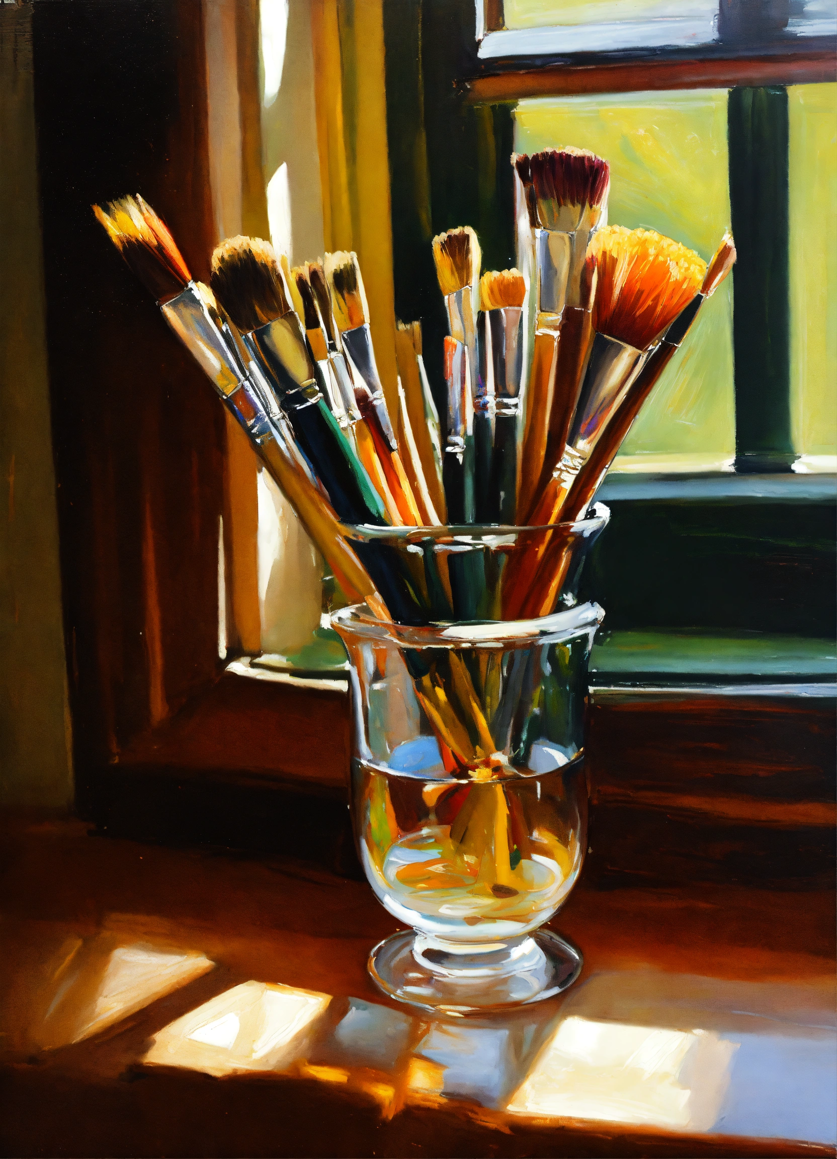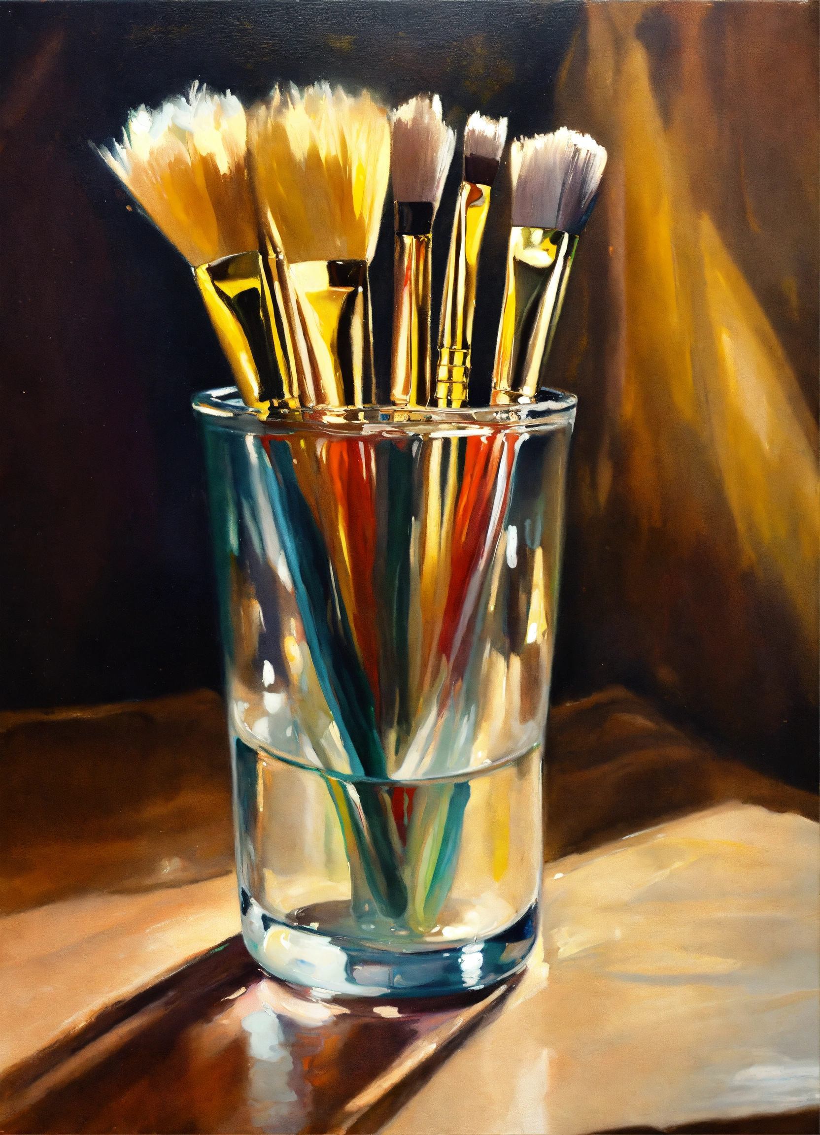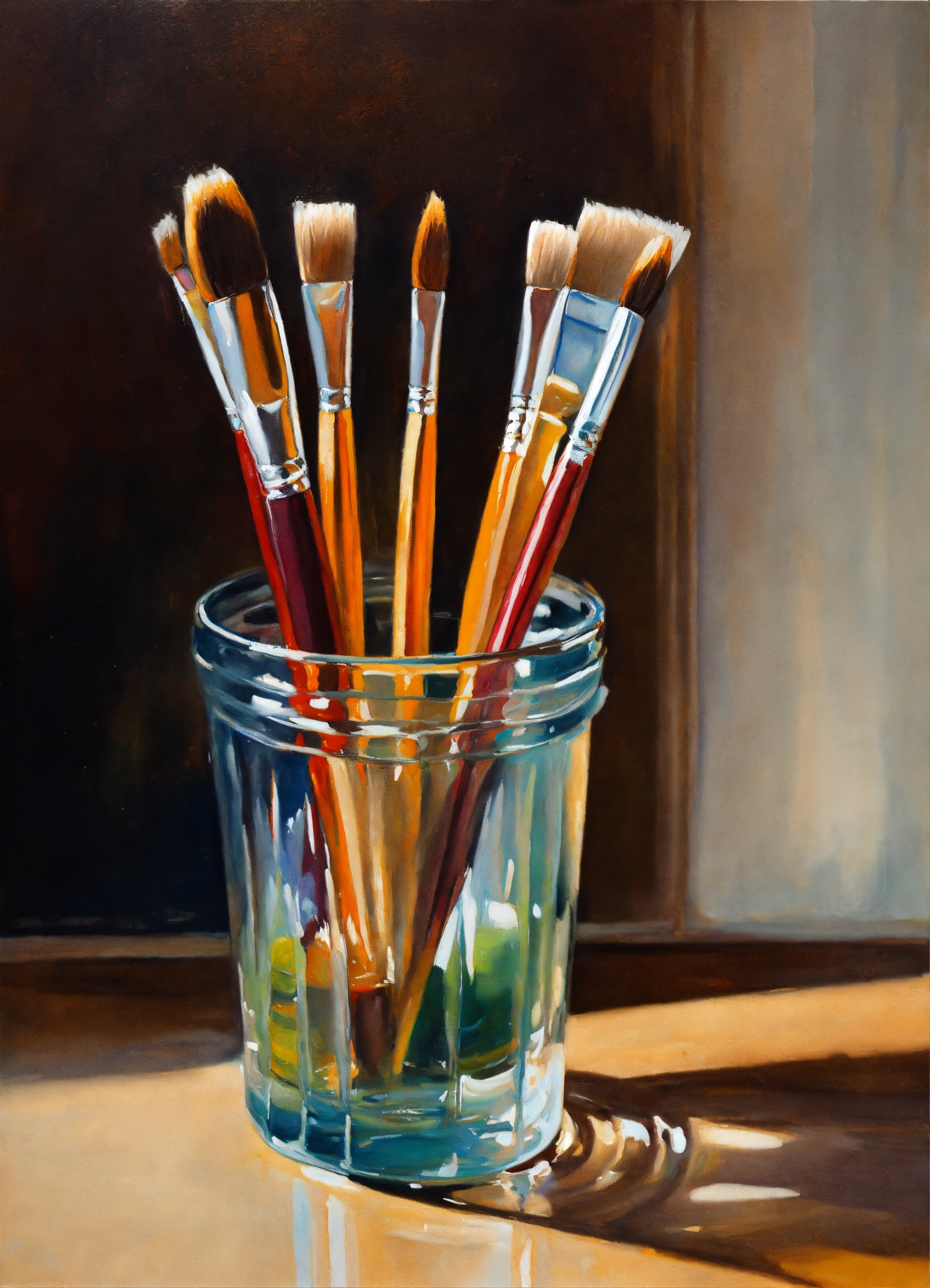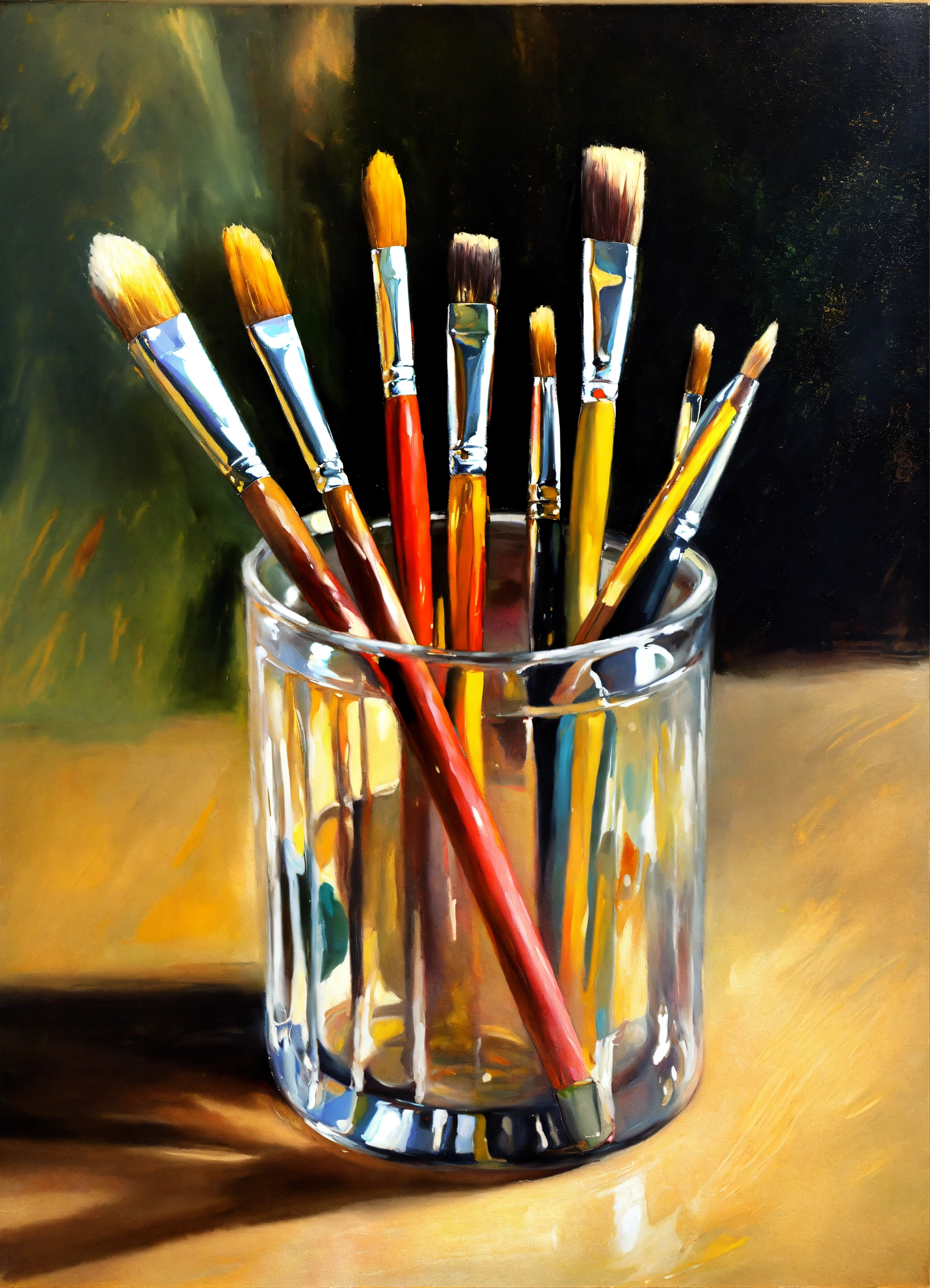 Oil painting of paint brushes in a glass cup in the style of john singer sargent