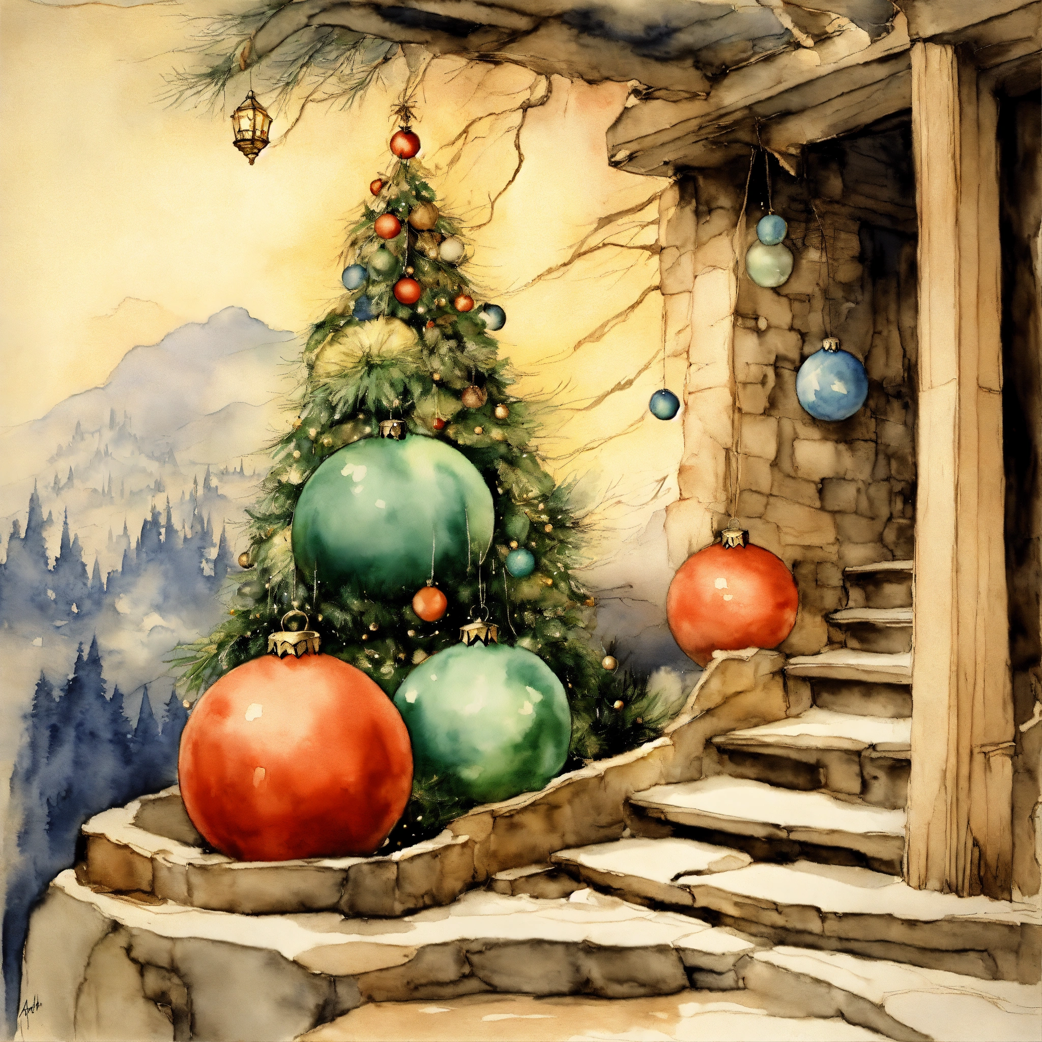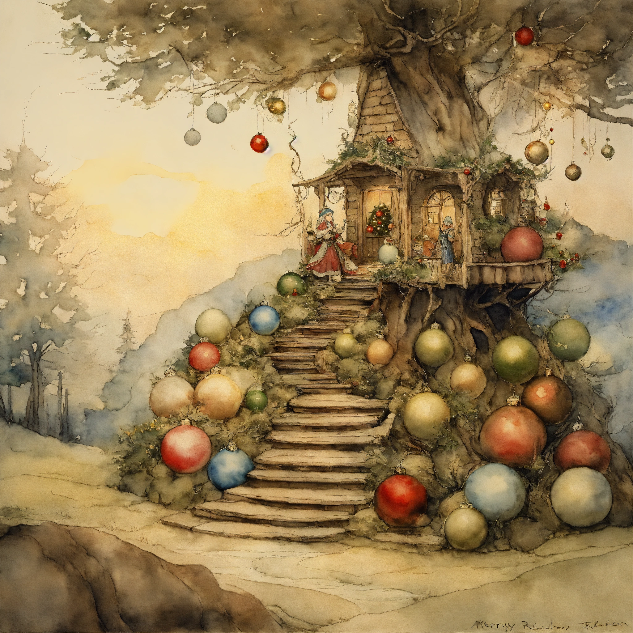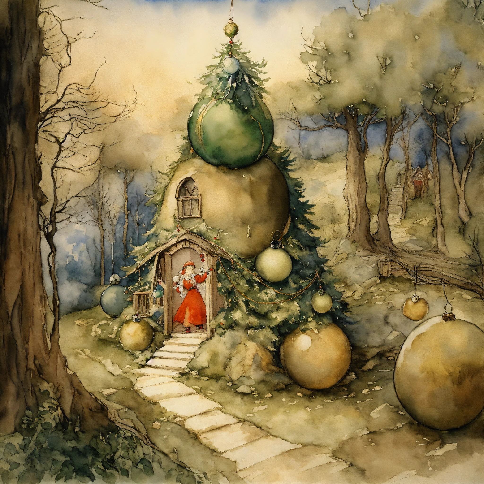 Elven quirky christmas tree land, a large baubles with steps leading into the bauble to make it a elfs home, realistic watercolour by arthur rackham