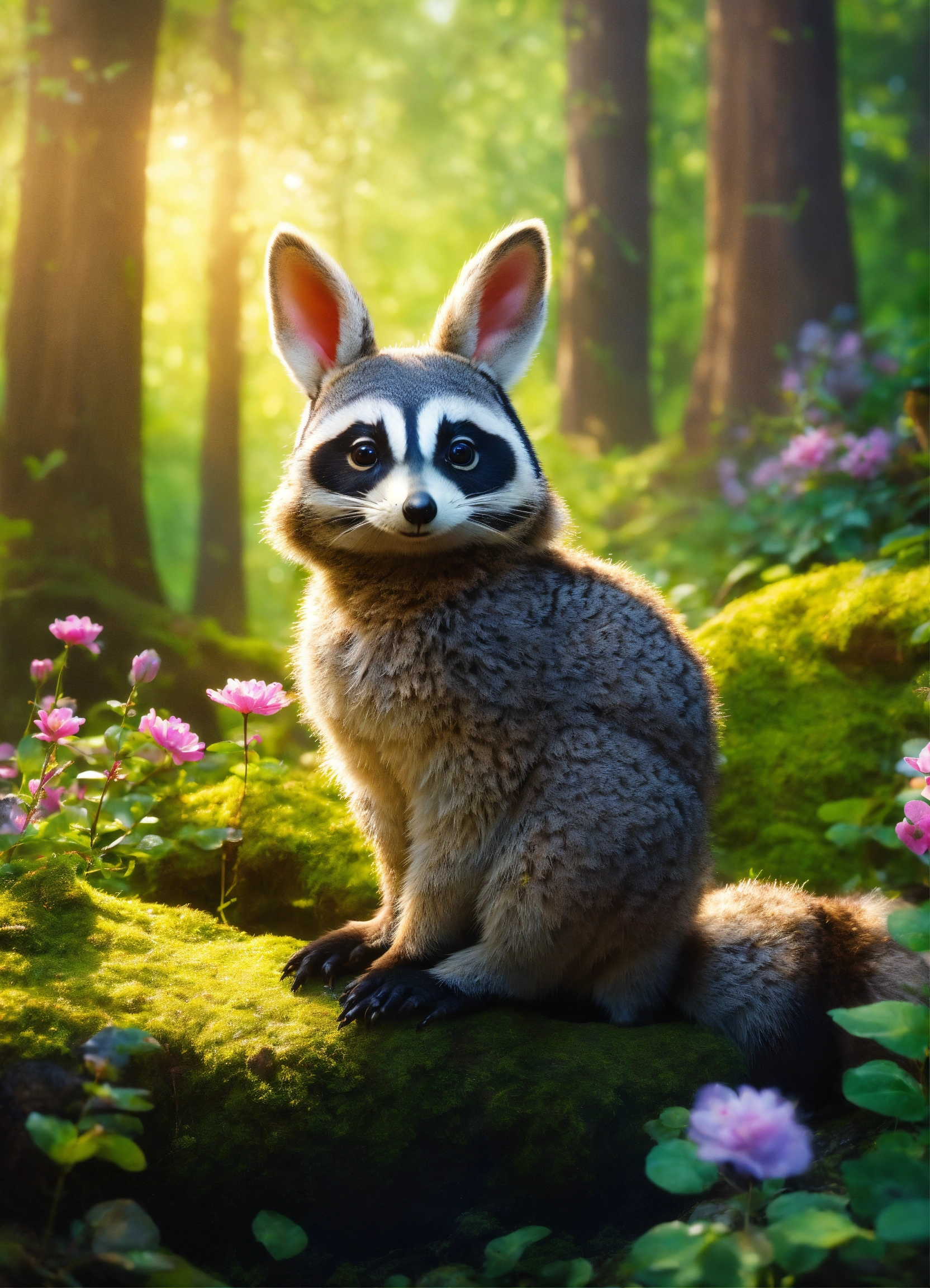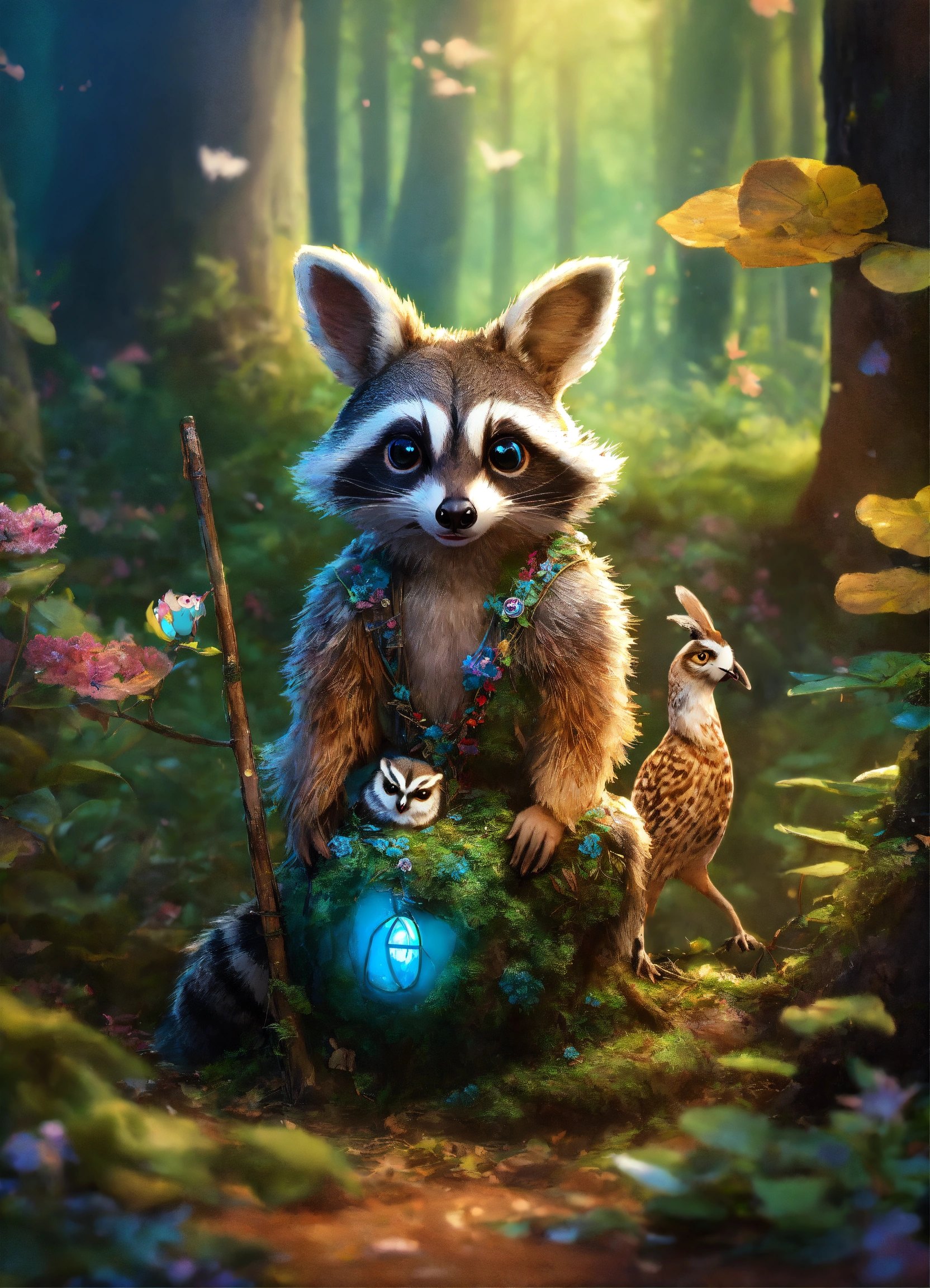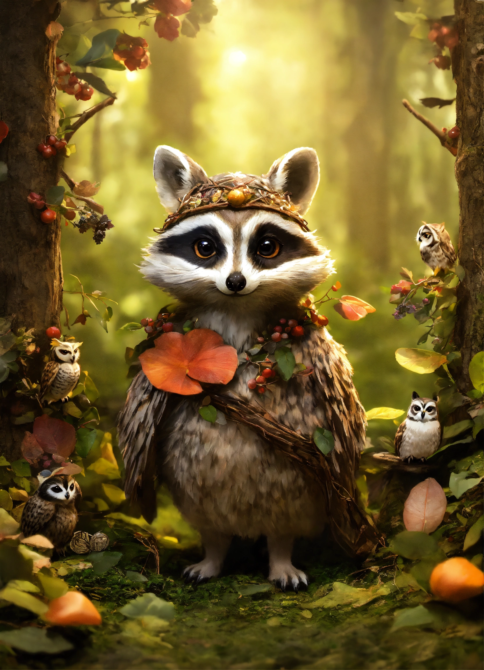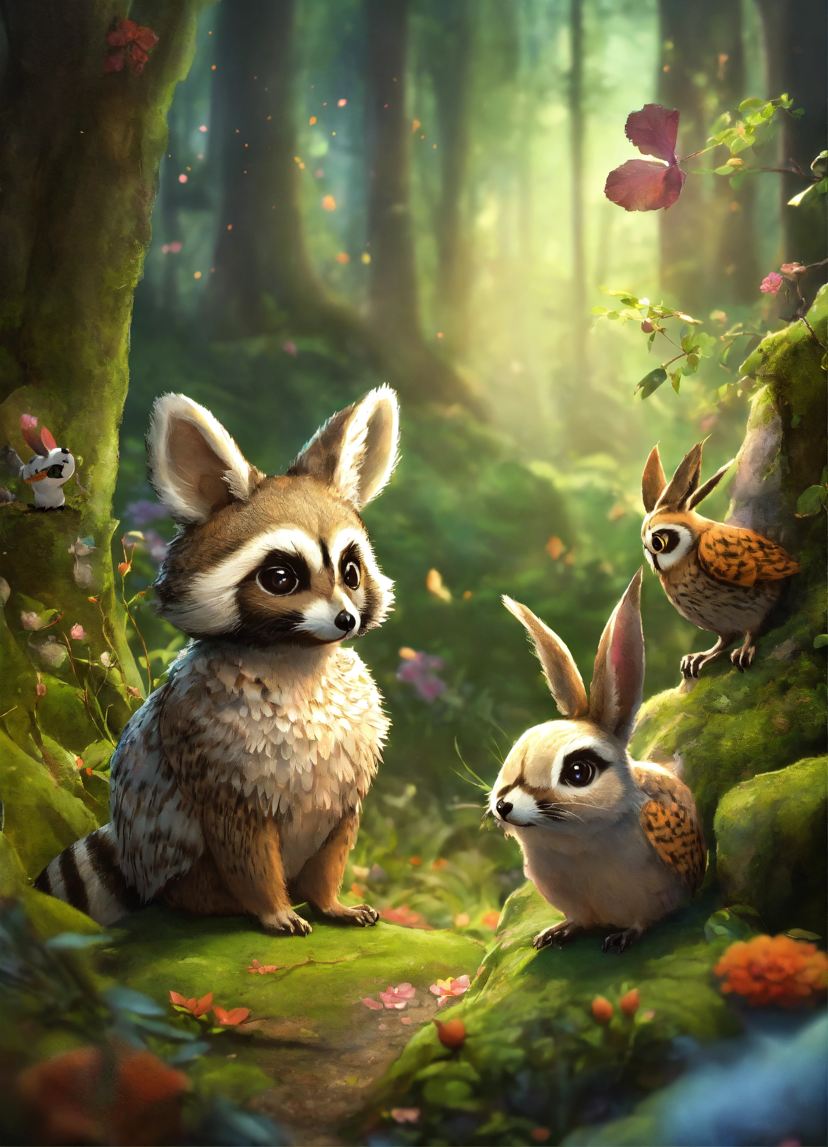 Raccoon rabbit and owl in the middle of the enchanted forest find a home