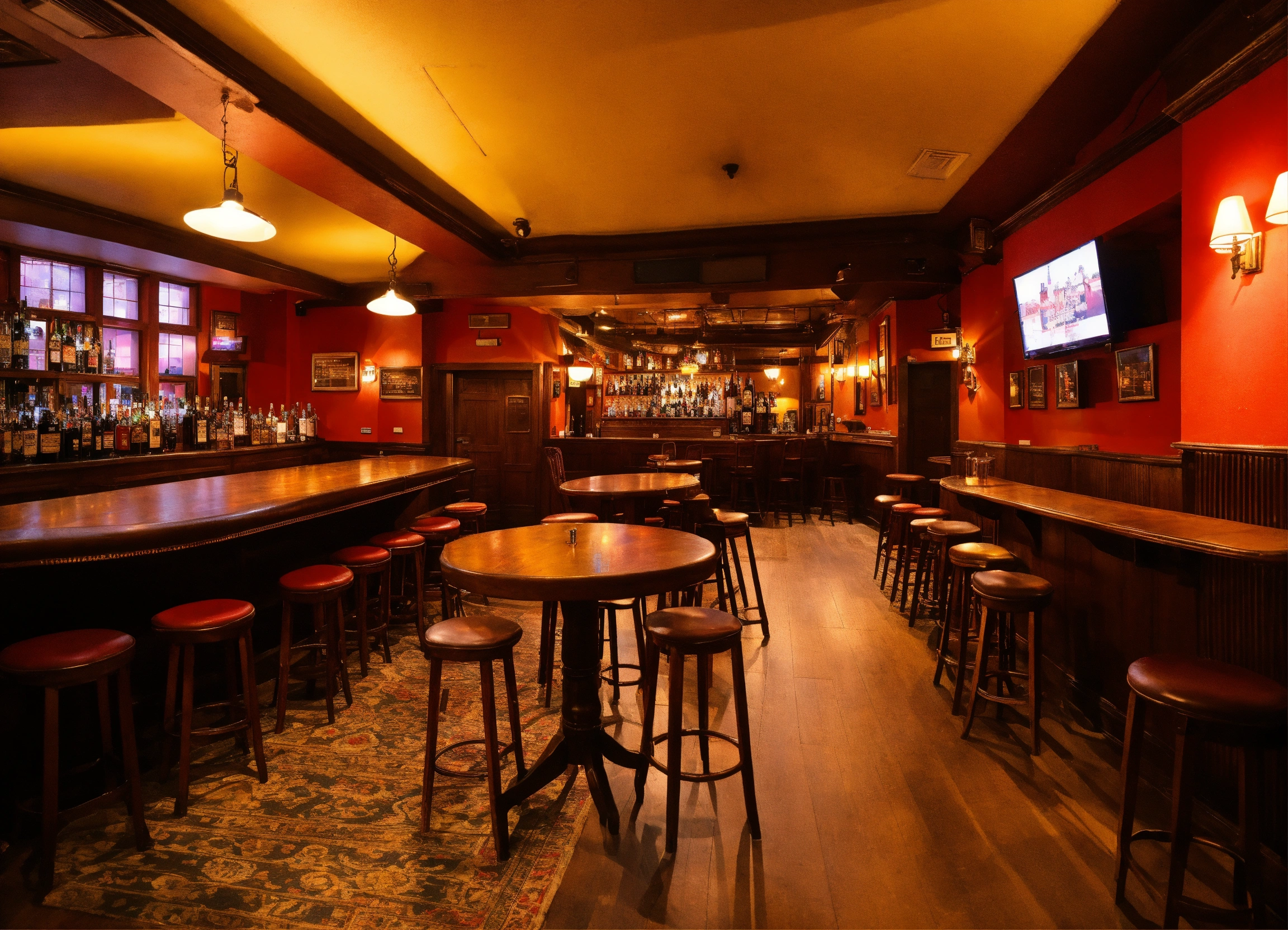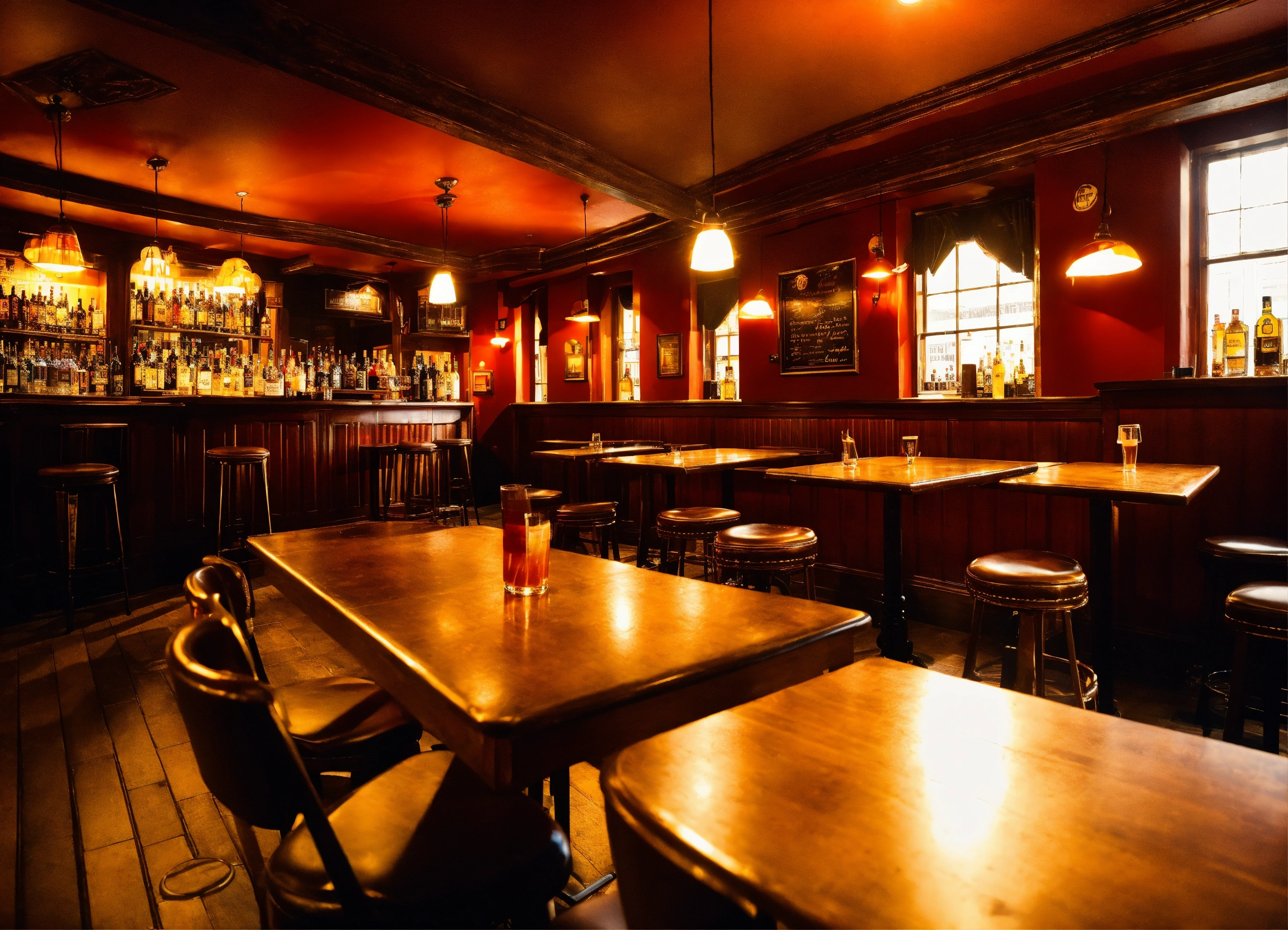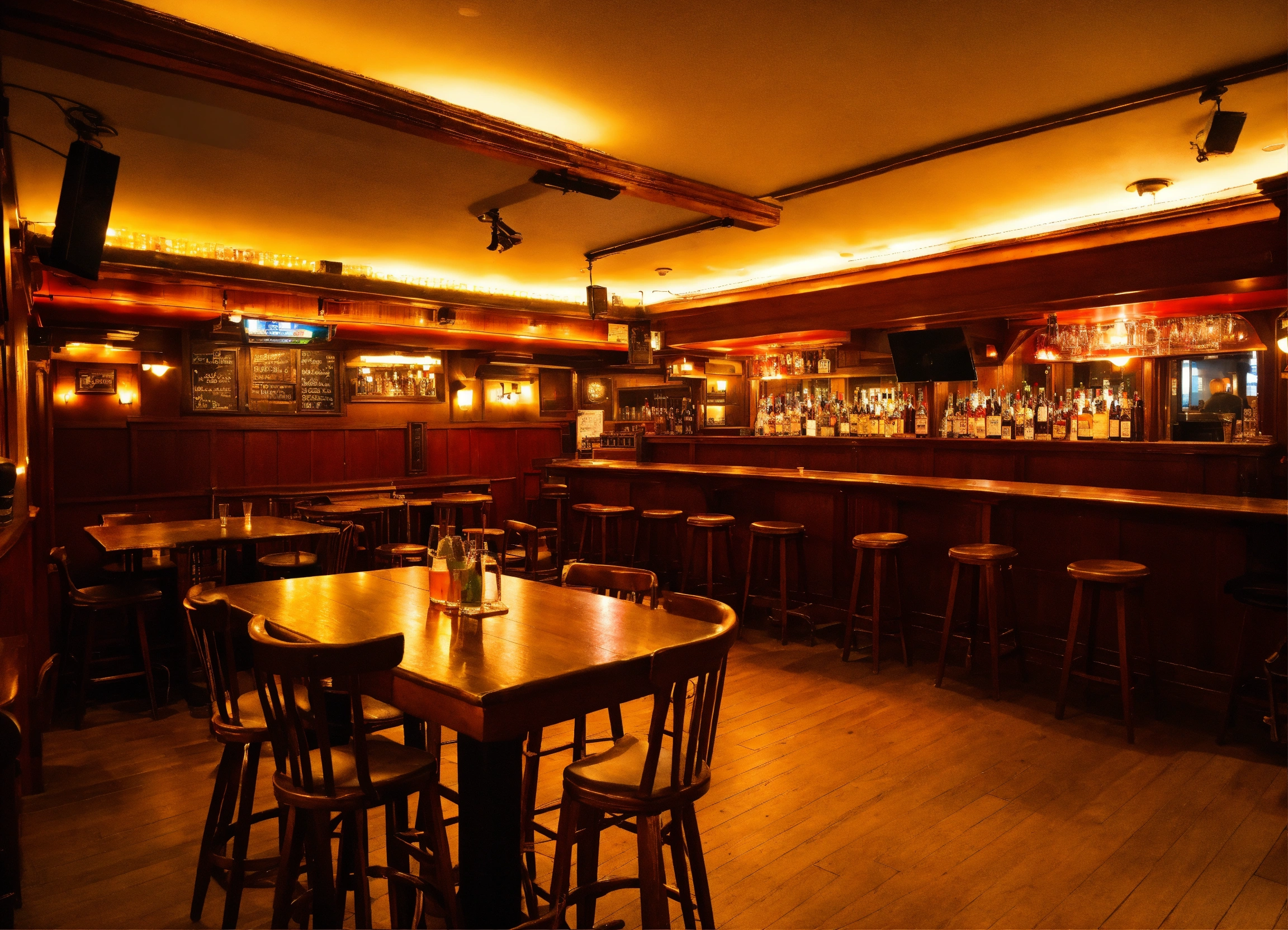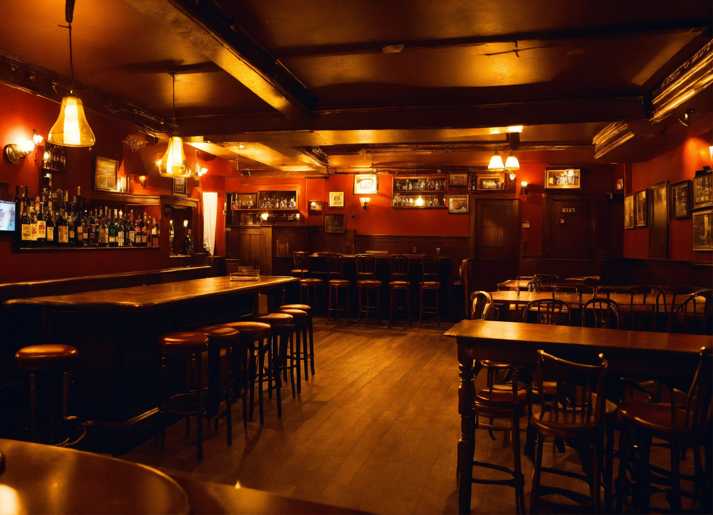 A small and empty pub, a 16 or 18mm wide angle lens, showing empty tables without people but with drinks still on the tables, small stage in the center, bar in the background, lighting with low and specific keys, yellows and reds predominating.