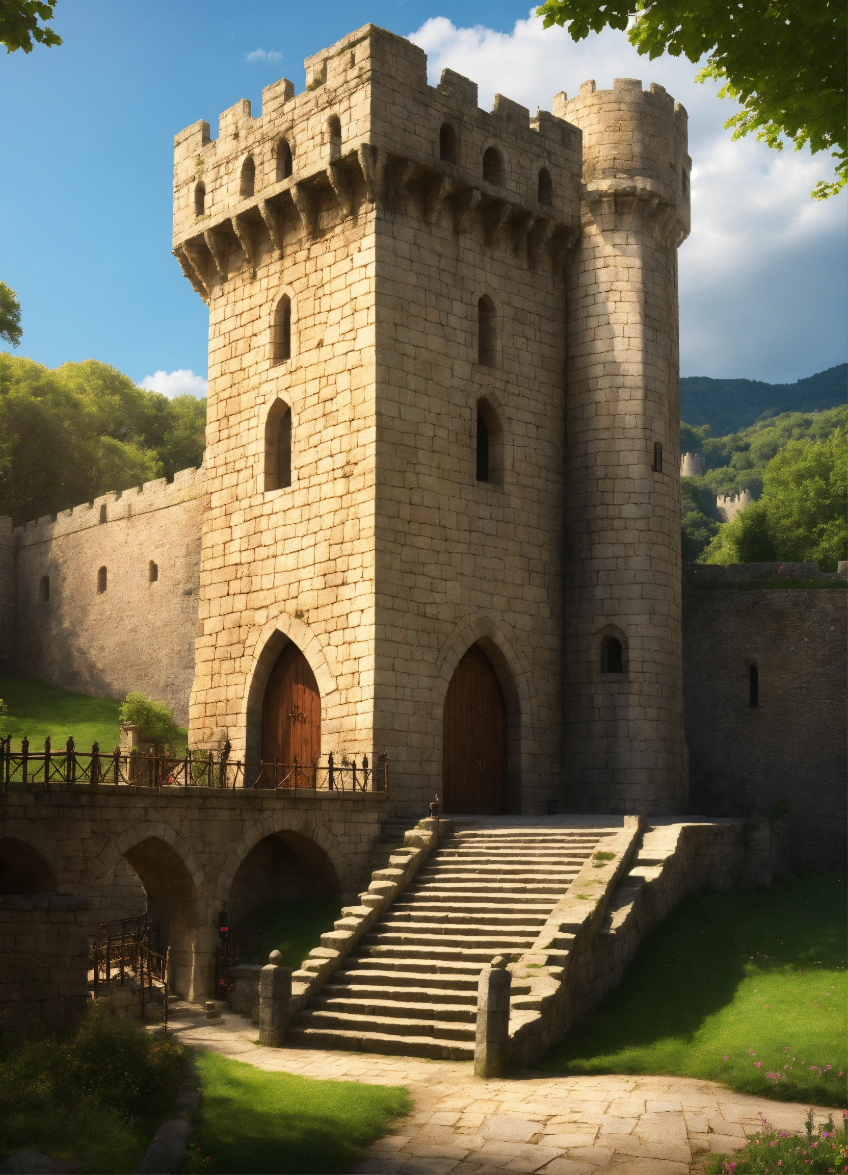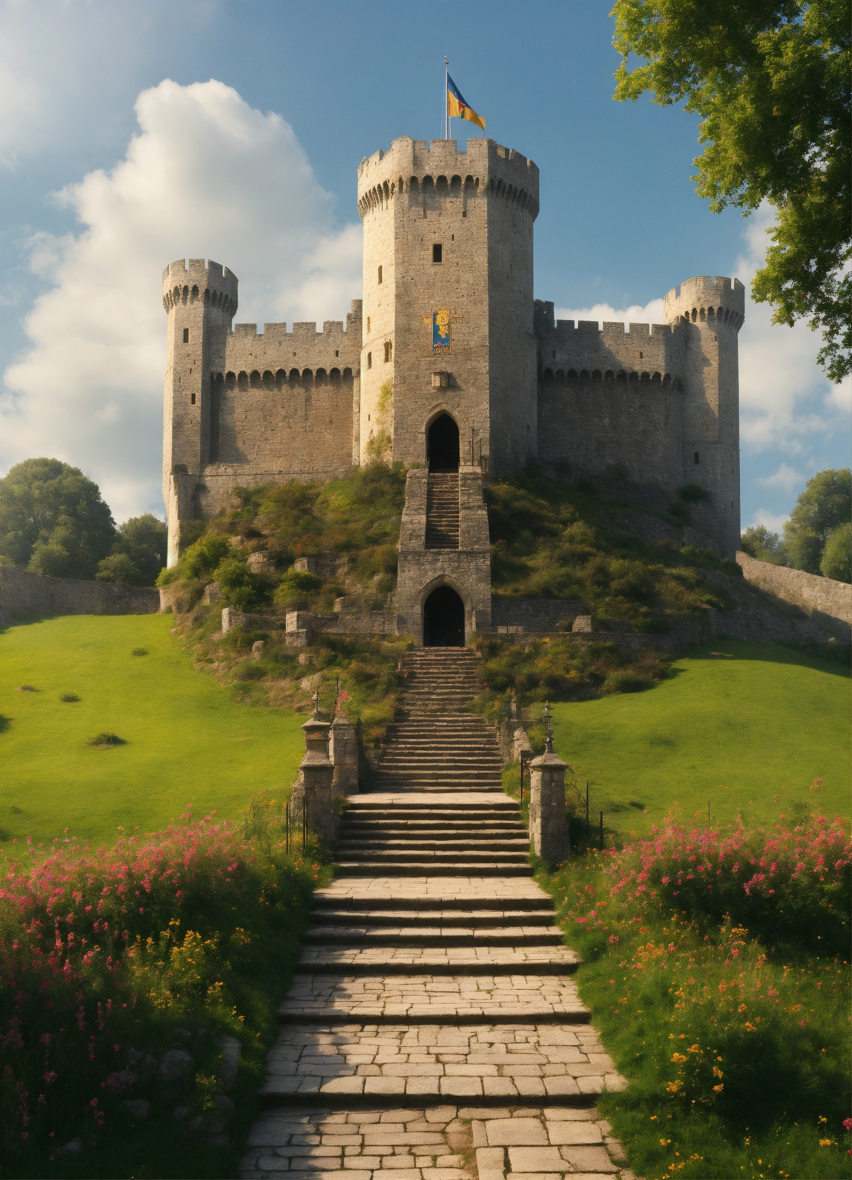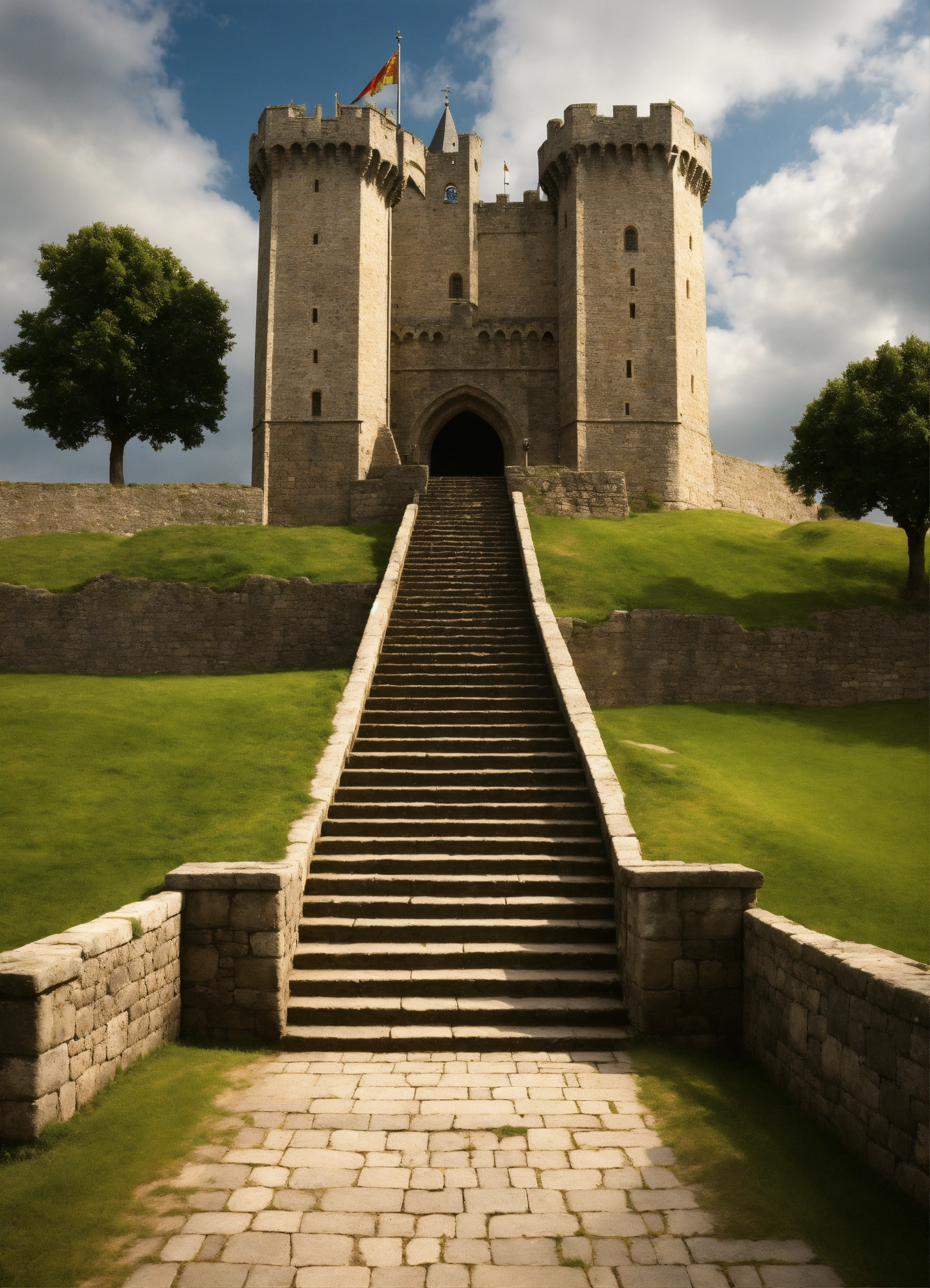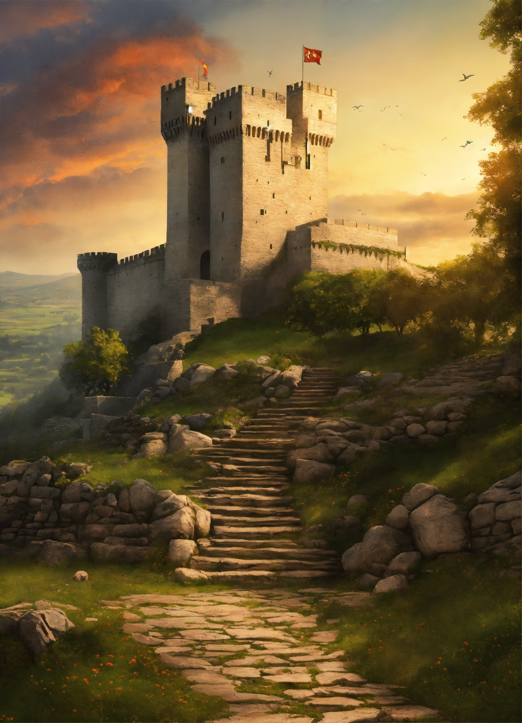 Create a book cover design medieval background outside castle in the left side there is a stairs set of 10 stone steps going to the king's tower, there's a railing on its side, the steps meet on a flat surface where there's another set of stairs that go down on the other side, in the background to the right there's an open field for warriors to train a swords training fields