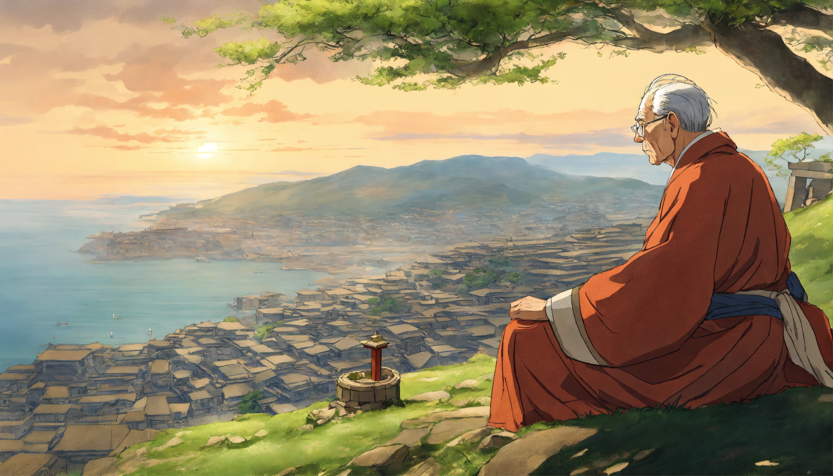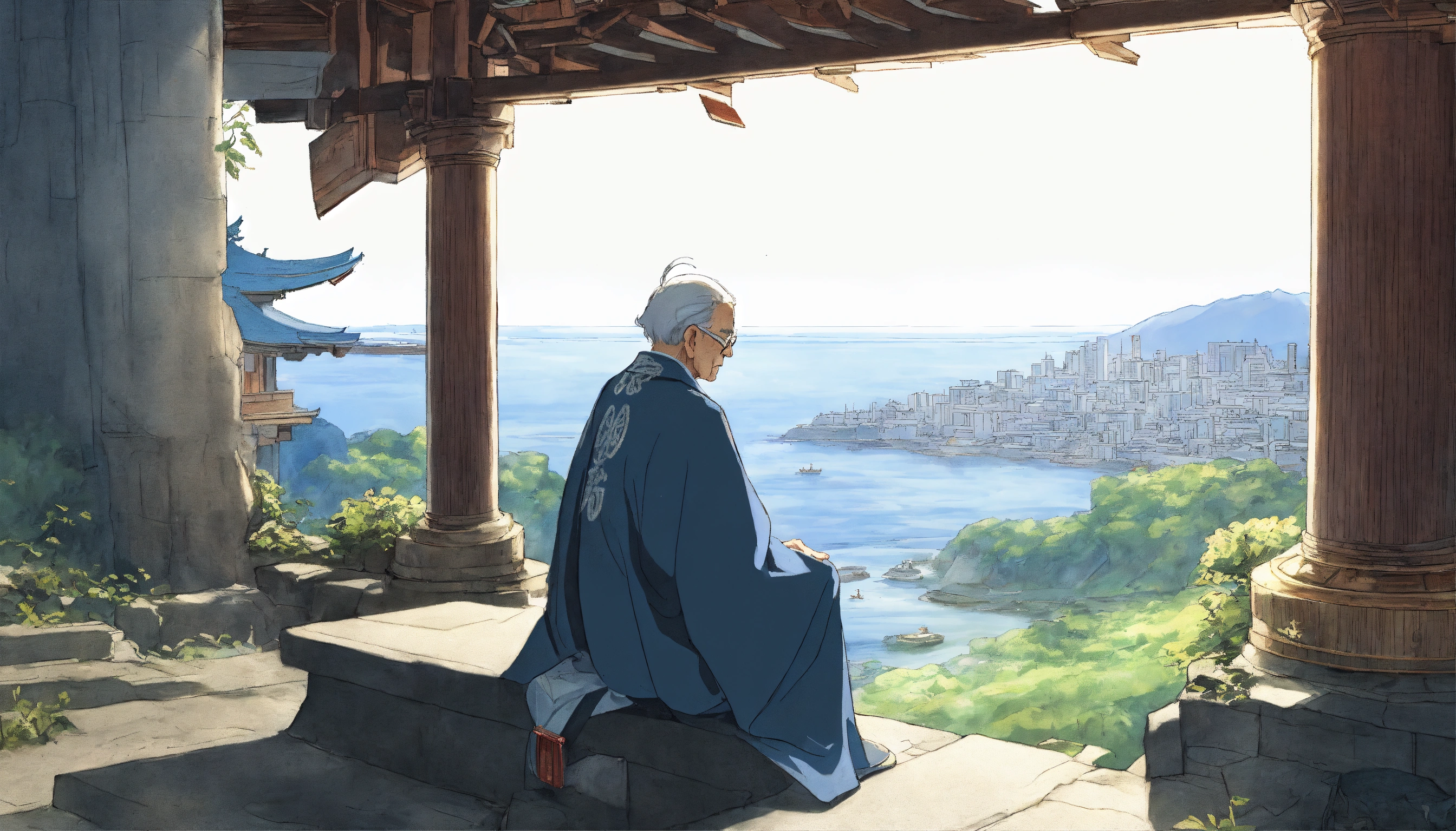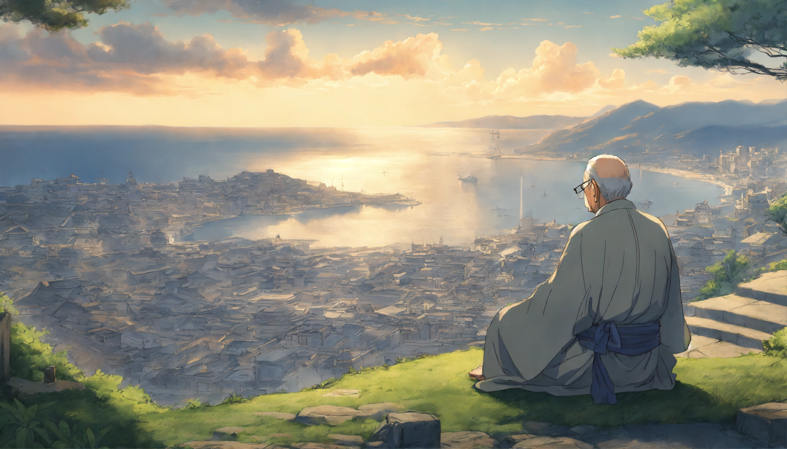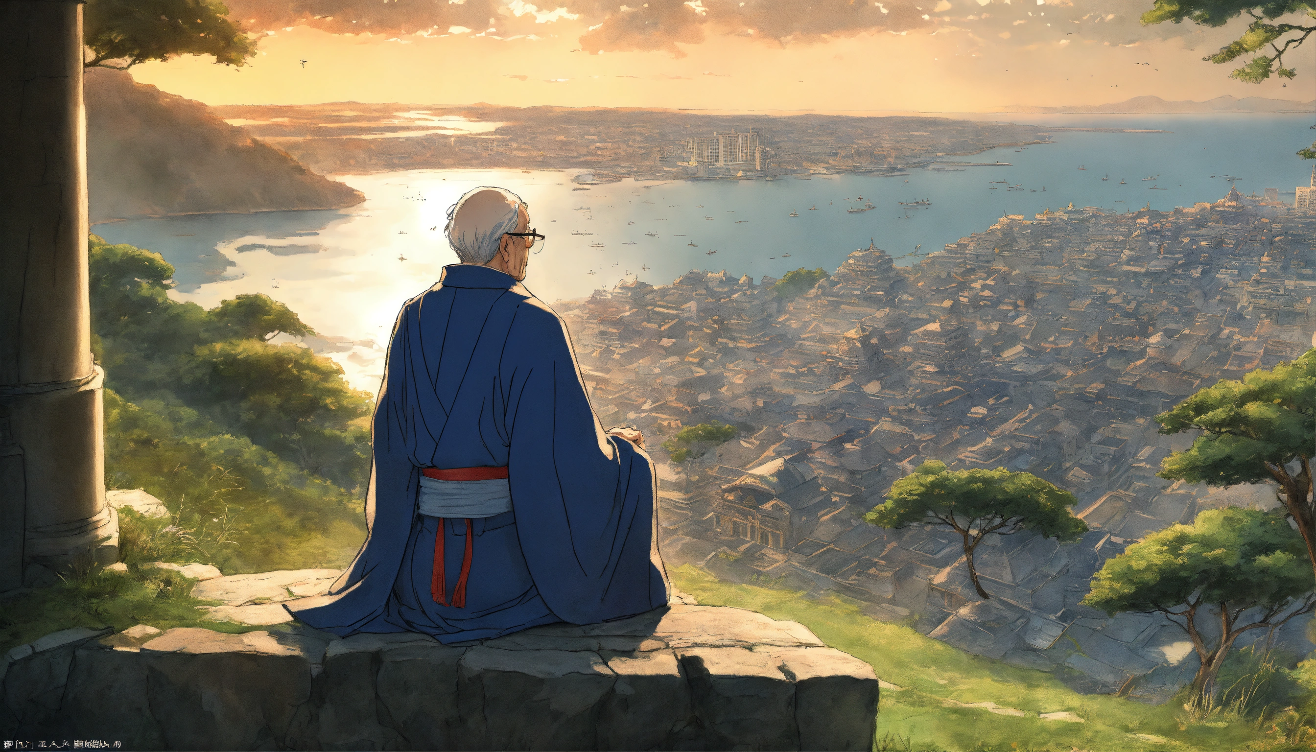 Masterpiece, best quality, an elderly man wearing robes sitting on the hillside near a shrine overlooking ruins of the modern city with a sea seen far below, drawn by pencil, digital art, art by hiromu arakawa, osamu tezuka, 8 k, beautiful drawing, highly detailed, concept art, sharp focus, ultra realistic illustration, anime++