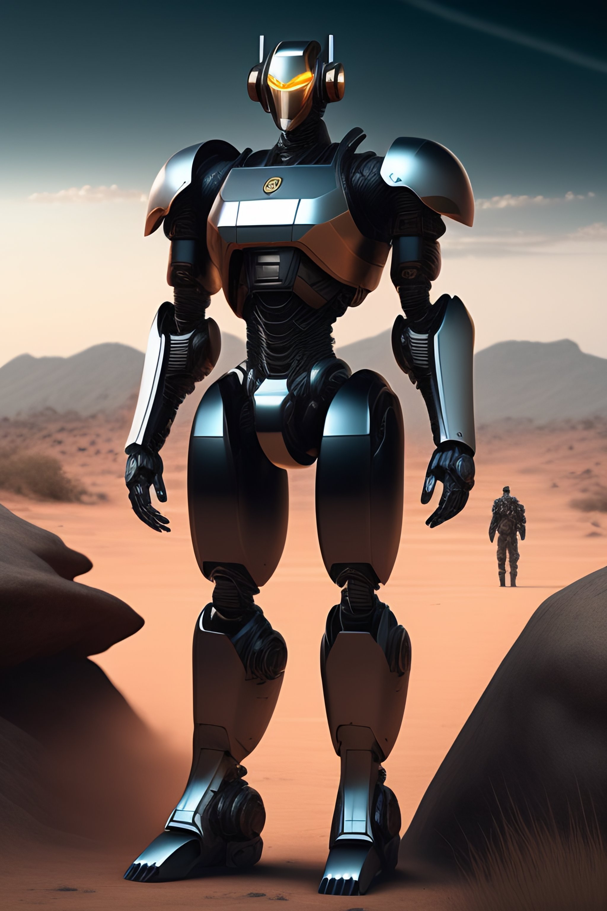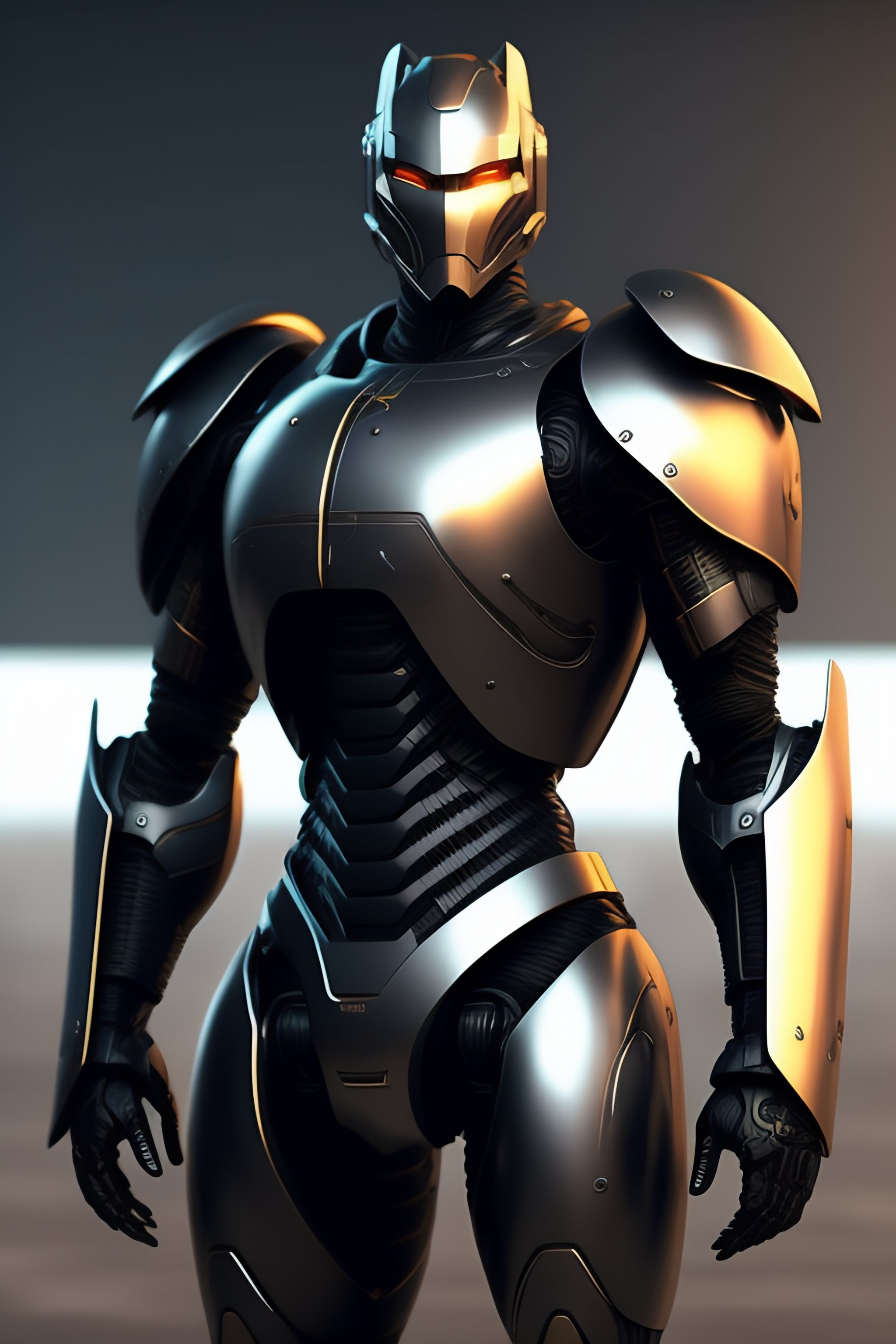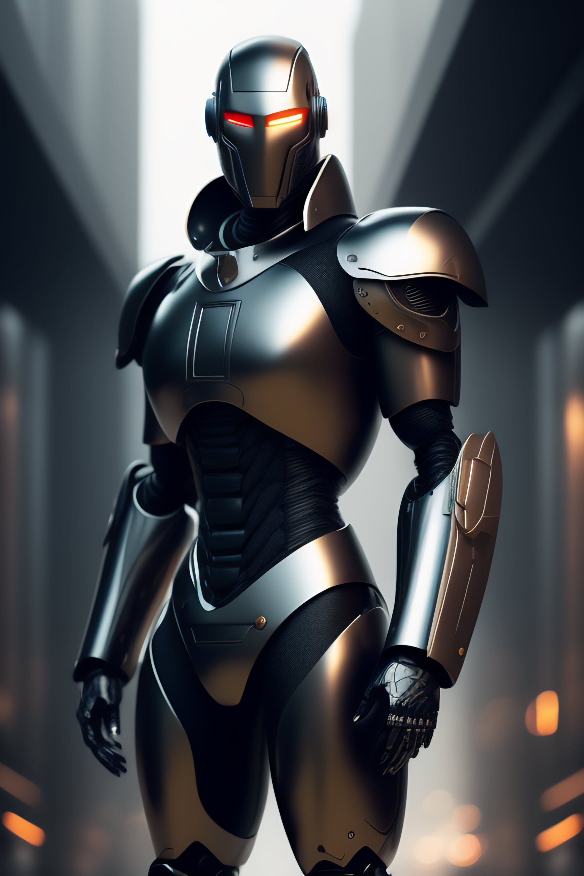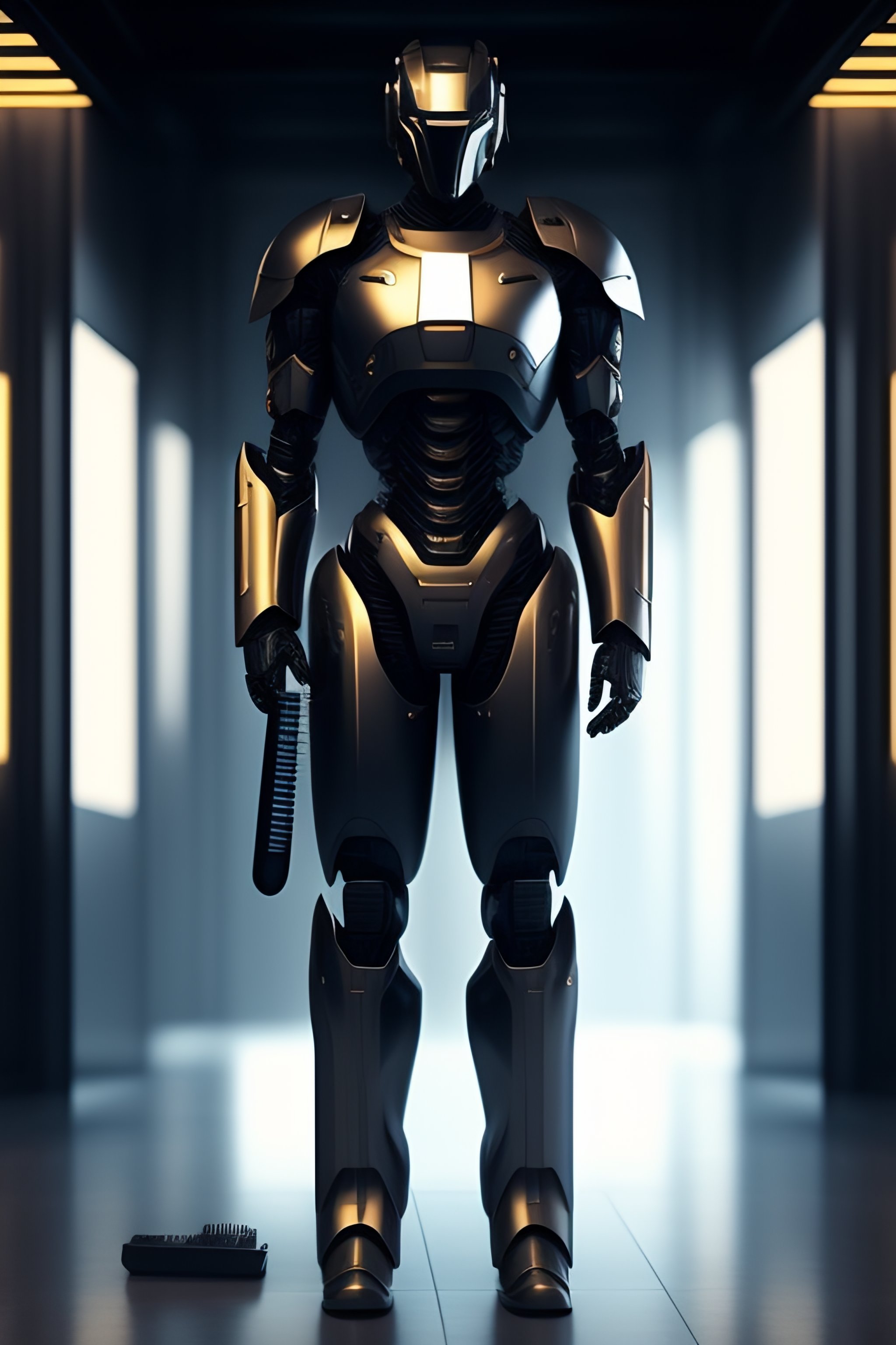 An male human like robot investigator with sleek, body off gray dull matte metal, with advanced technology and mechanical retractable tools, a machete for fight, and all of which give them a highly rpg fantasy look.