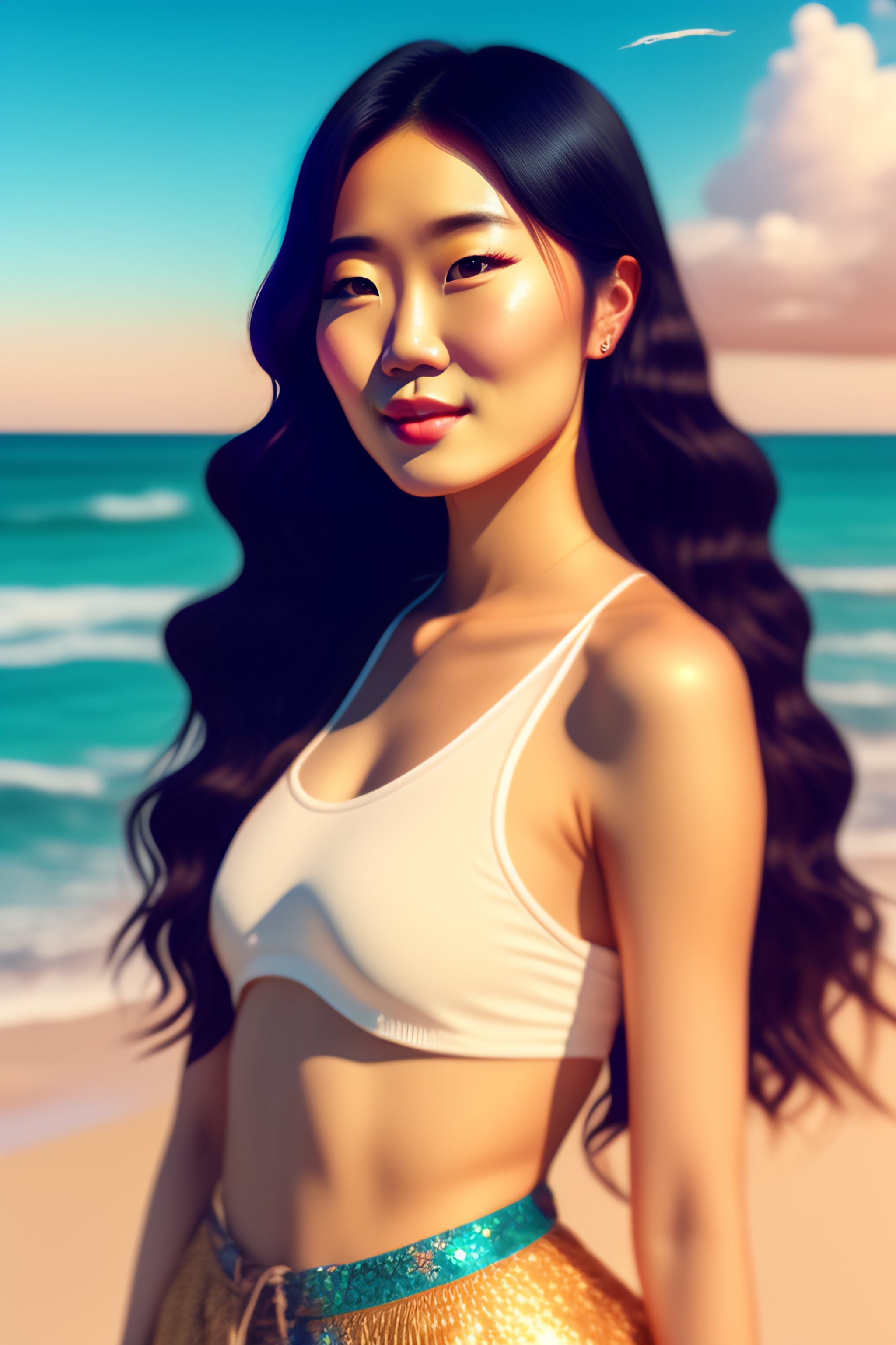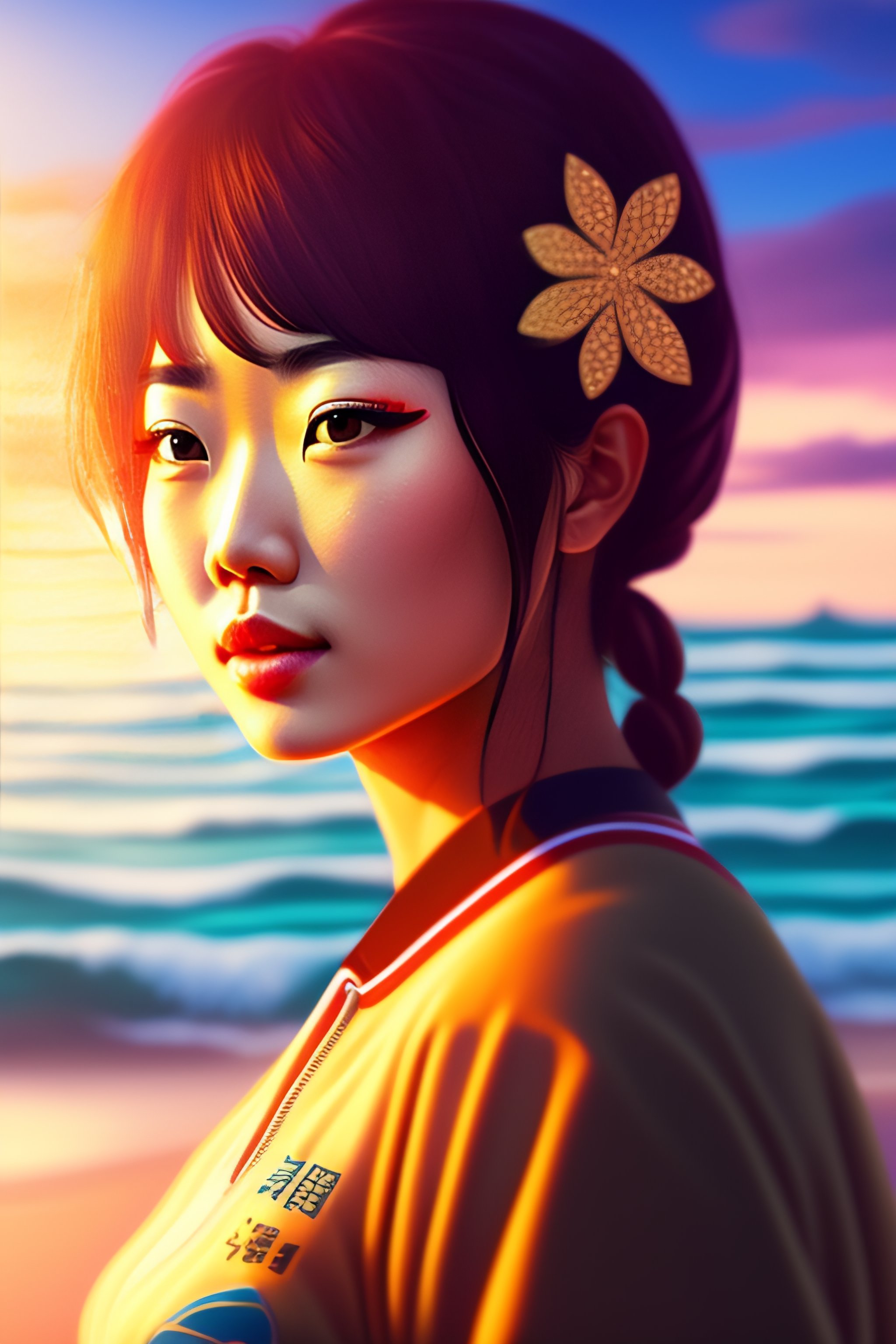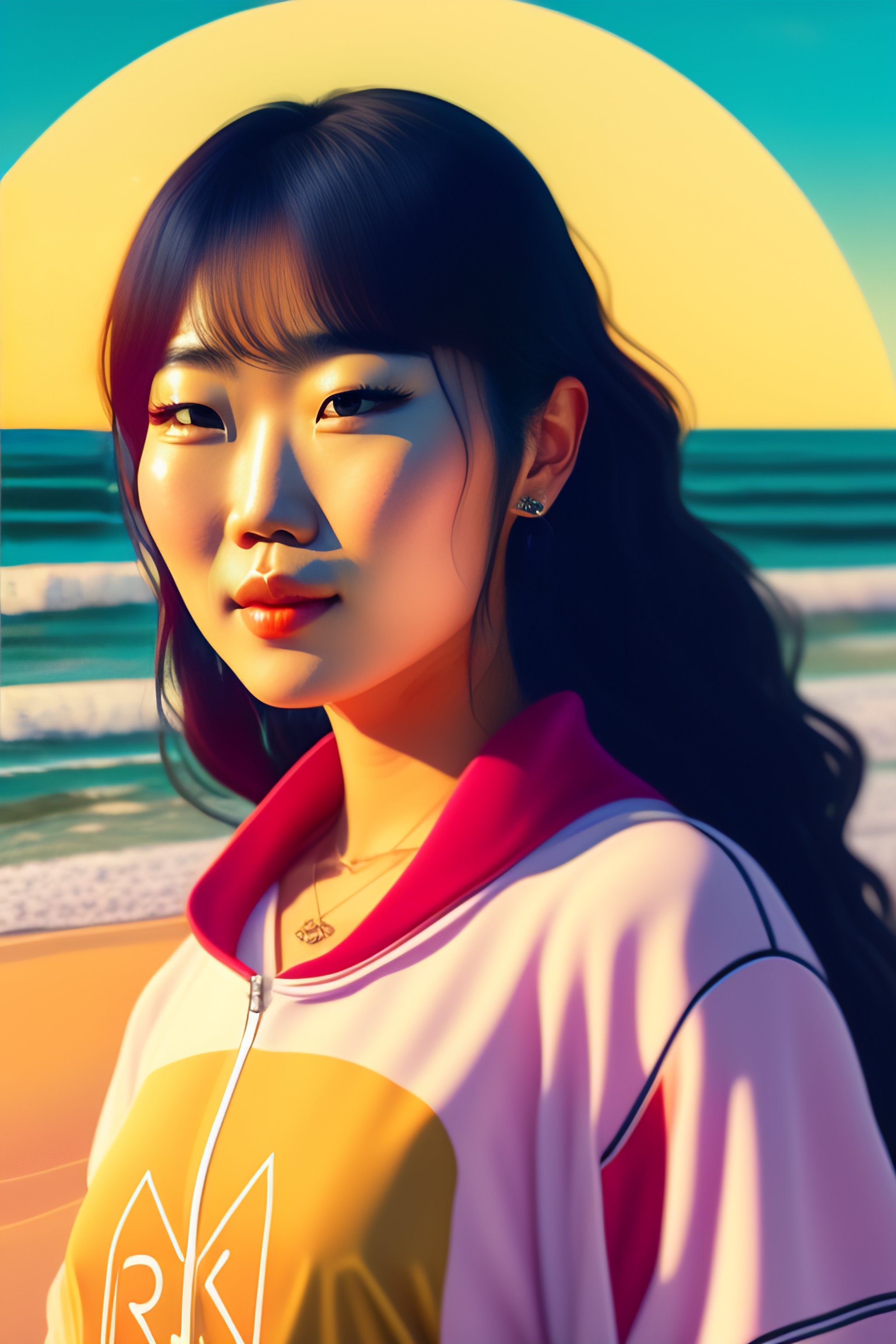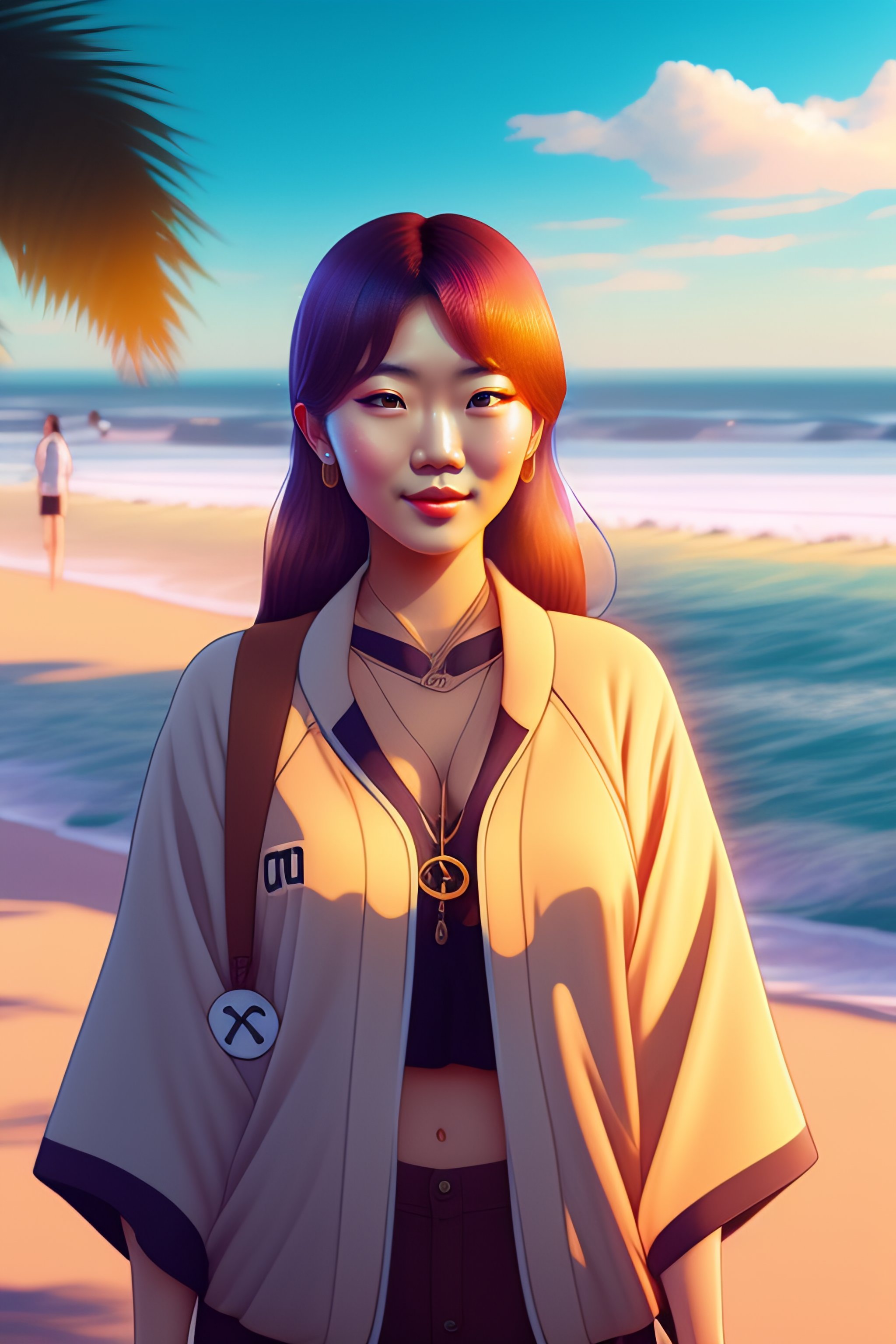 Digital illustration of riko nagai from terrace house, on the beach, 4k, intricate, anime, cute, peace sign, cluttered, golden hour, beautiful