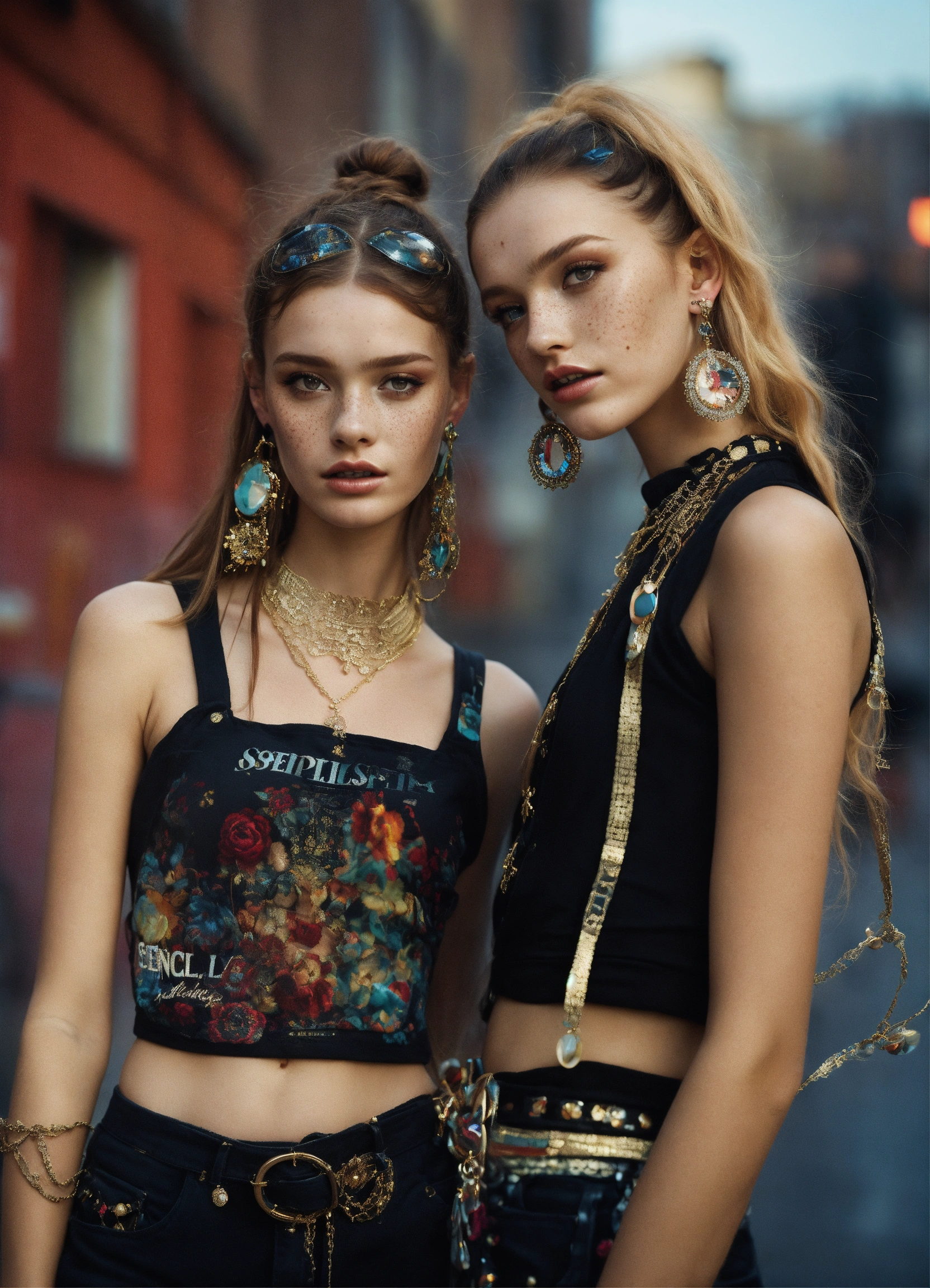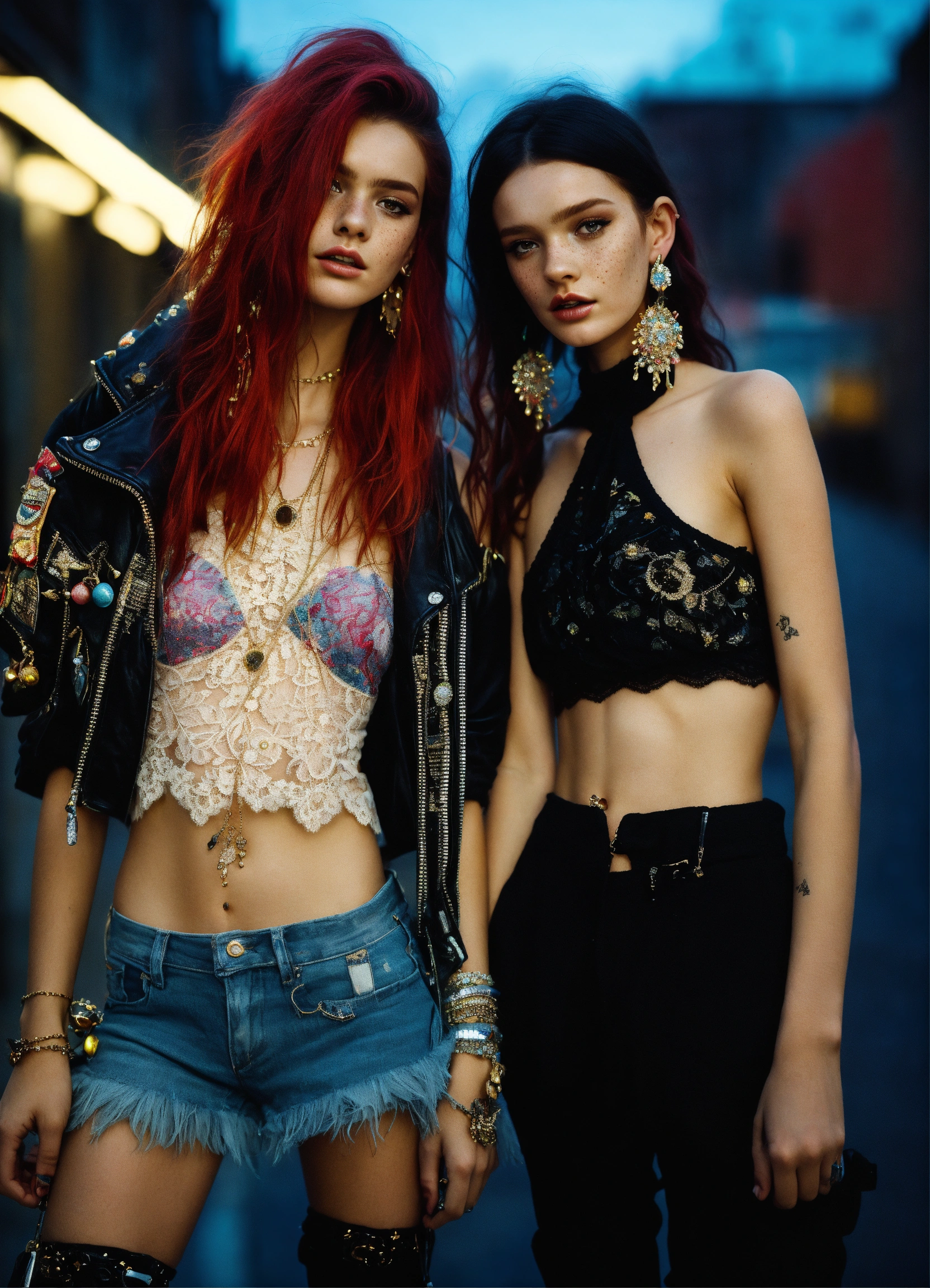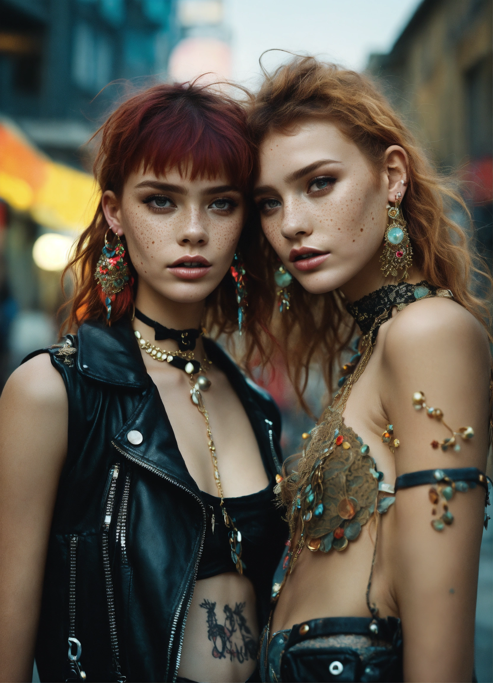 Two girls, magazine cover, in a punk outfit1.3, freckles, street style, serendipity, 100mm, sharp, fashion art1.2, rock style, urban environment, earrings, lace, long_hair, navel, by marta bevacqua and david lachapelle
