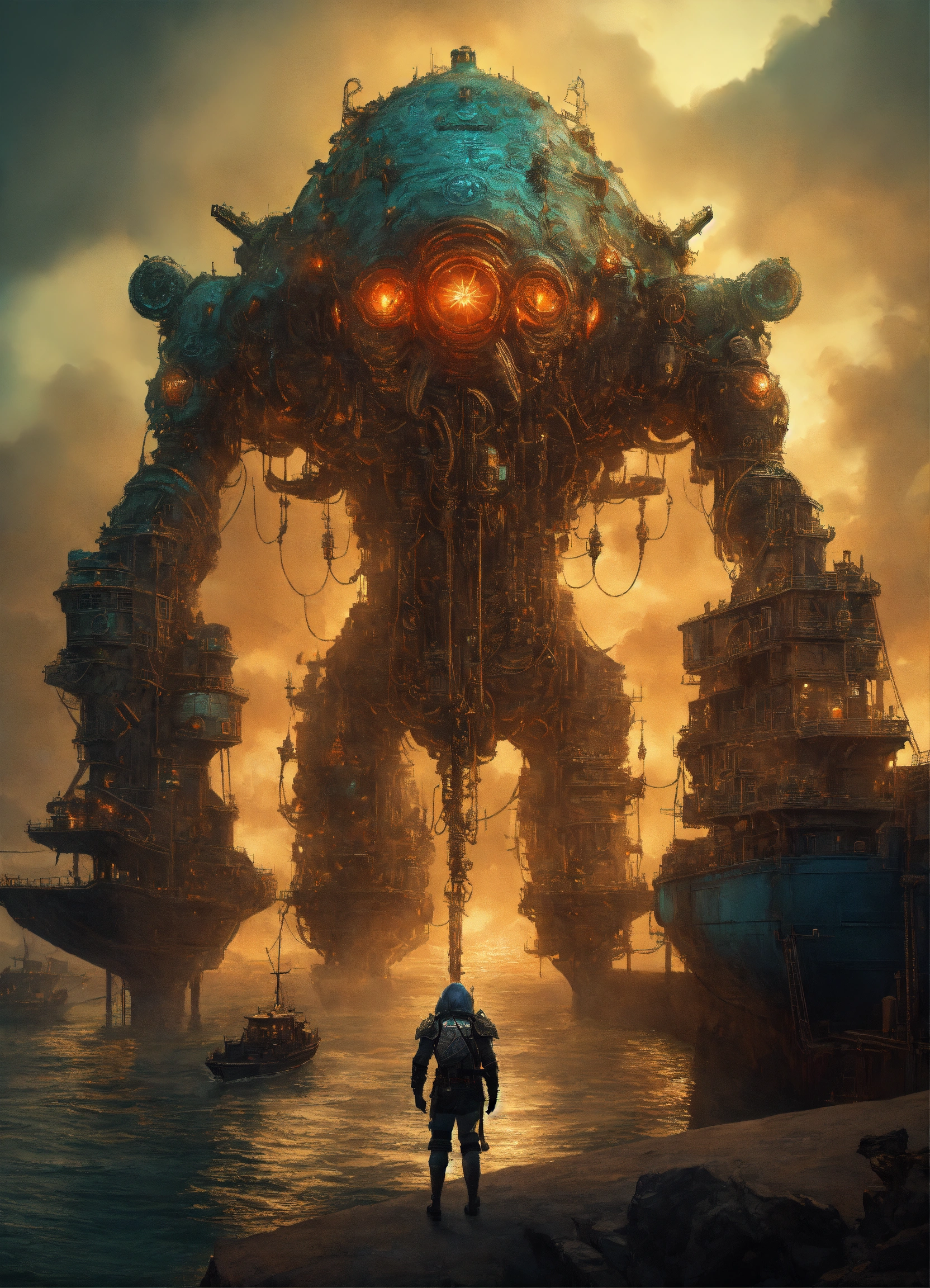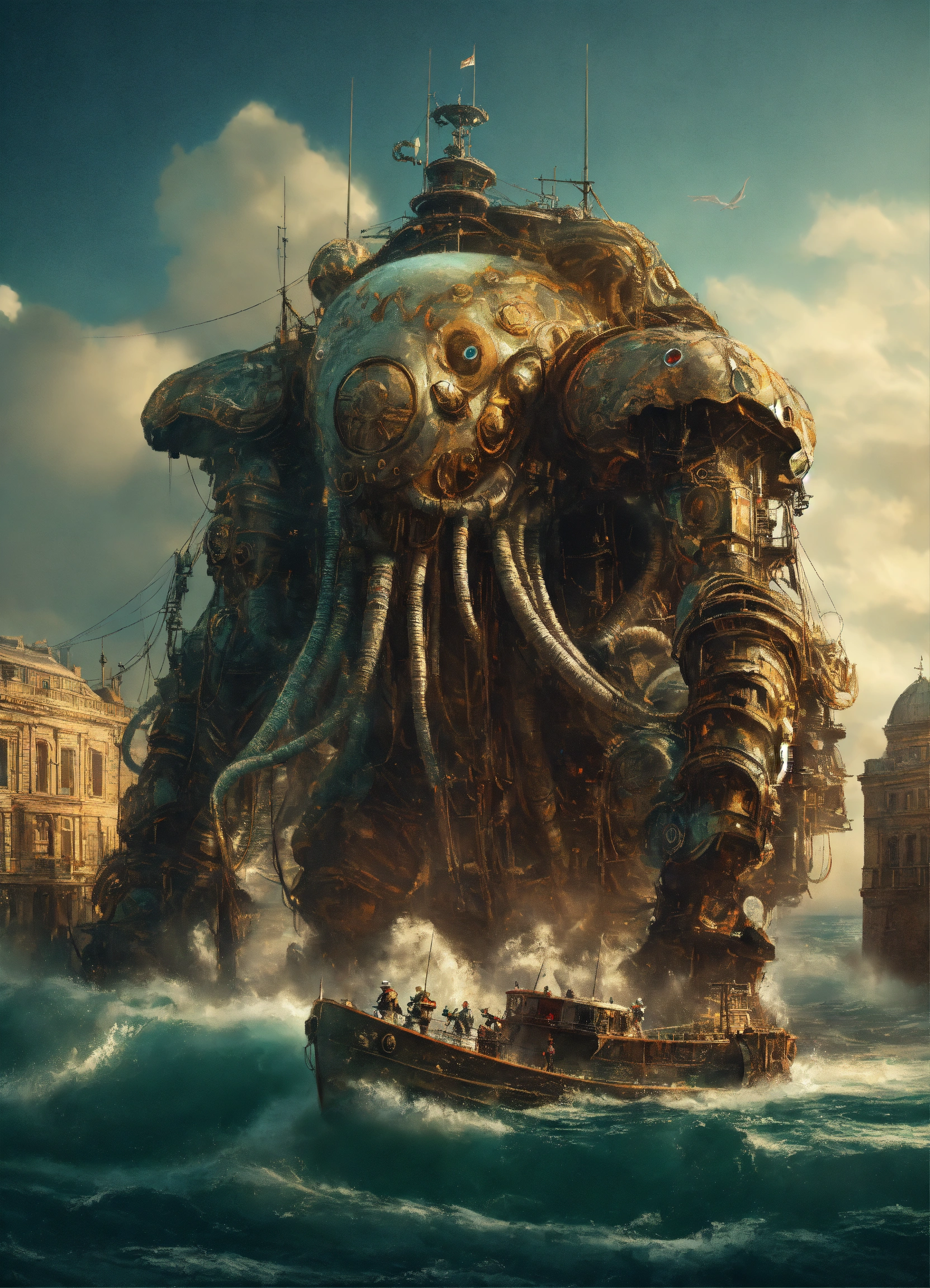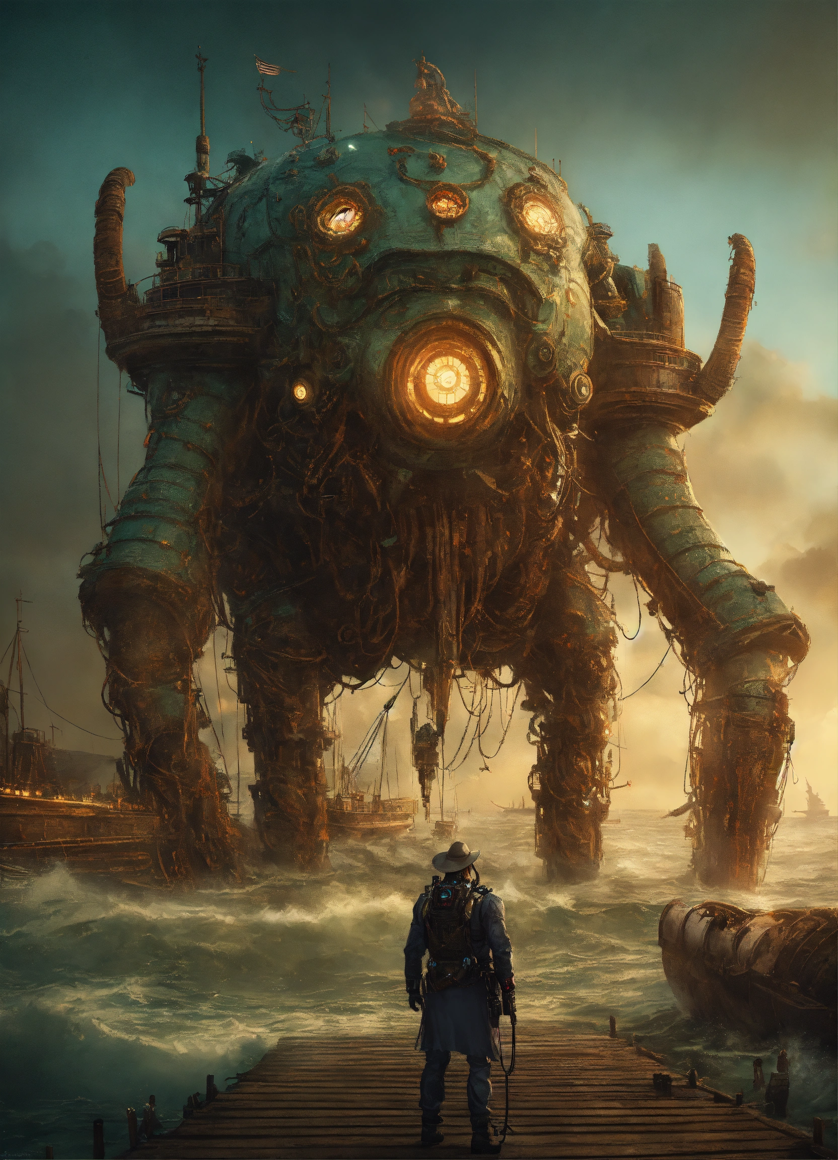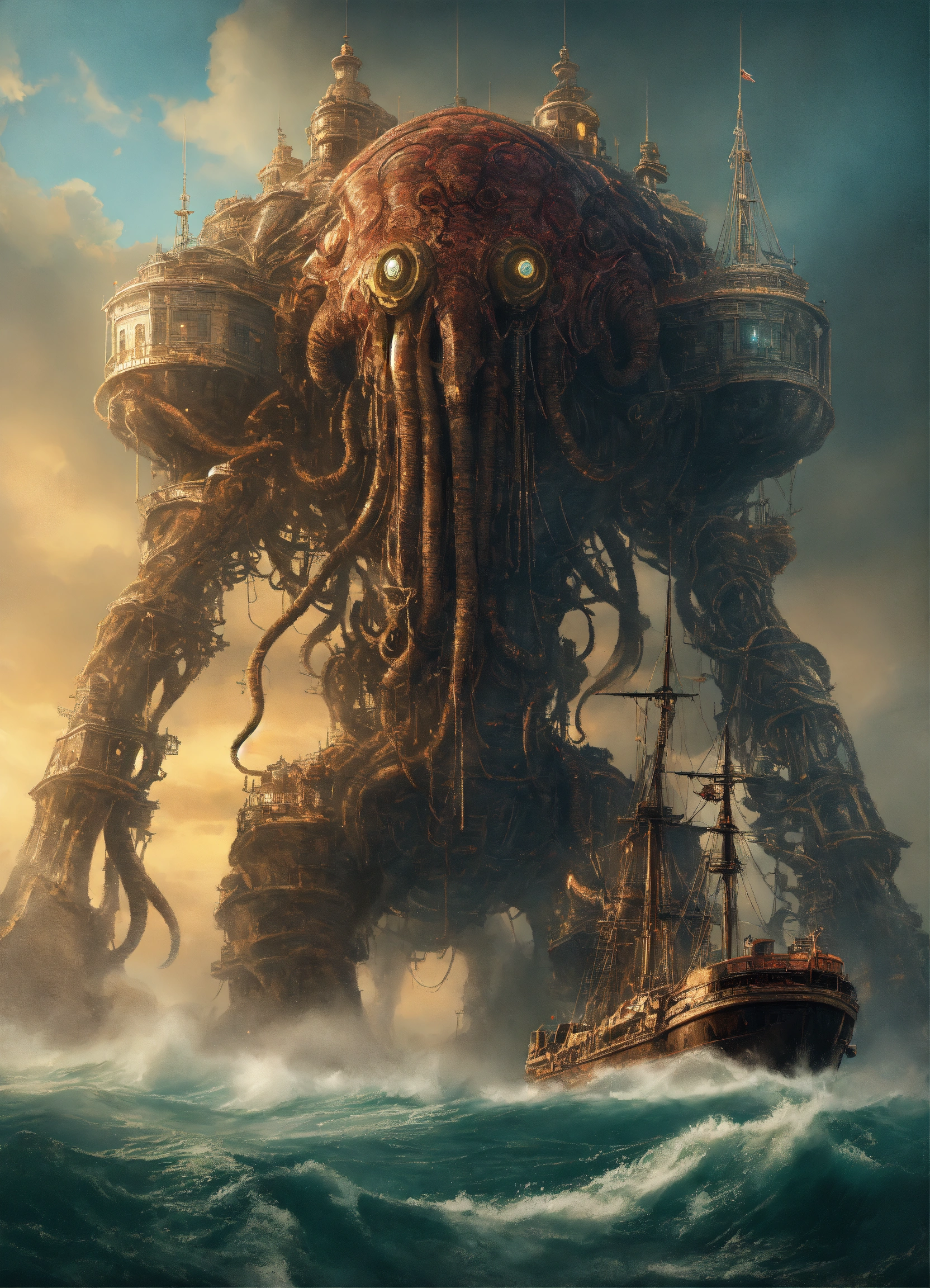 An artwork of an enormous cyborg creature, in the style of baroque maritime, lovecraftian, caras ionut, 2d game art, 8k resolution, caricature-like illustrations, eerily realistic by rbt. williams