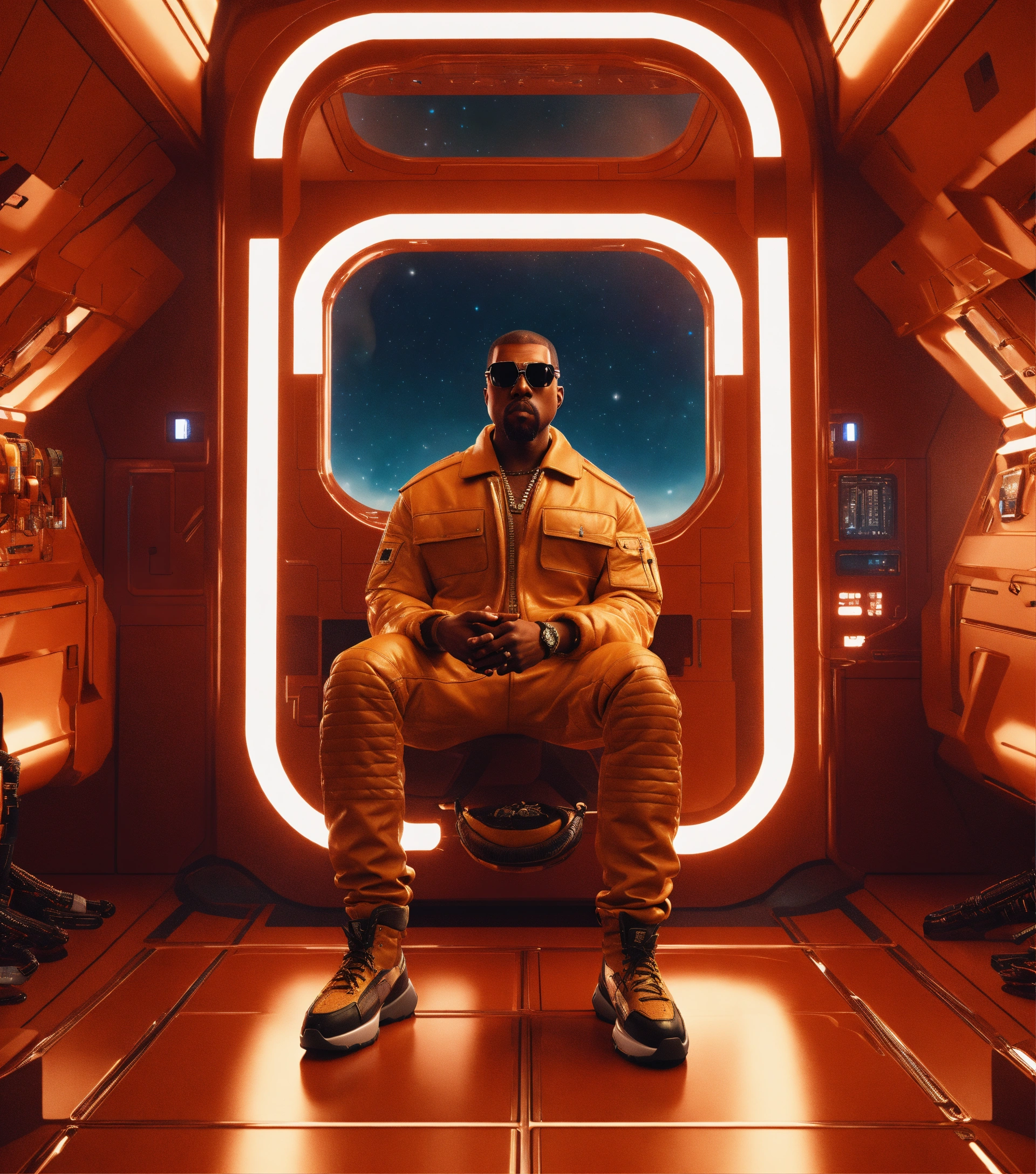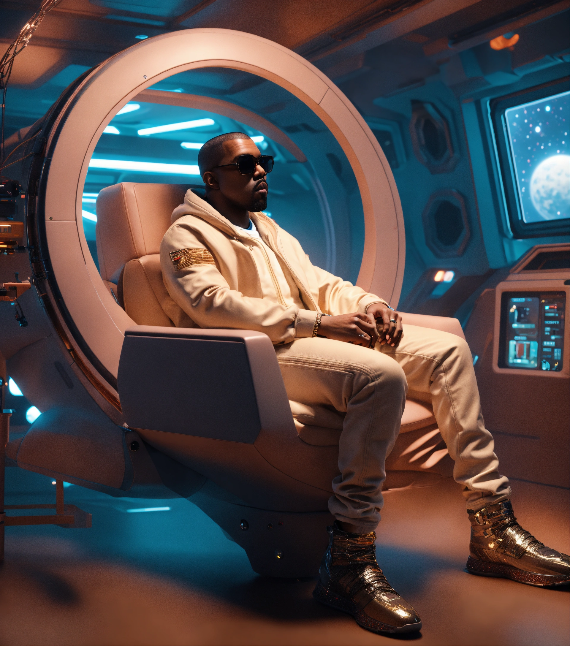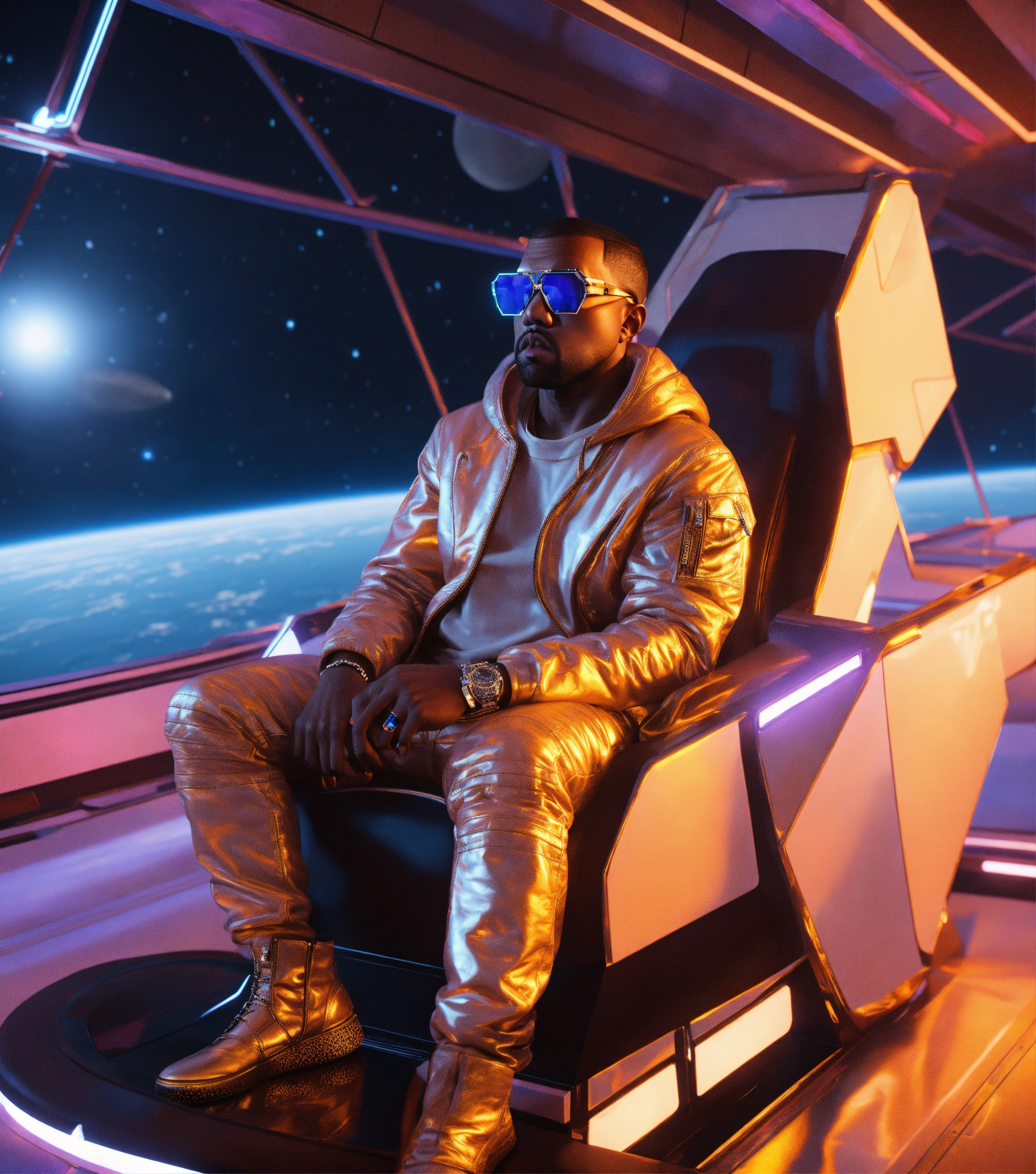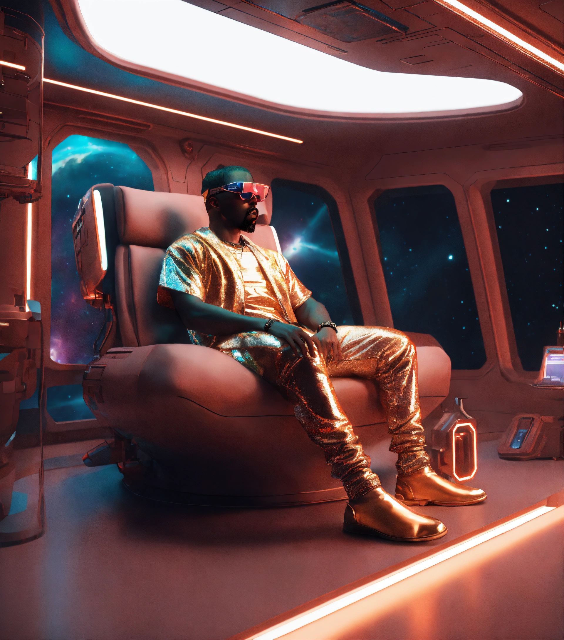 Zoom out full body of an exotic kanye west rockstar lounging on a hi tech space yacht, realistic, futuristic, sci-fi, 8k, unreal engine
