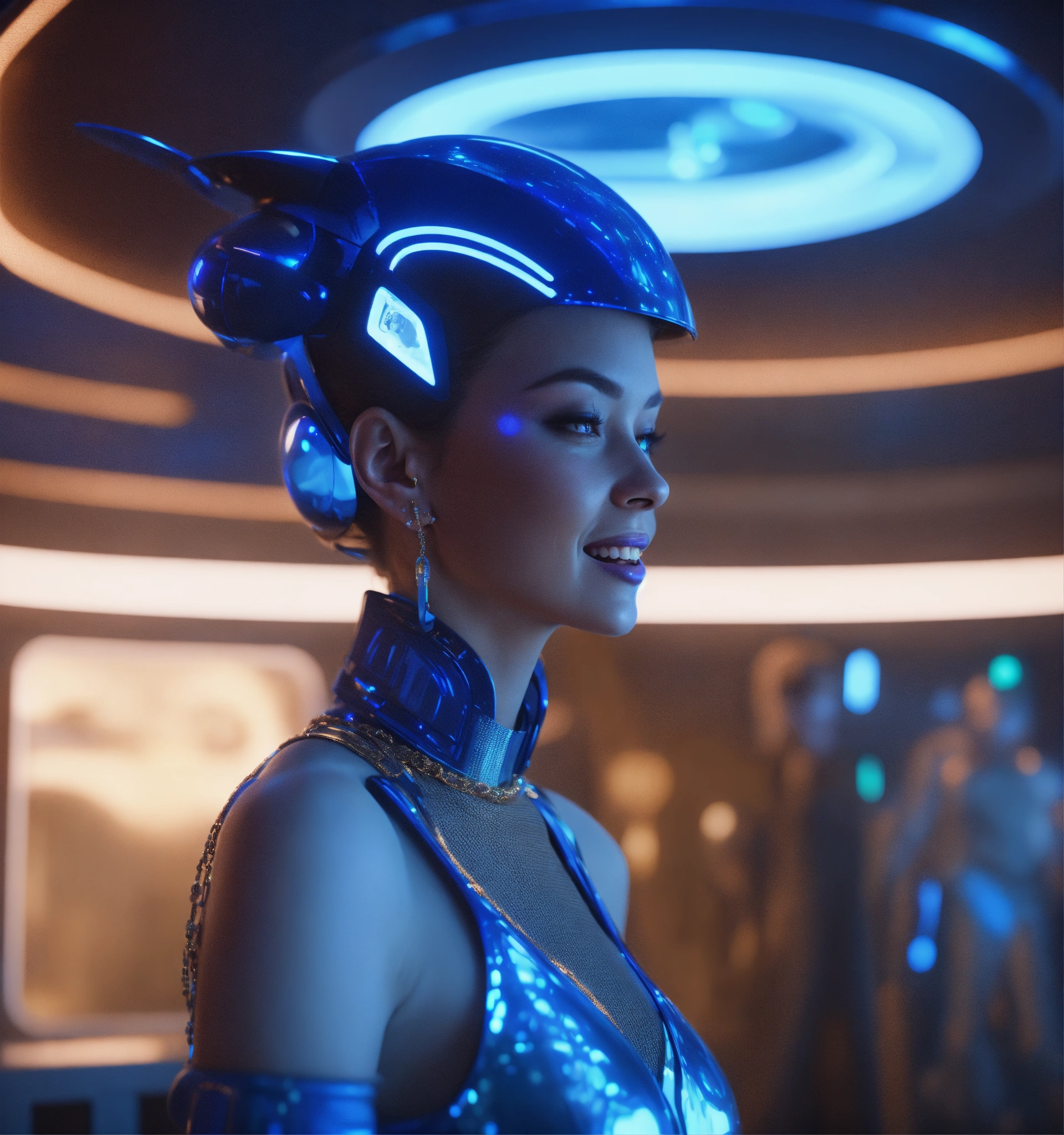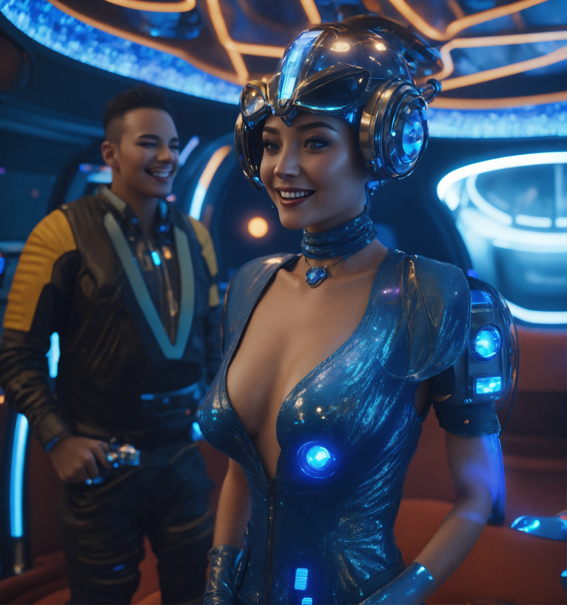 Zoom out from an alluring young blue skin alien space babe wearing a fancy 38dd space clothes and expensive jewelry in a futuristic space hotel lounge laughing with a man, realistic, futuristic, sci-fi, 8k, unreal engine