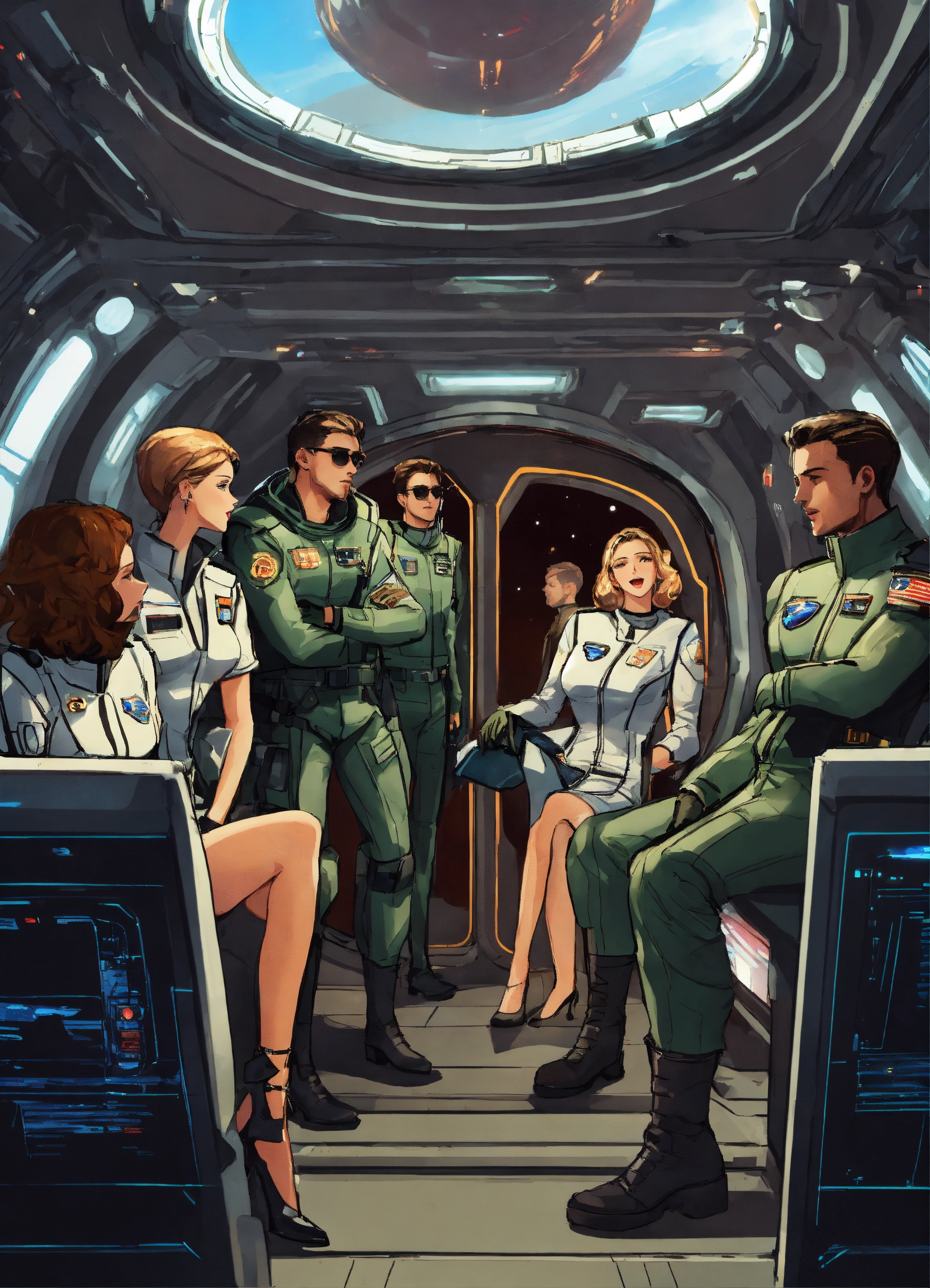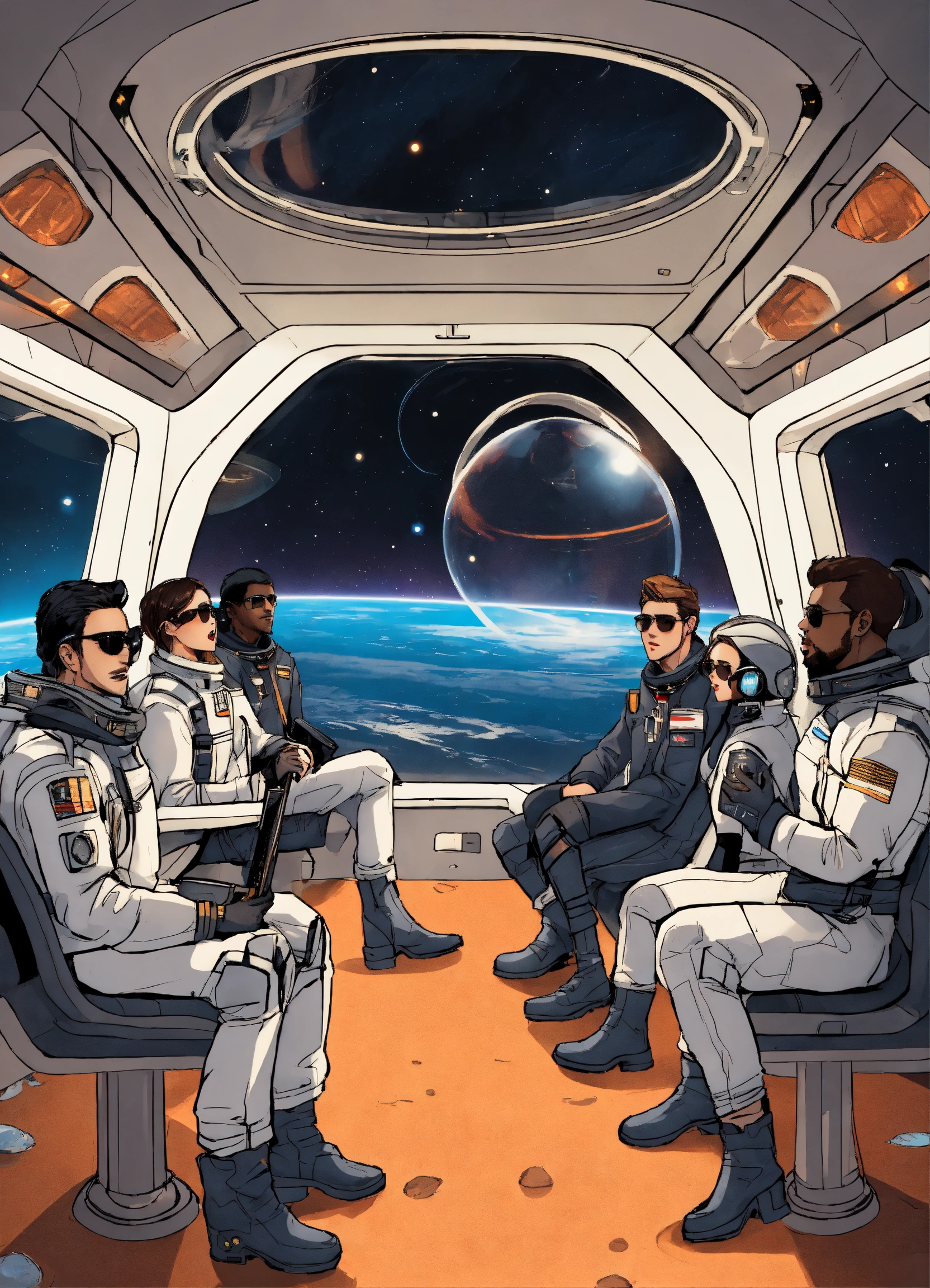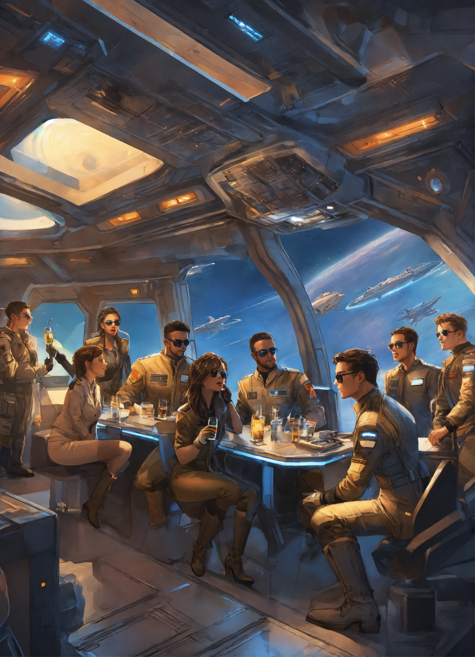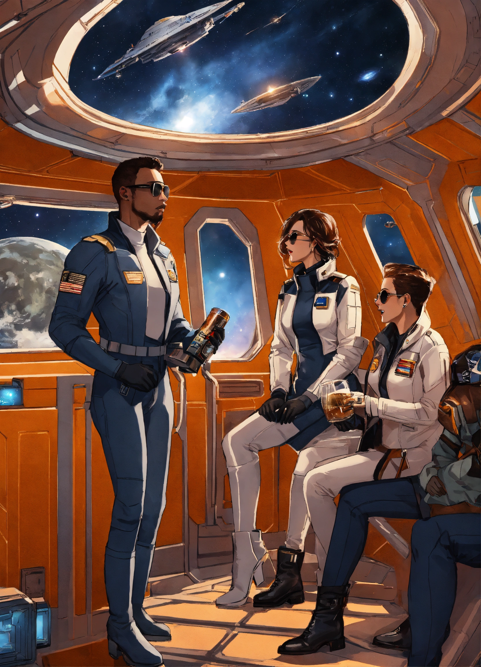 Men and women passengers on a space ship with a window into space, ship officers in uniform, blazers, cargo jackets, greys, blacks, whites, metallics, cutouts, gloves, high boots, utility layers, bodysuits, sunglasses, futuristic, background of a spaceship, drinking and partying