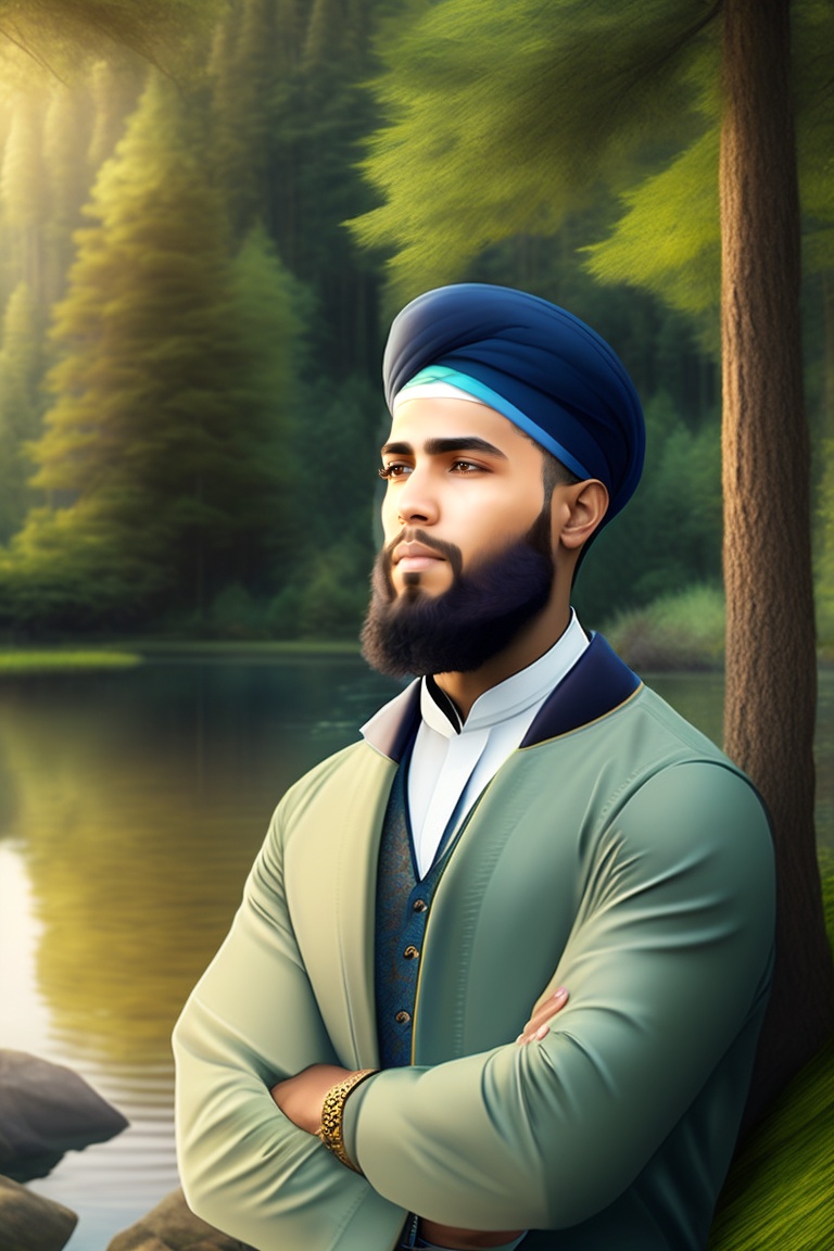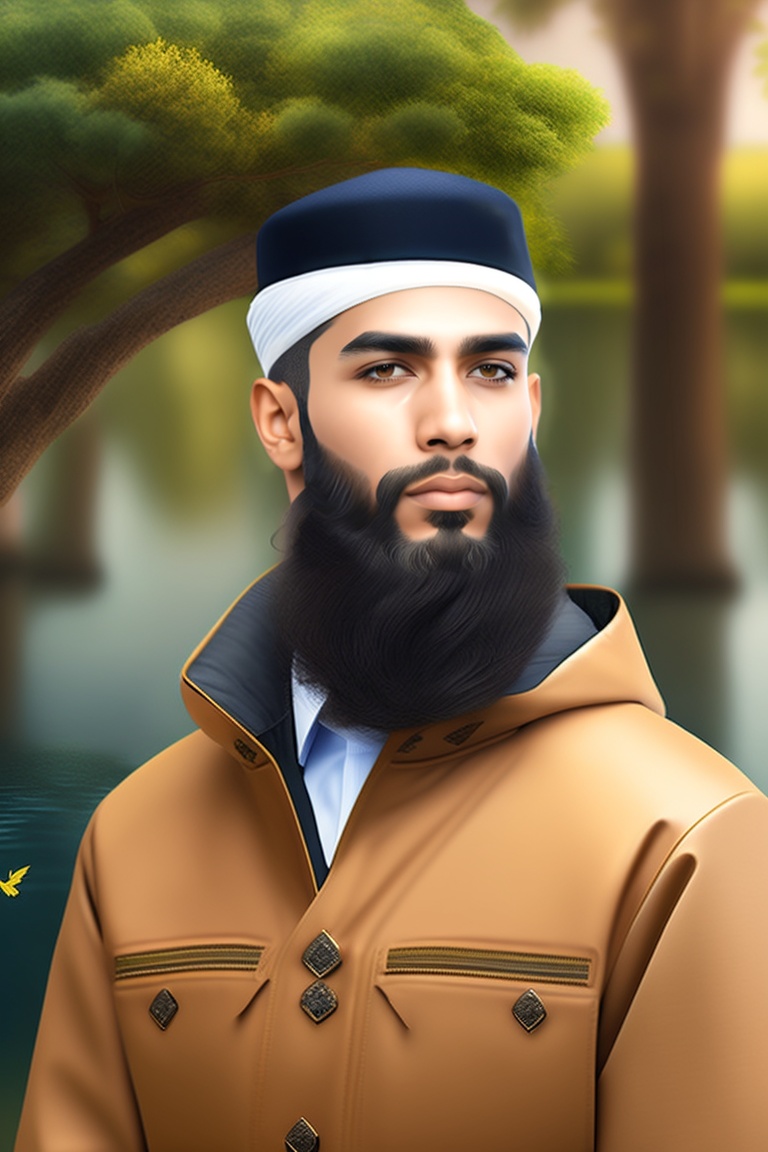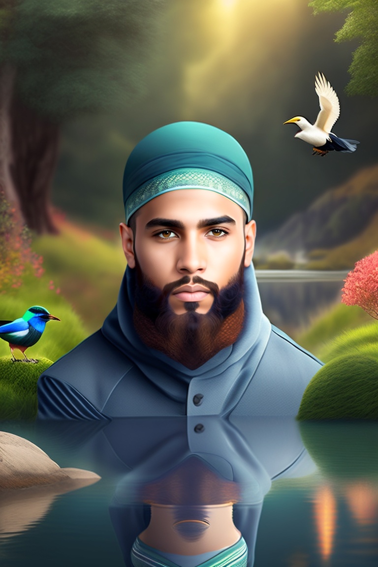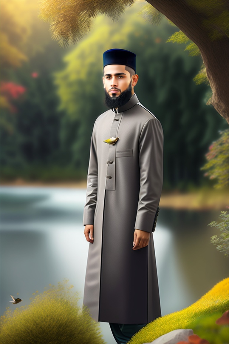 Muslim beautiful handsome islamic boy, with beard face on front, beautiful cloth, many trees birds, river