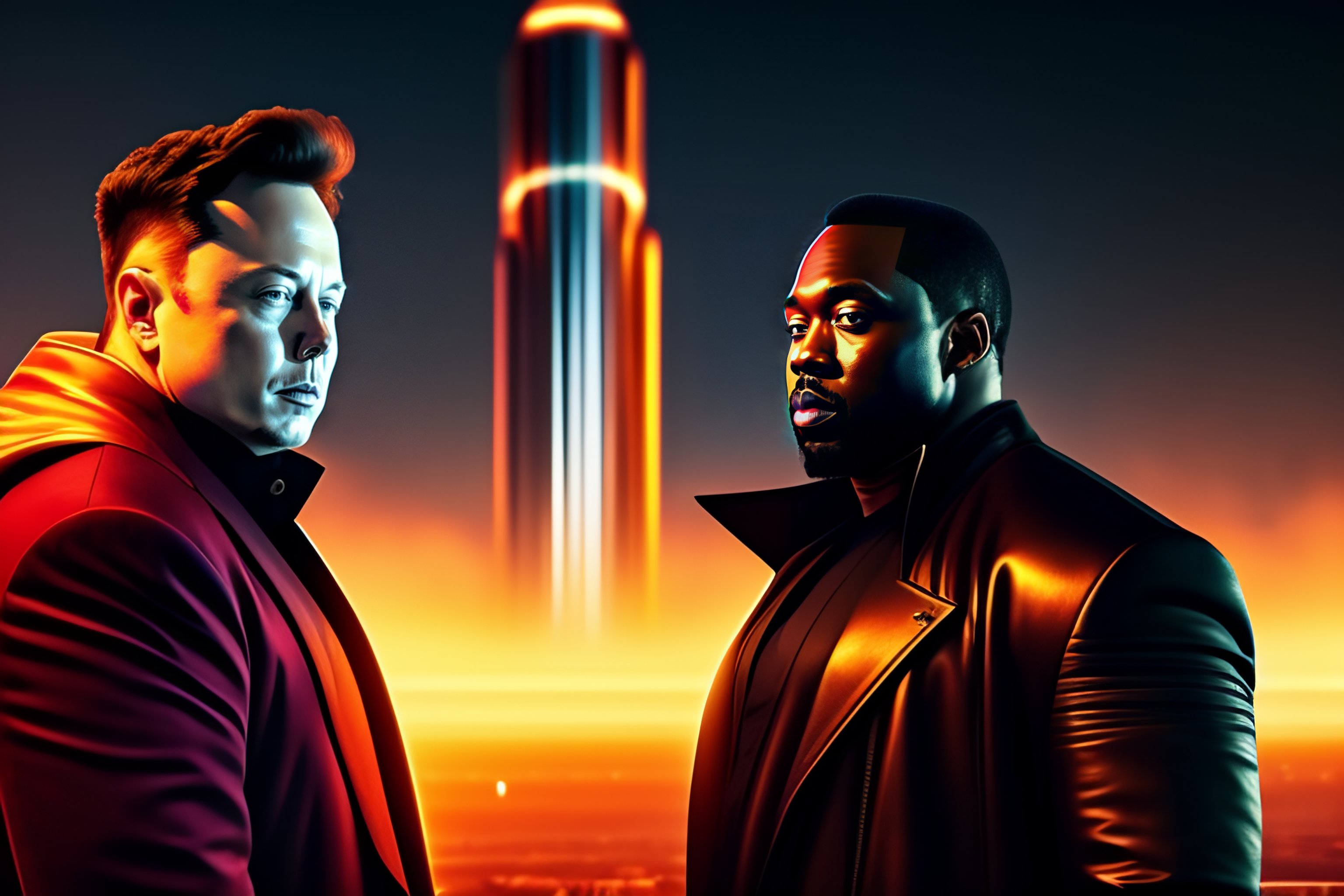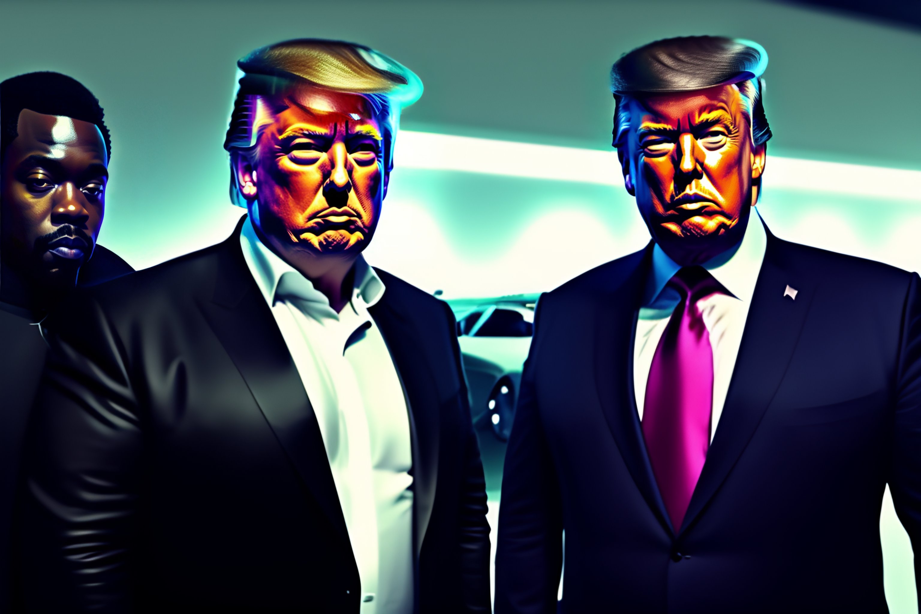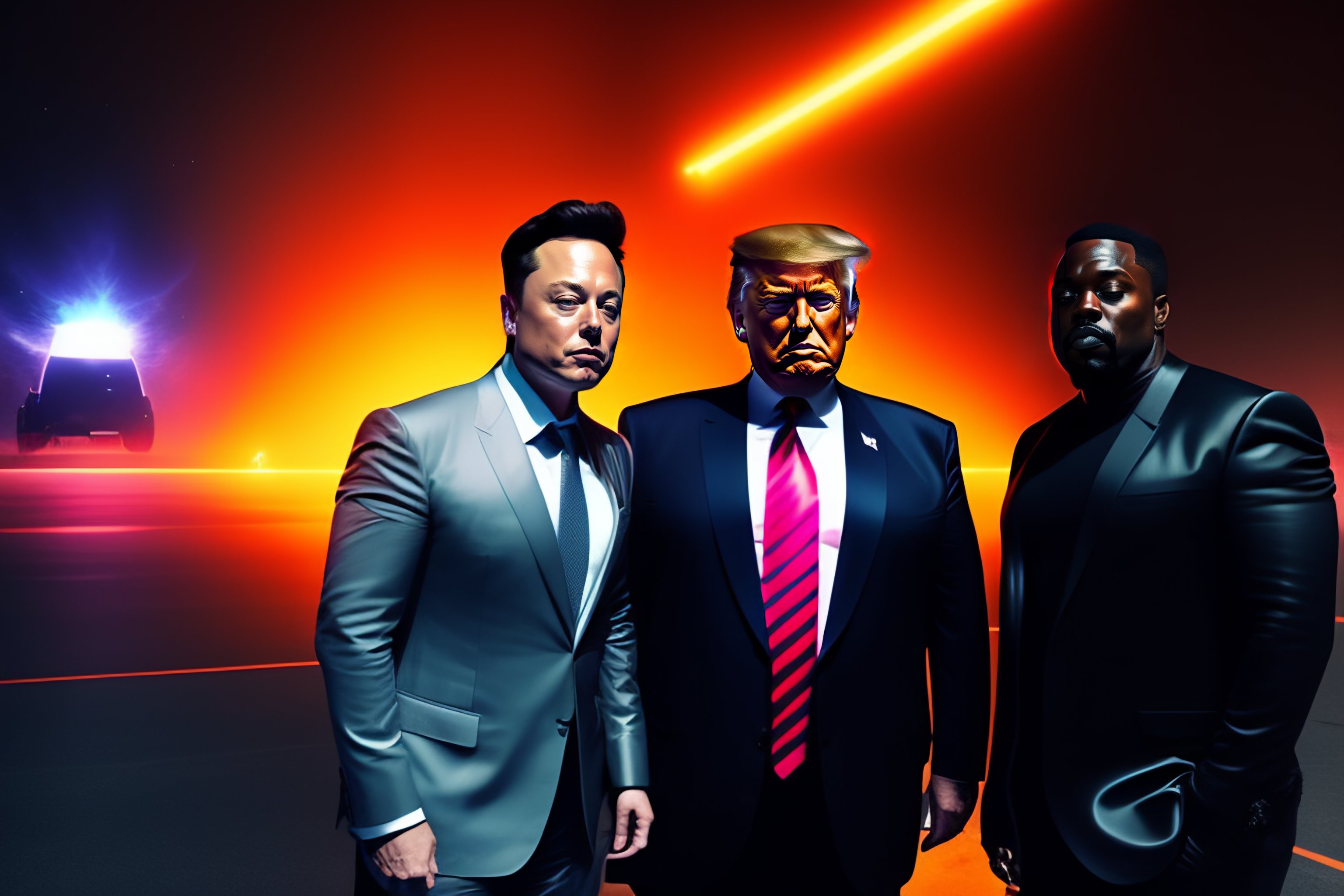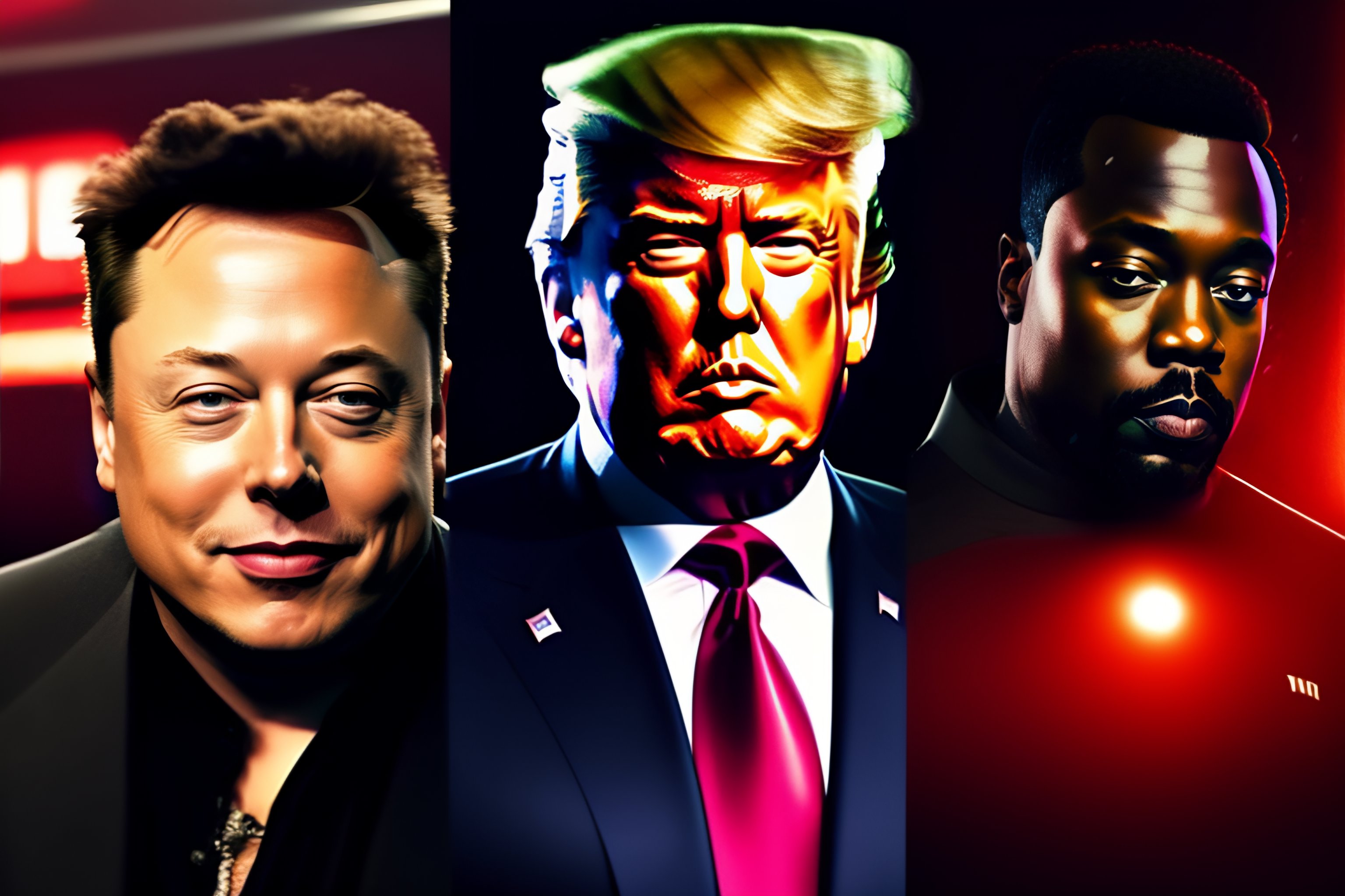 Elon musk with donald trump and kayne west, all on one photo, cyberpunk background, cinematic lightning