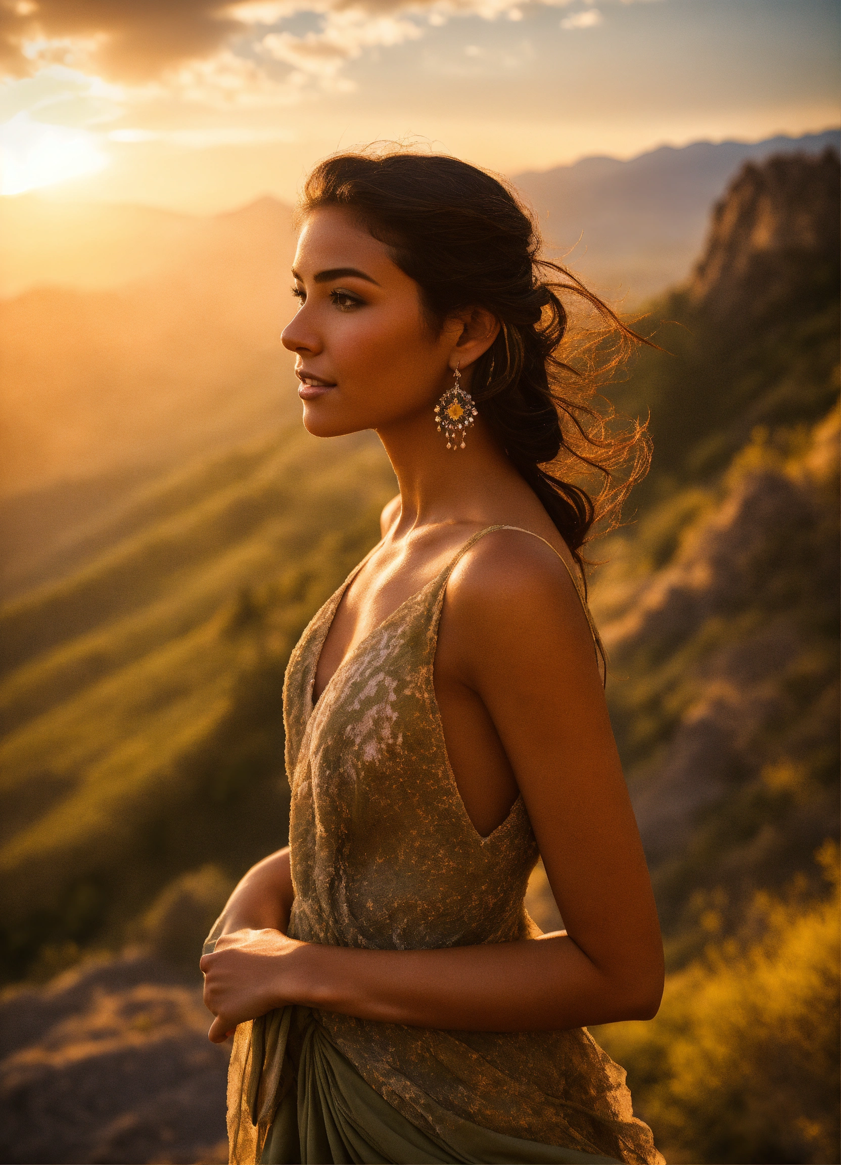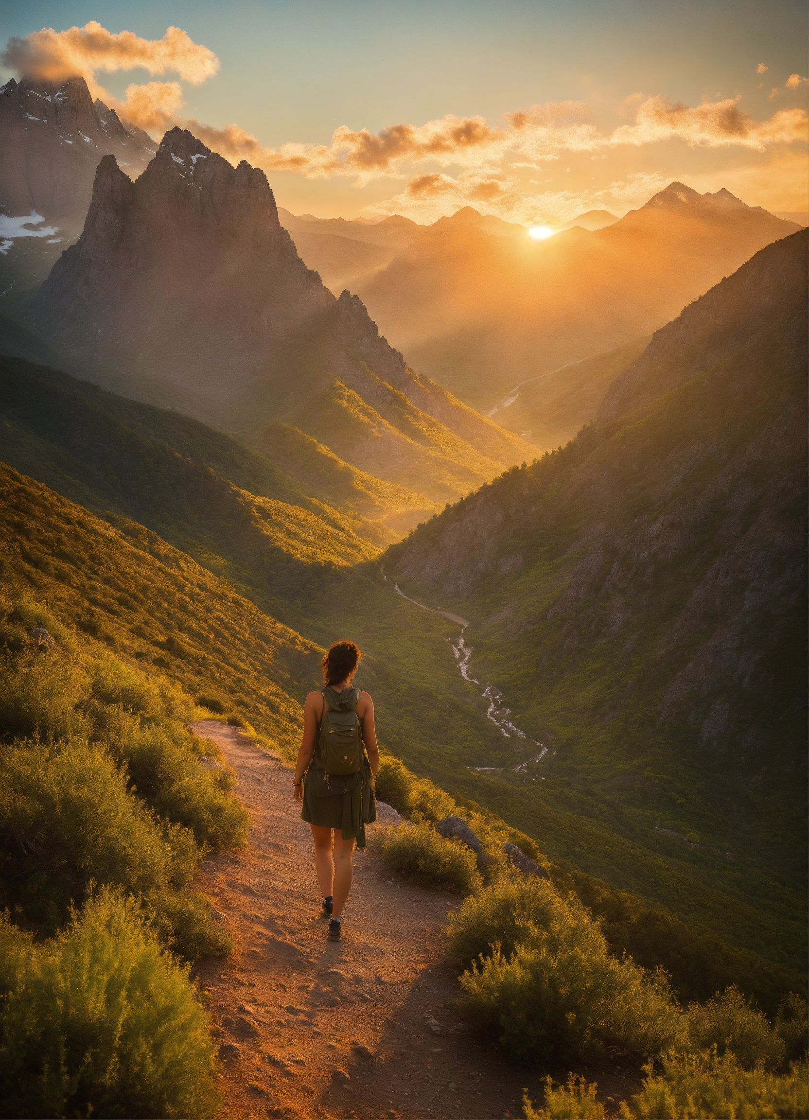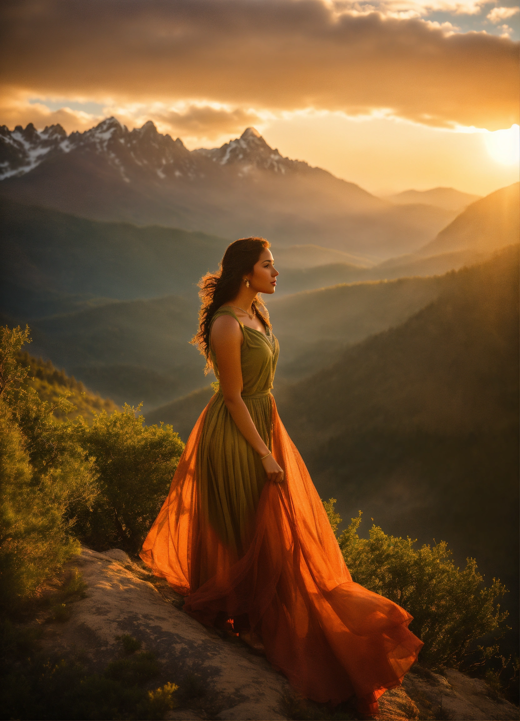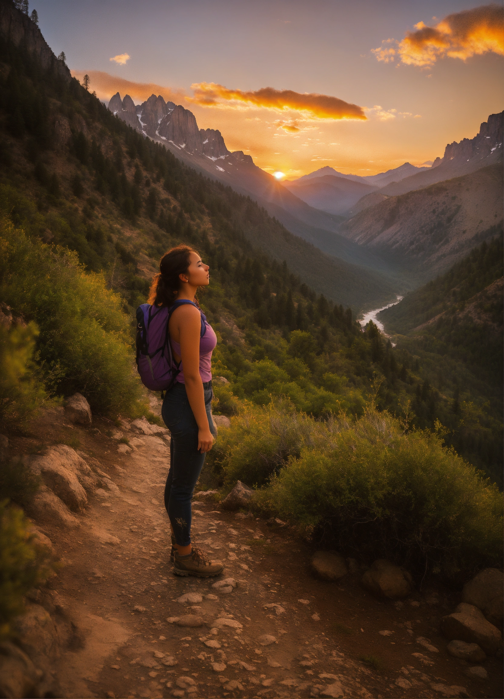 A beautiful young woman with olive-toned skin stands confidently on a rugged trail, surrounded by the breathtaking beauty. the sunset gently kisses her skin, enhancing her radiance as she takes in the magnificent vista that stretches out before her. towering peaks rise majestically in the distance, their tips adorned with a dusting, contrasting with the lush and vibrant cascade down the slopes.