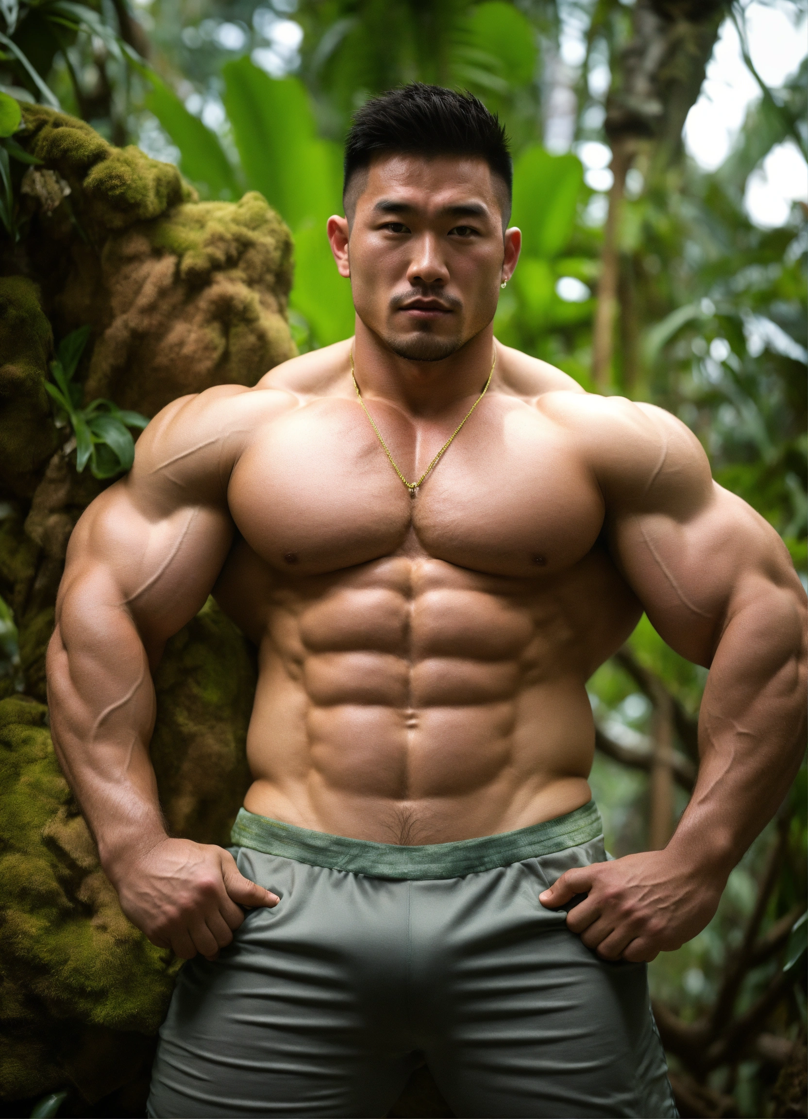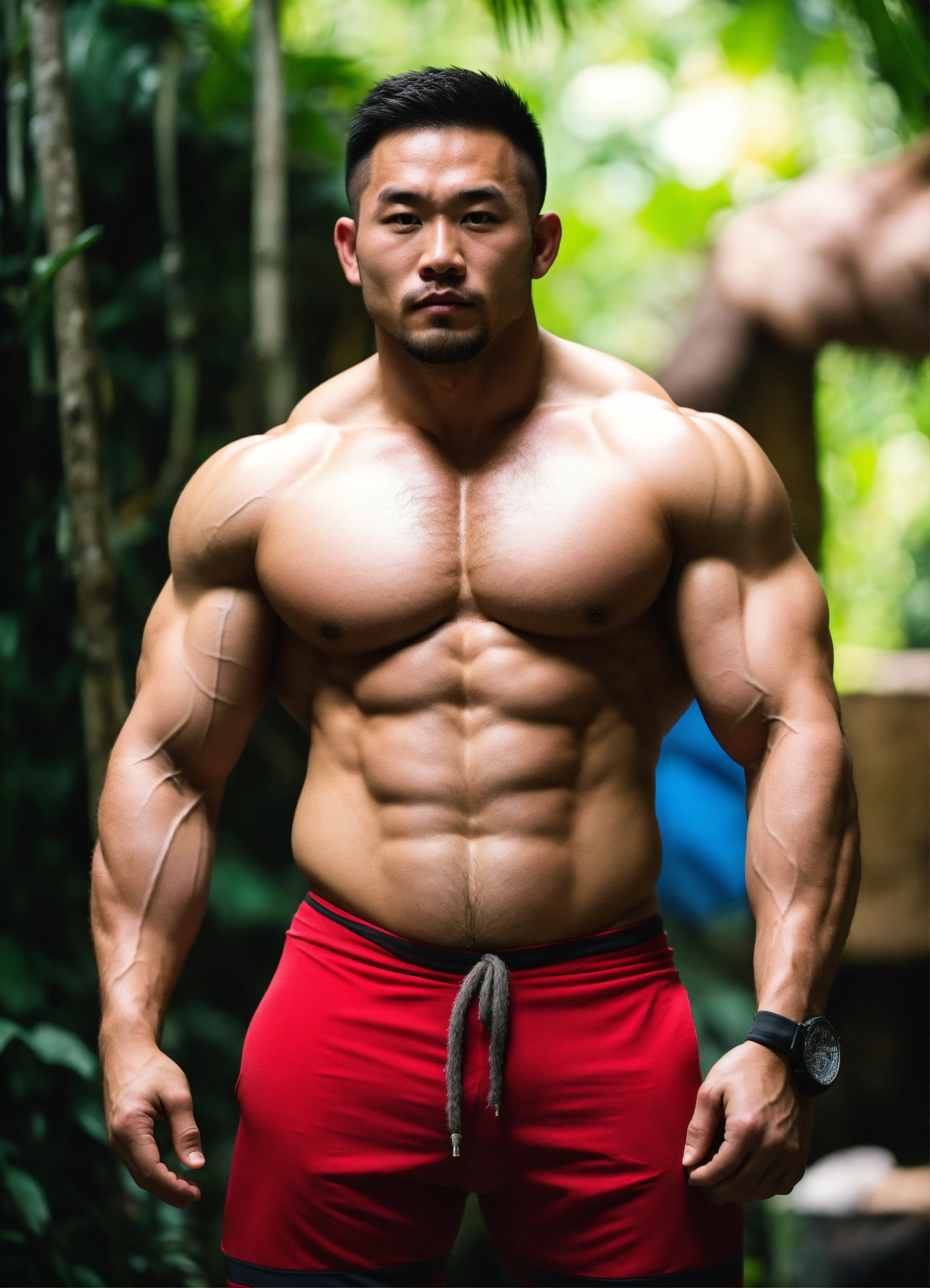 30-year-old man with big muscles, big bodybuilder, chinese, hairy torso, hairy arms, hairy legs, body like a wrestler, in a jungle