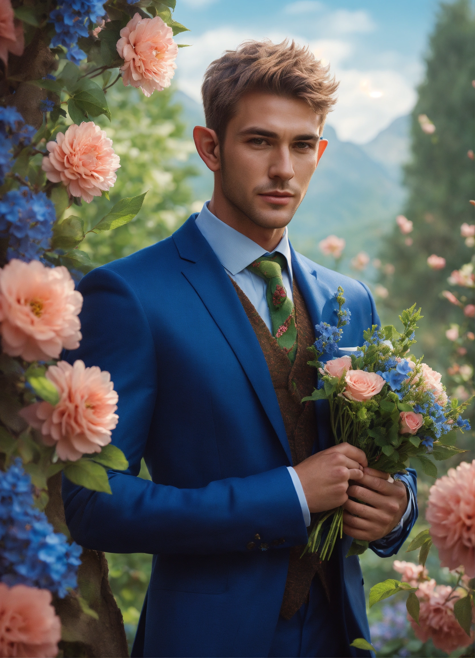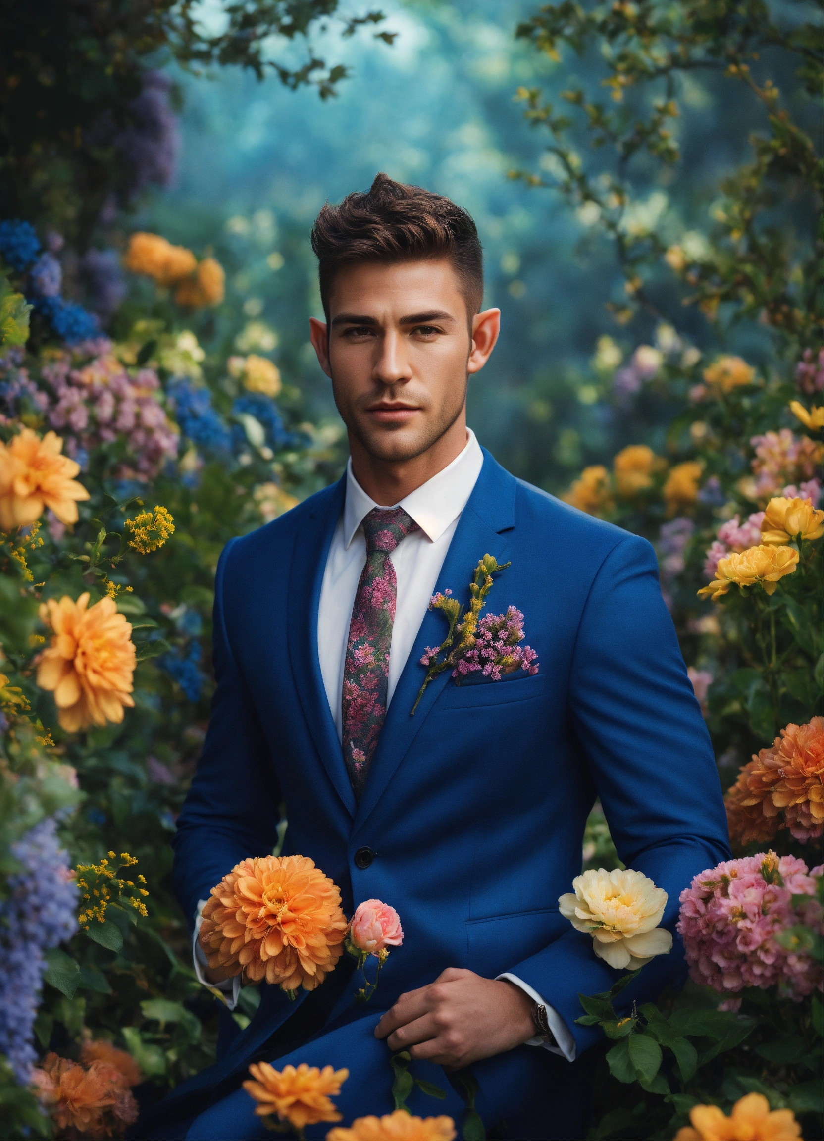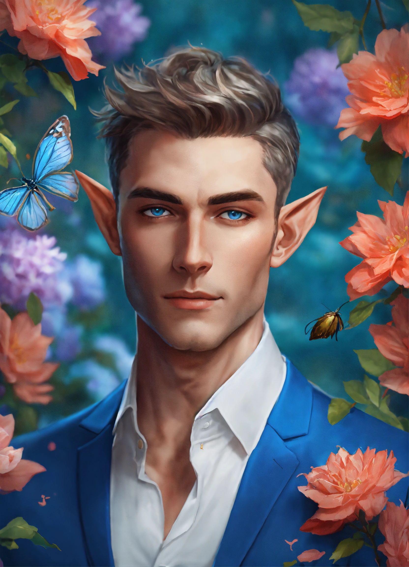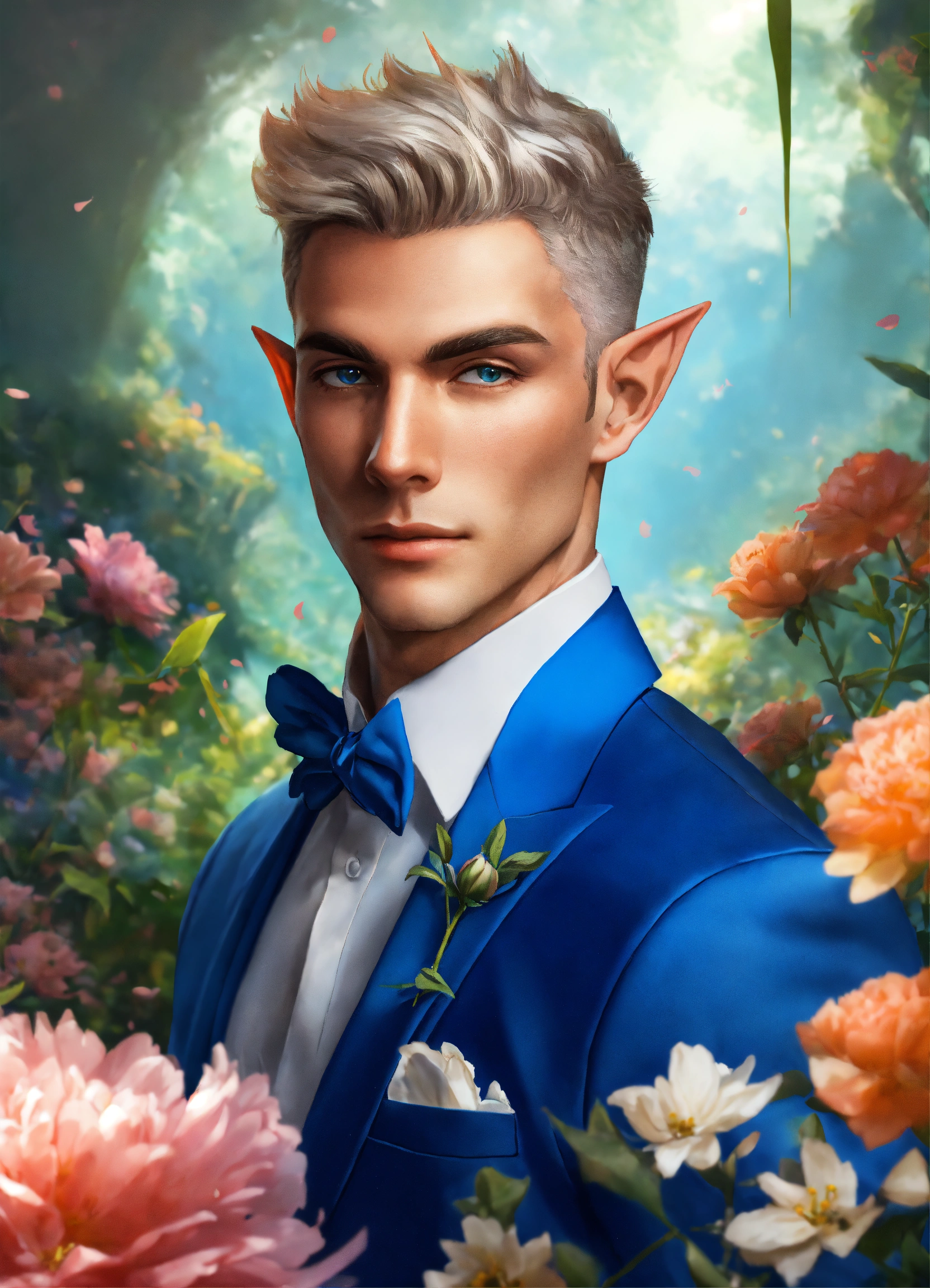 A strong handsome elf man with pointy ears with short hair dressed in a blue suit with beautiful flowers and nature around him