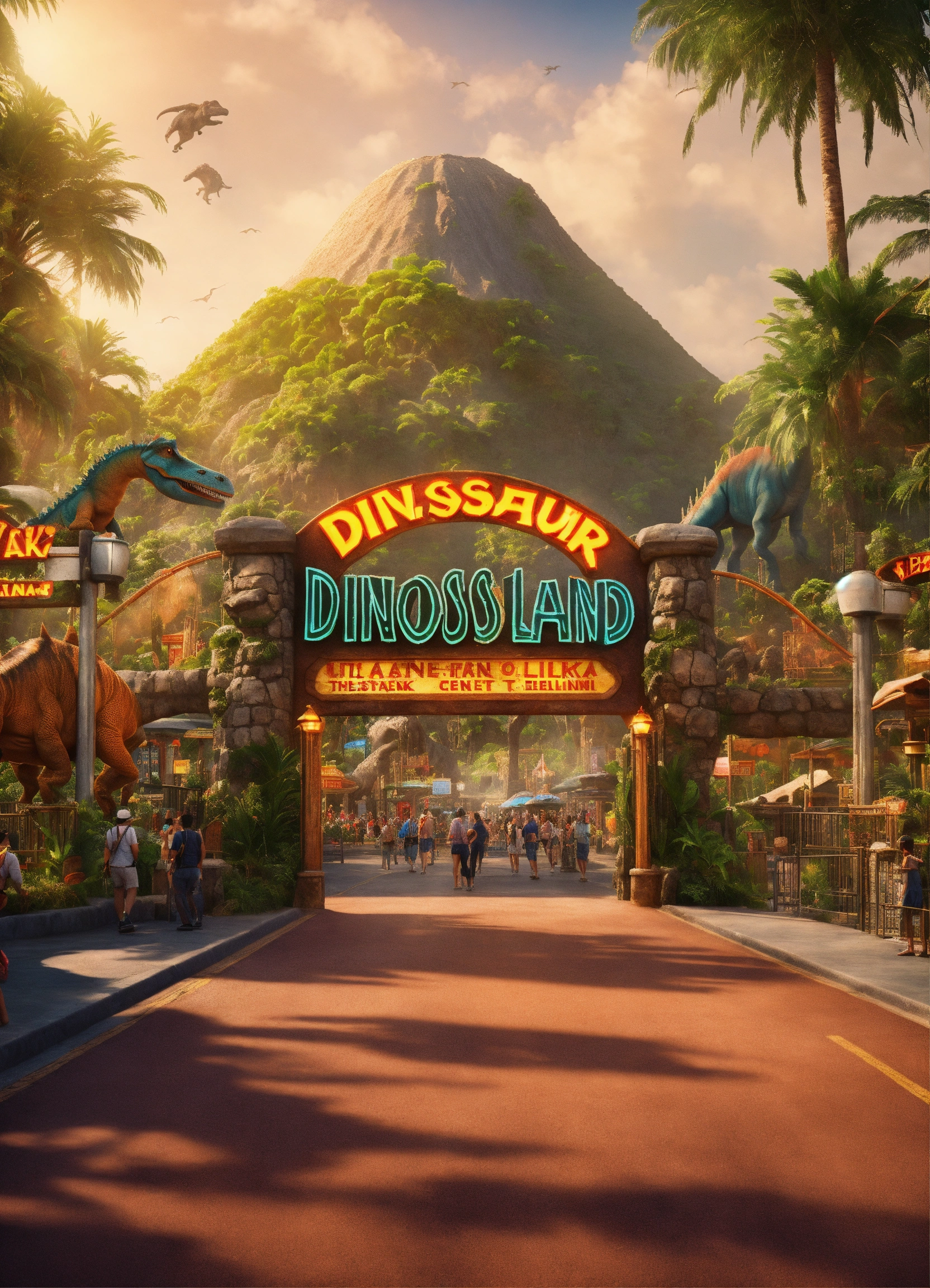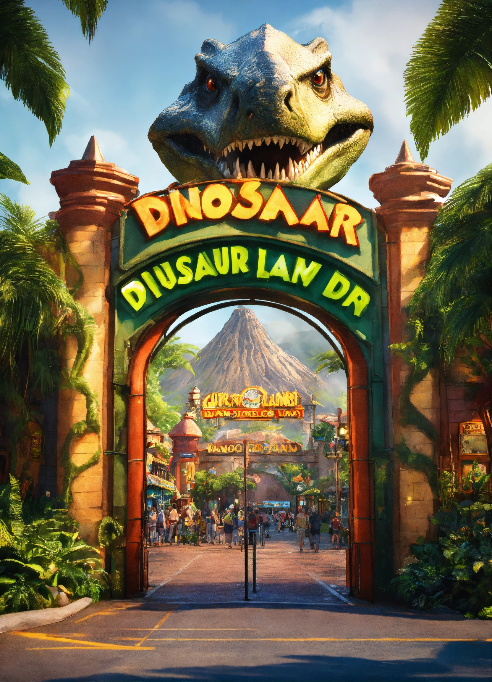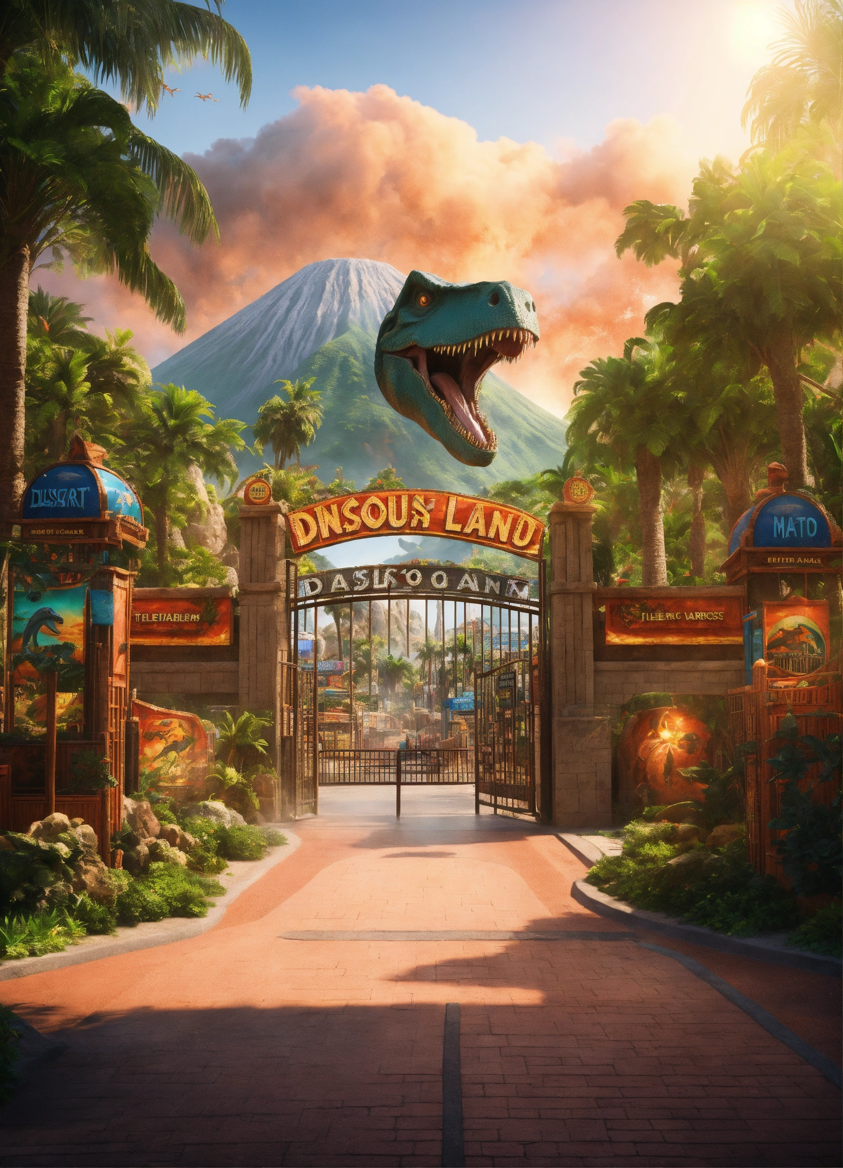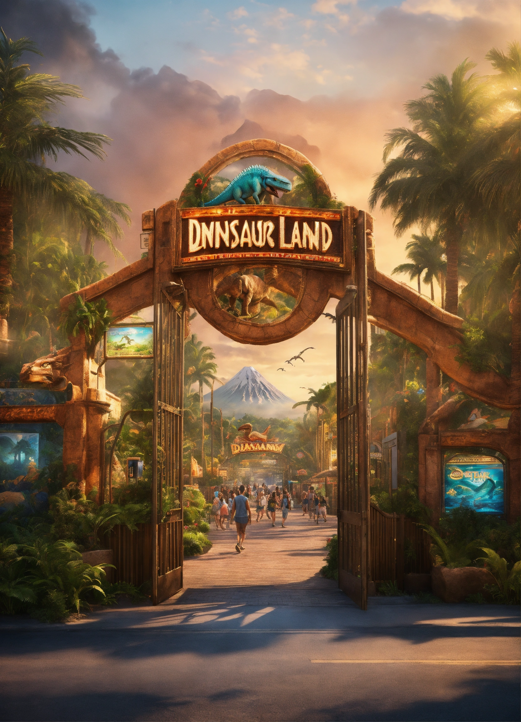 Scifi style view of dinosaur land theme park main street. jurassic park style. a huge gate with the letters "dinosaur land" on it. ultra realistic. 8k. photo portrait of the main street, on a tropical island, themed buildings in a main street full of people, with a volcano and an artificial lagoon. zoo enclosures and electrified fences. 8k. ultra realistic.