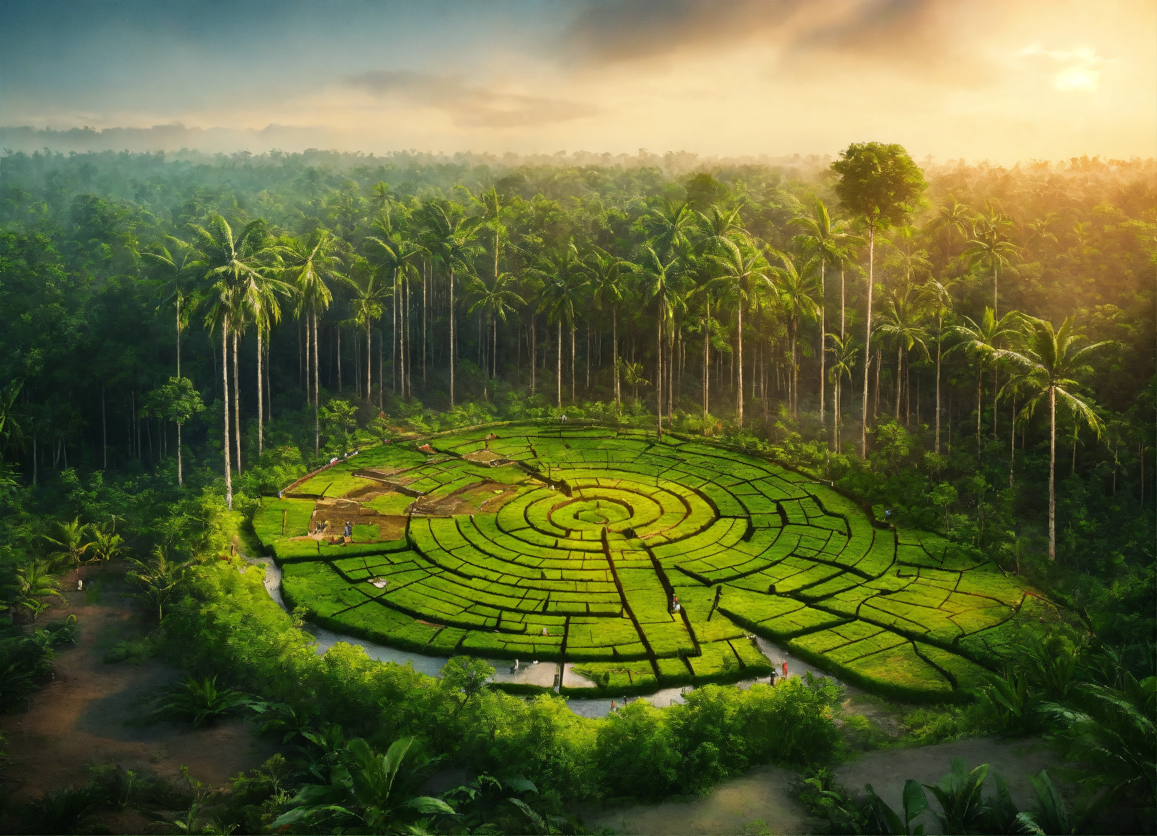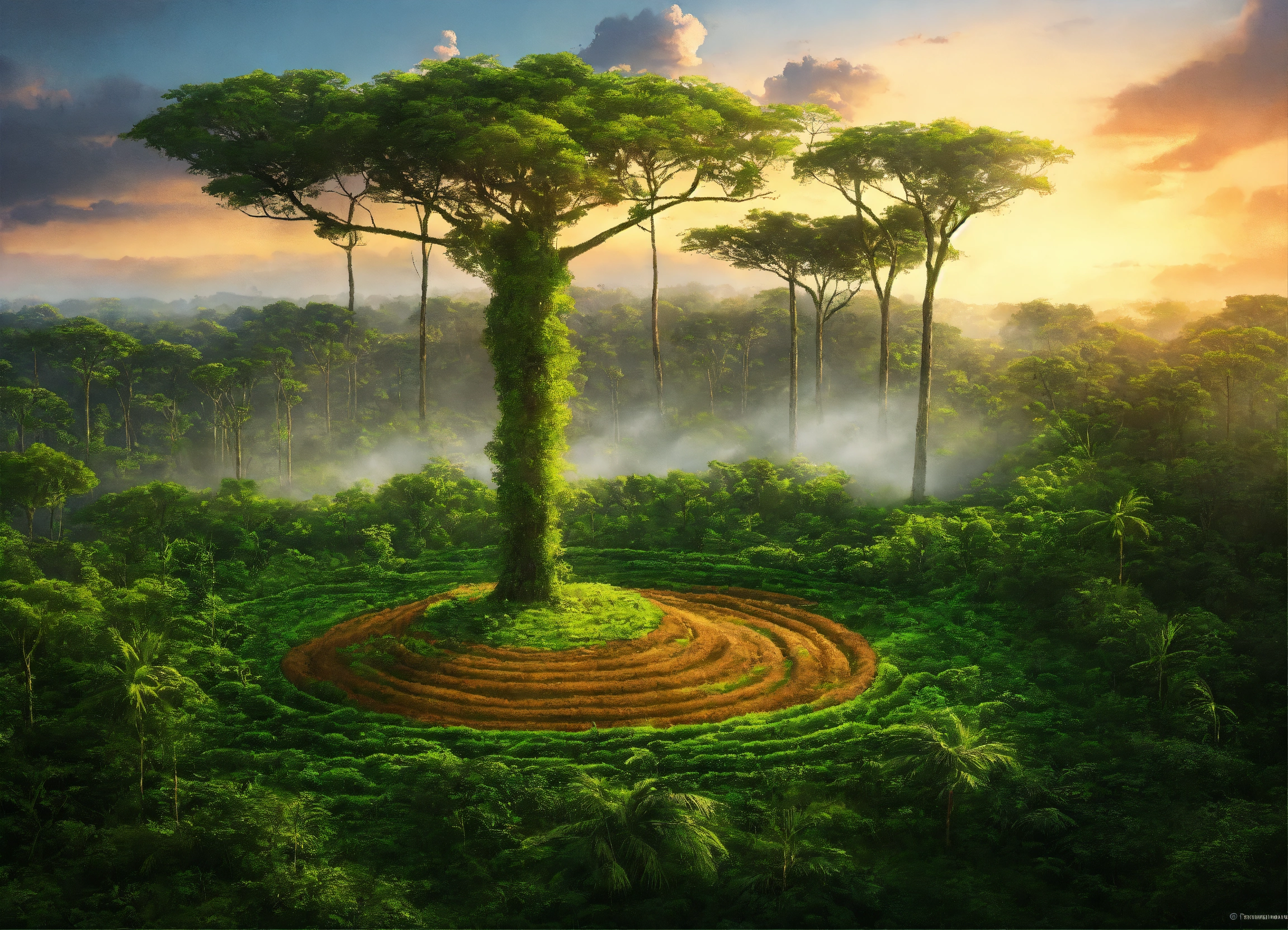 Déforestation, forêt amazonienne, la plupart des grands arbres coupés, jeunes arbres plantés par une association, on les voit les planter, style fantastique, pas réaliste
