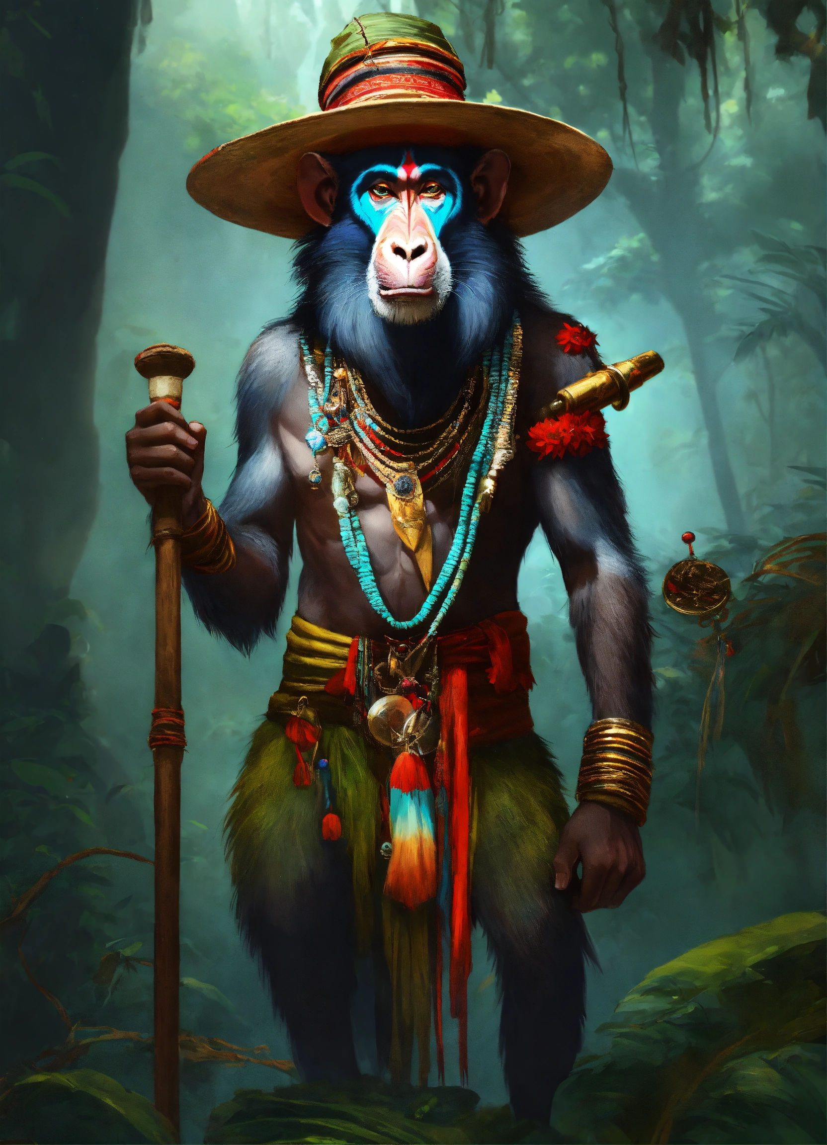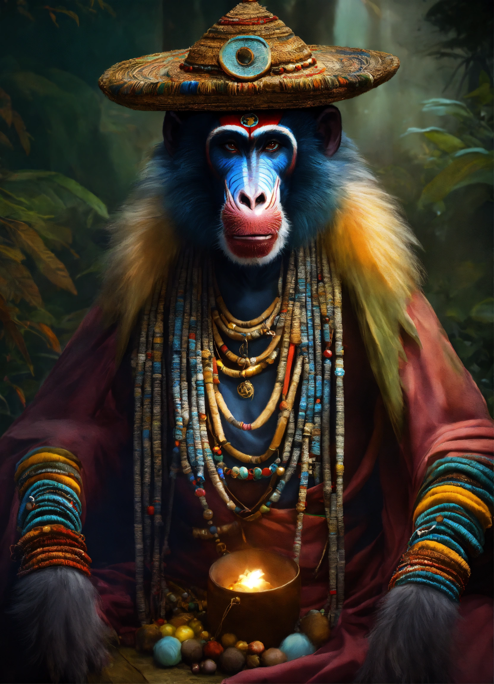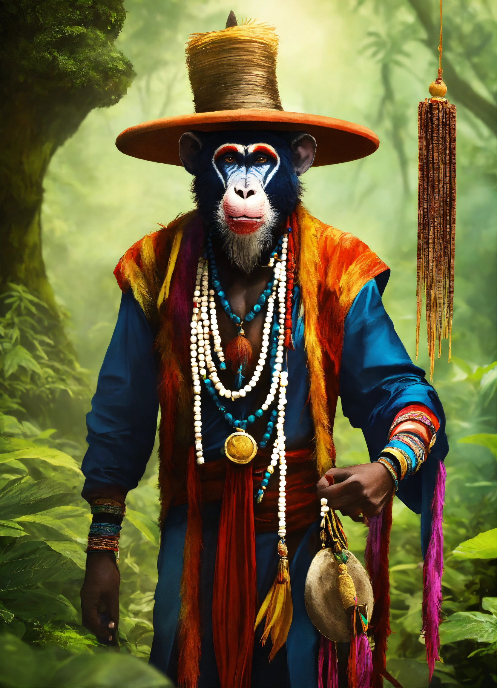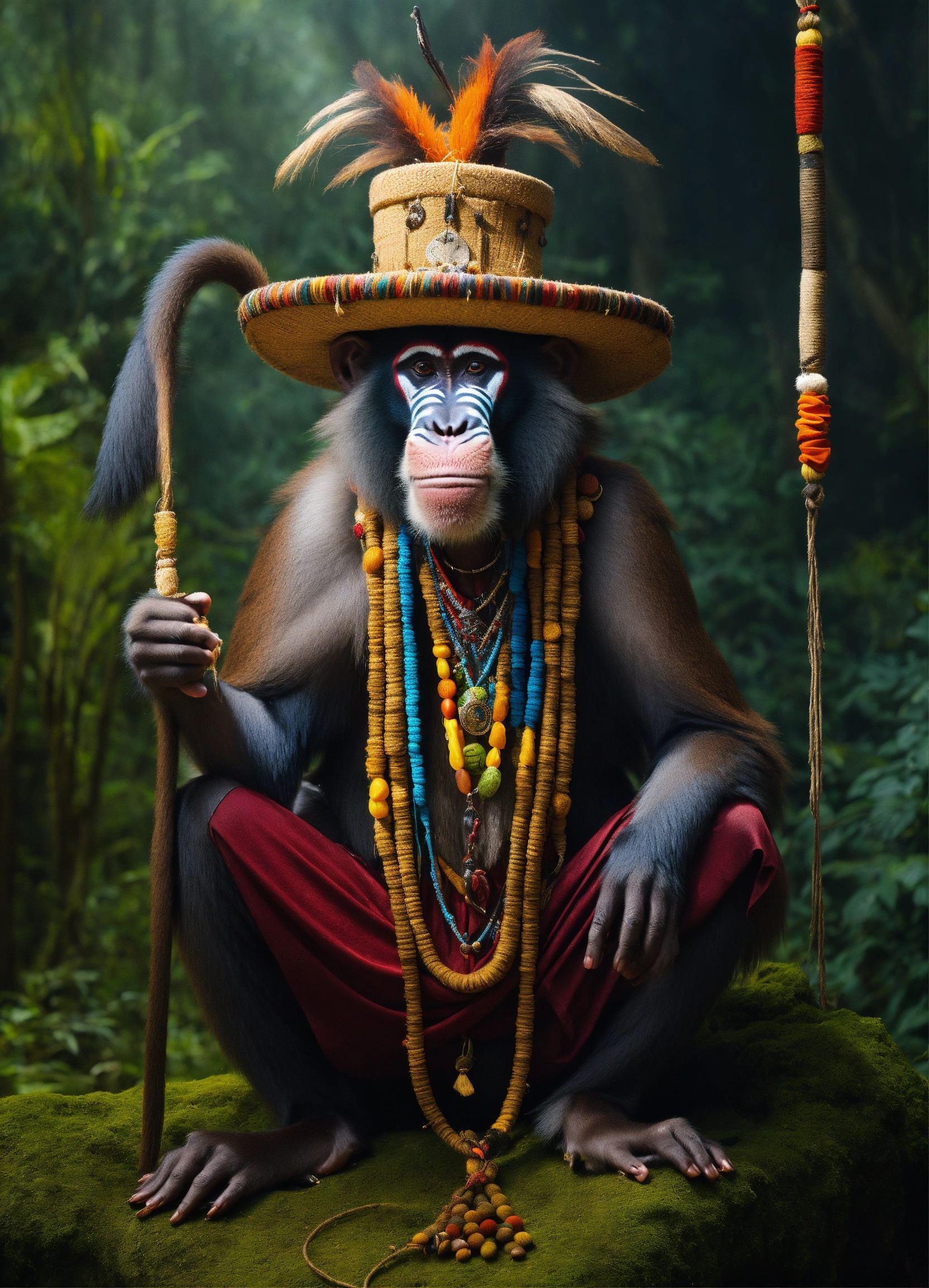 A male mandrill witch doctor, monkey, shaman hat, animal, weawing a silky ethereal thread, ancient forest