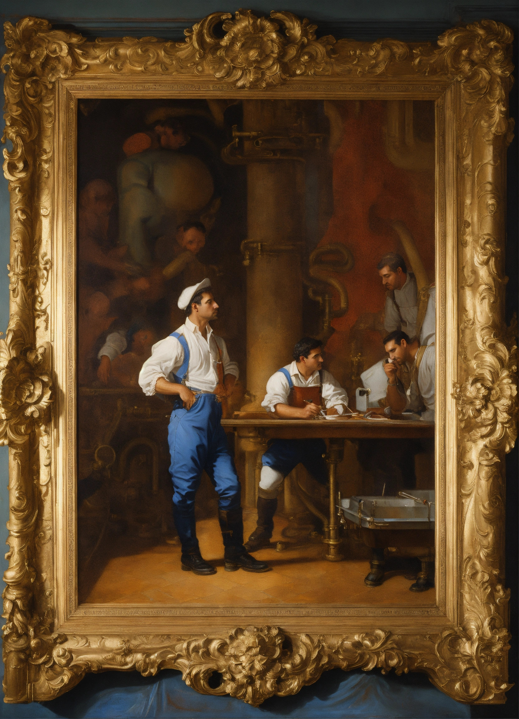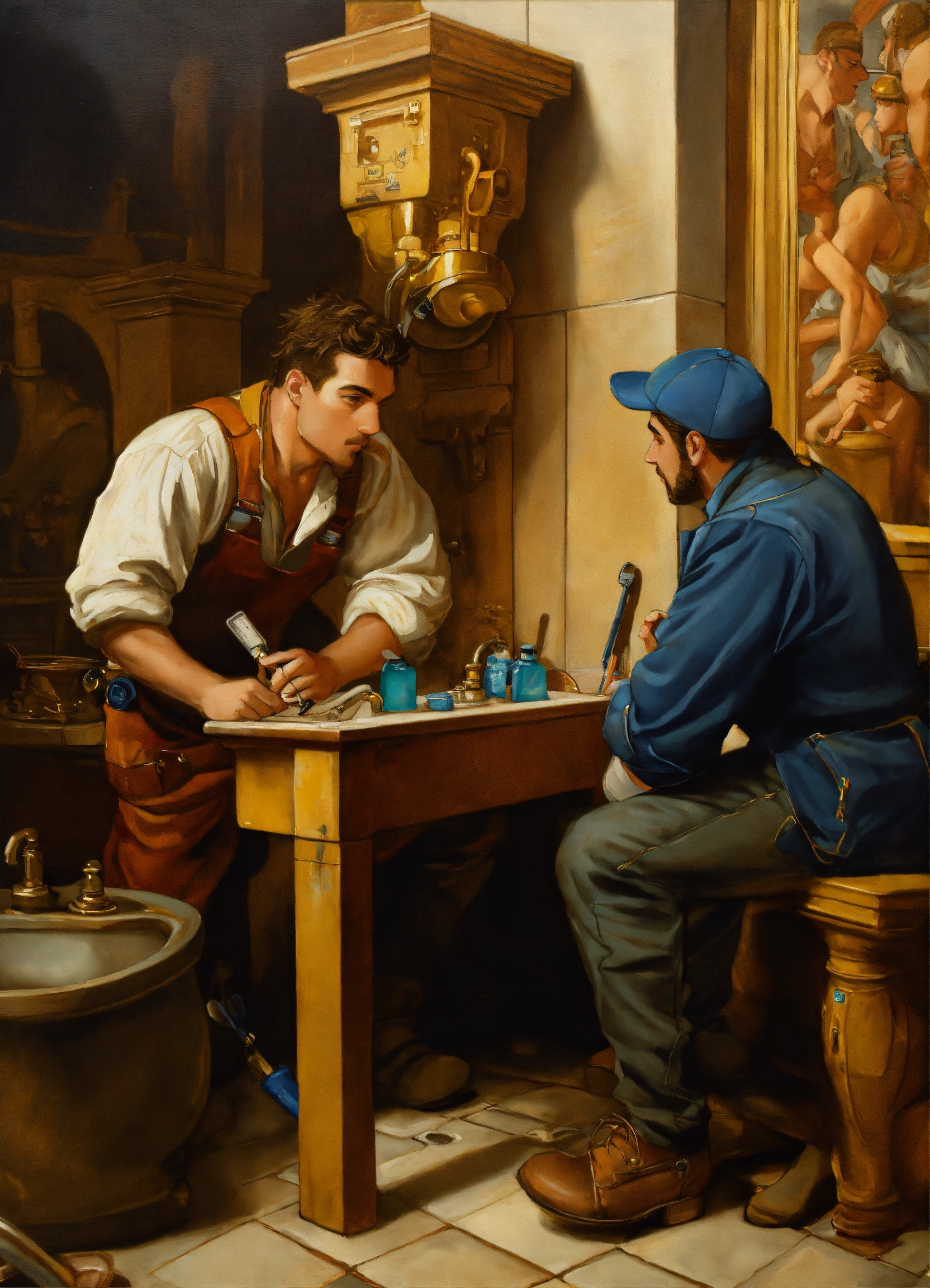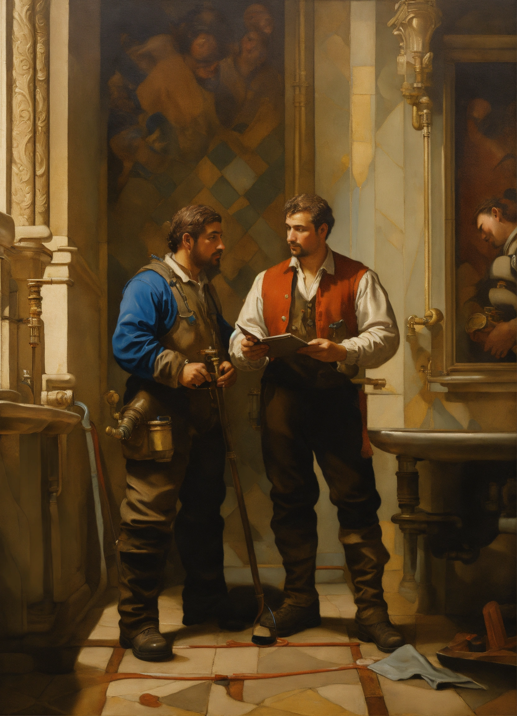 A plumber who inquires his colleague about the procedure of a big plumbing project baroque style oil painting and a diagonal plan