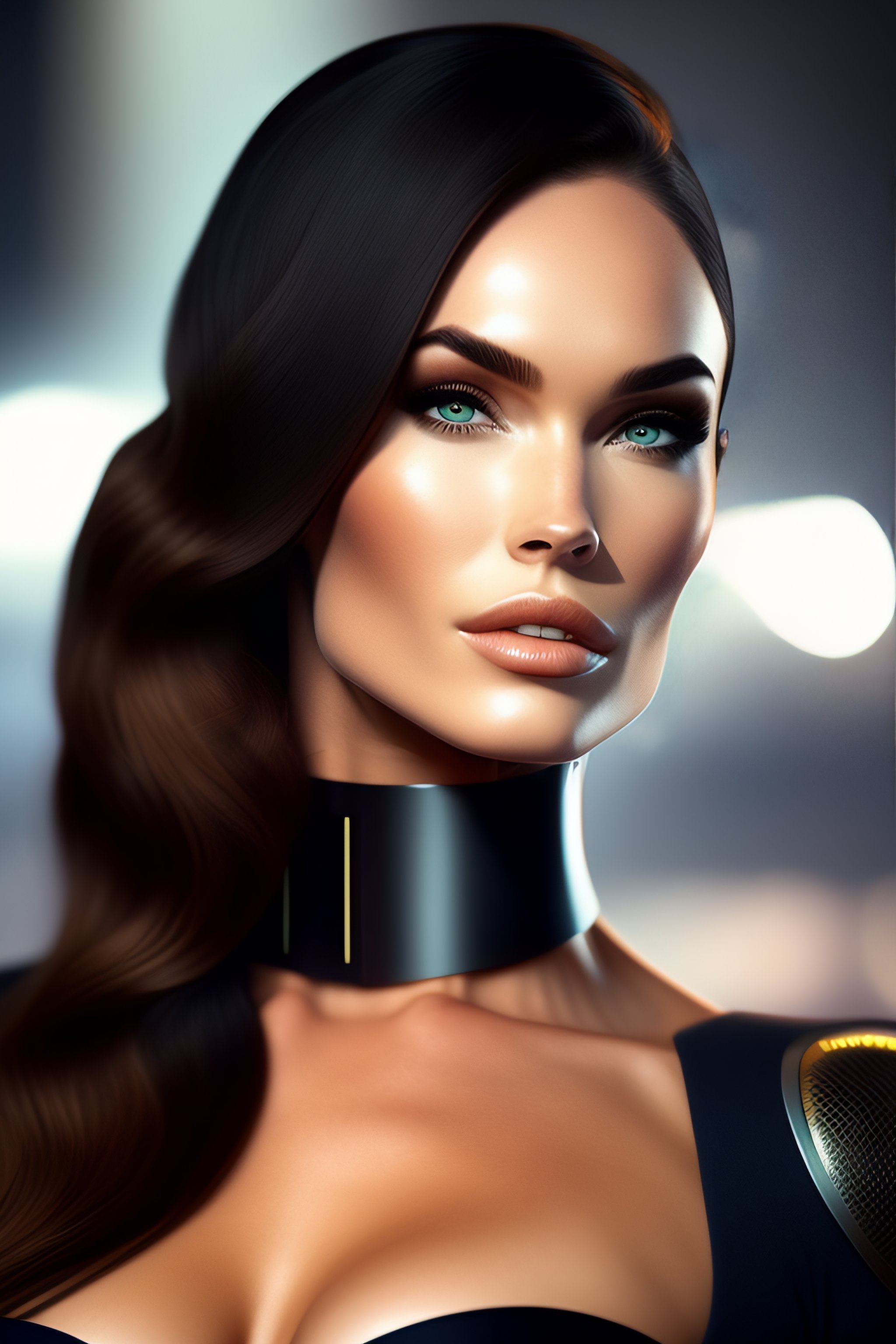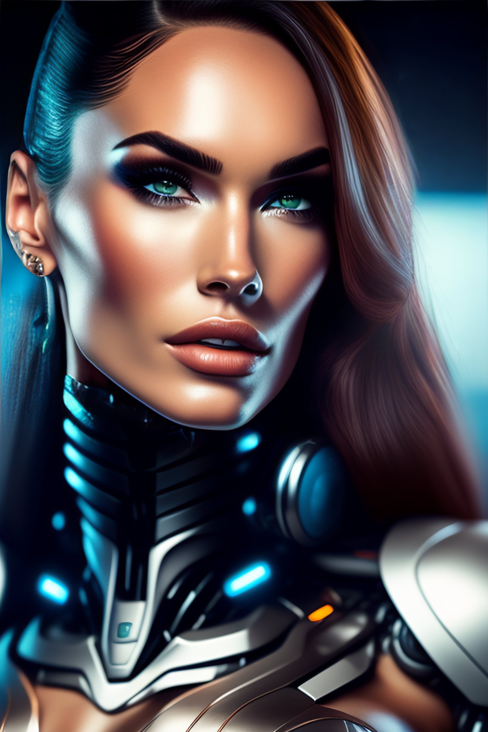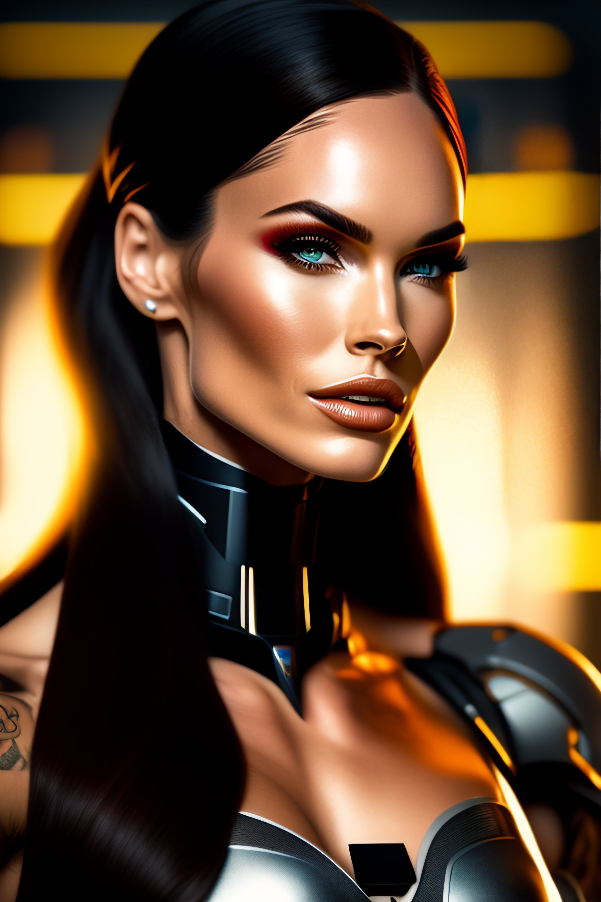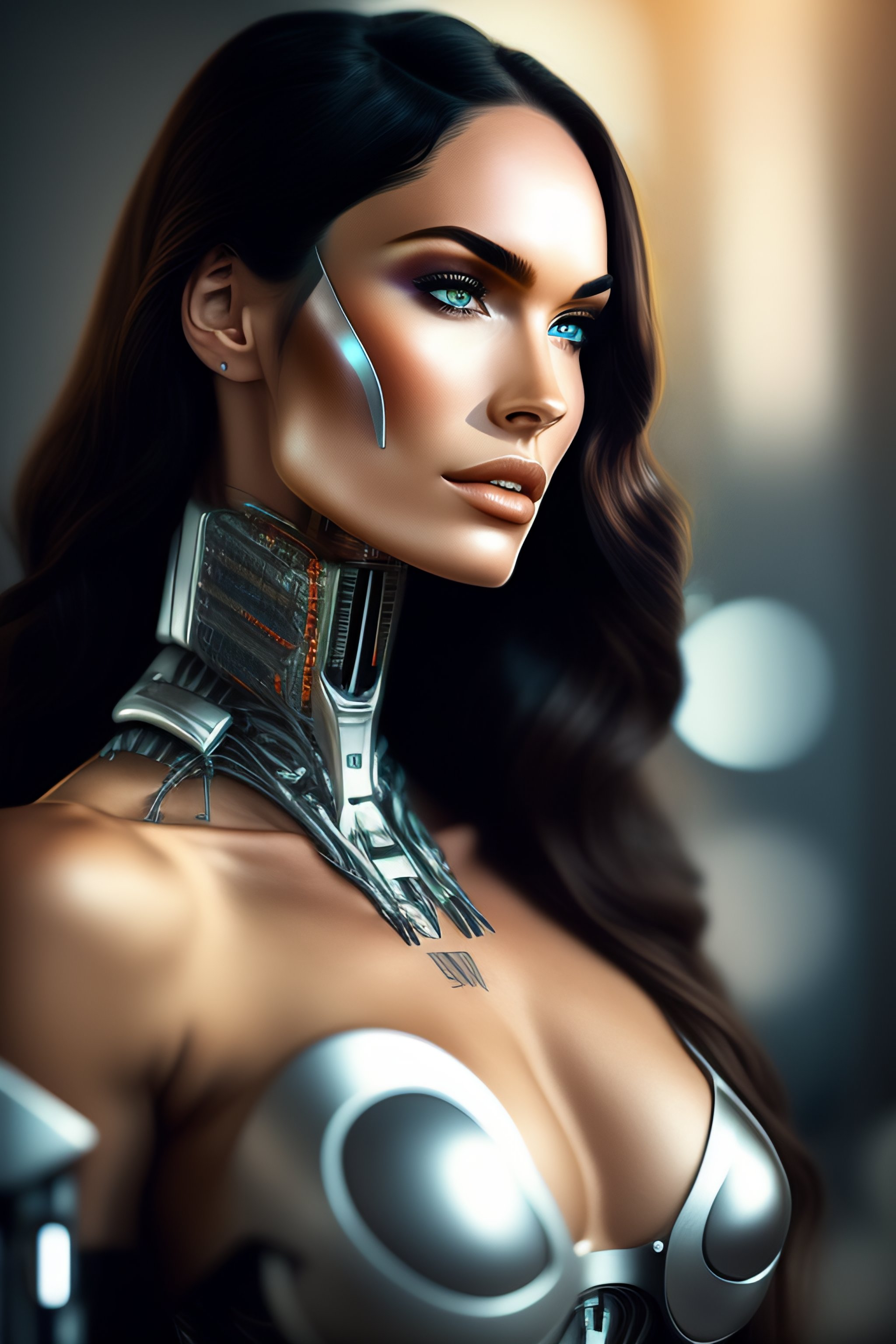 Cyborg robot with computer, a character side portrait, realistic, half body shot, sharp focus, elegant ultra detailed of a beautiful profile megan fox face