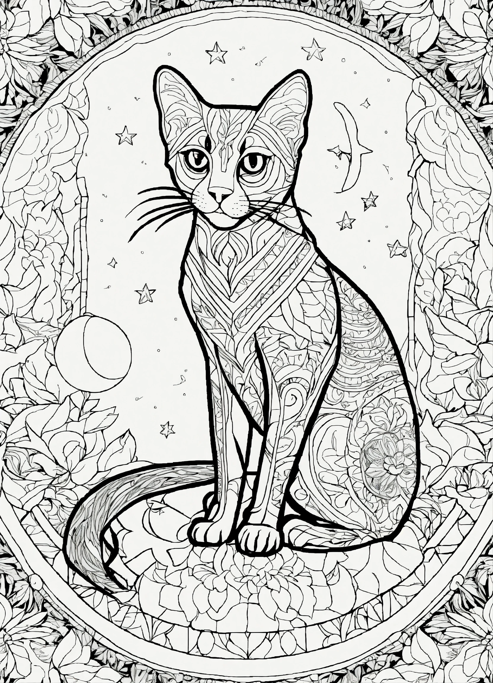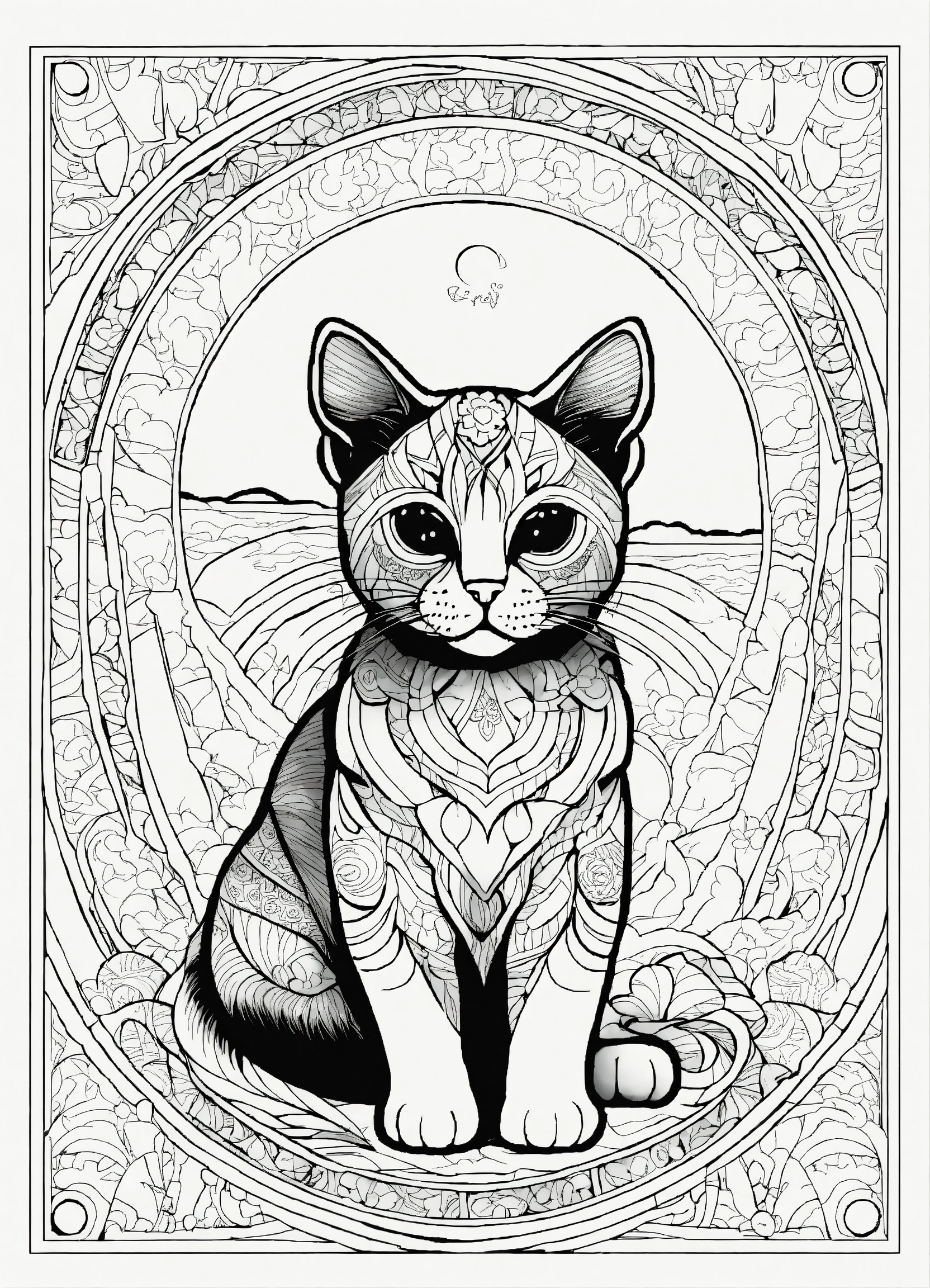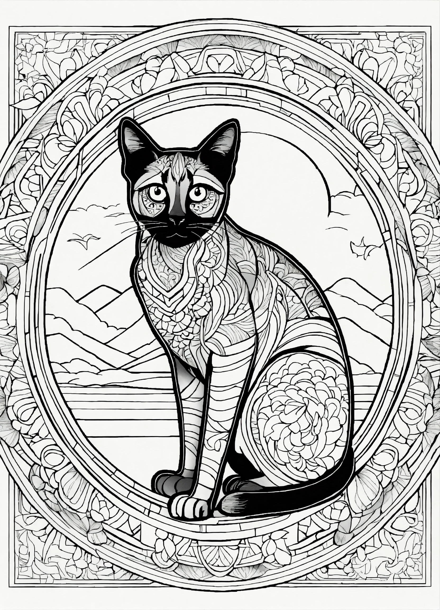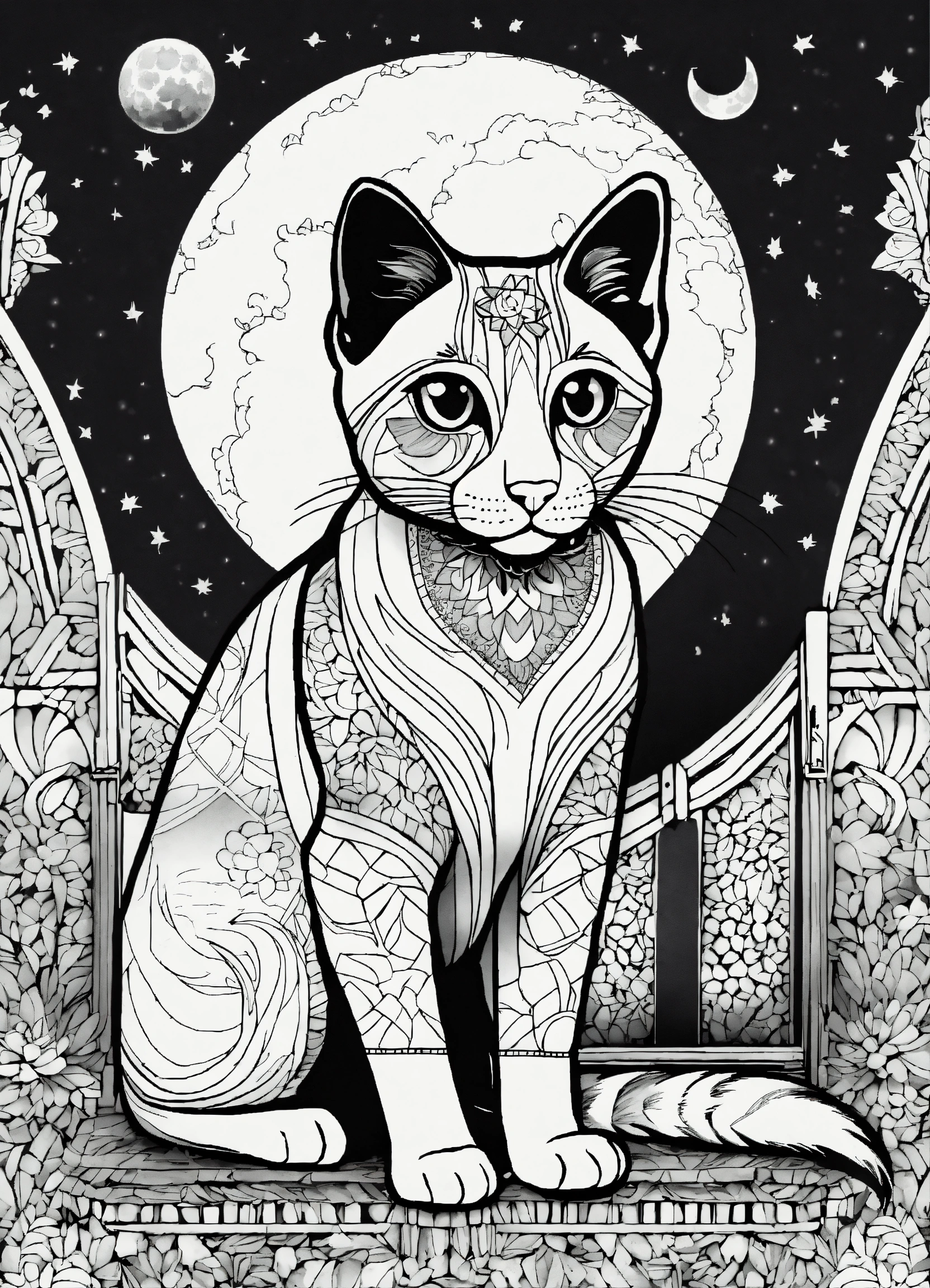 Coloring page for adults, bold lines, dark lines, mandala puppy body, very detailed mandala siamese cat looking at the moon, very detailed mandala, symmetrical, white background, clean line art, fine line art