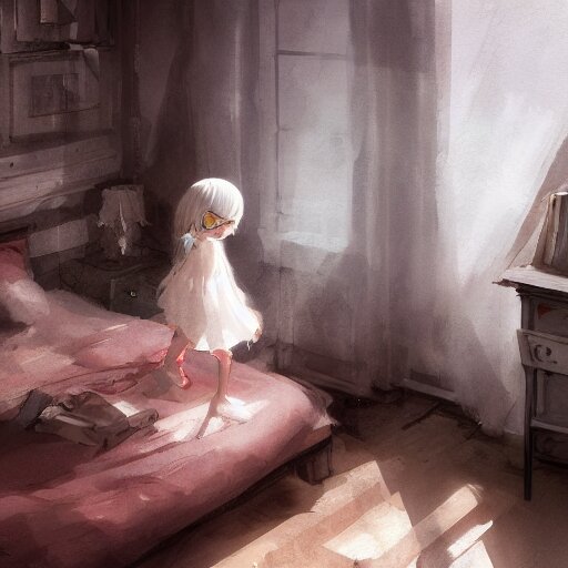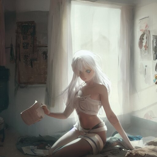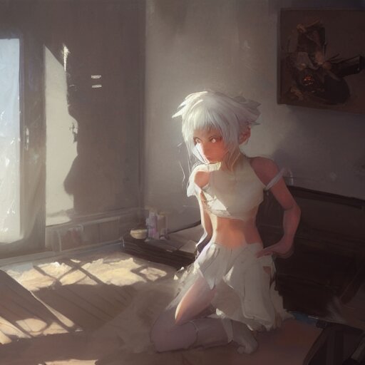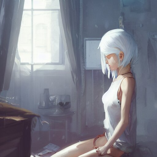 A young girl white hair in front of a fan of her bedroom, in a heat day, by dustin nguyen, akihiko yoshida, greg tocchini, greg rutkowski, cliff chiang, 4 k resolution, trending on artstation