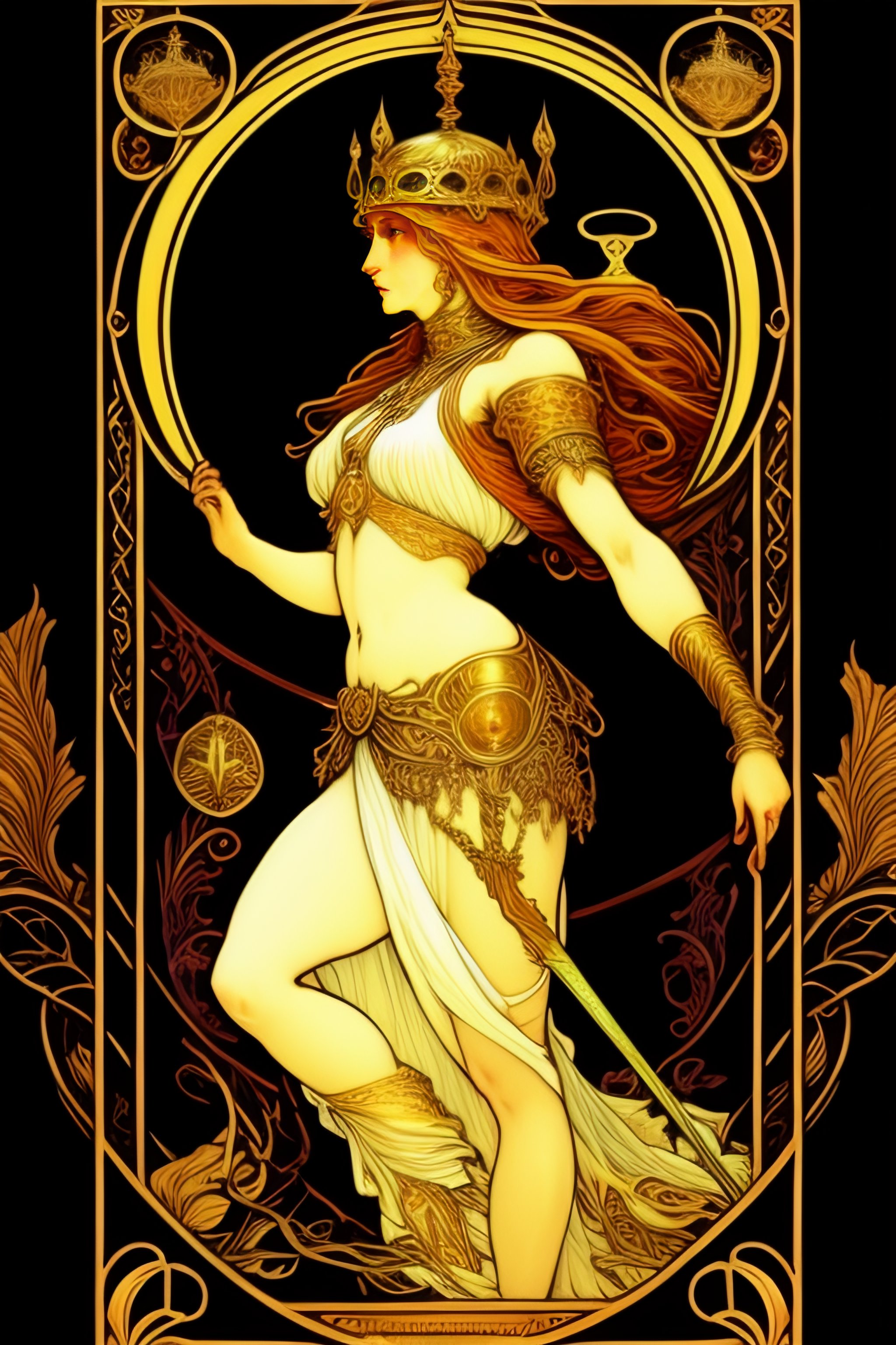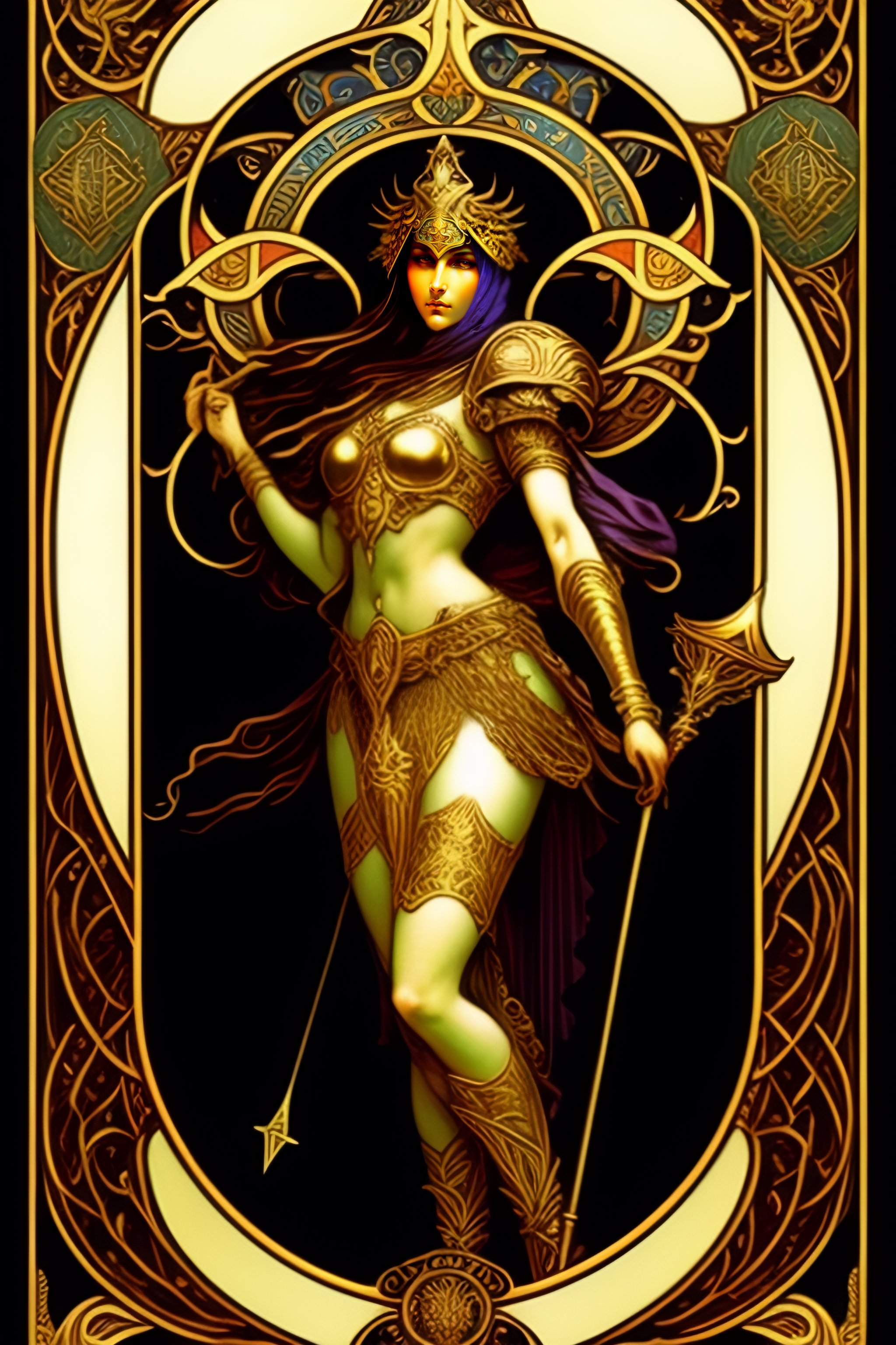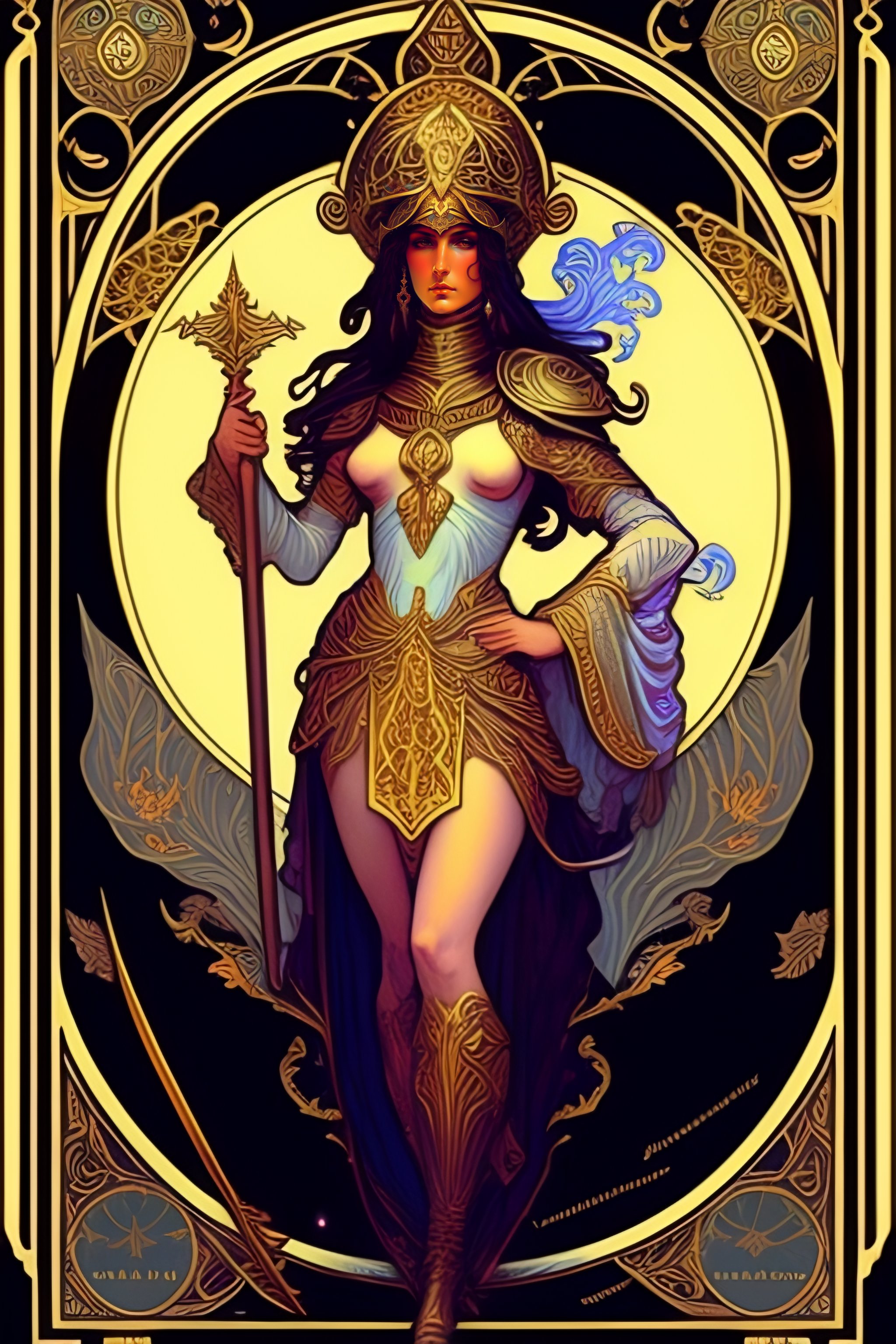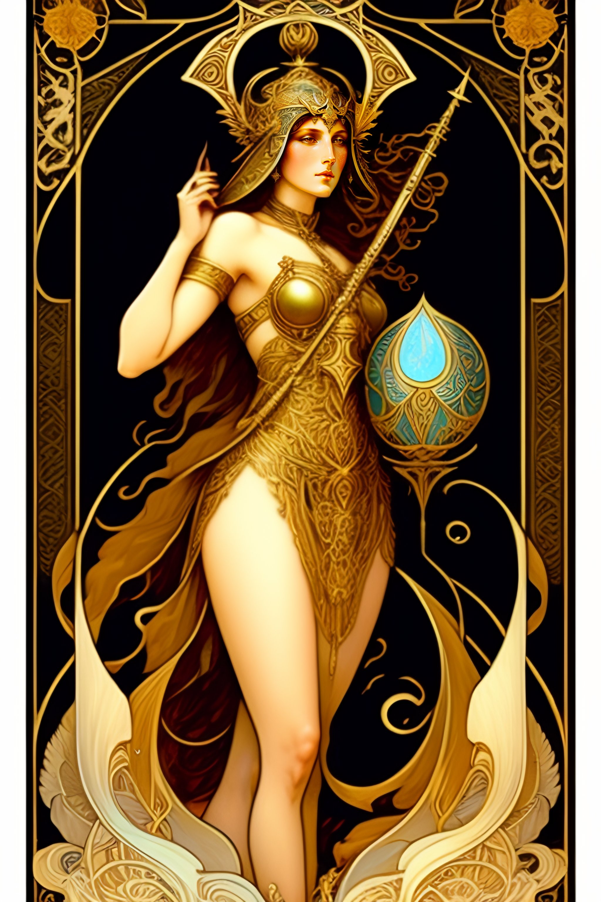 Alphonse mucha's art-nouveau tarot card of a fantasy chaos knight with a threatning helmet, a lance in the right hand