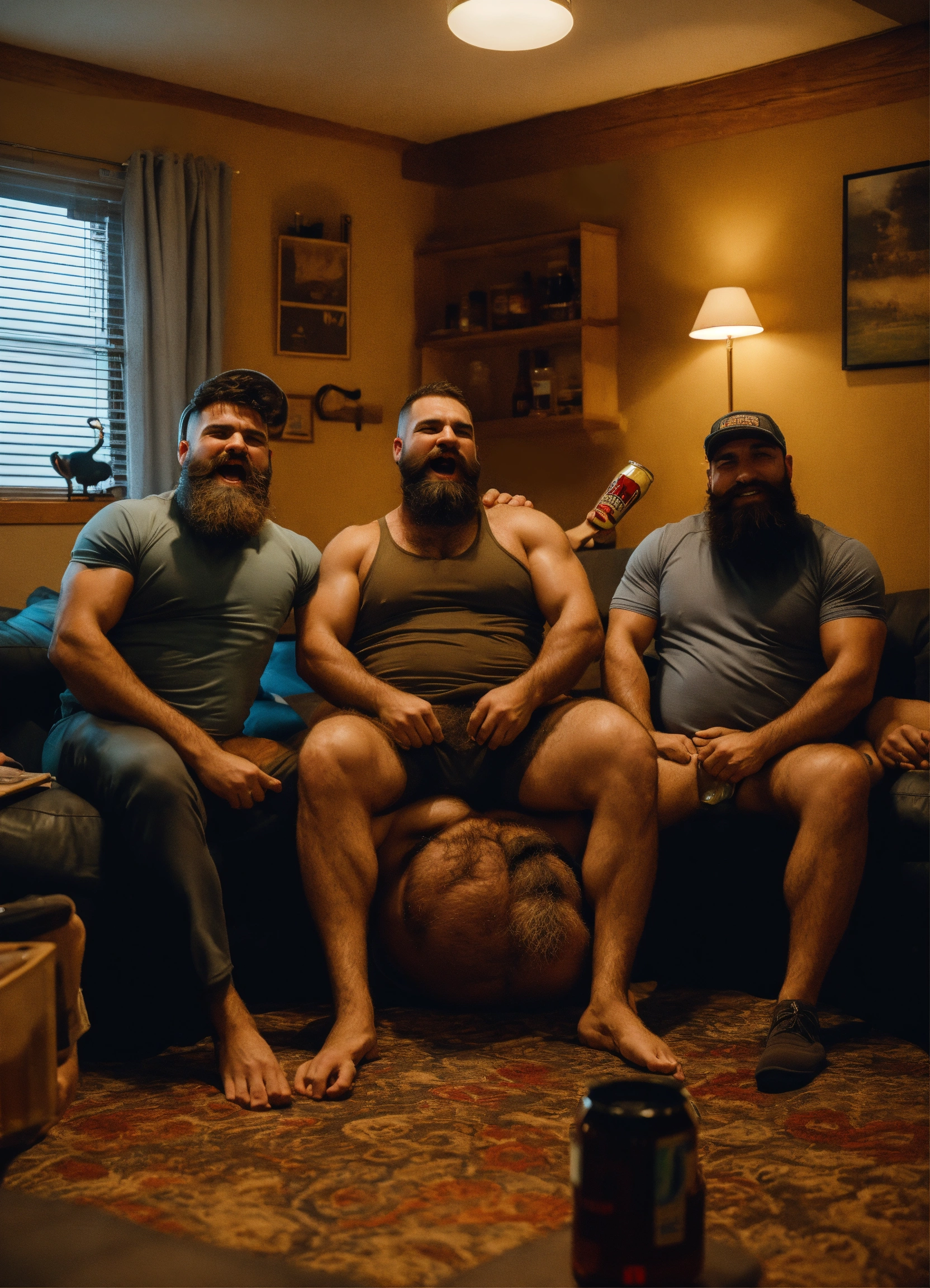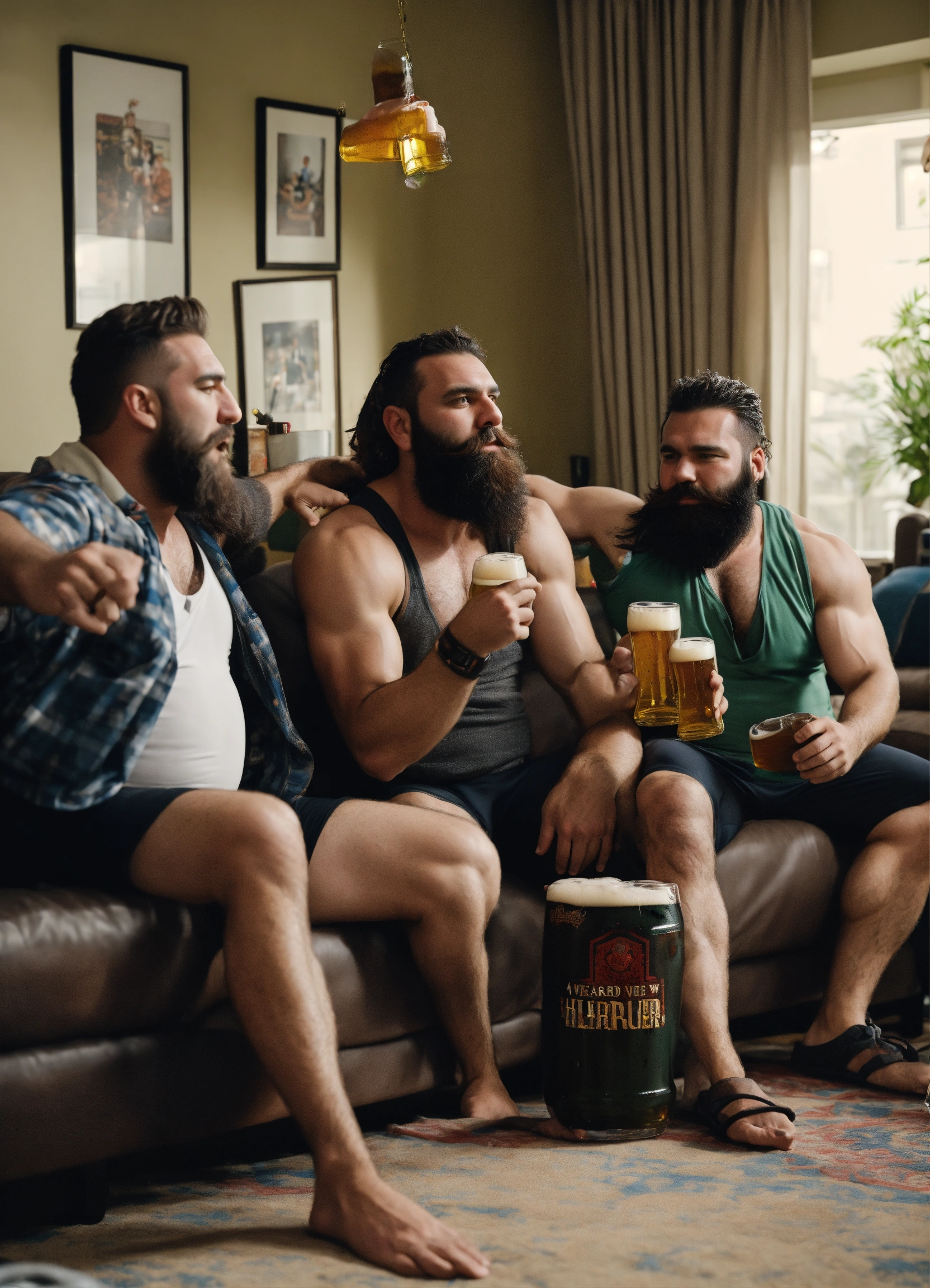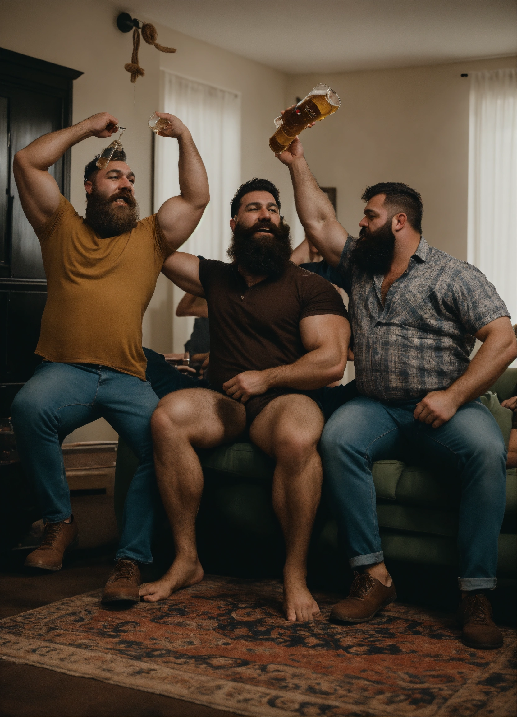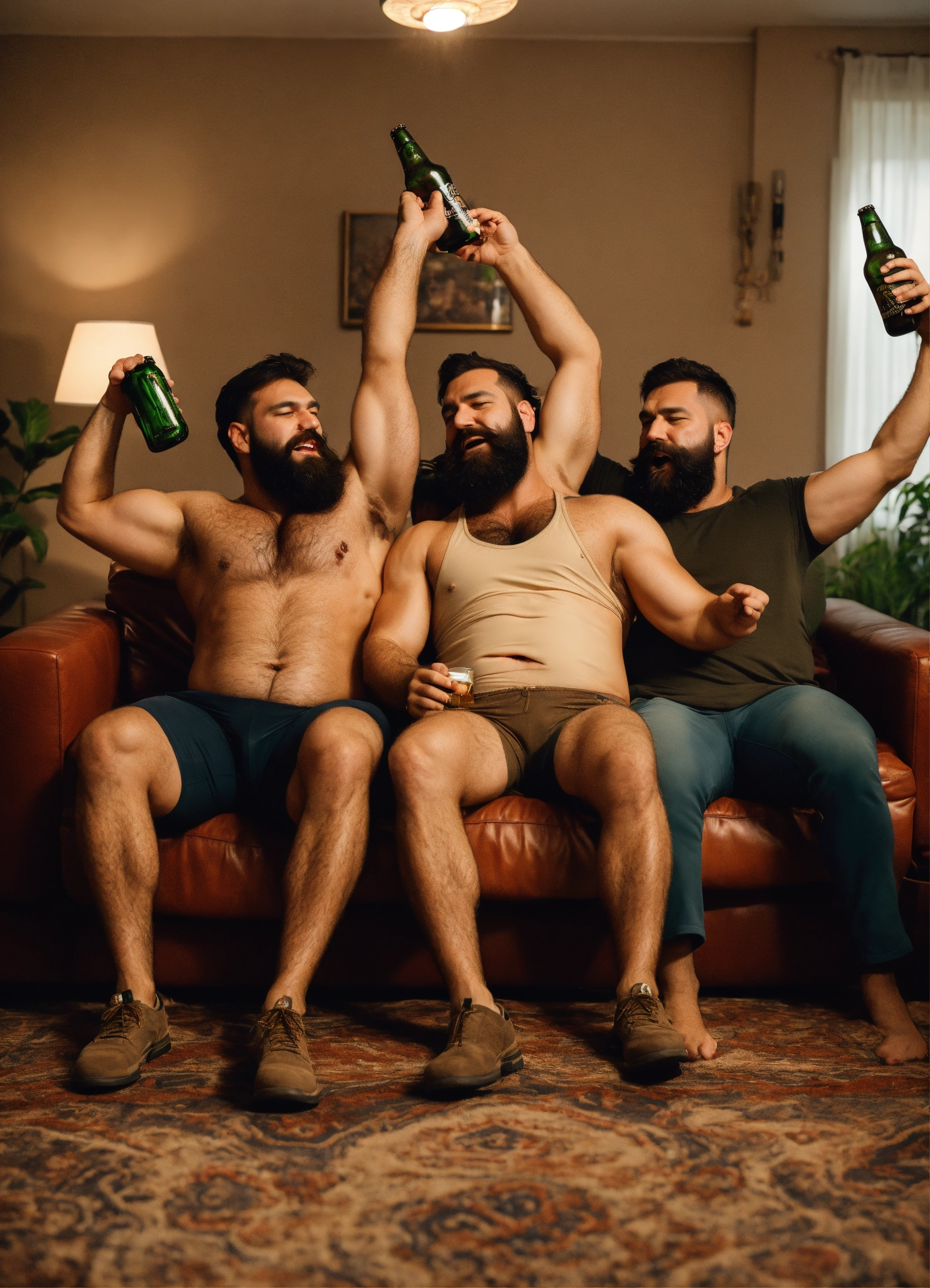 A trio of ethnic bearded working class dads, average bodies, beards, hairy chest, beer bellies, arms up, drunk and wrestling in their living room in 4k