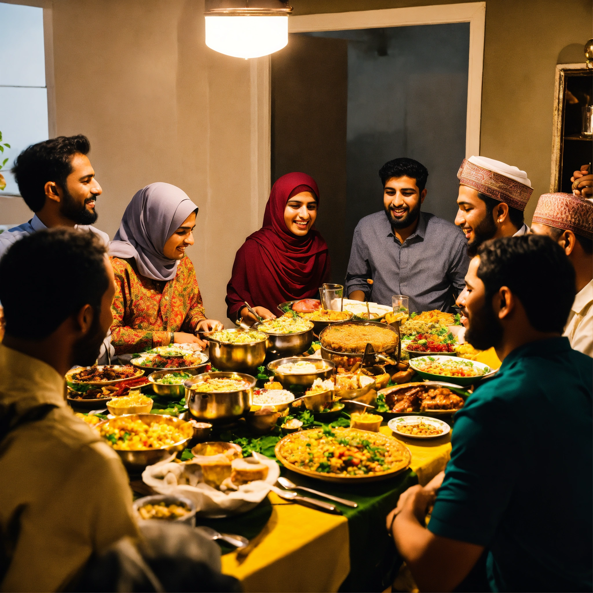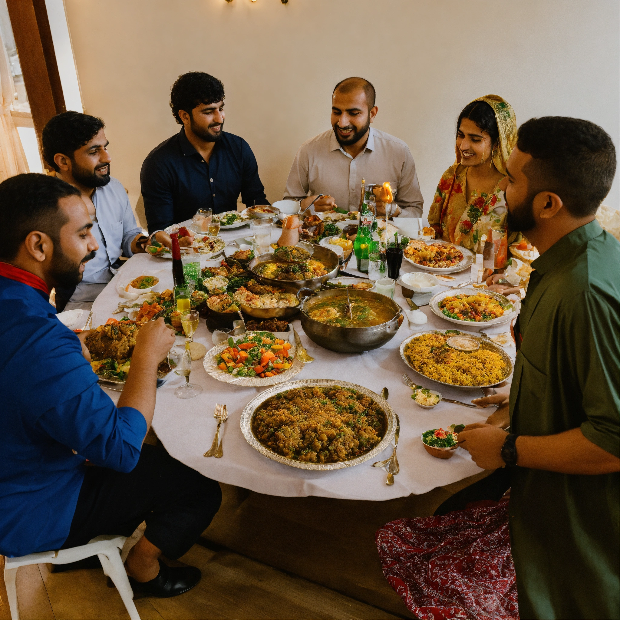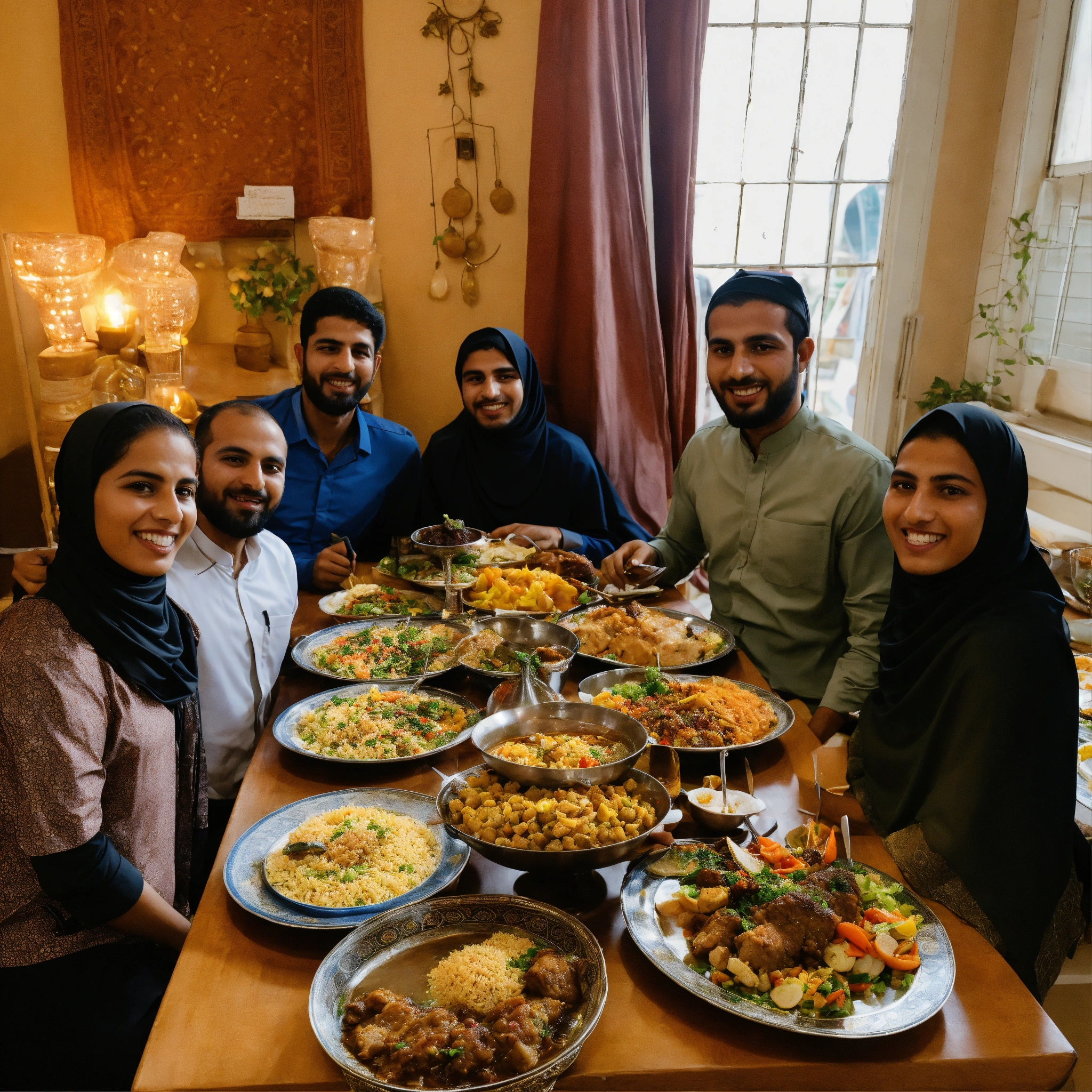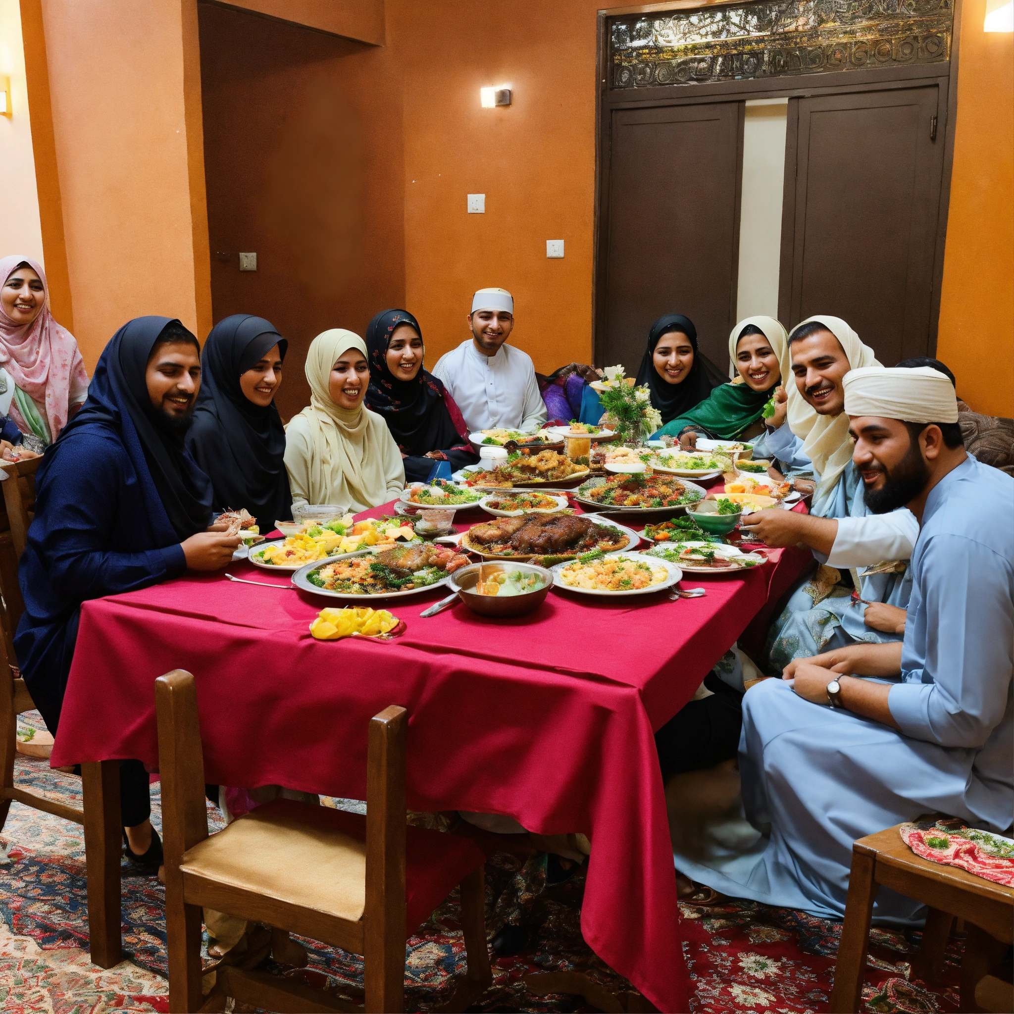 A photo of a group of people celebrating eid al adha. the group is gathered around a table, and they are enjoying a meal together.