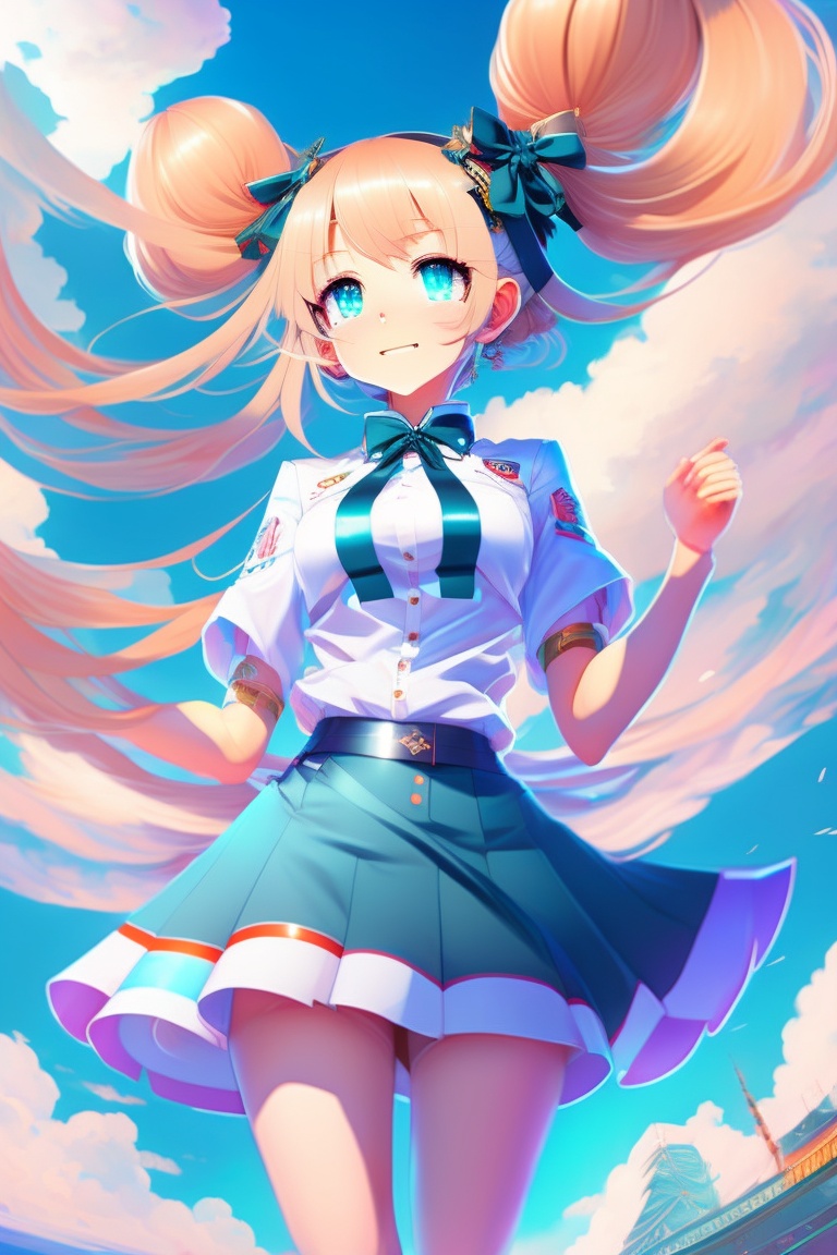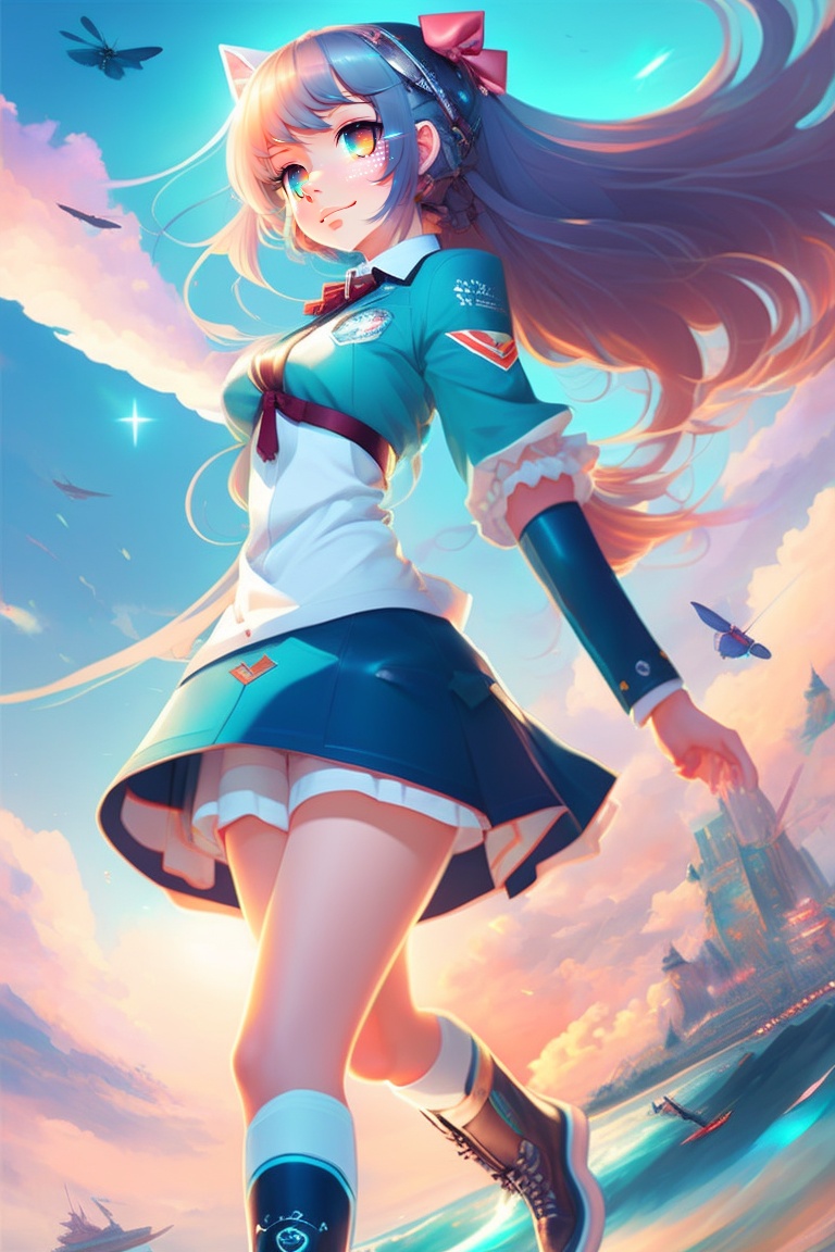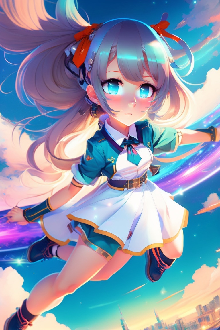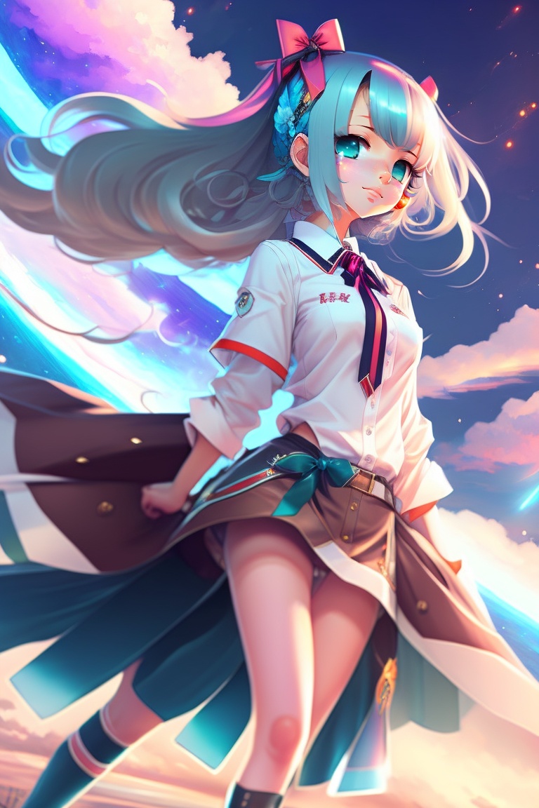 Anime art of beautiful hatsune miku wearing a japanese schoolgirl uniform with beautiful legs flying in the sunset by artgerm, rossdraws, kishida mel, makoto shinkai, studio ghibli, magali villeneuve, gil elvgren, earl moran, enoch bolles, symmetrical shoulders, kishida mel style eyes, symmetry, magical ambient, galaxy background