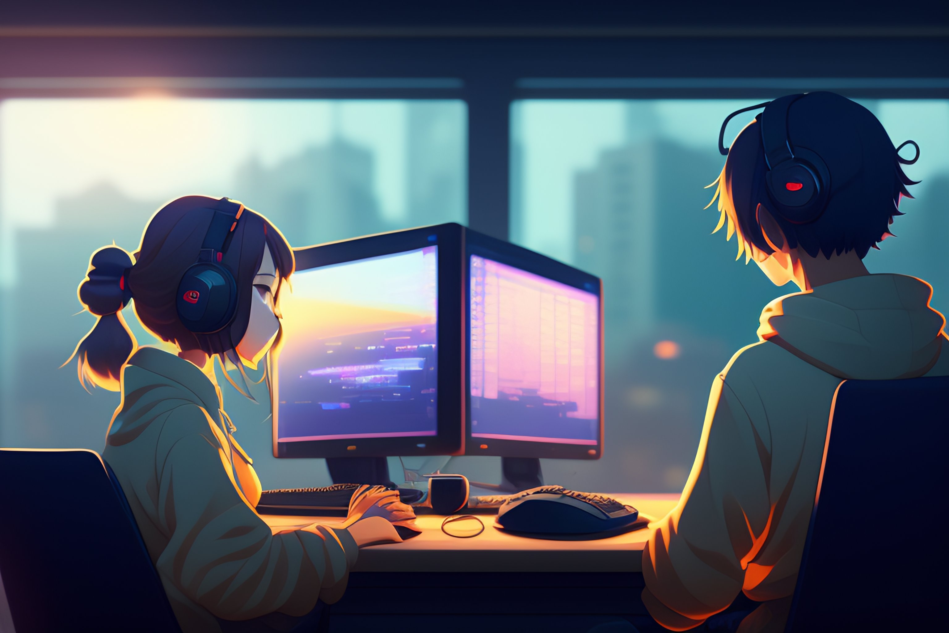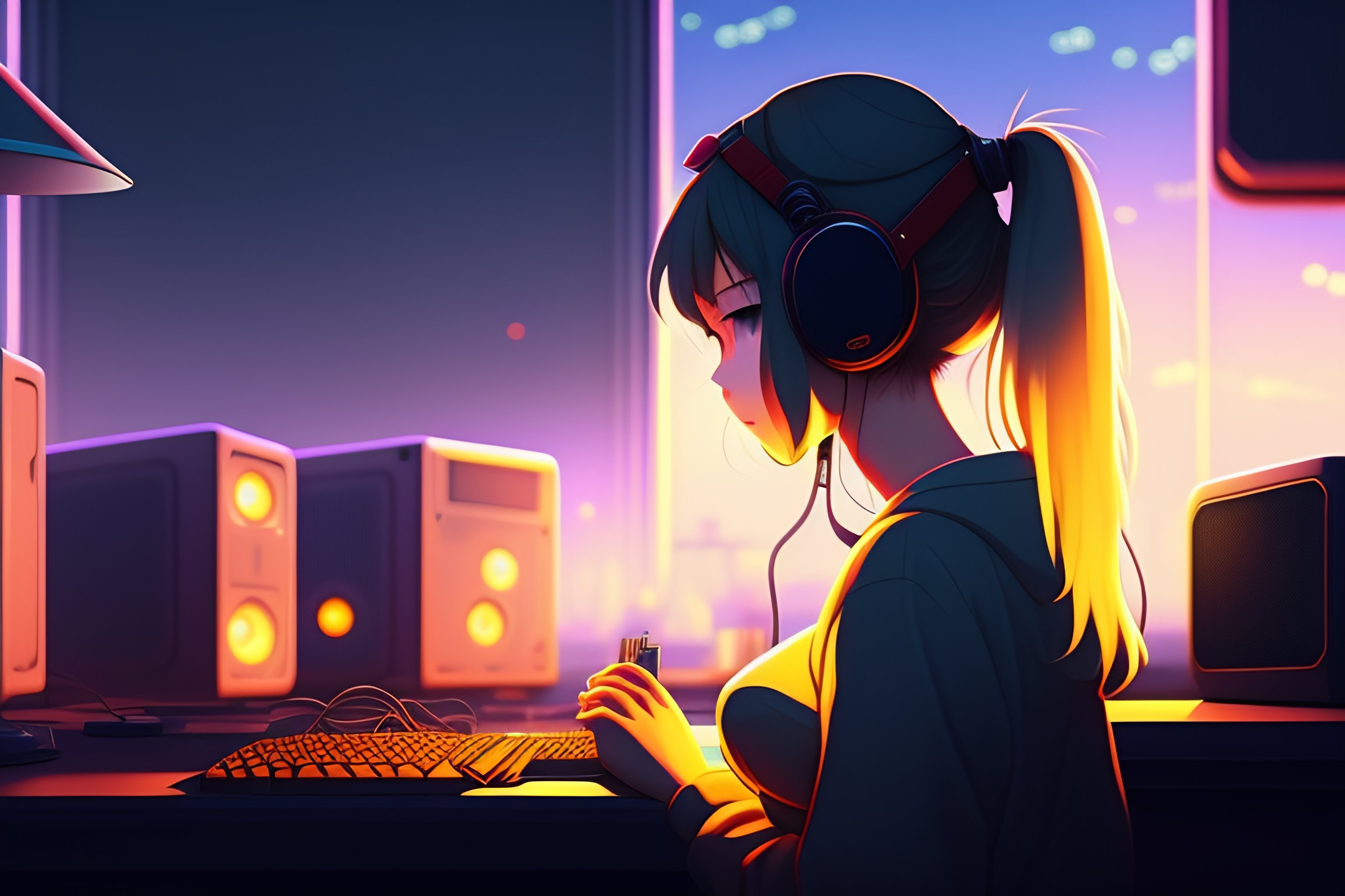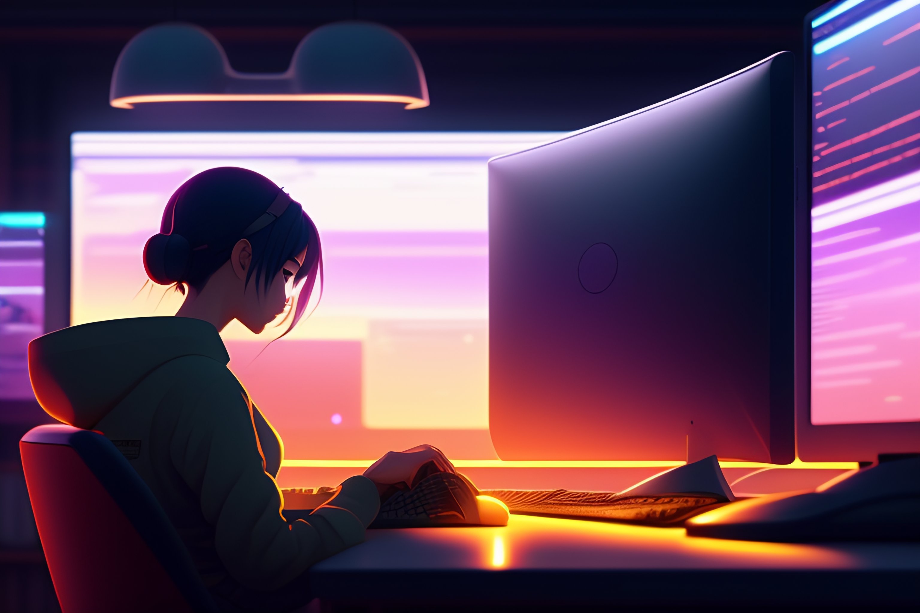 Create a high resolution artwork of lofi, anime girl is programming at a computer in a room full of gadgets, snown, web developer, by makoto shinkai and ghibli studio, outlined silhouettes, dramatic lighting, highly detailed, incredible quality, trending on artstation, masterpiece, 8k