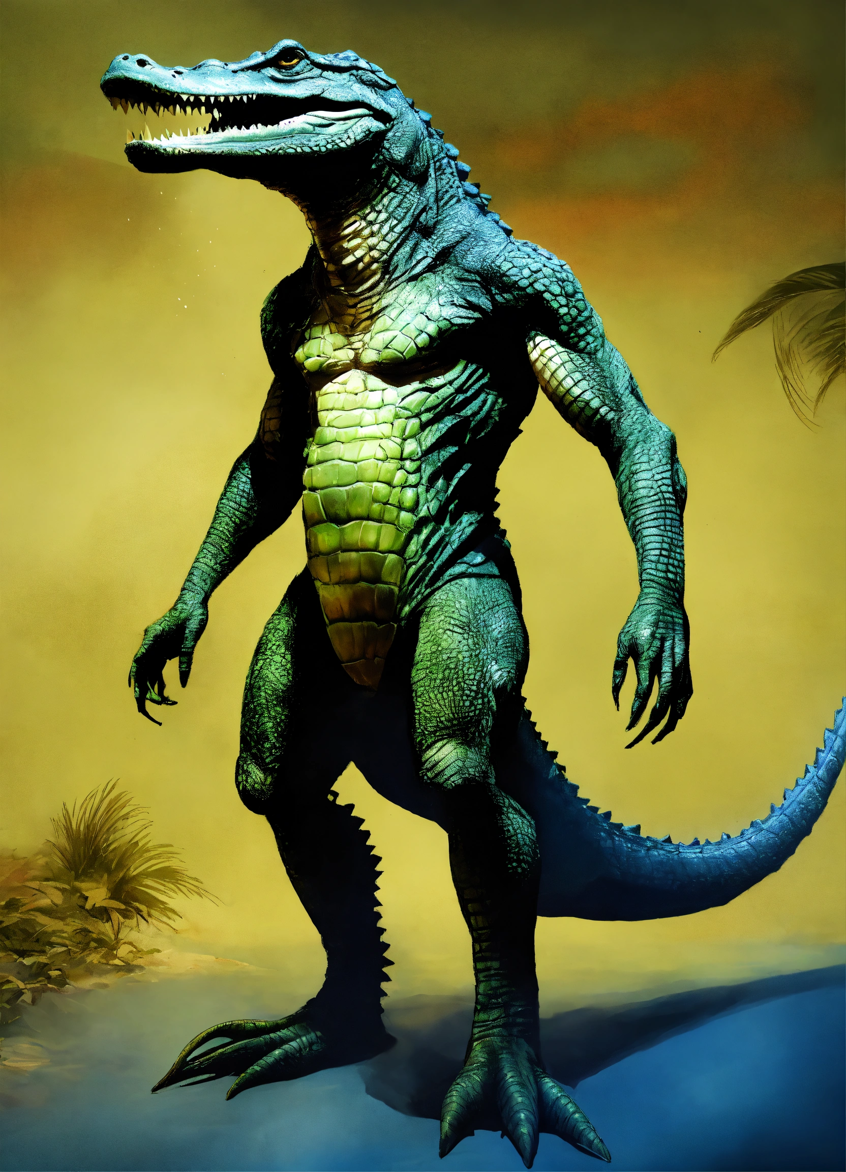 Realistic drawing a full body portrait of a humanoid crocodile alien,