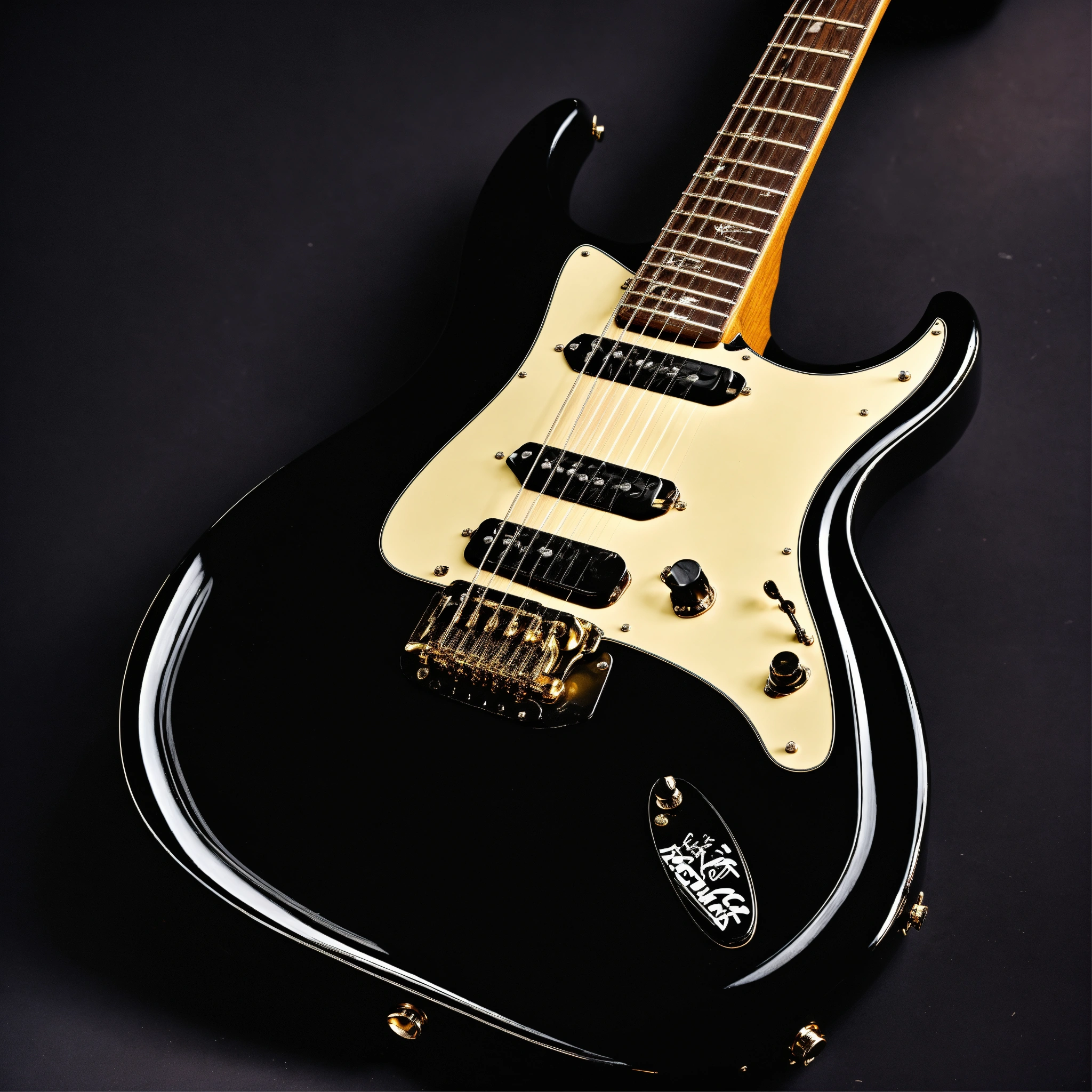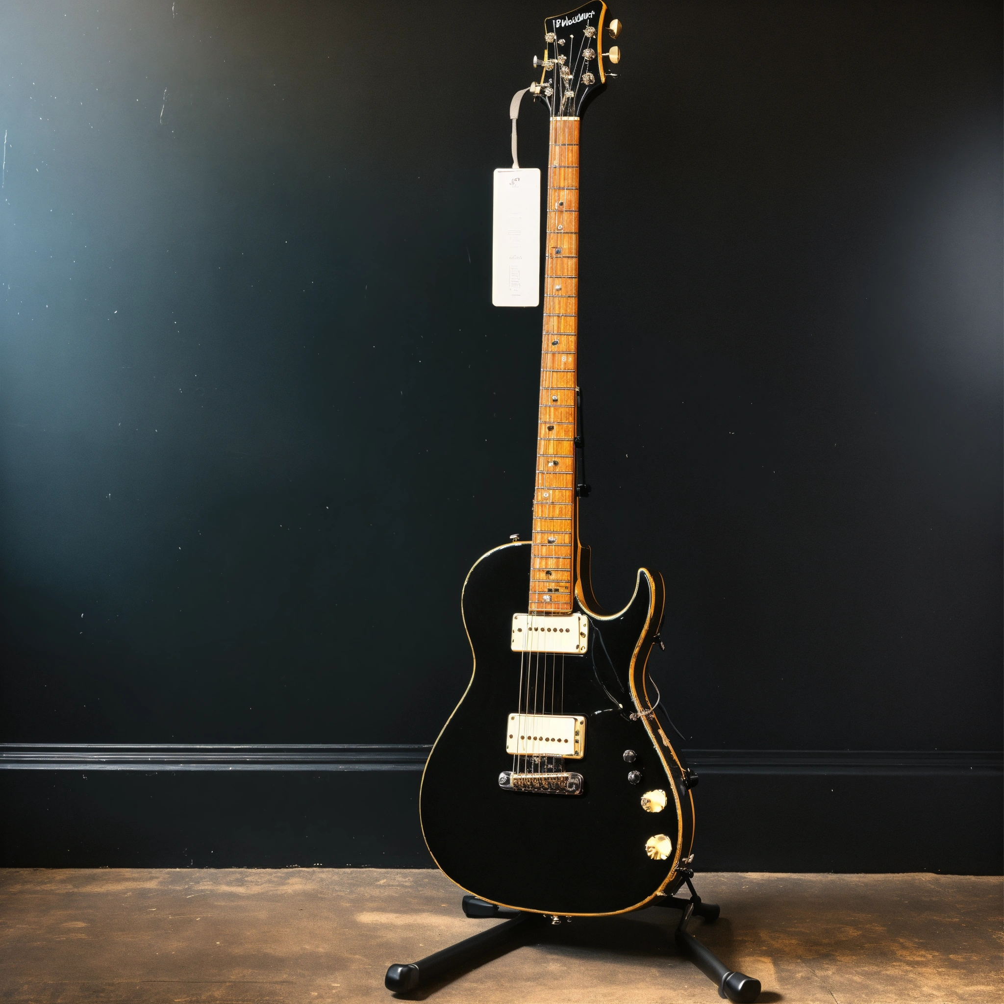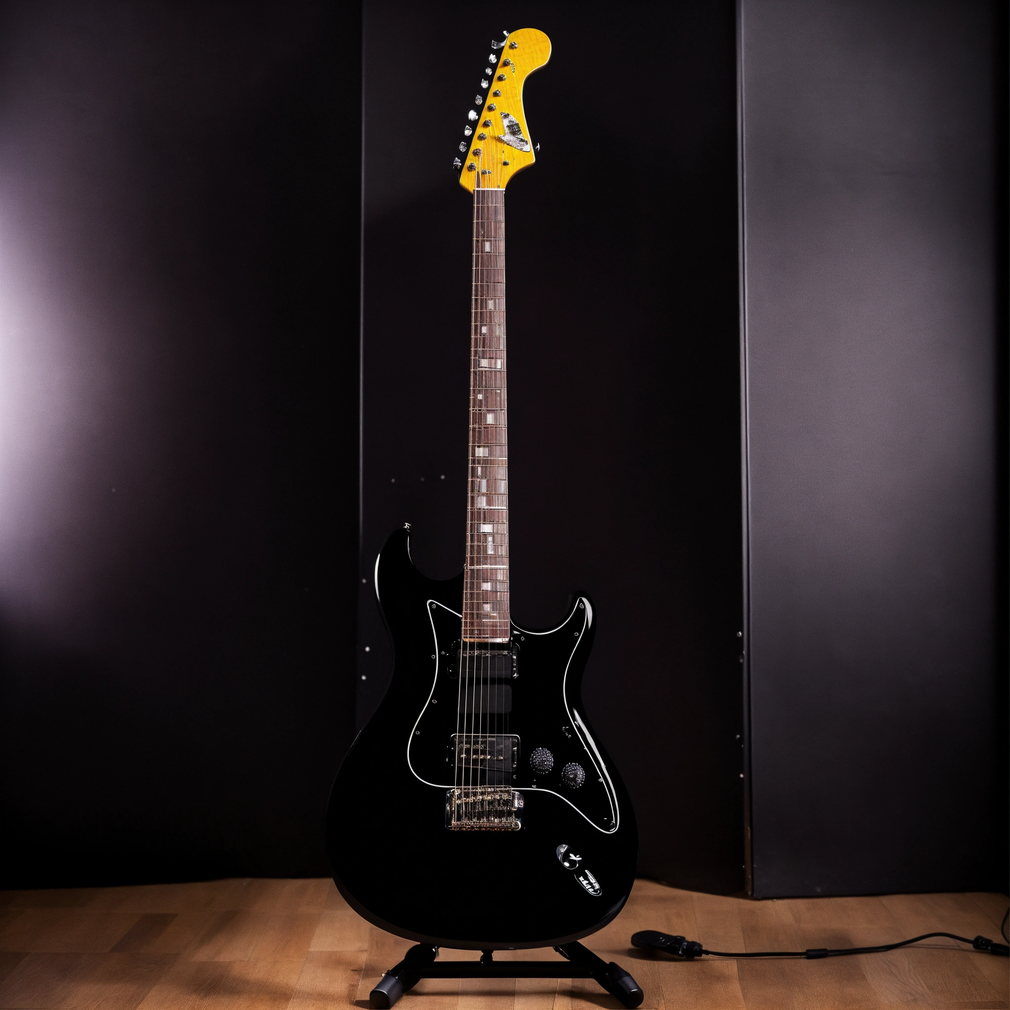 A photo of a black electric guitar, the guitar is sitting on a black stand, the background is a black wall