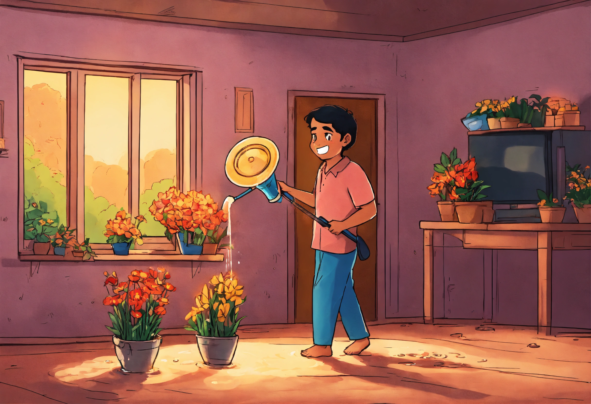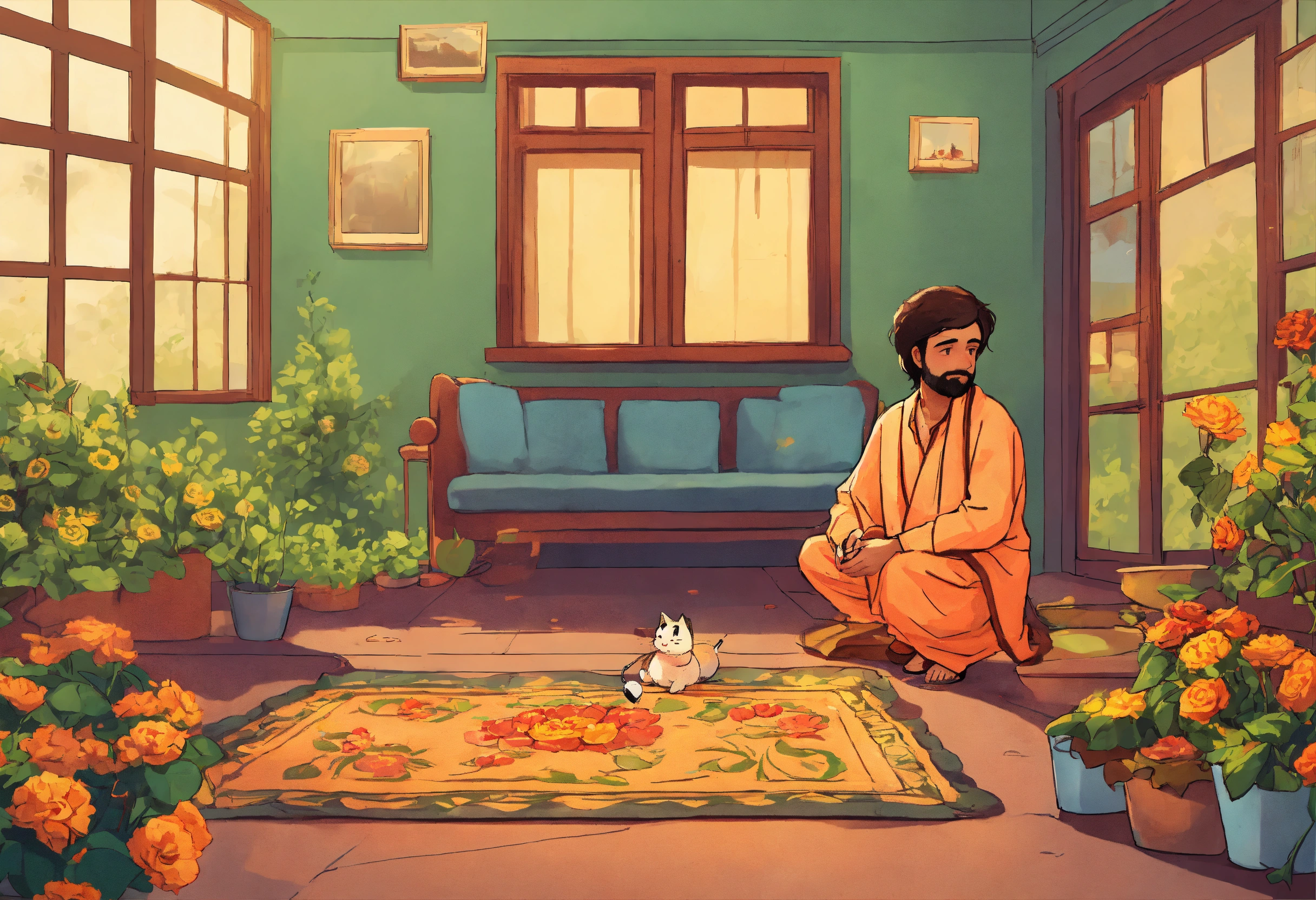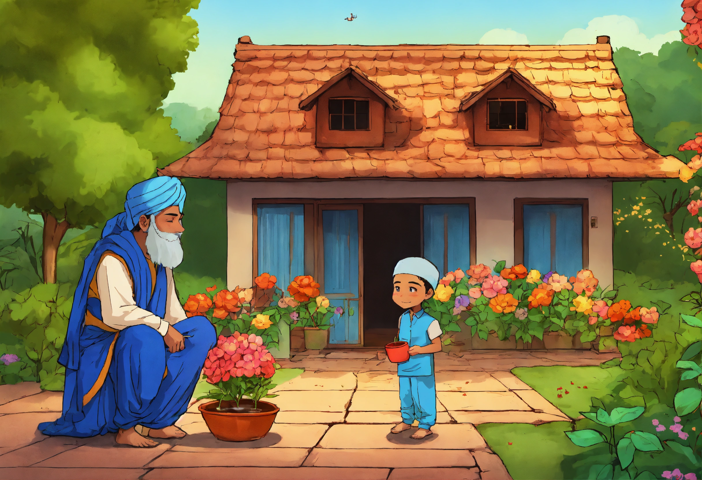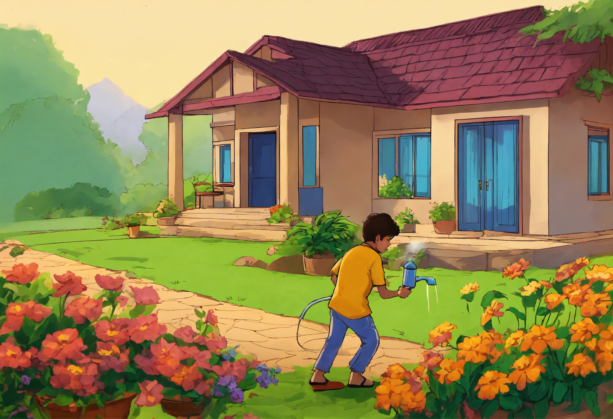 On the second day, they all went to faizan's house. at that time, he was alone in the house. karmo uncle was watering the flowers outside. ai cartoon image
