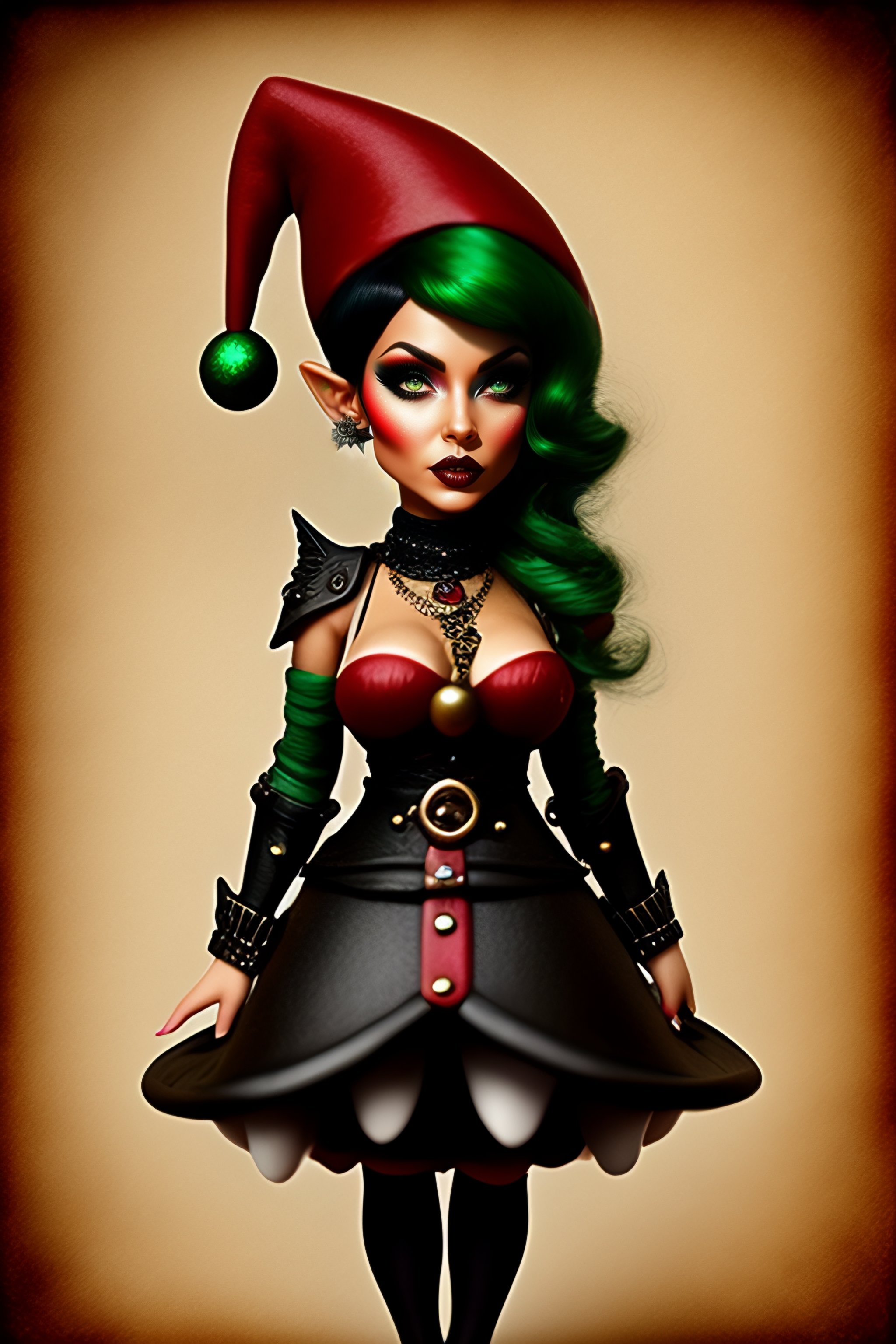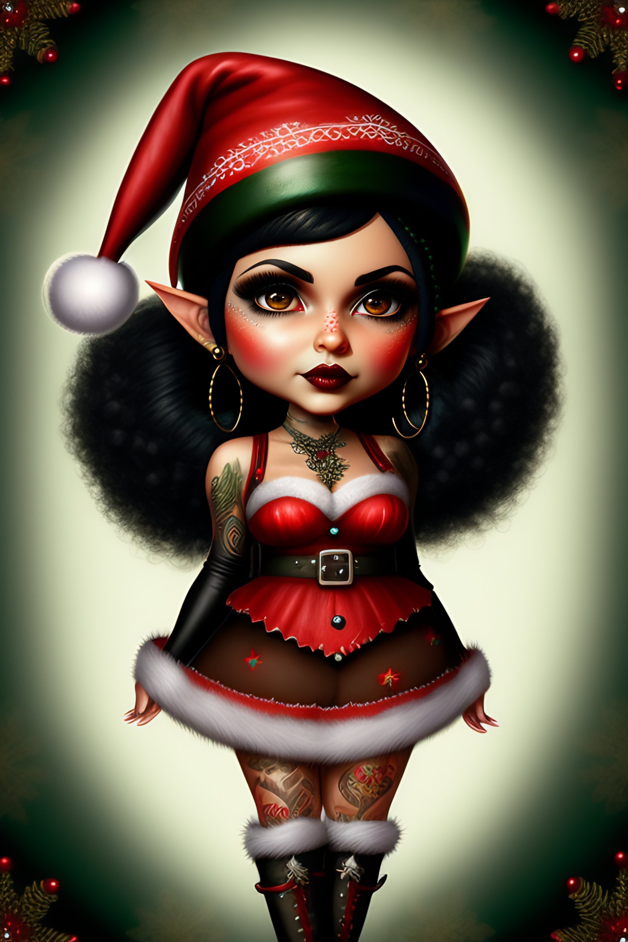 Christmas elf, short black hair, female, long pointy elf ears, full figured, little person, tattooed rebel, steam punk, biker, painted style, santa, gingerbread, gothic