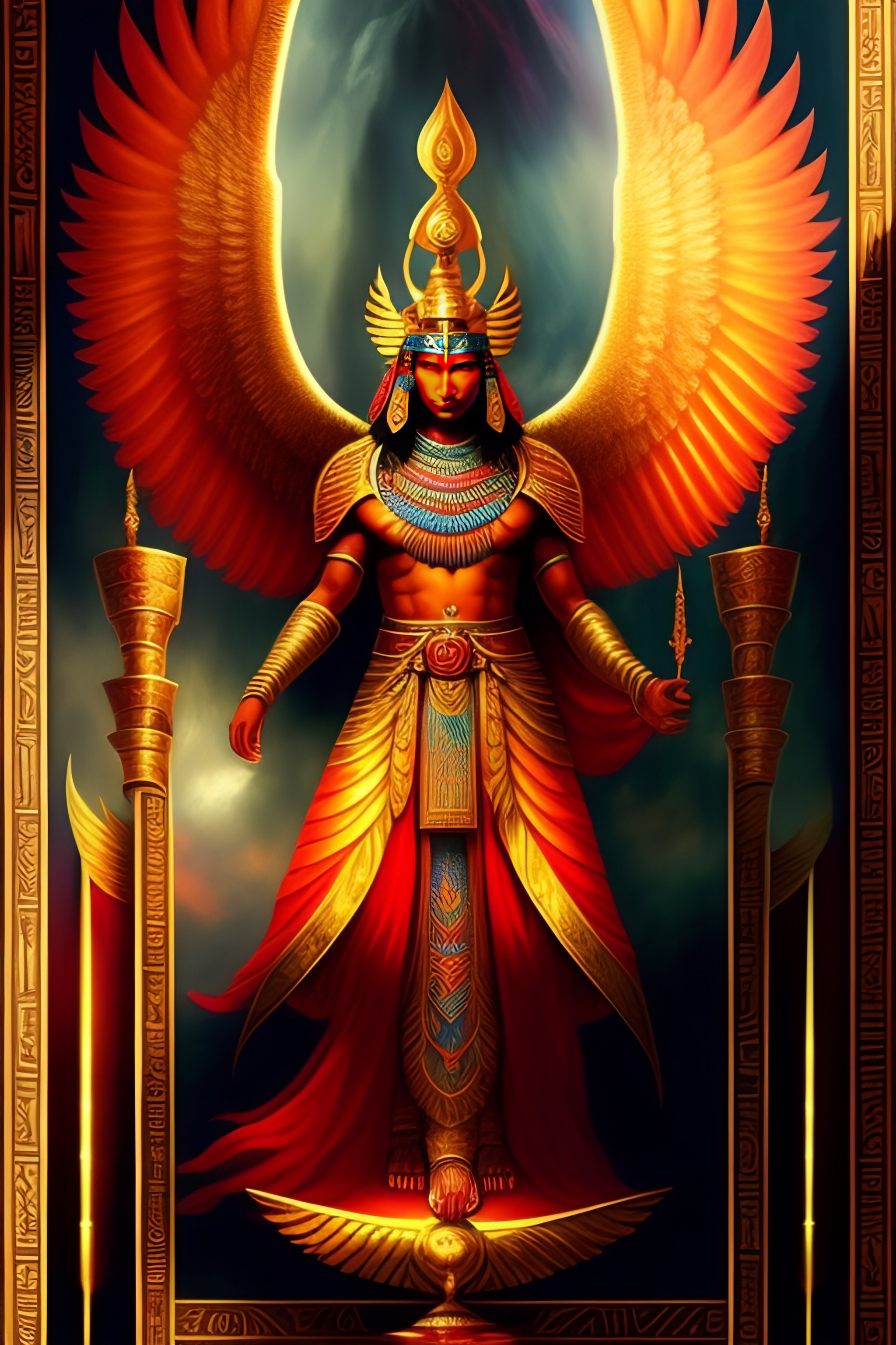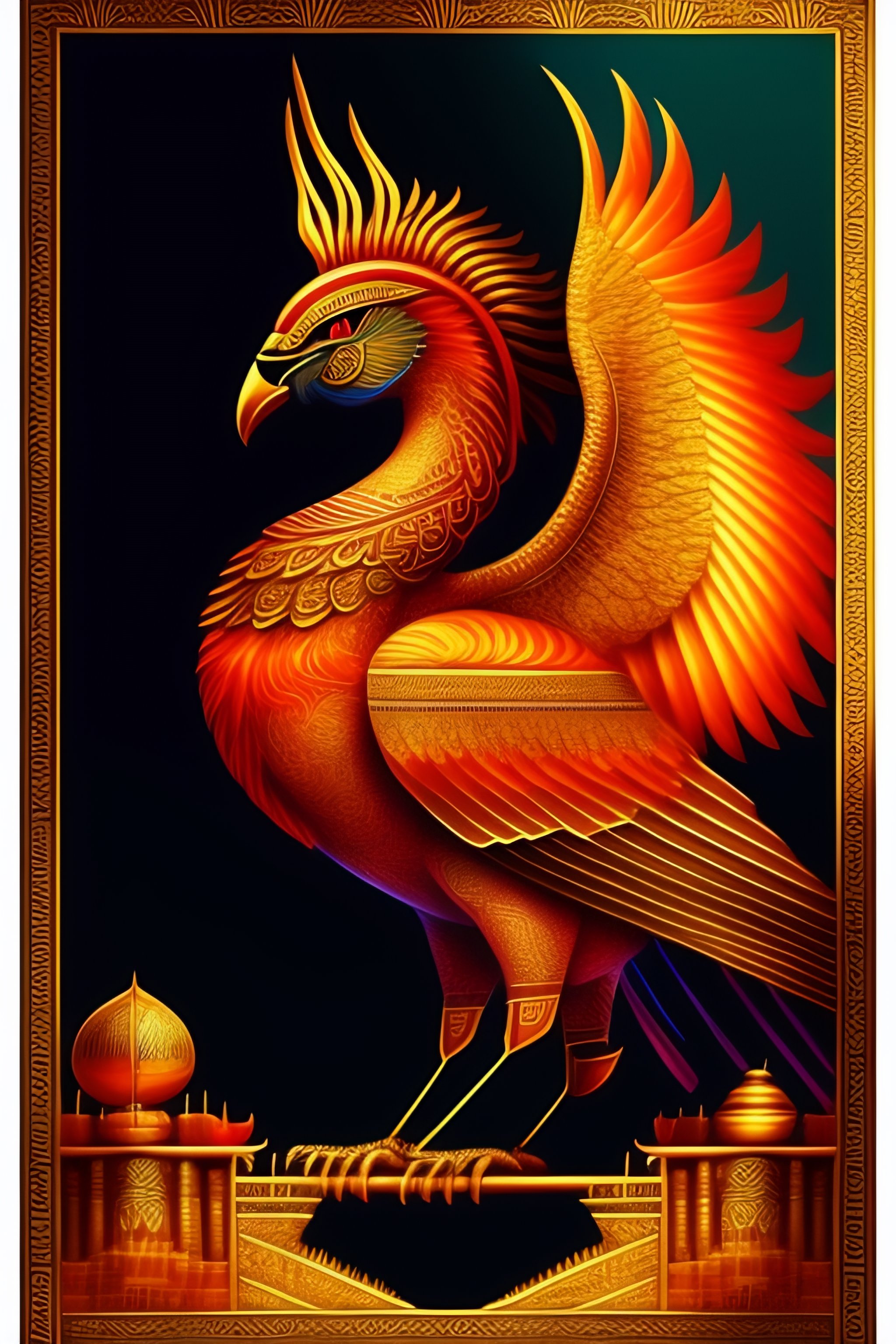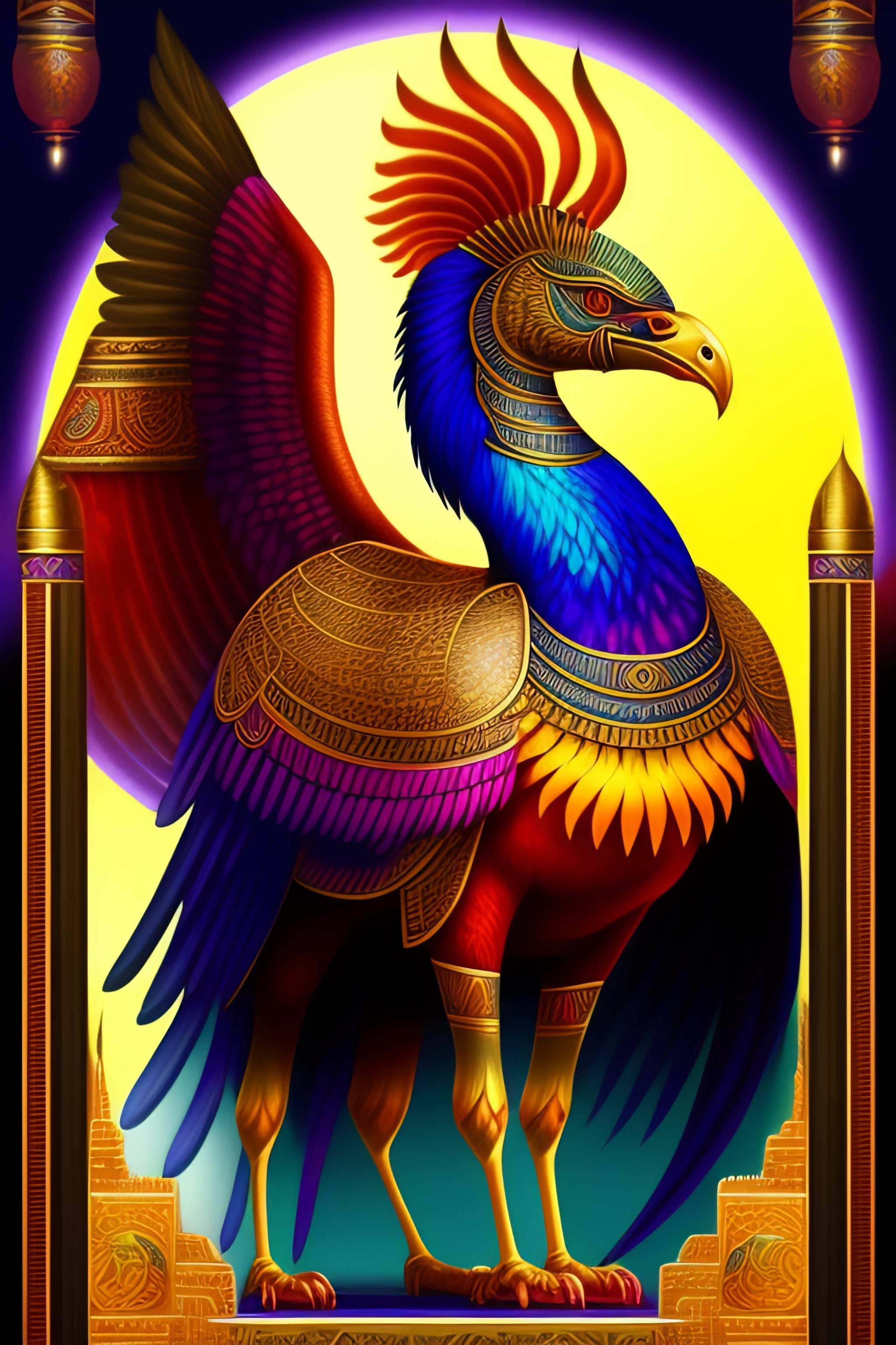 Create an image of the great benu bird phoenix in an art noveau egyptian inspired style. show a great palace, bridge and vast forest highly detailed. use the following as inspiration: spell for being transformed into a phoenix. i have flown up like the primeval ones, i have become khepri, i have grown as a plant, i have clad myself as a tortoise, i am the essence of every god, i am the seventh of those seven uraei who came into being in the west, horus who makes the brightness with his person, that god who was against seth, thoth who was among you in that judgement of him who presides over letopolis together with the souls of heliopolis, the flood which was between them. i have come on the day when i appear in glory with the strides of the gods, for i am khons who subdued the lords. as for him who knows this pure spell, it means going out into the day after death and being transformed at will, being in the suite of wennefer being content with the food of osiris, having invocation offerings, seeing the sun; it means being hale on earth with re and being vindicated with osiris, and nothing evil shall have power over him a matter a million times true. from at least the reign of tutankhamun, the heron or benu bird appears on heart scarabs. these amulets were used to protect the heart, which was considered the source of life by the ancient egyptians. i am the benu, ba-soul of ra, he who leads the blessed to the underworld, he who has osiris return to earth, to do what his ka-spirit desires