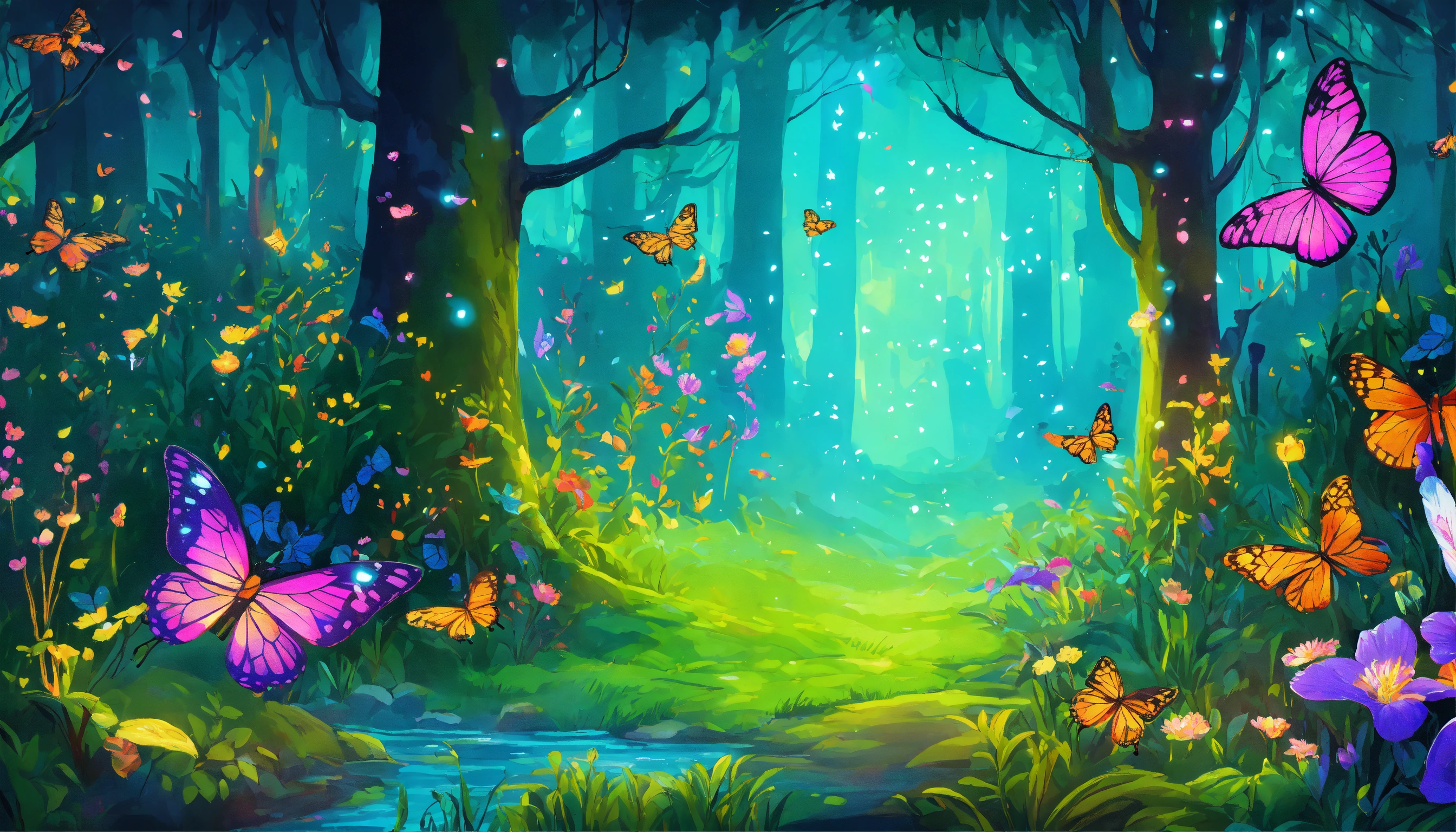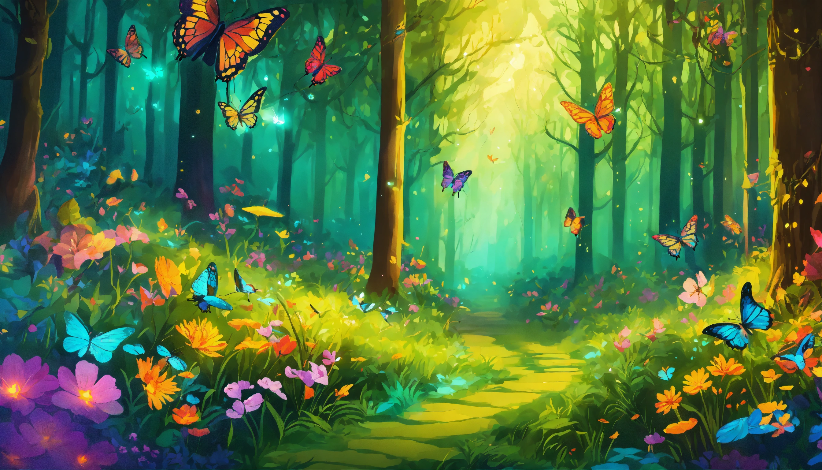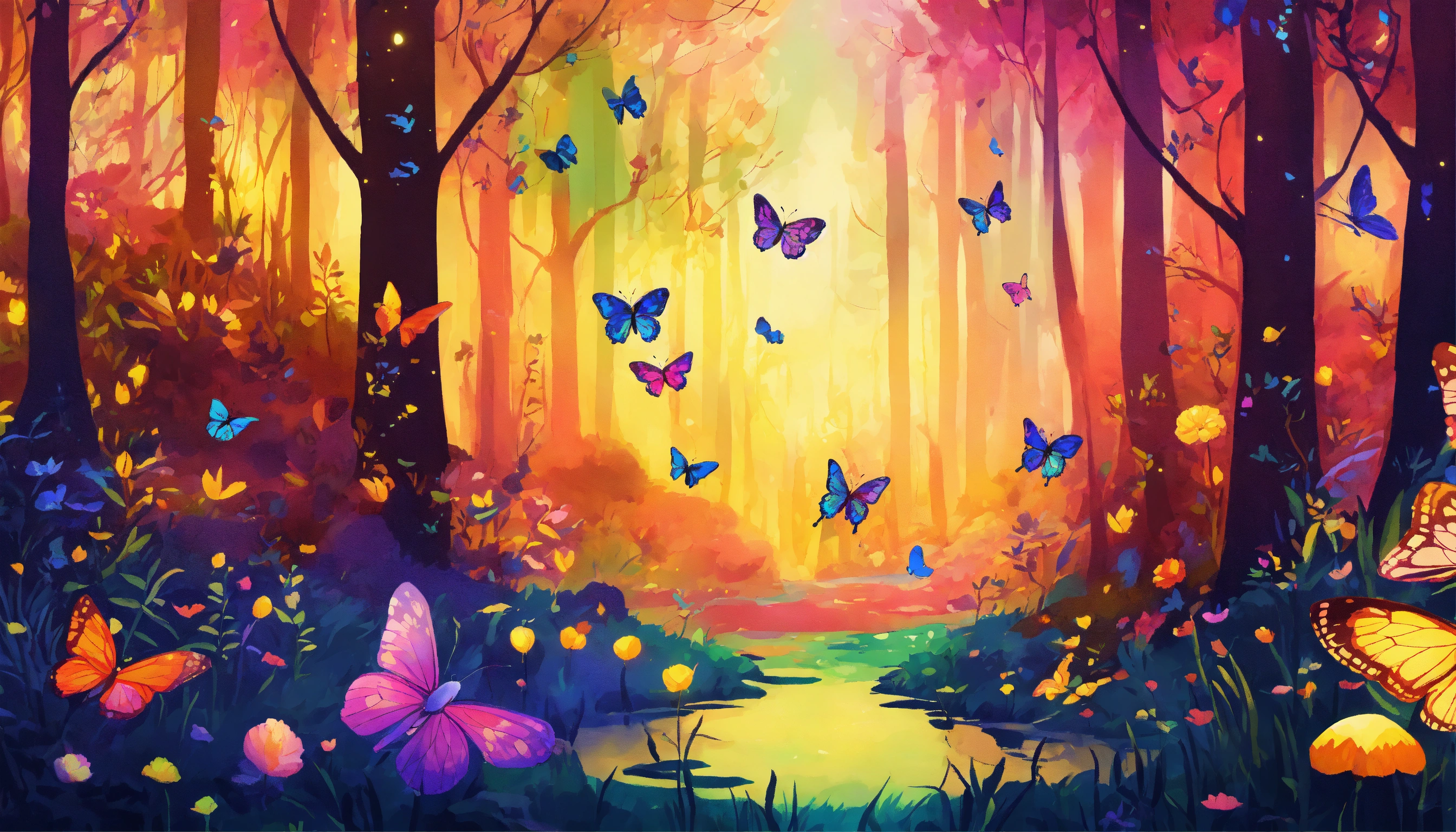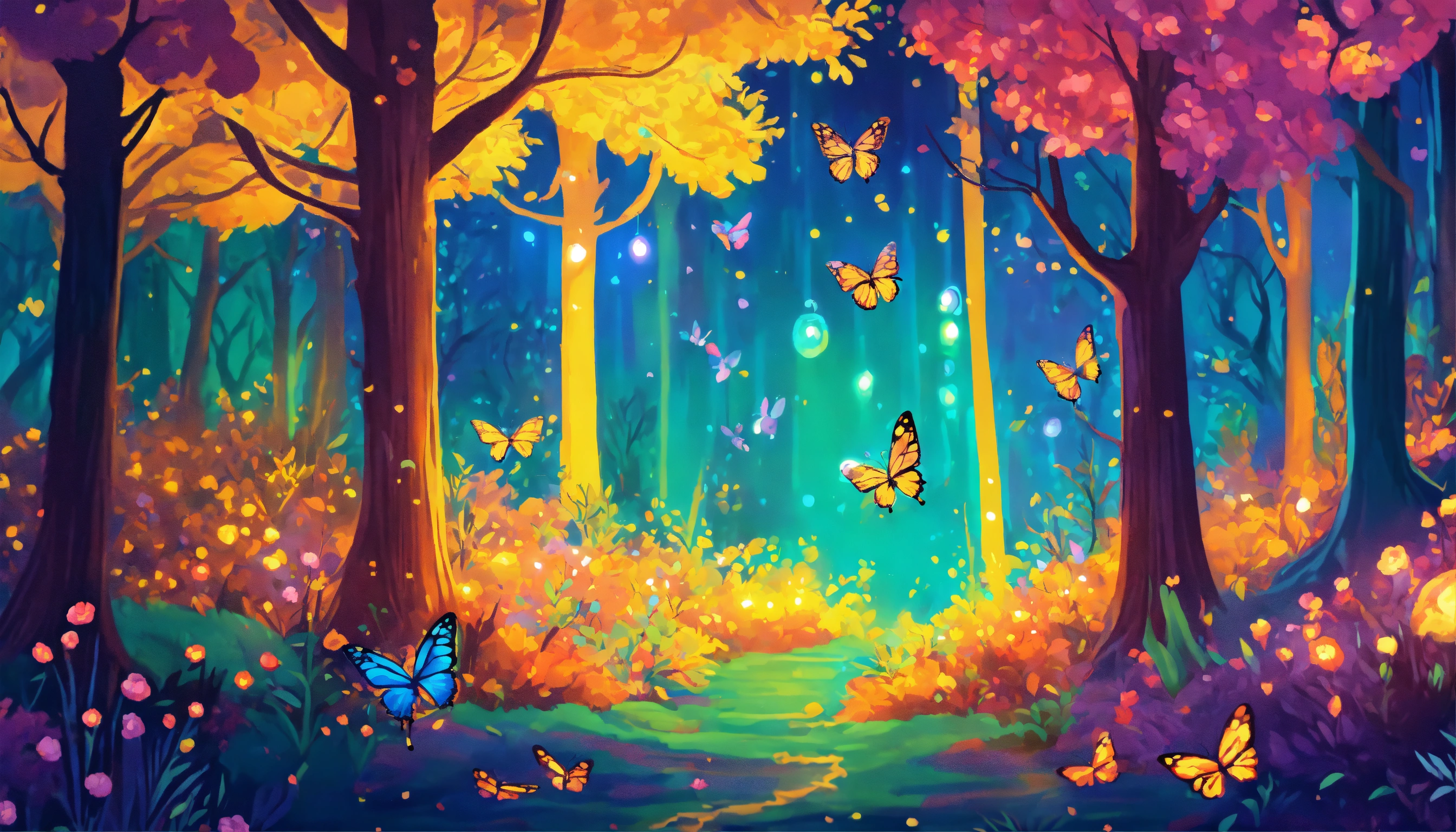 A beautiful enchanted forest with mythical creatures that glow with vibrant colors, very butterflies flying (little fireflies) ultra detailed illustration, (tetradic colors), whimsical, enchanting, fairy tale, (ink lines1.1), strong outlines, art by mschiffer, bold strokes, no frame, high contrast, (cel-shaded1.1), vector, 32k resolution, best quality, flat colors, flat lights