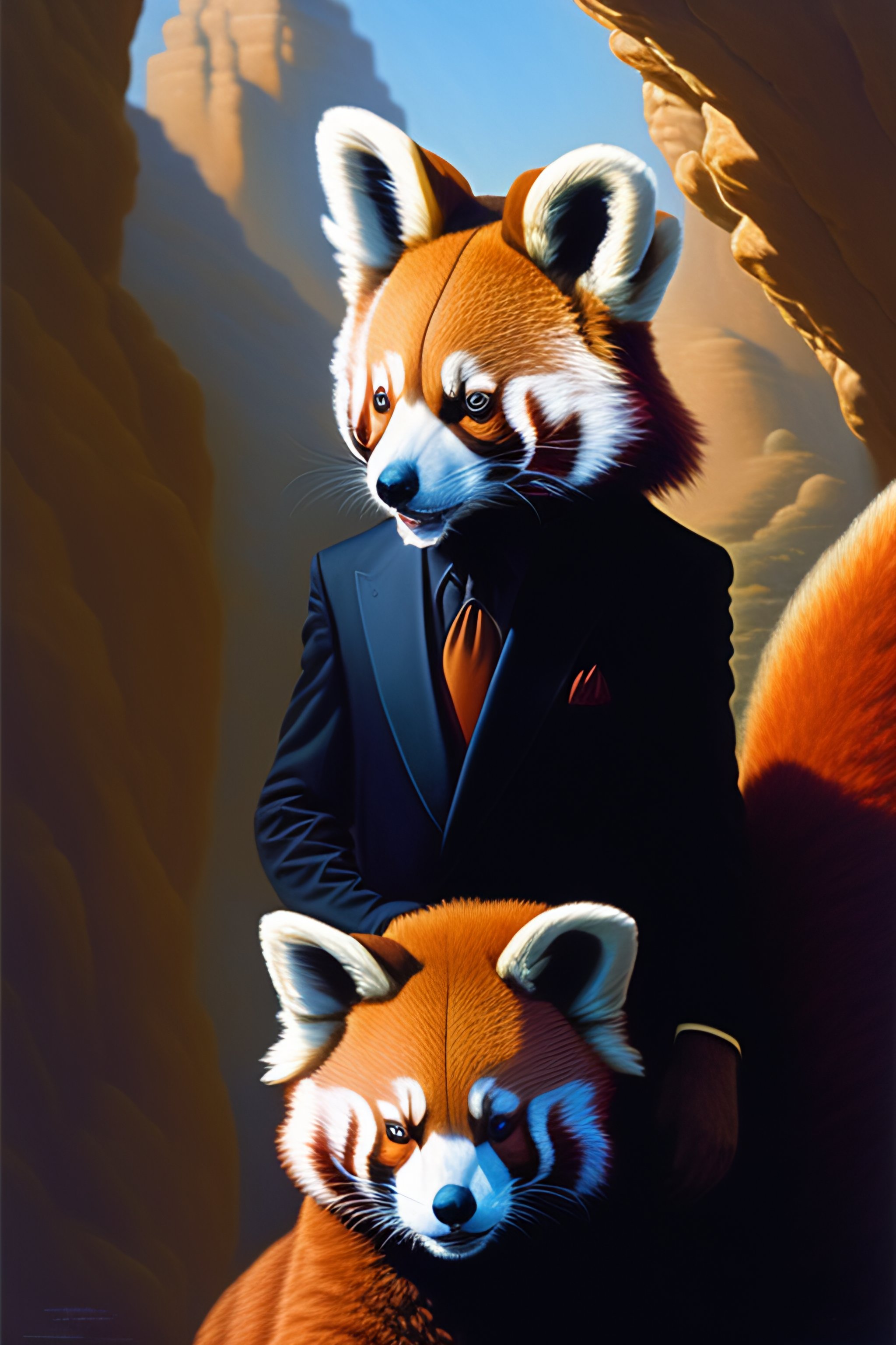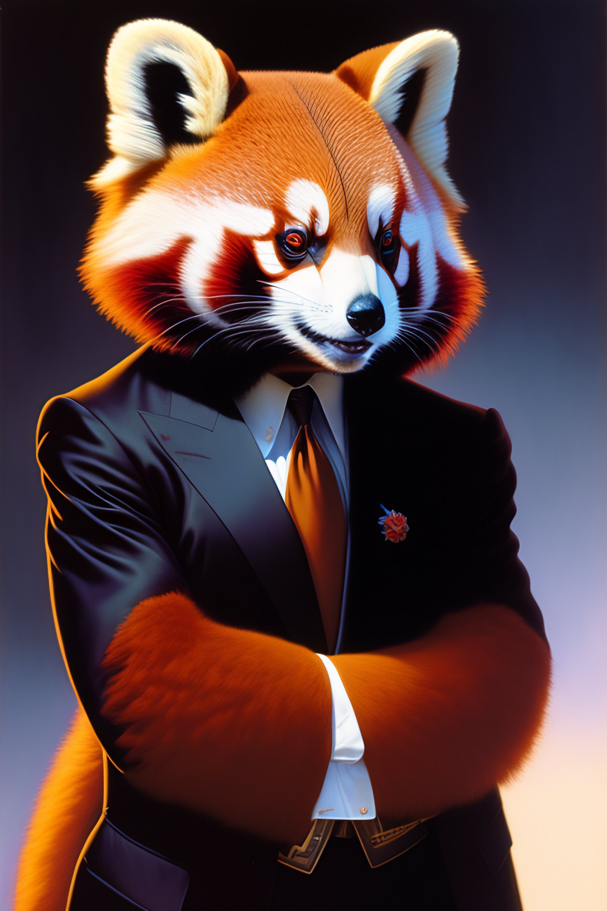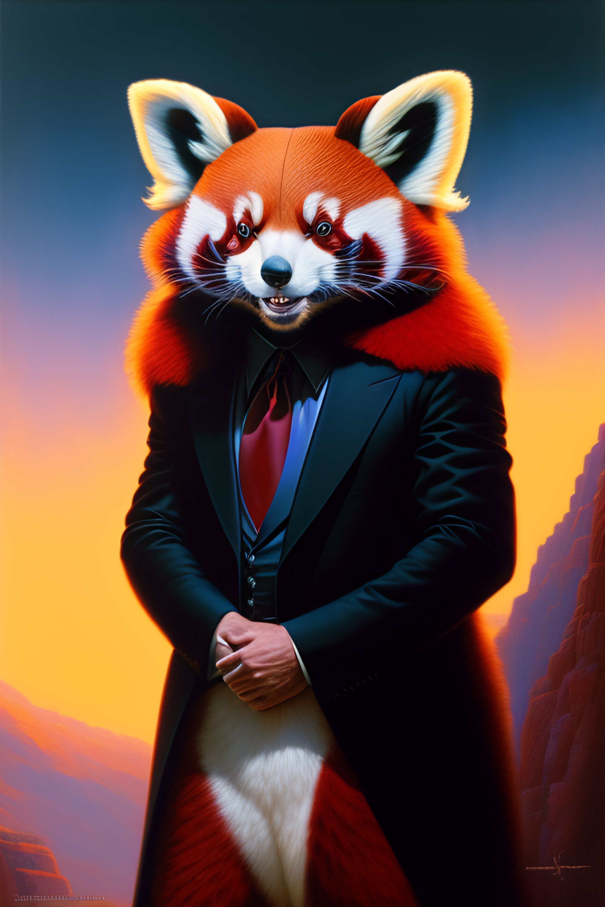 Anthropomorphic red panda in a bodyguard black suit, laughinh face, equirectangular projection tim hildebrandt, wayne barlowe, bruce pennington, donato giancola, trending on artstation, cinematic composition, beautiful lighting, hyper detailed, 8 k, oil on canvas