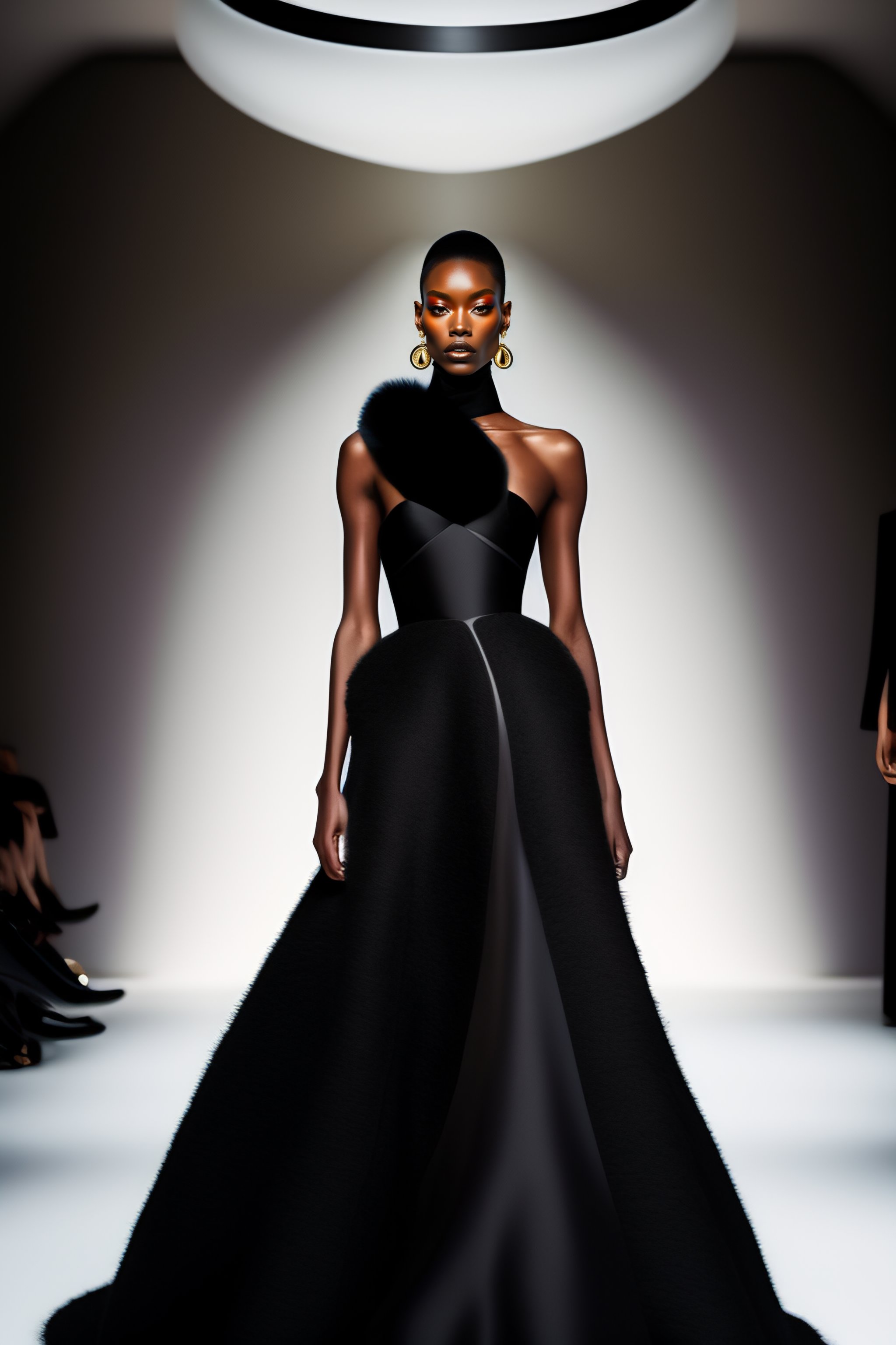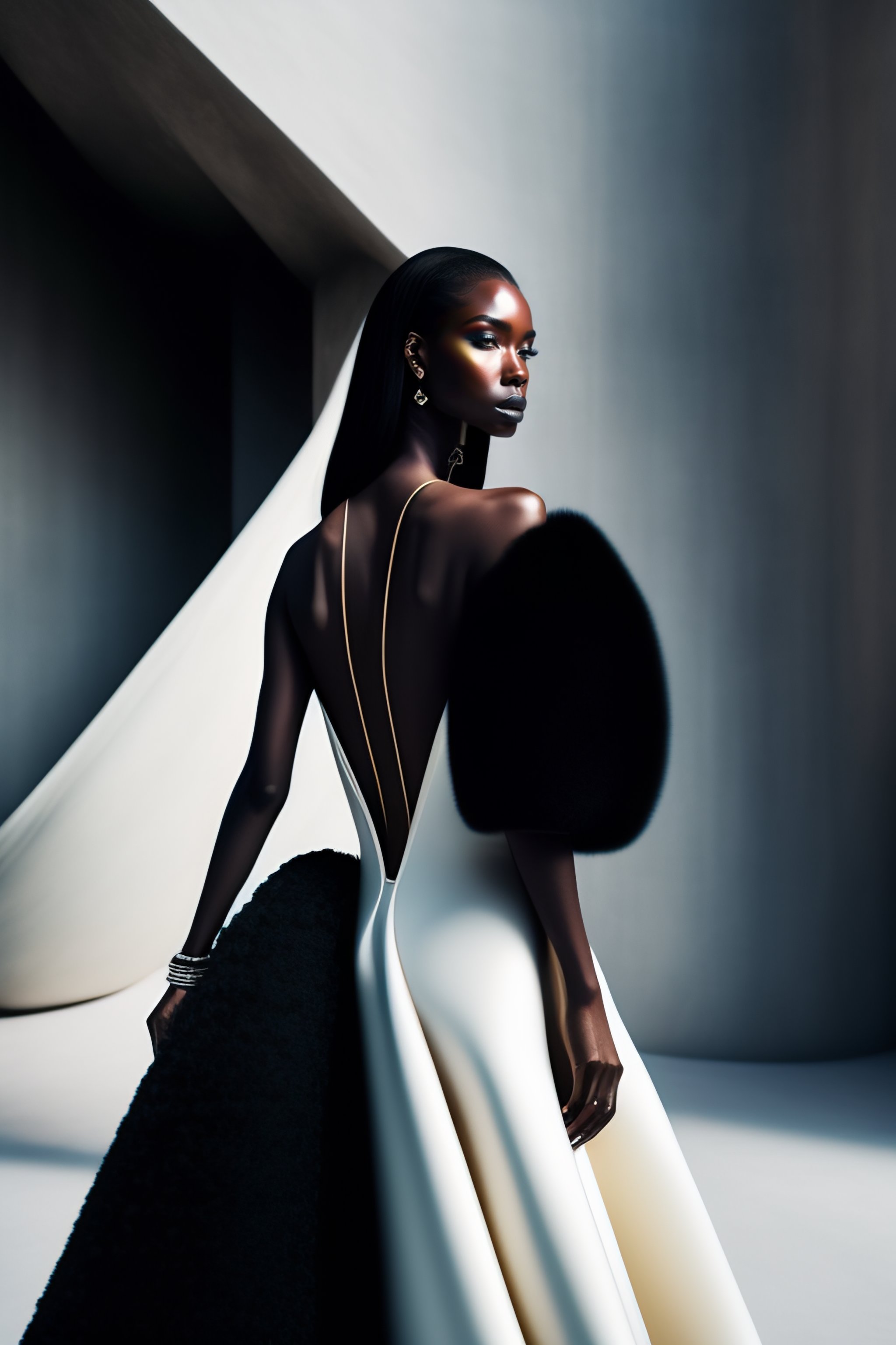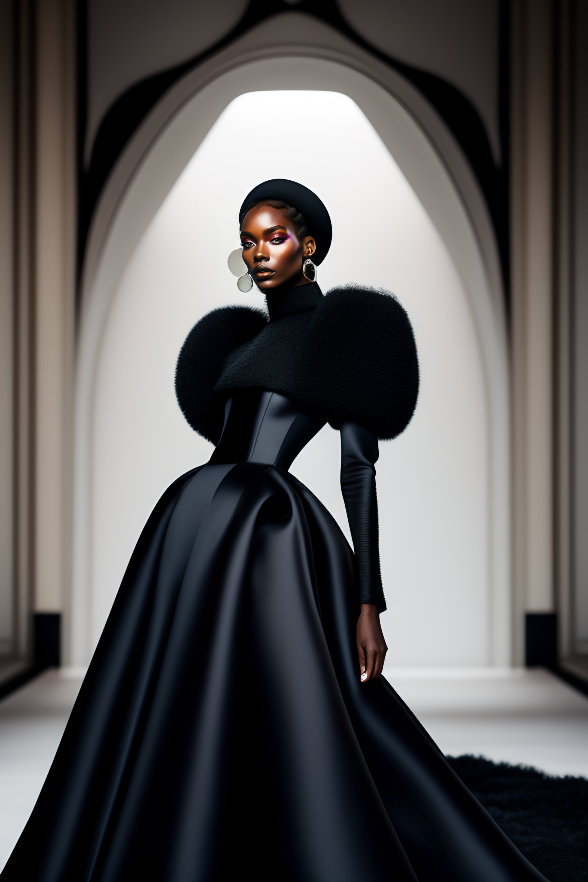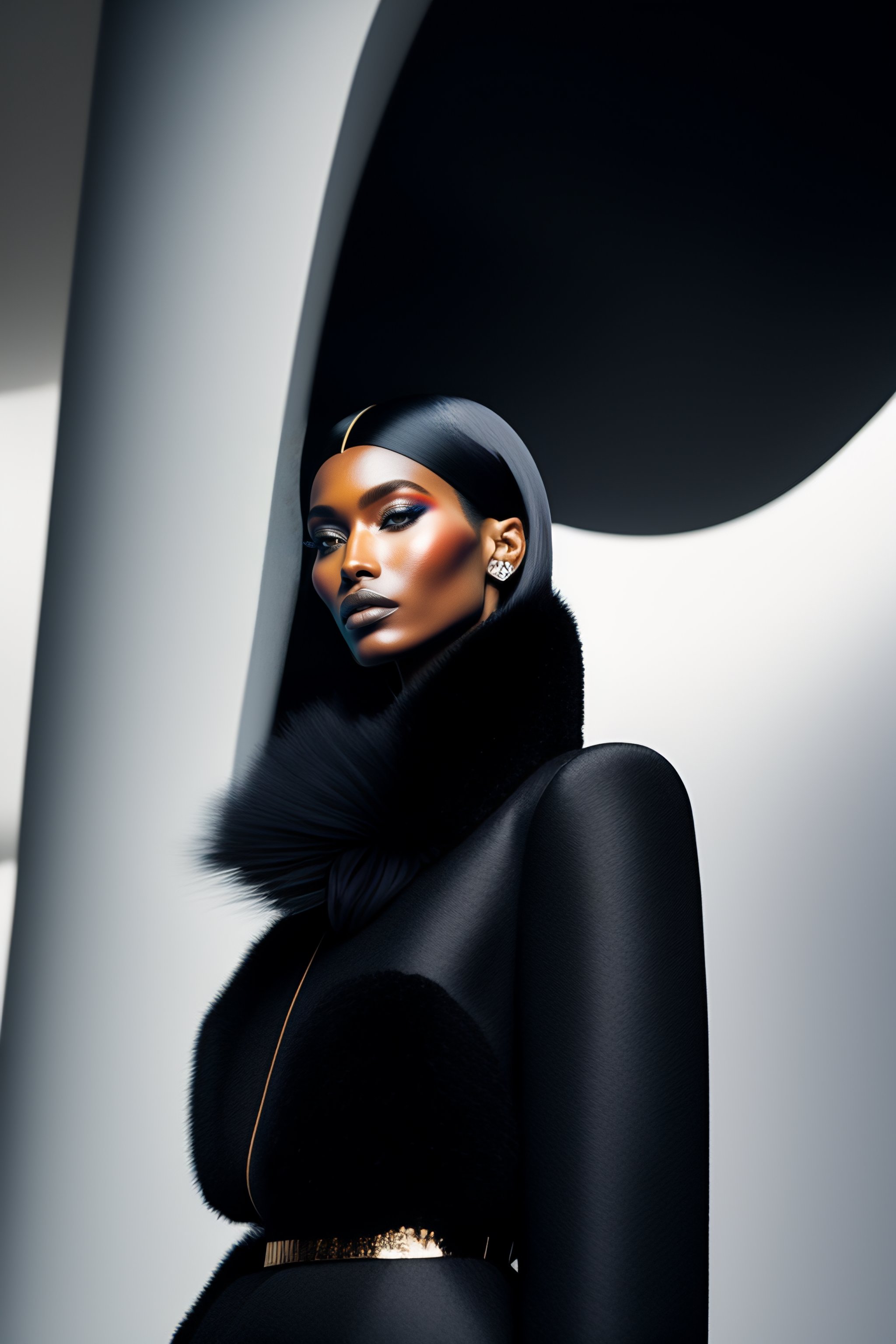 A hyper-realistic haute couture model wearing a balenciaga black fluffy mohair gown in the style of kinfolk magazine against the backdrop of zaha hadid's architecture