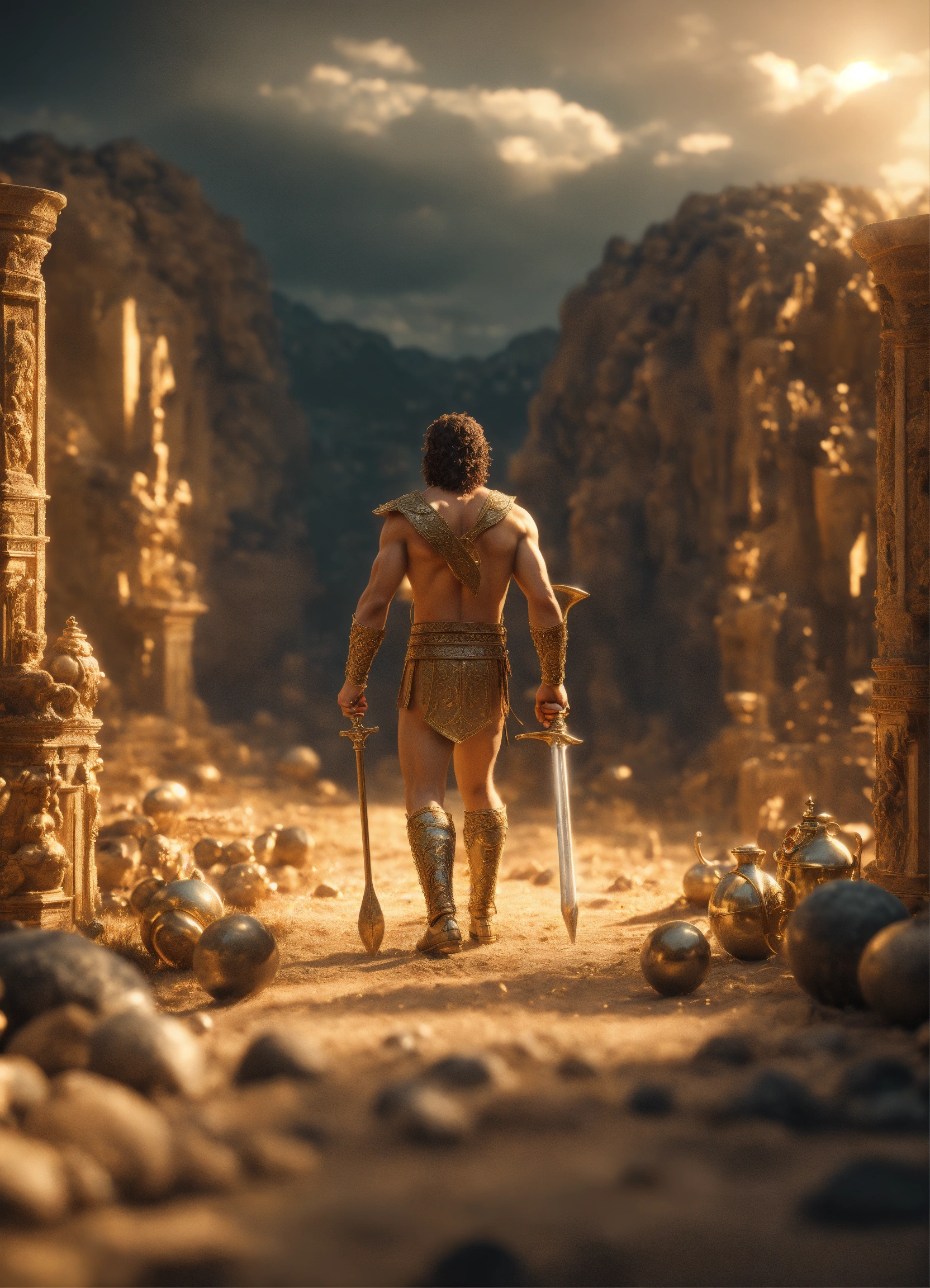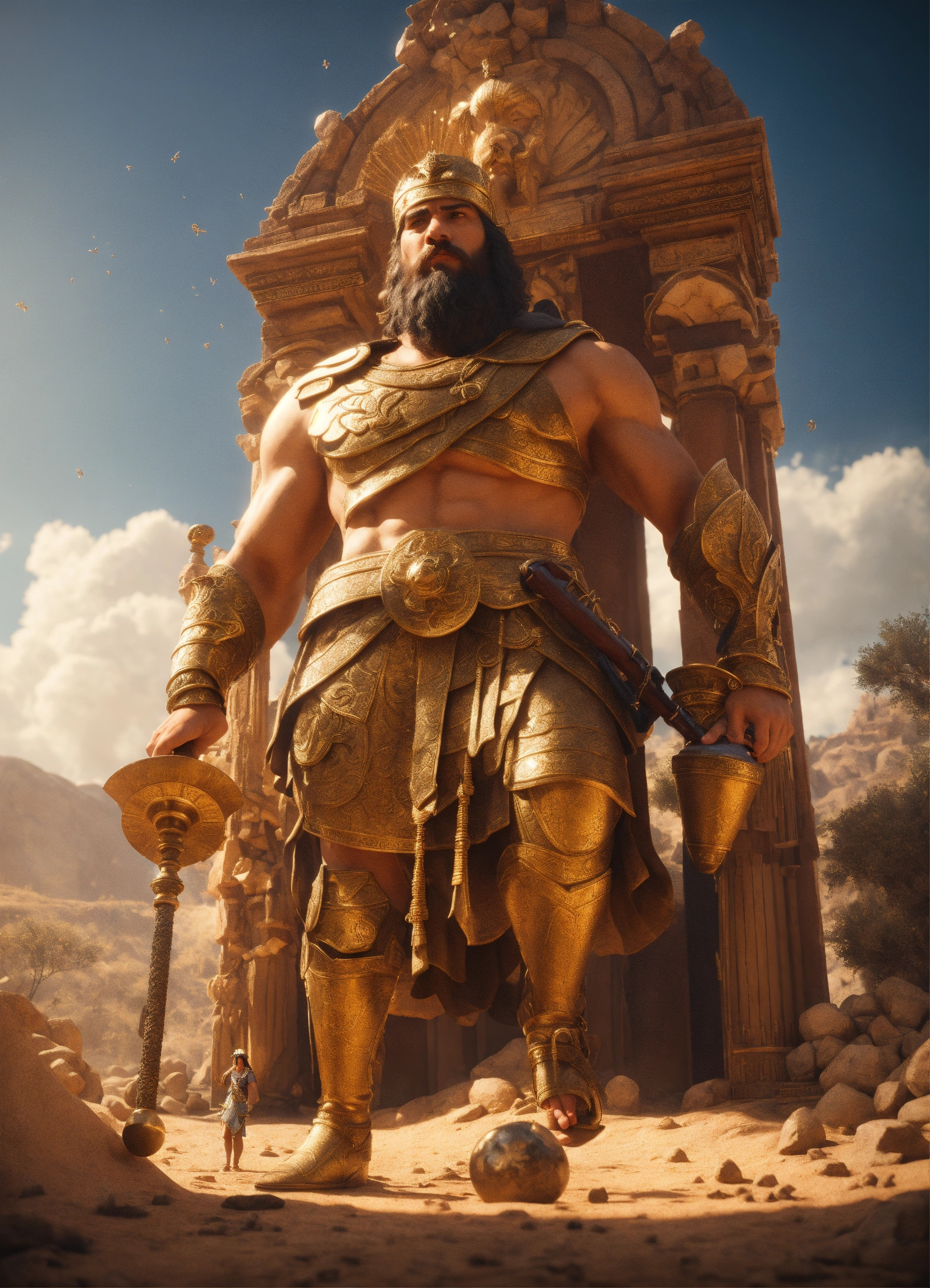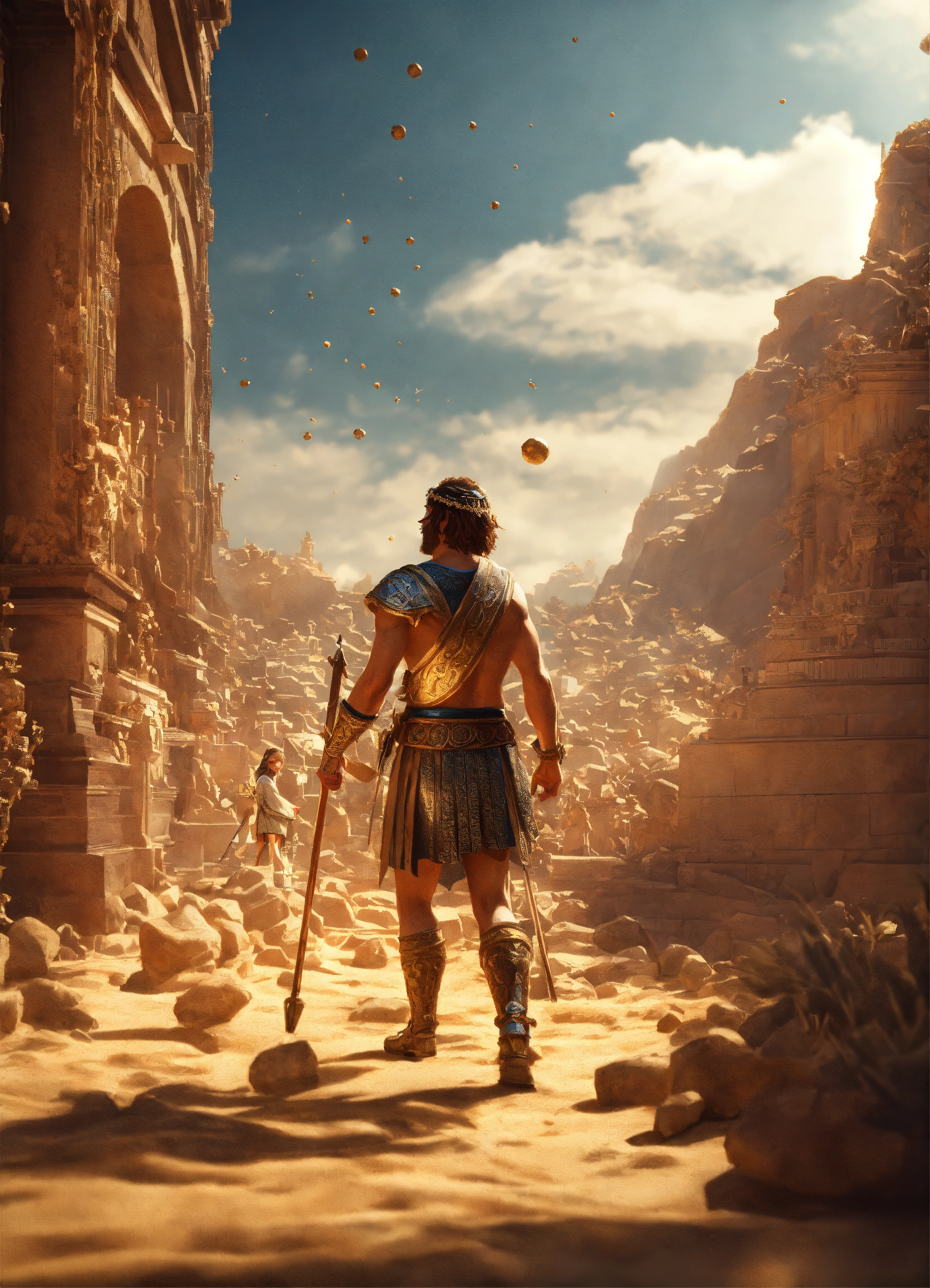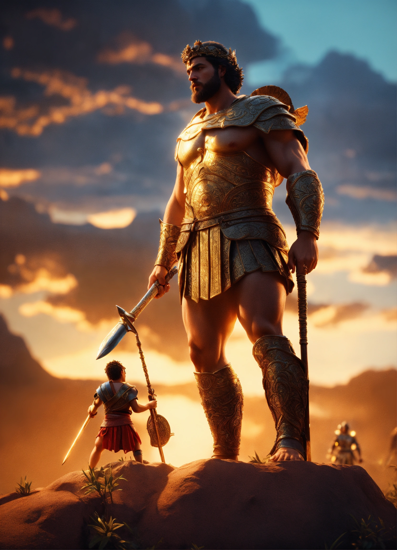 Biblical story david and goliath, perfect composition, beautiful intricately detailed and detailed octane rendering, trending in art station, 8k artistic photography, photorealistic concept art, smooth natural volumetric cinematic perfect light.