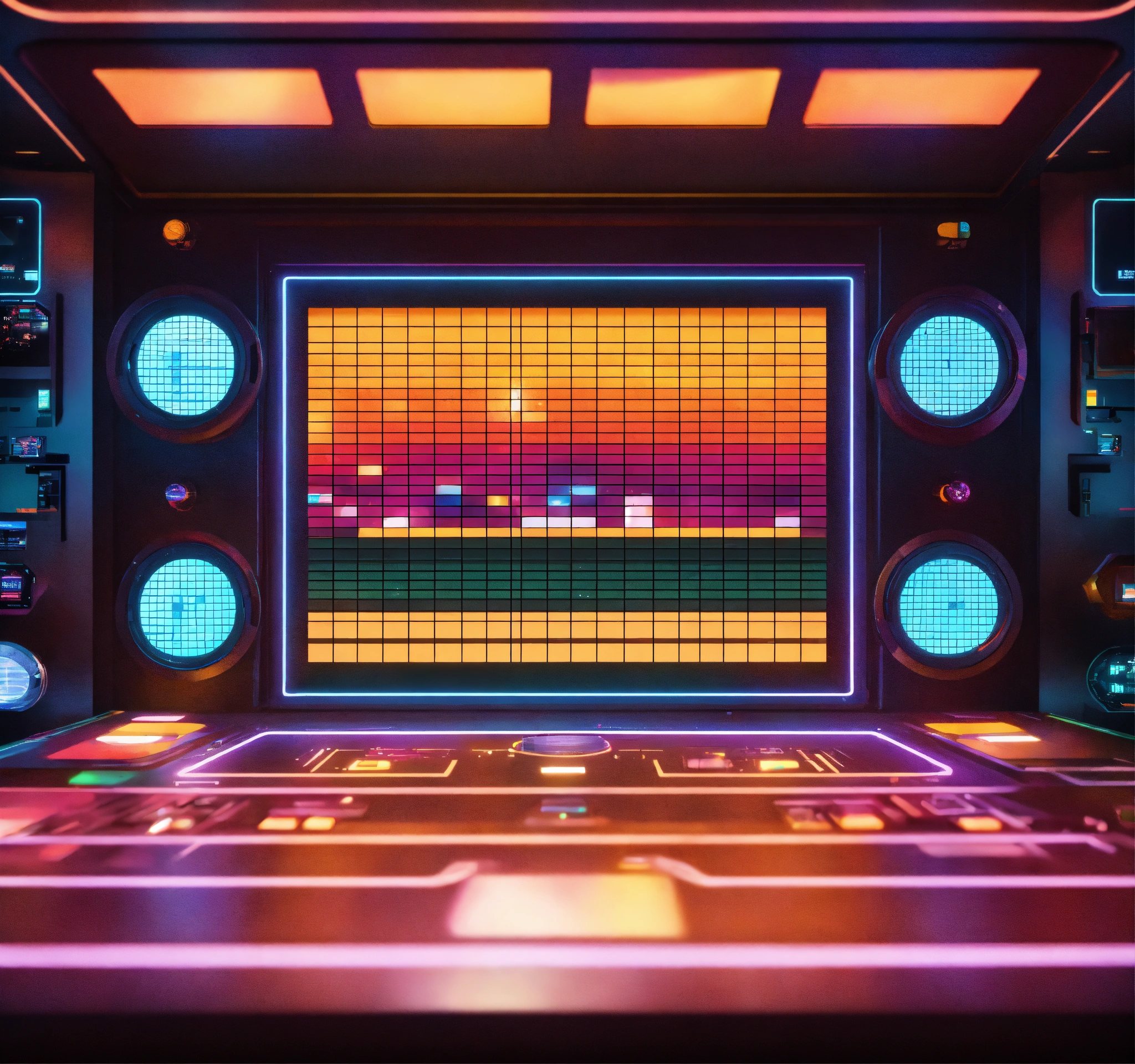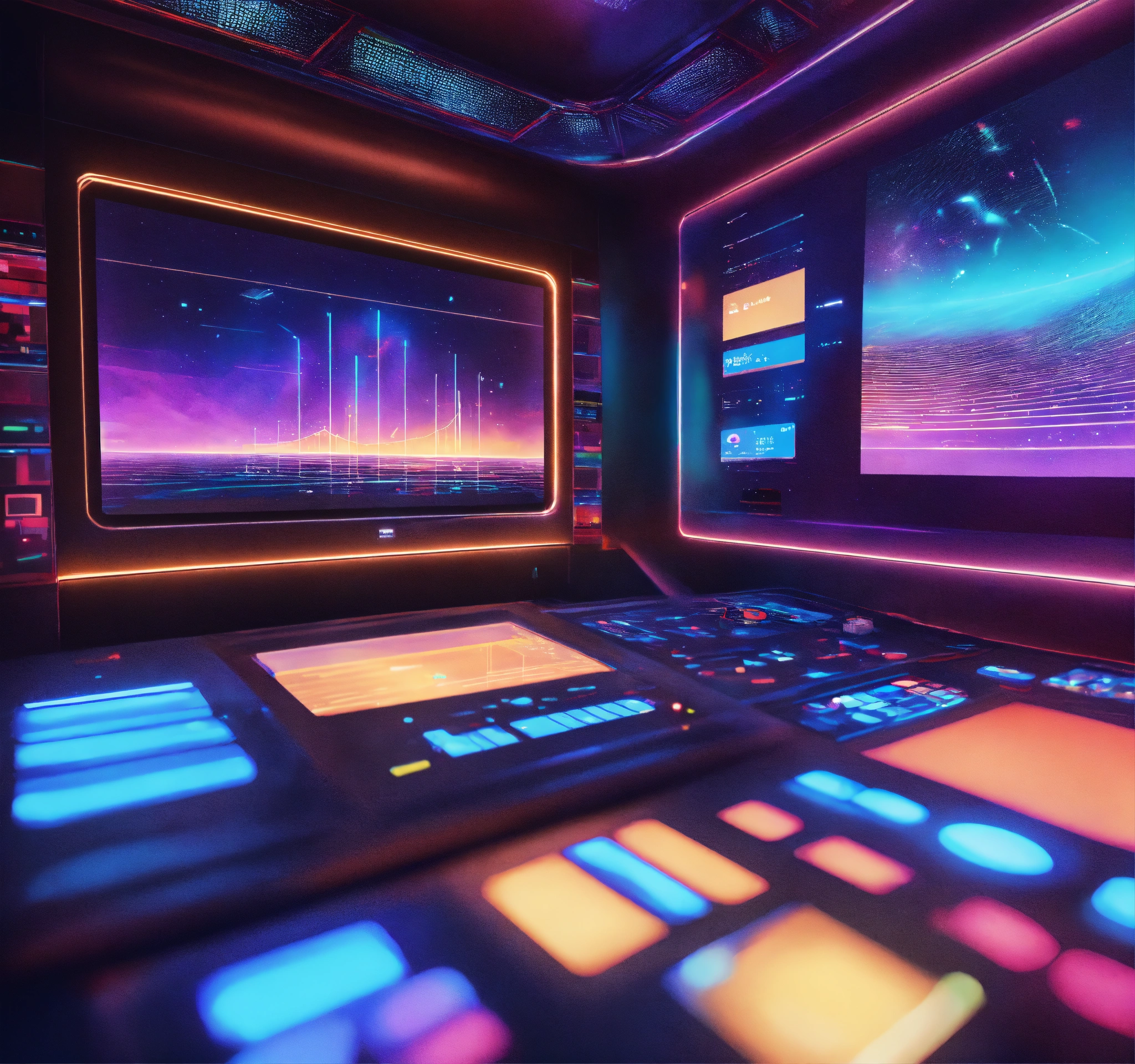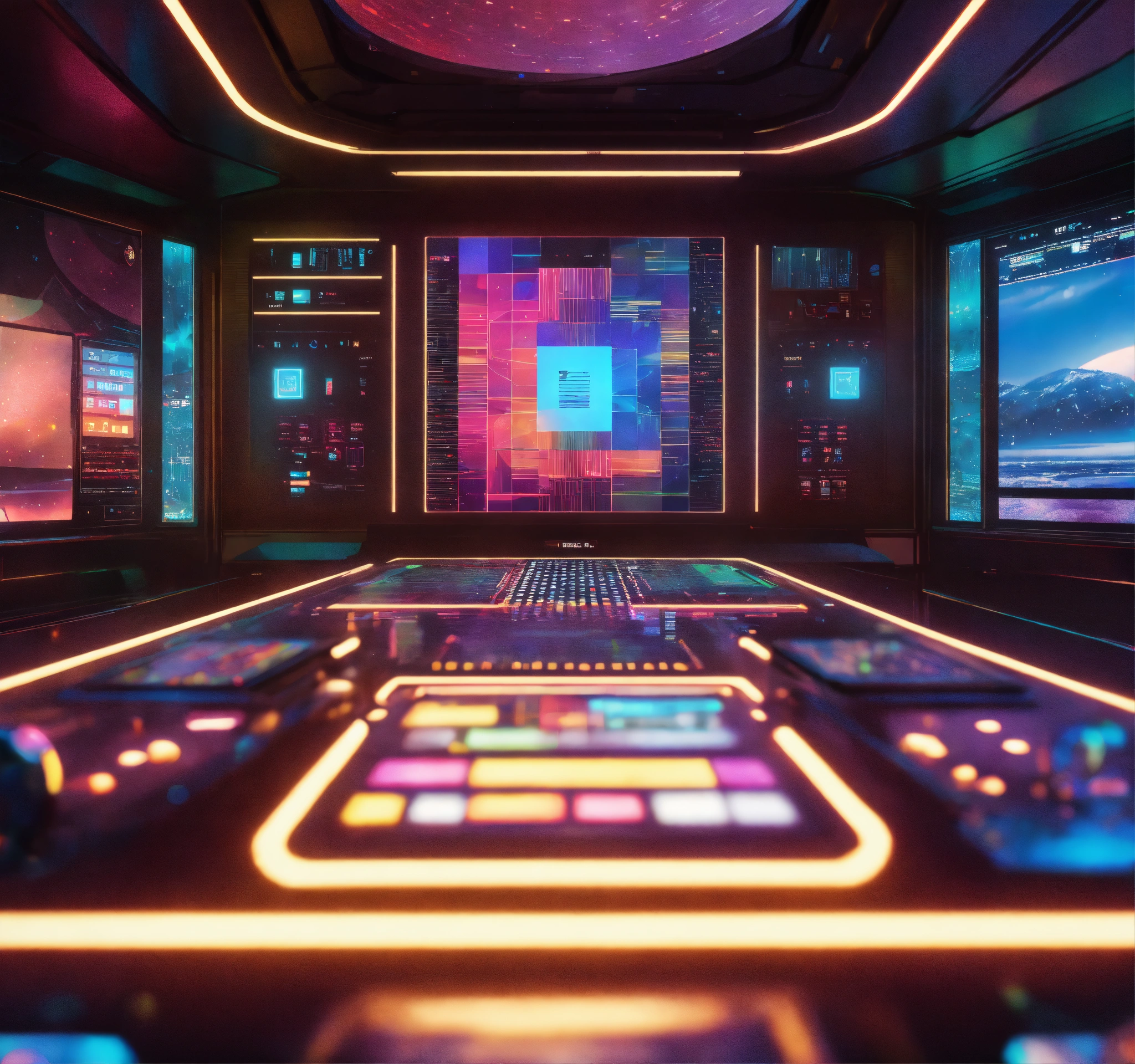 Close up of 1 big screen in the center of a bunch of big colorful square lighted buttons, on the screen is abstract sound waveform that is the voice of the luxurious space yacht, realistic, futuristic, sci fi, 8k, unreal engine, cartoon, pixar, disney