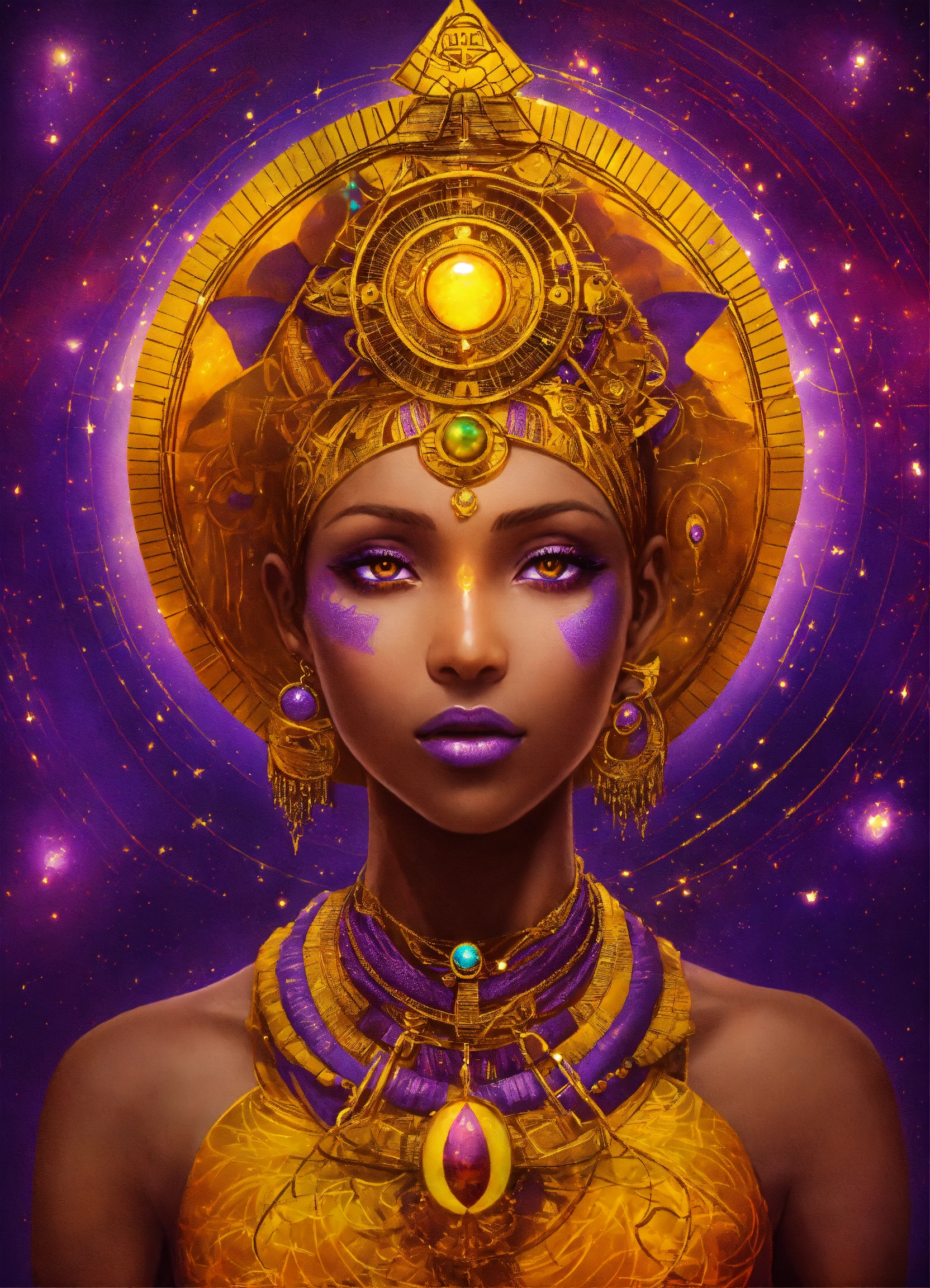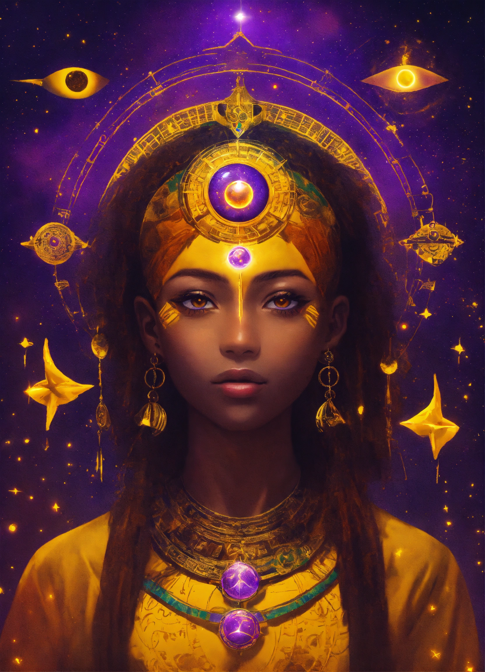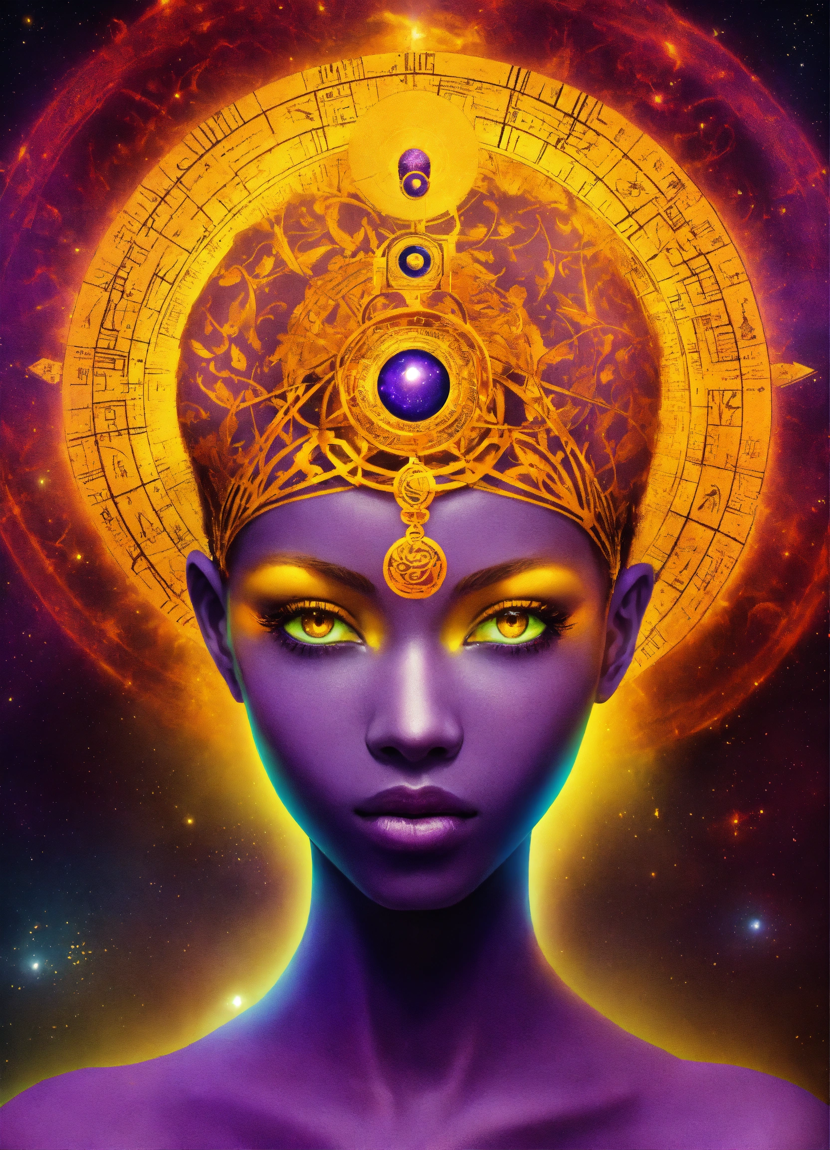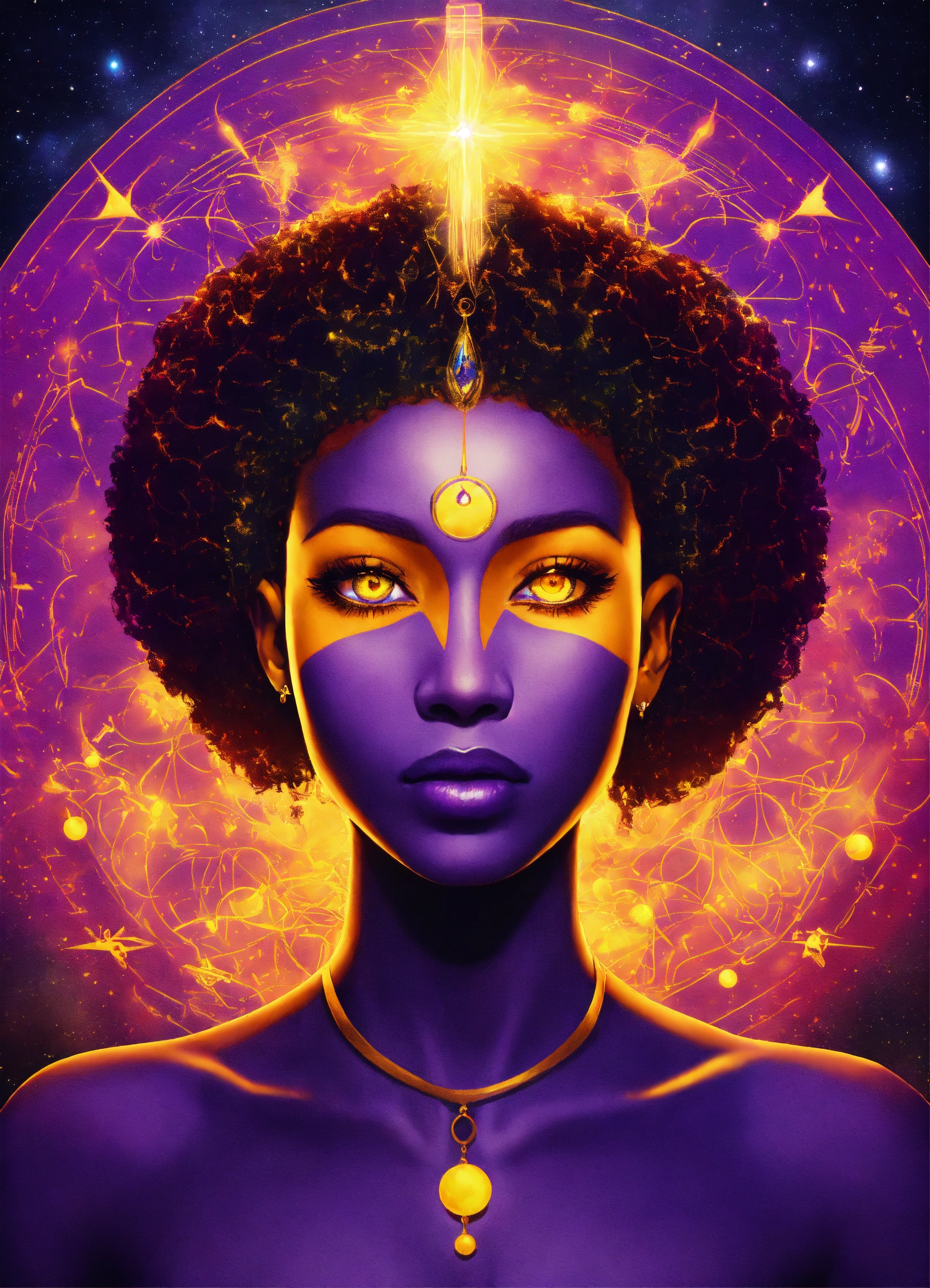 Law of attraction, simple color, one purple celestial skin ethiopian human, glowing yellow eyes, third eye upon the forehead, universe, attraction, seven planes, symbols, inner, positive