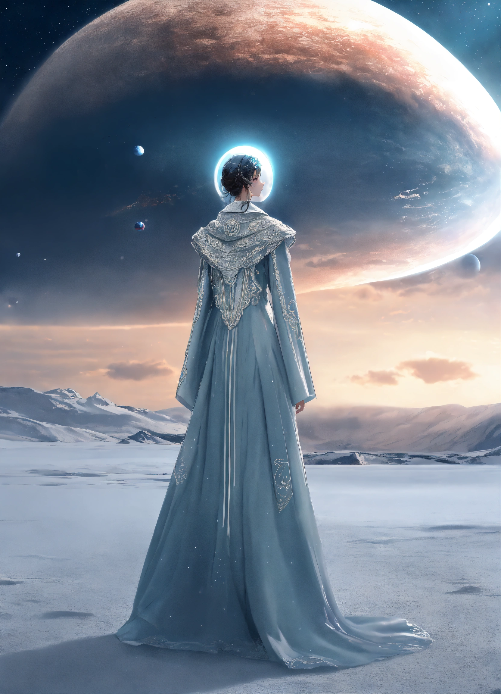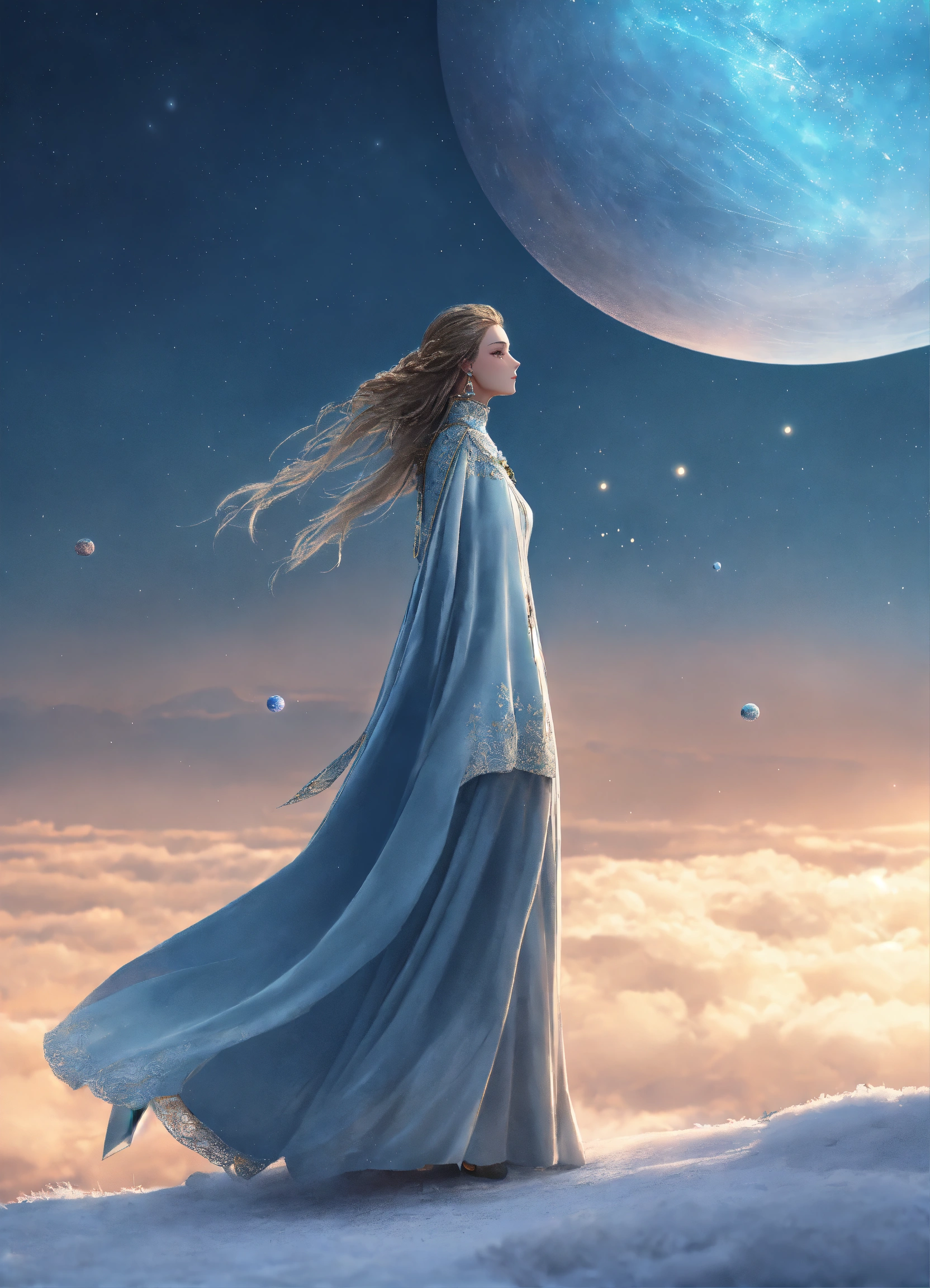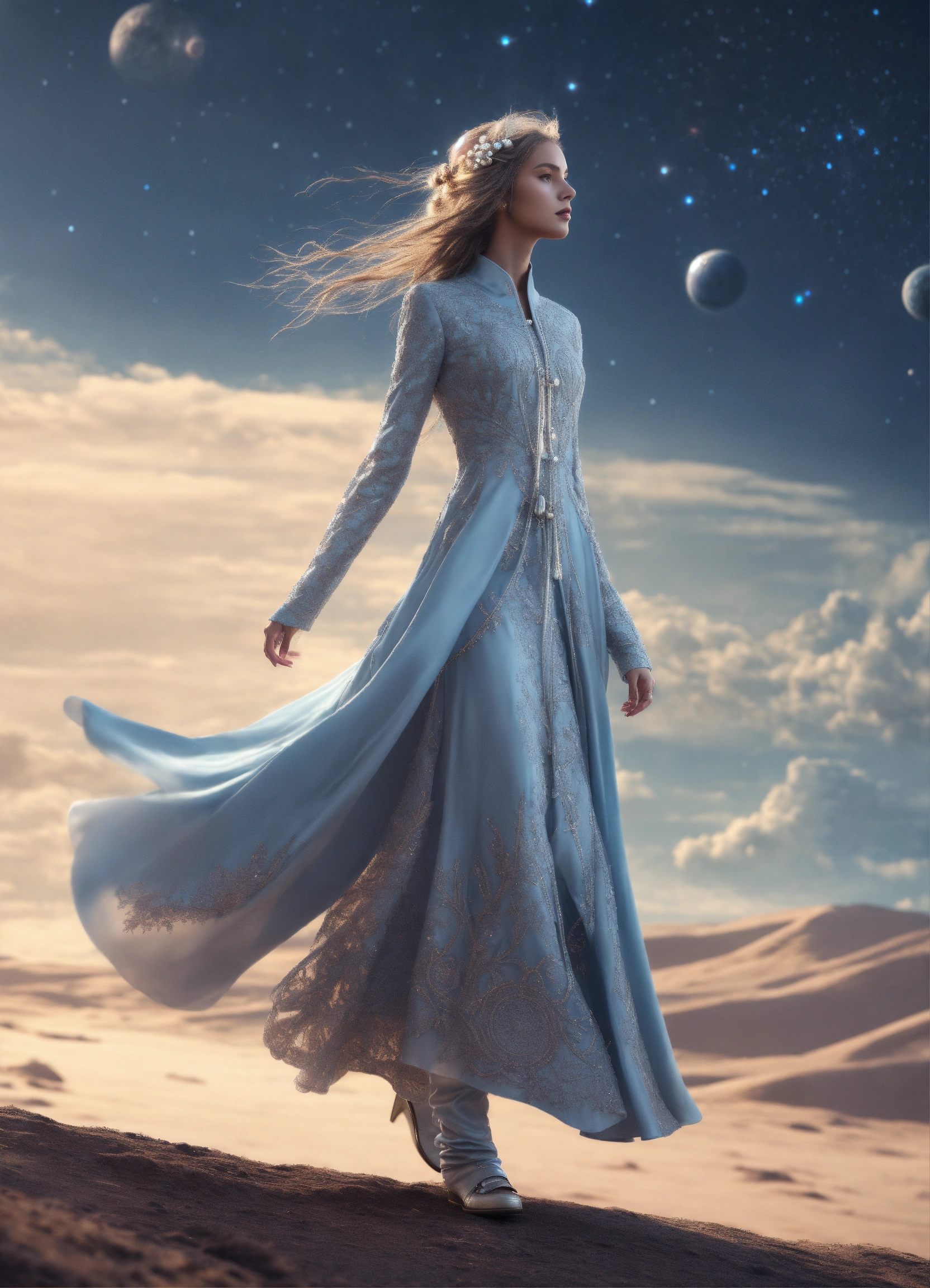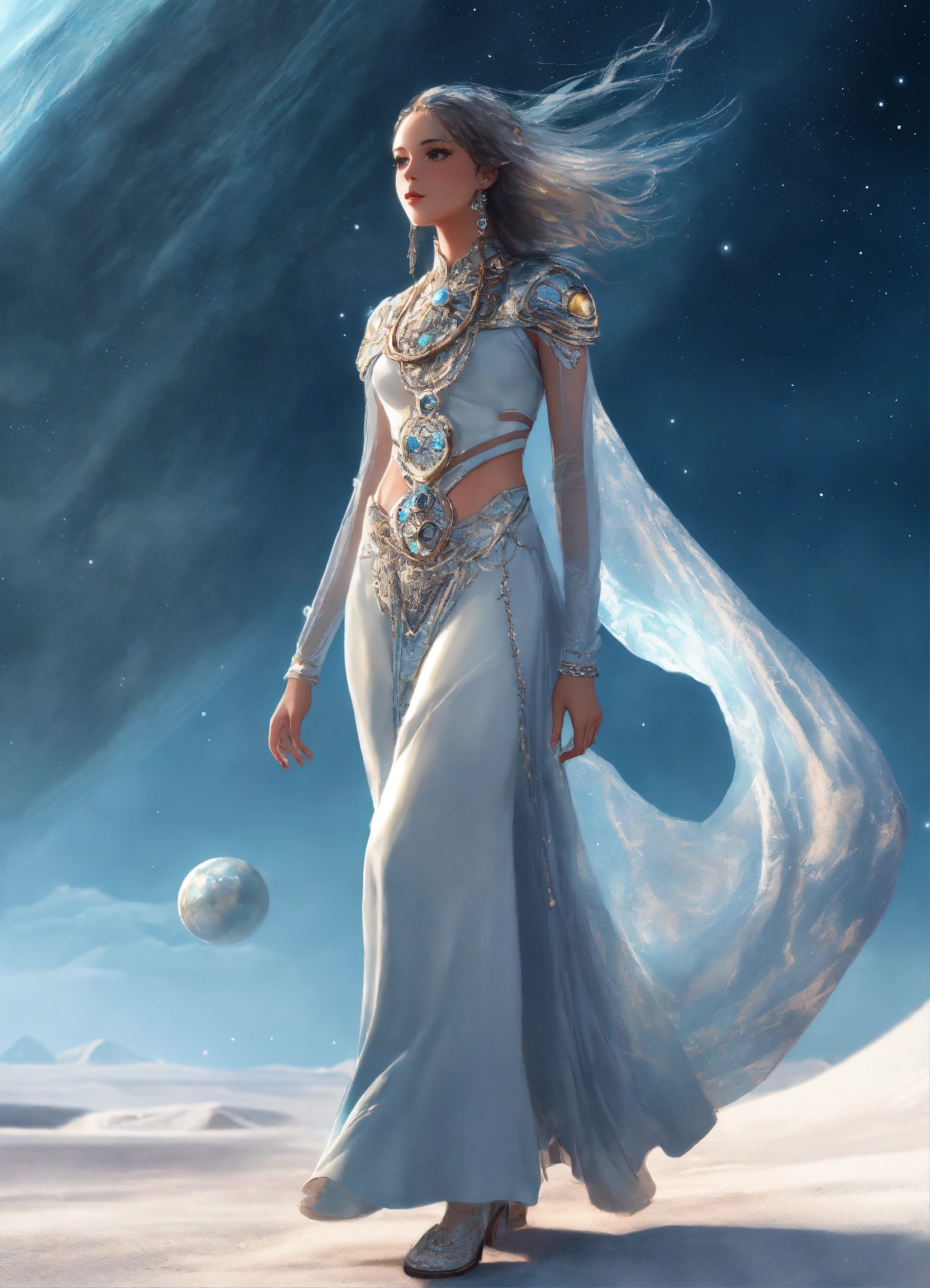 A alien, woman with a long beutiful dress, winter cape hippiestyle with rastahair, vibrand soft light blue and pearl white, silver decoreted clothings, full body wide shot, walking pose, side view, intricate, sharp_focus, concept_art, simple backround cosmic sky