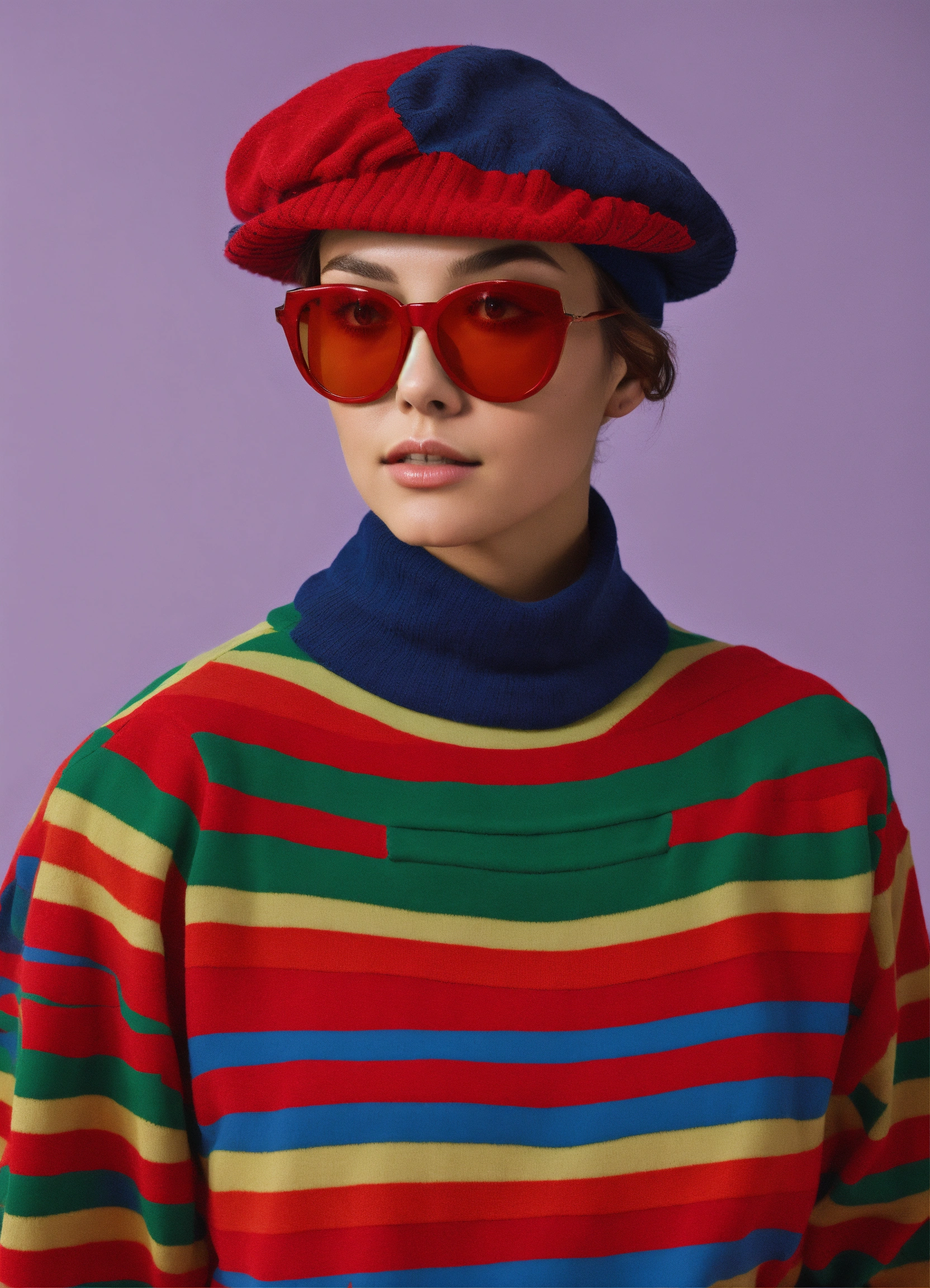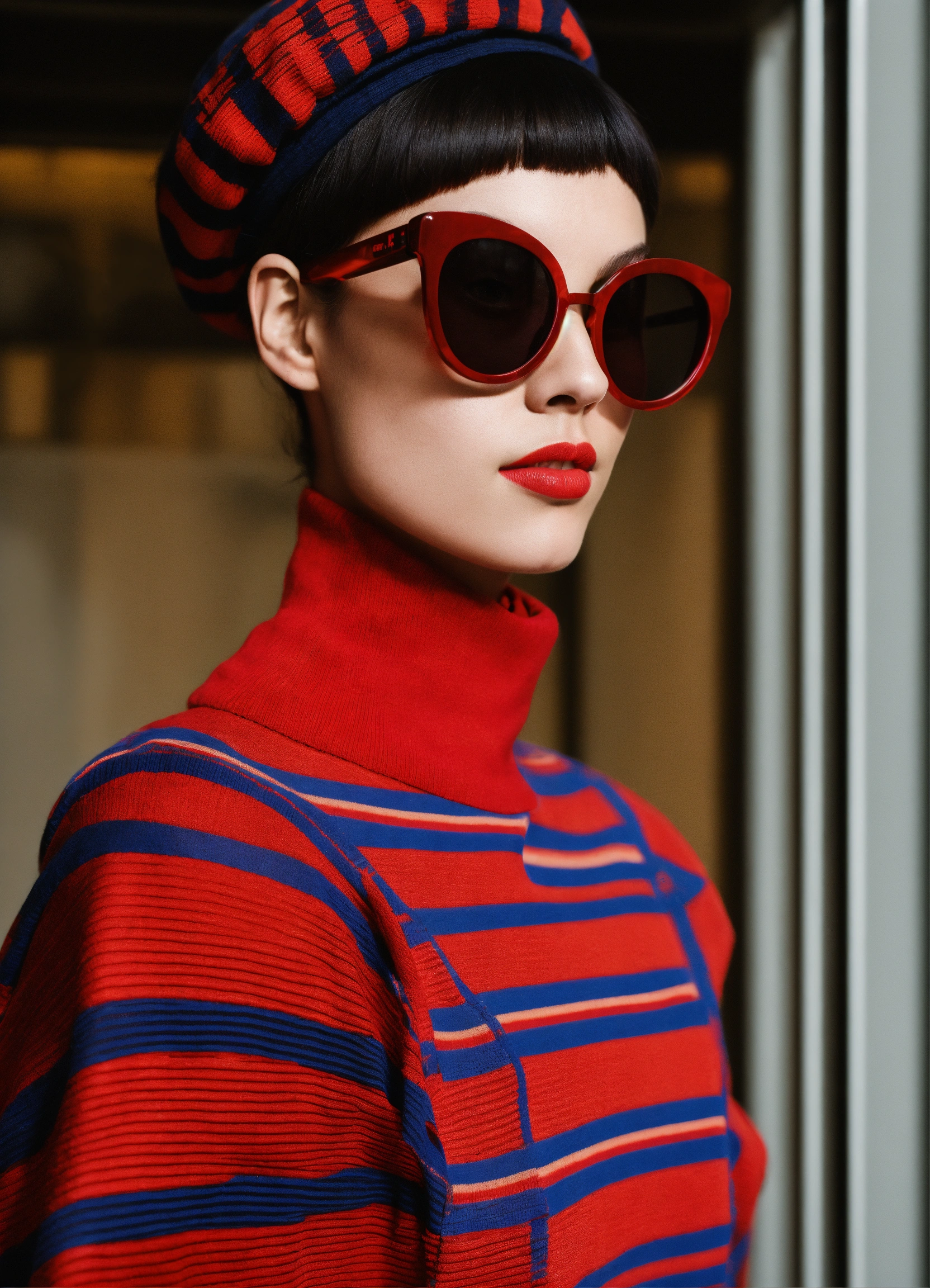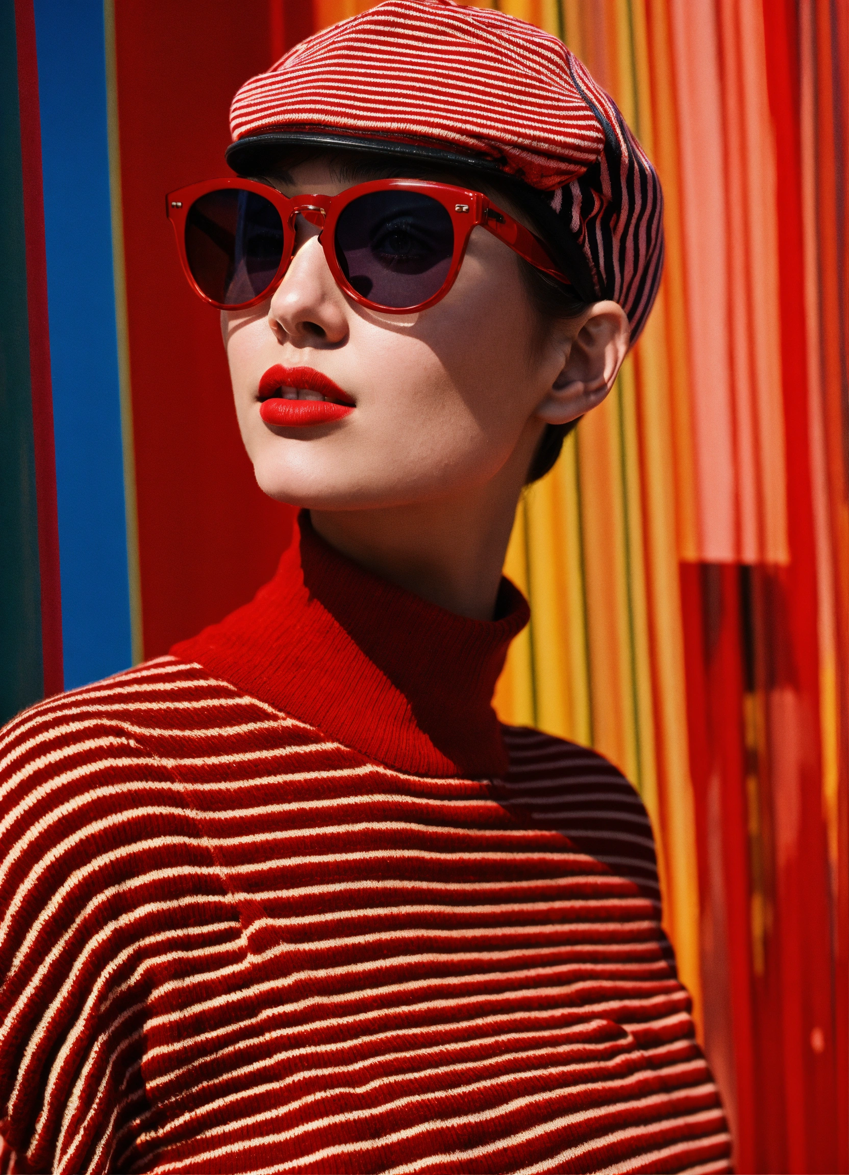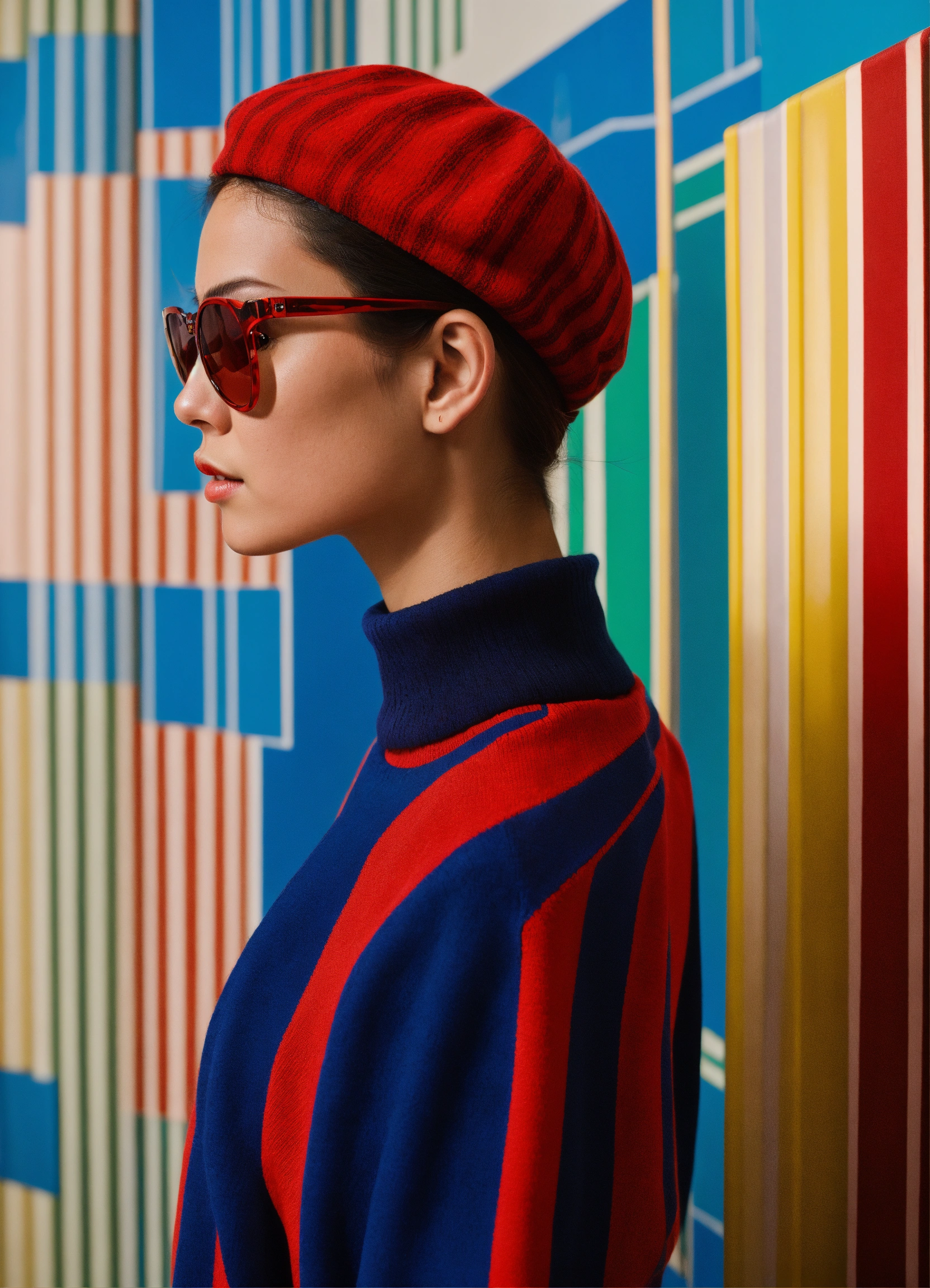 Front profile half body model show photography, in the psicodelic machine stripeds, a 50's beret, in a minimal large striped pattern pullover and large red sunglasses, futuris. issey miyake style urban degree view.